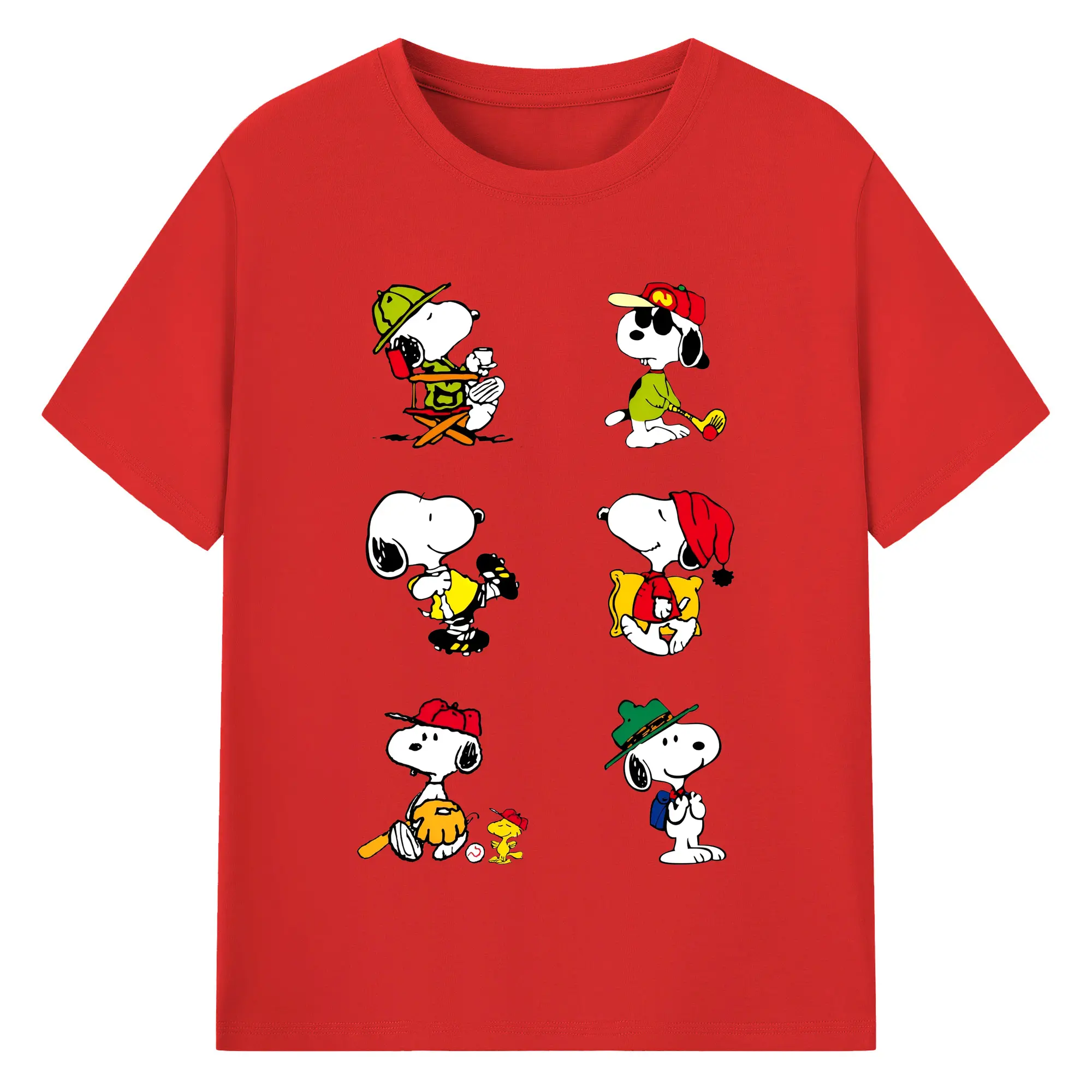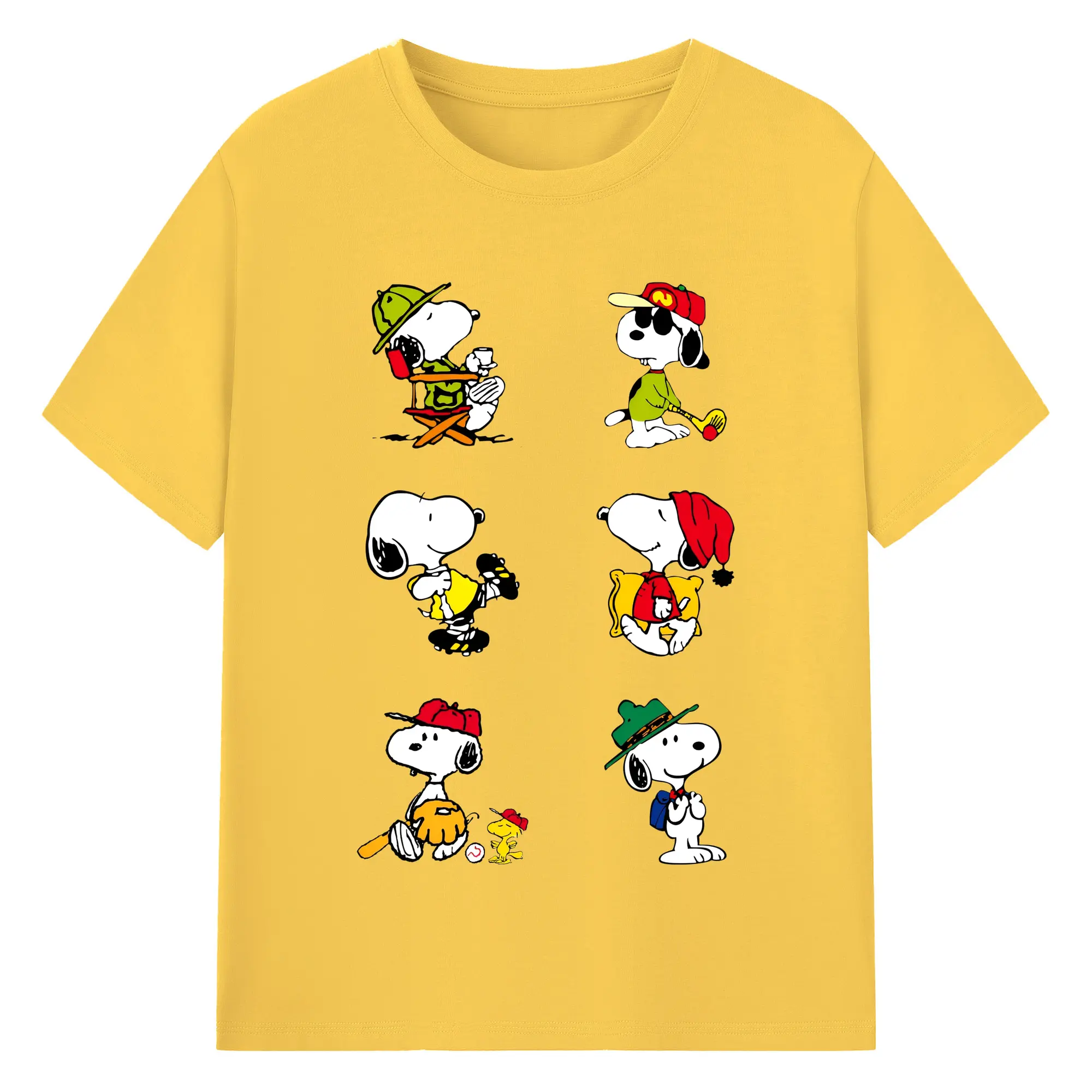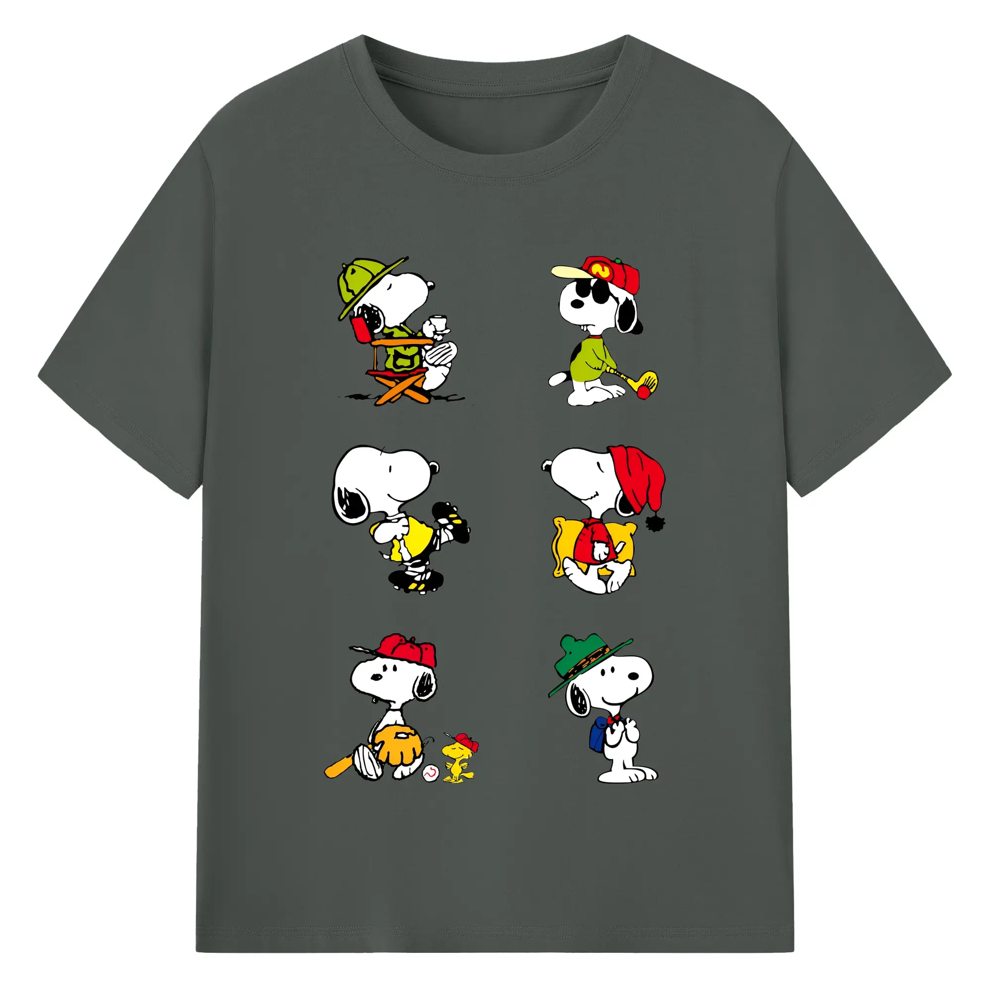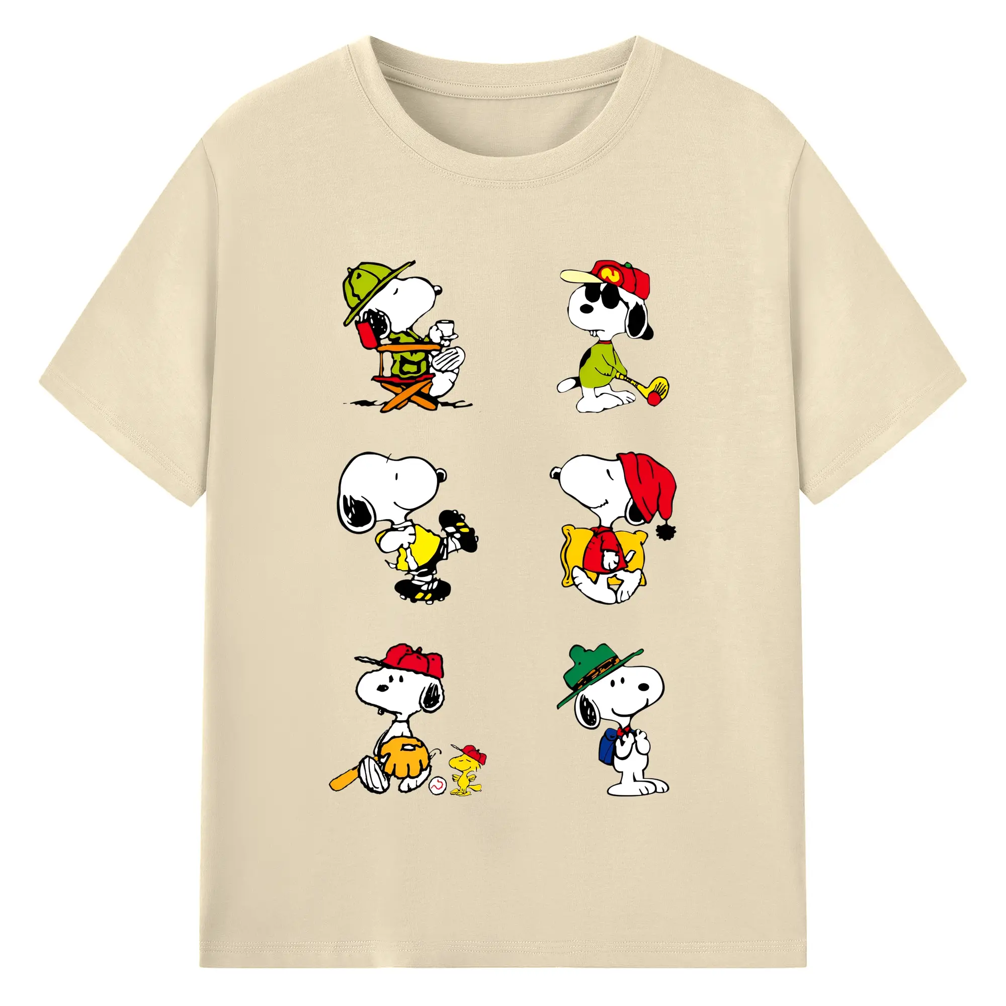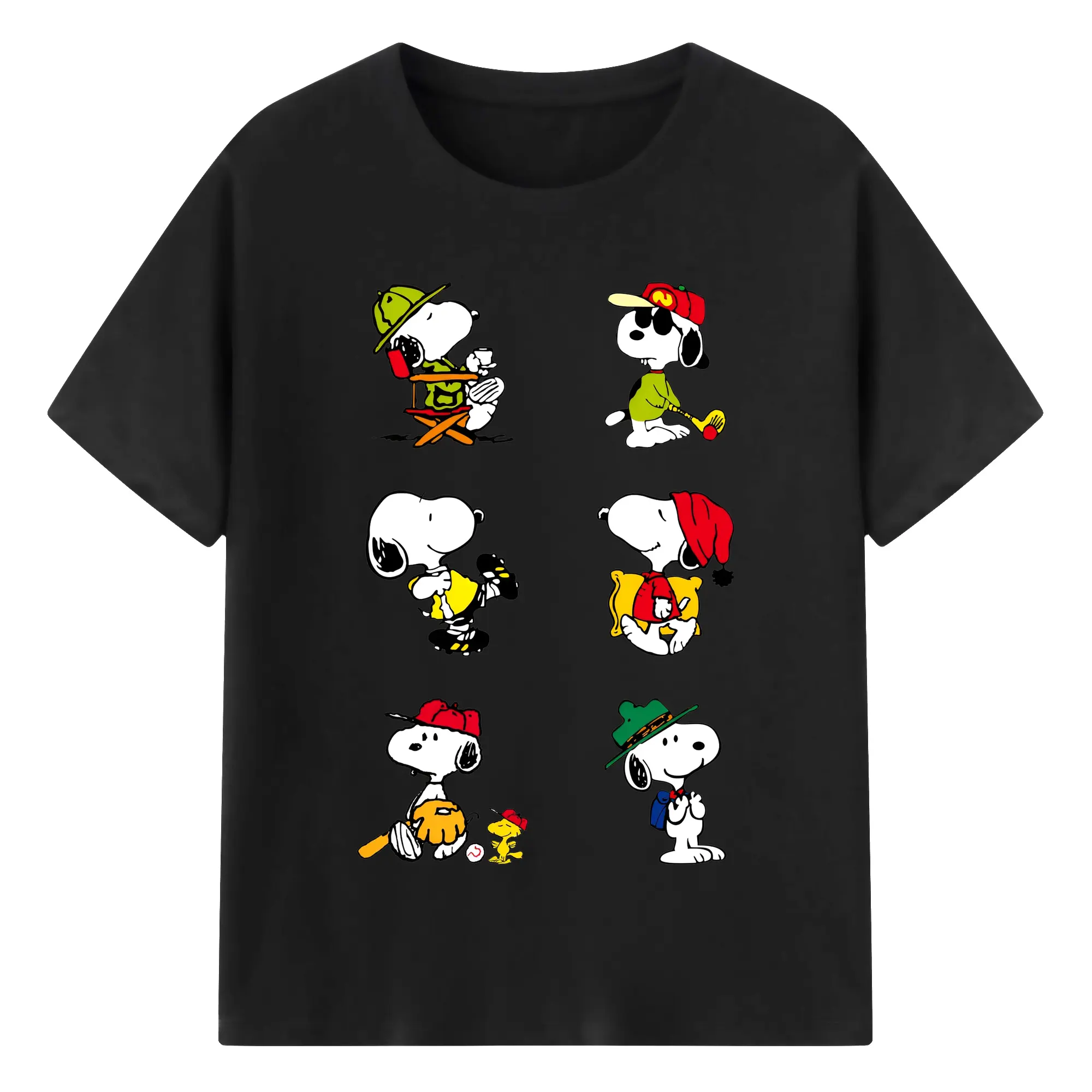 かわいいスヌーピー 大集合 - 綿100% ヴィンテージ風 半袖Tシャツ ・ フロントプリント ・ 柔らか肌触り ・ 通気性 快適 ・ スポーツ カジュアル 外出用
