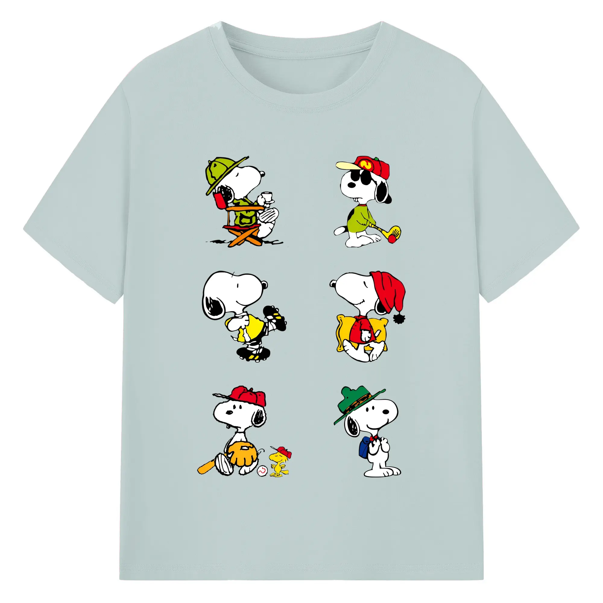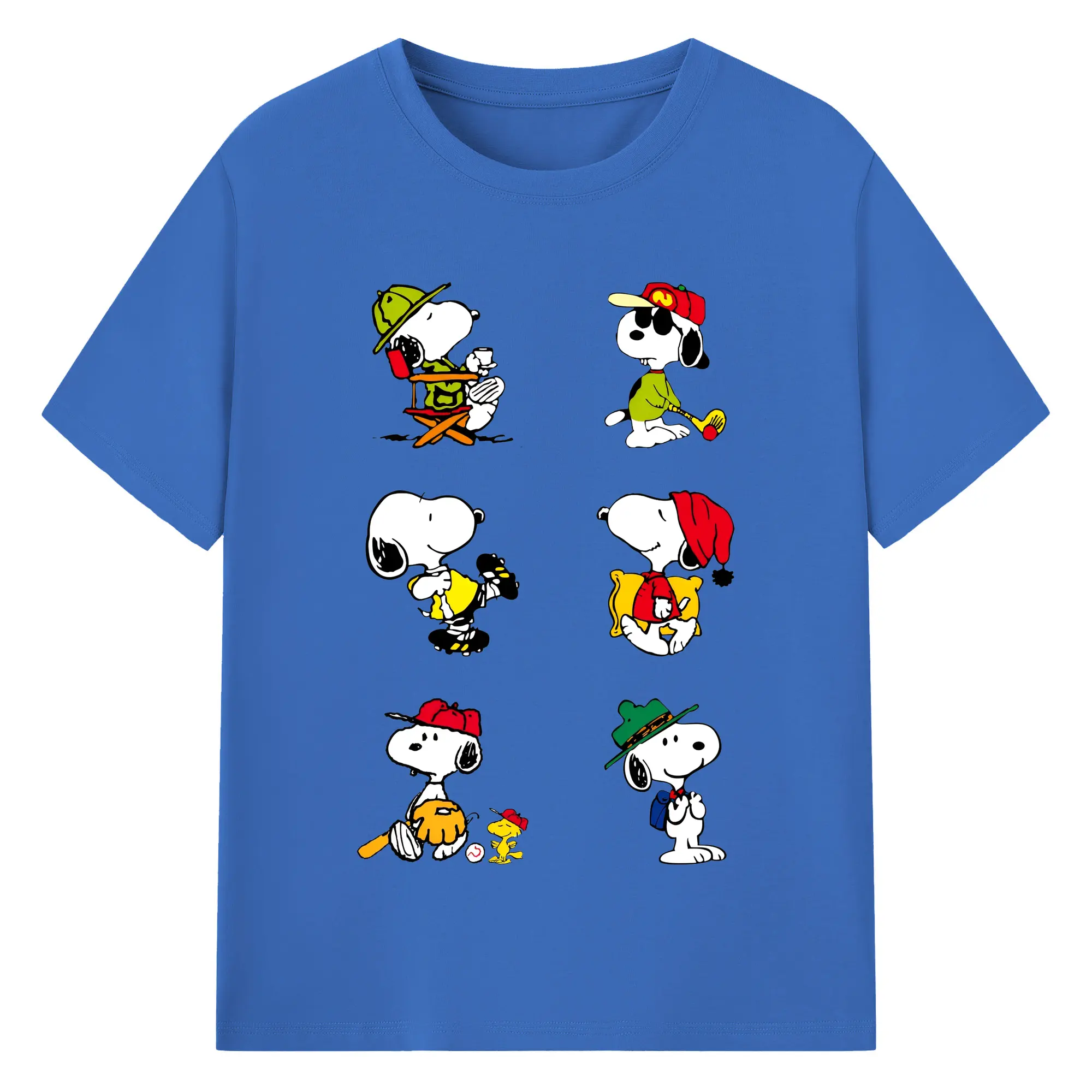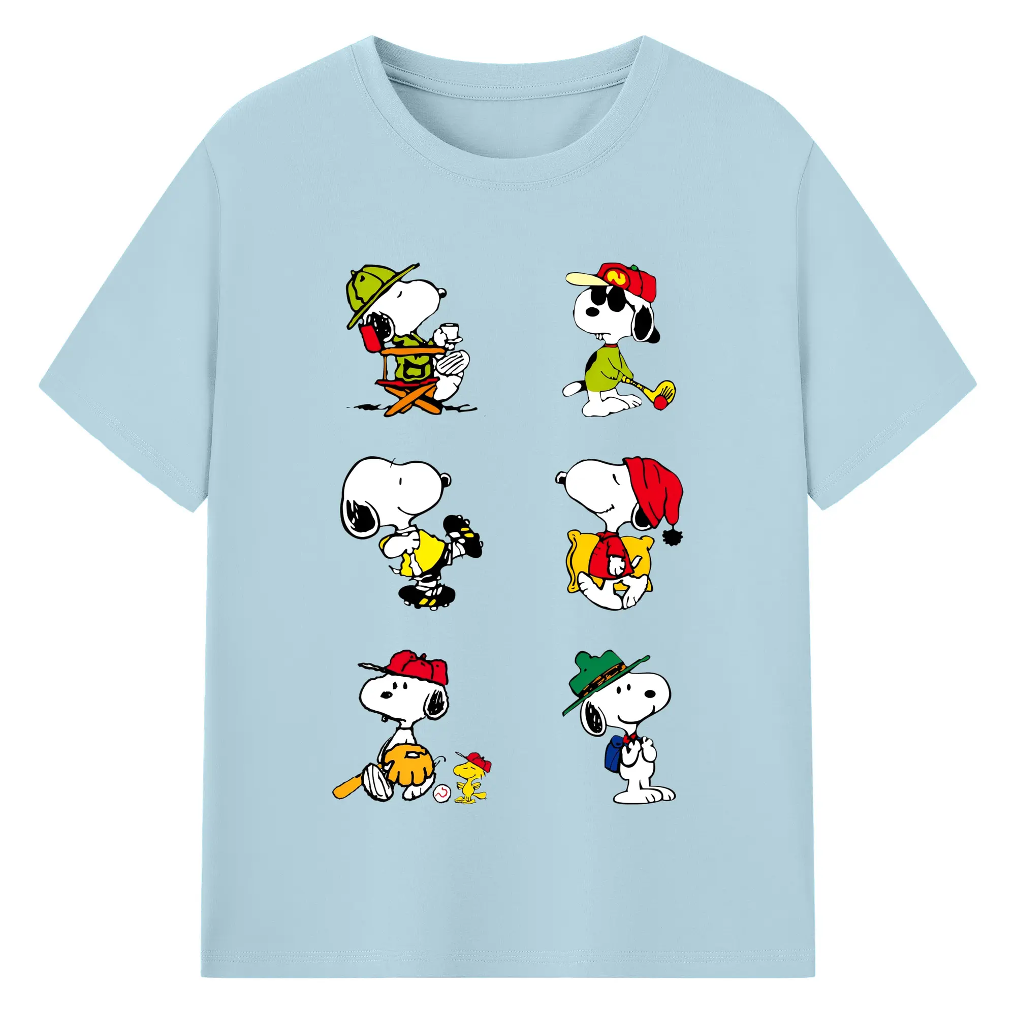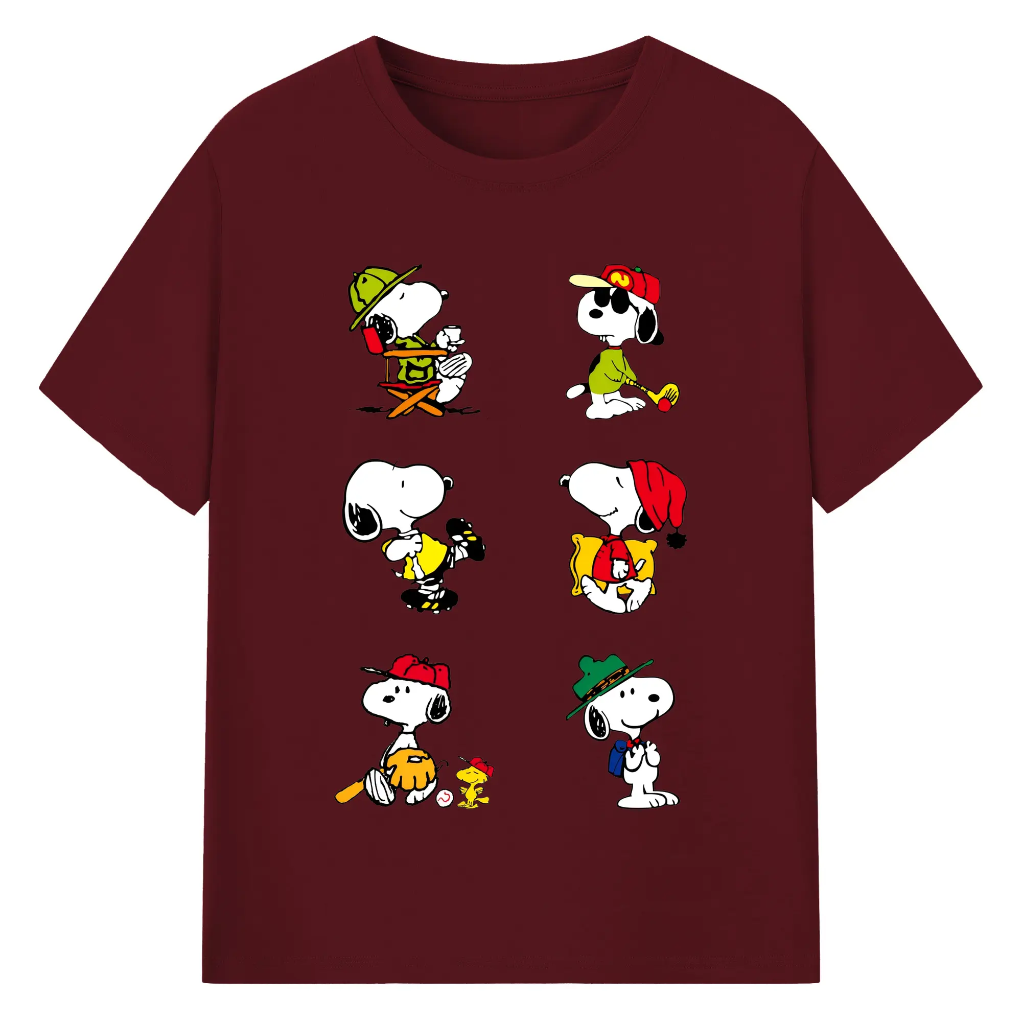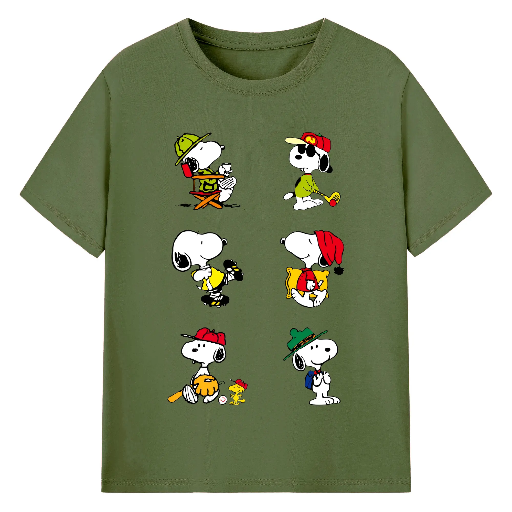 かわいいスヌーピー 大集合 - 綿100% ヴィンテージ風 半袖Tシャツ ・ フロントプリント ・ 柔らか肌触り ・ 通気性 快適 ・ スポーツ カジュアル 外出用