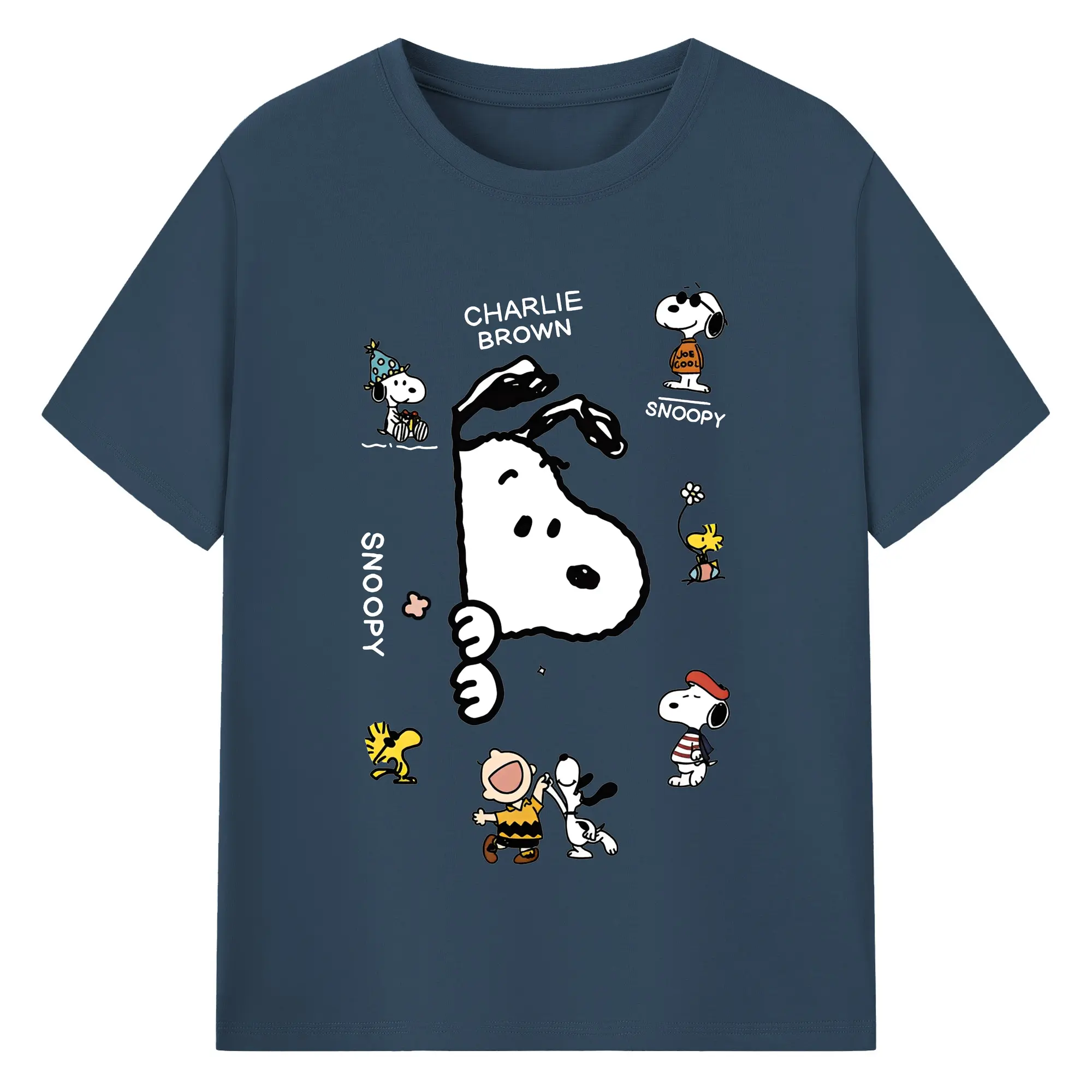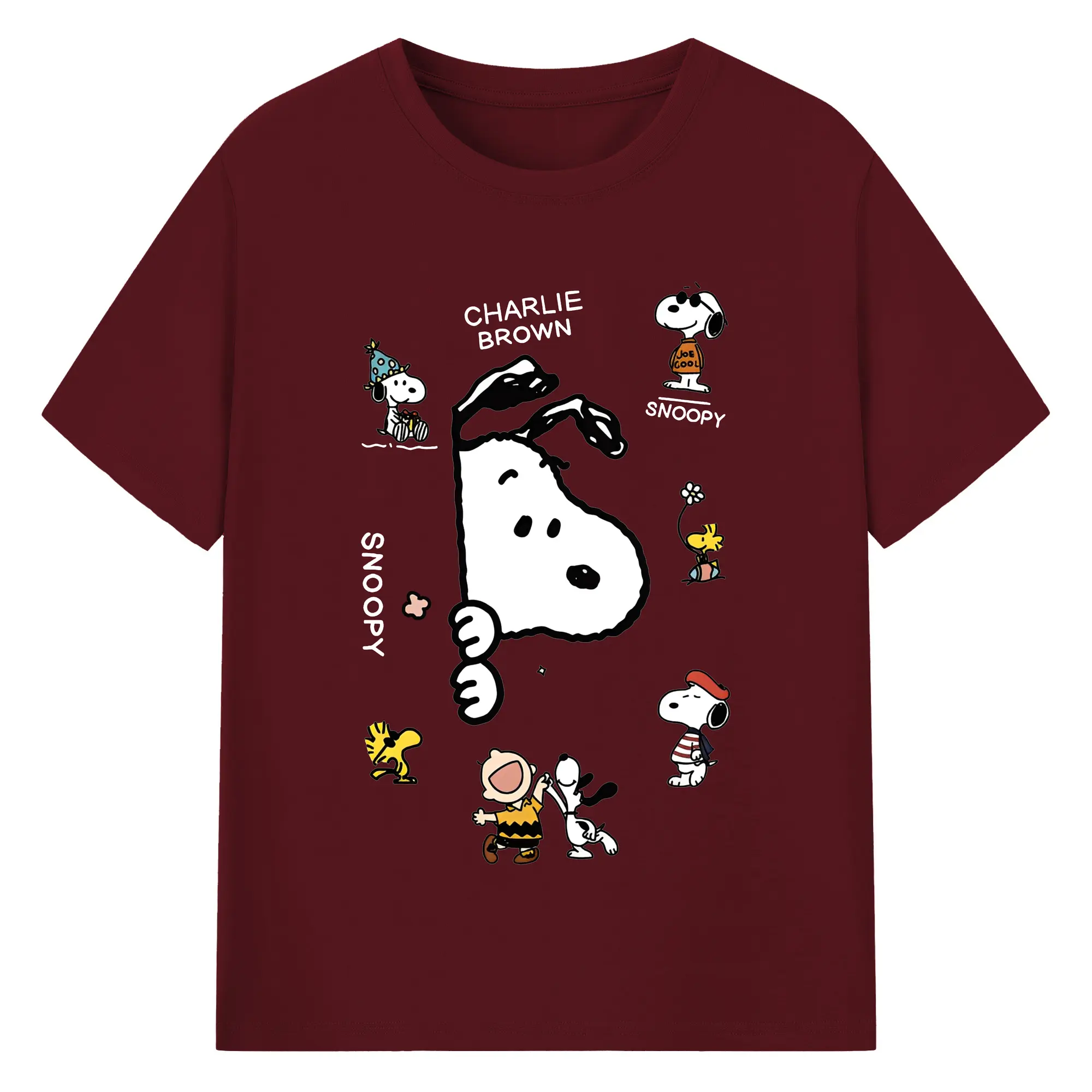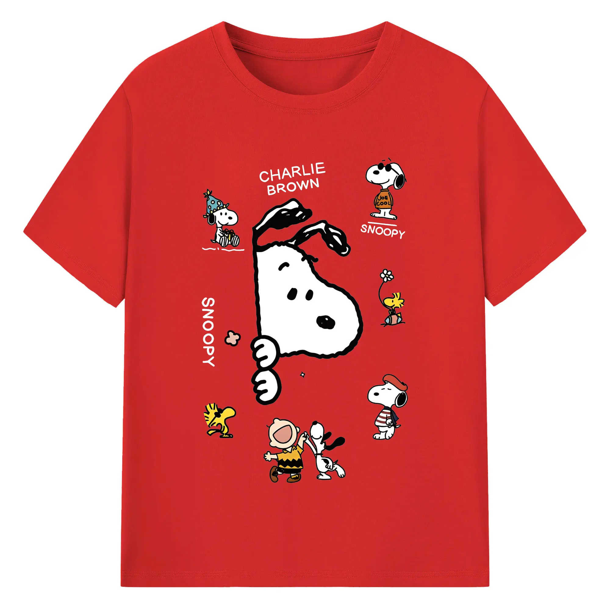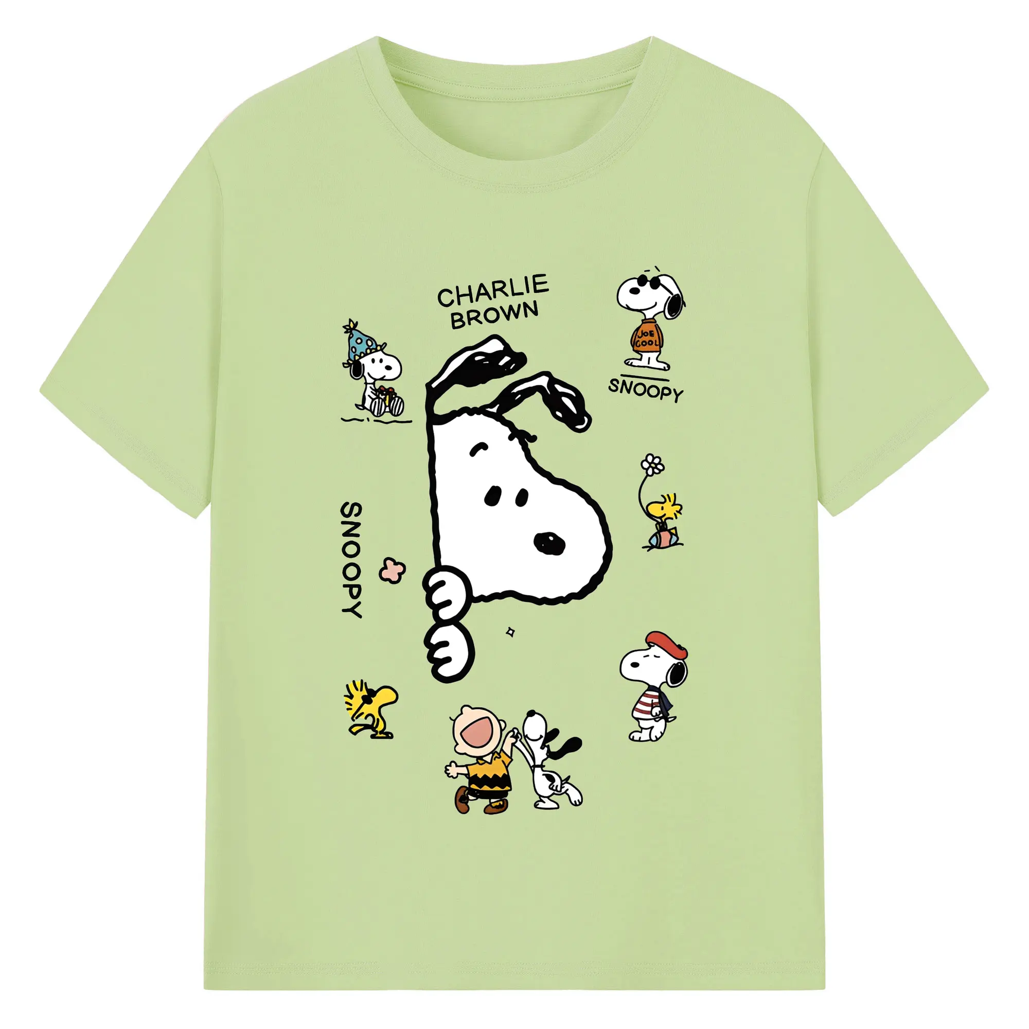 かわいいスヌーピー 大集合 - 綿100% 半袖Tシャツ ・ フロントプリント ・ 快適 通気性 ・ 日常使い 散歩 スポーツ用