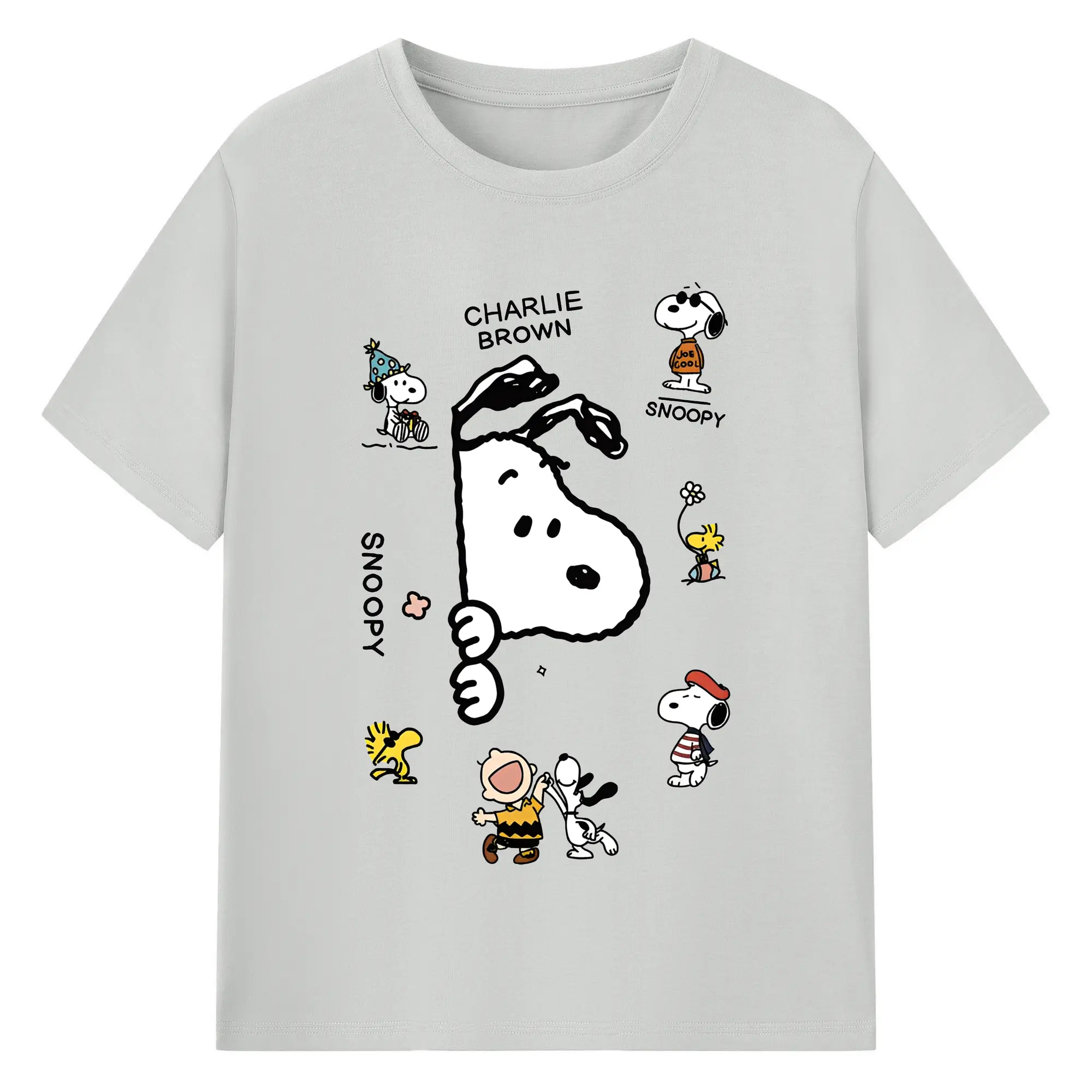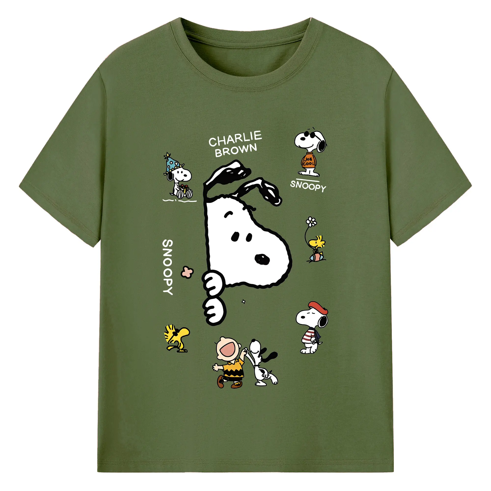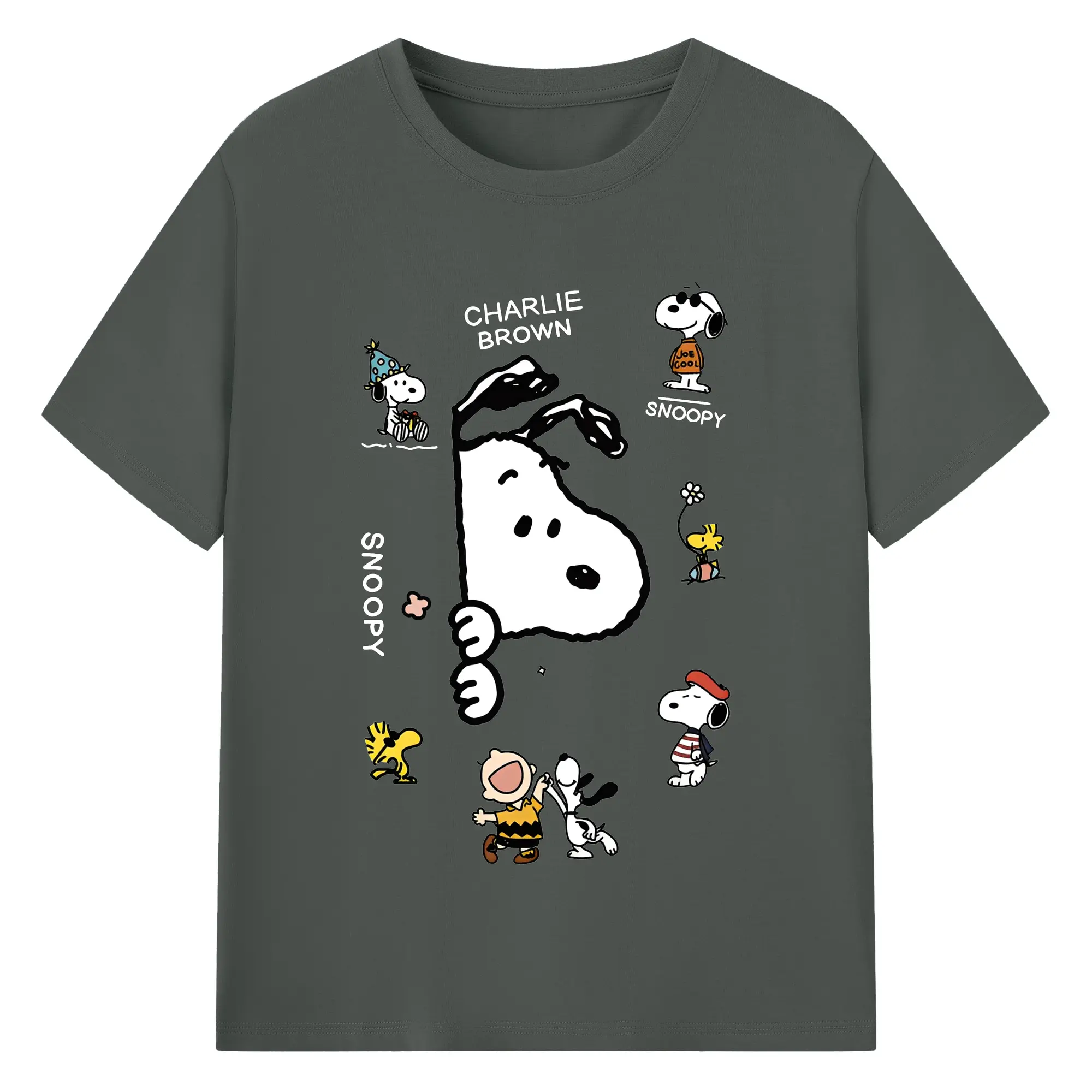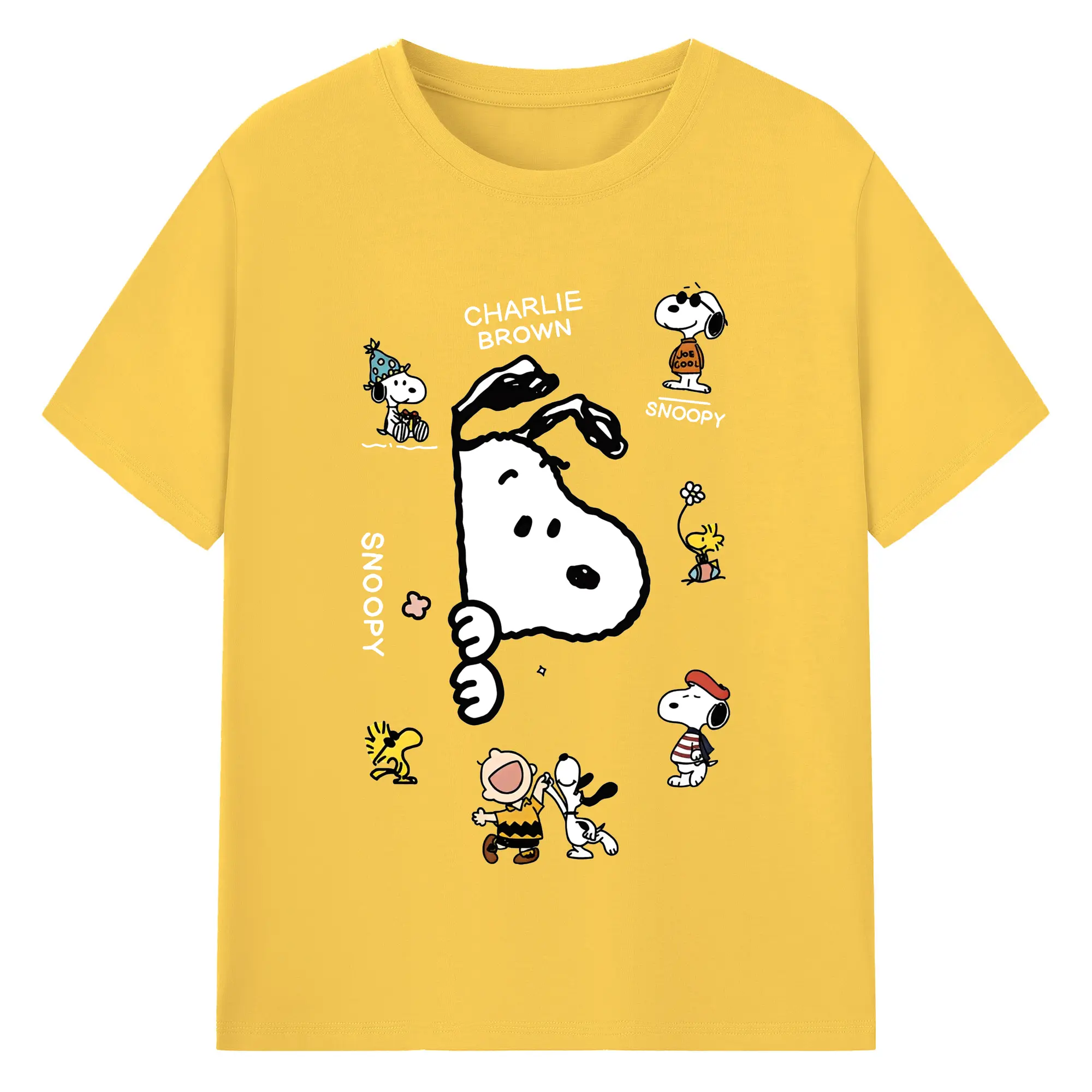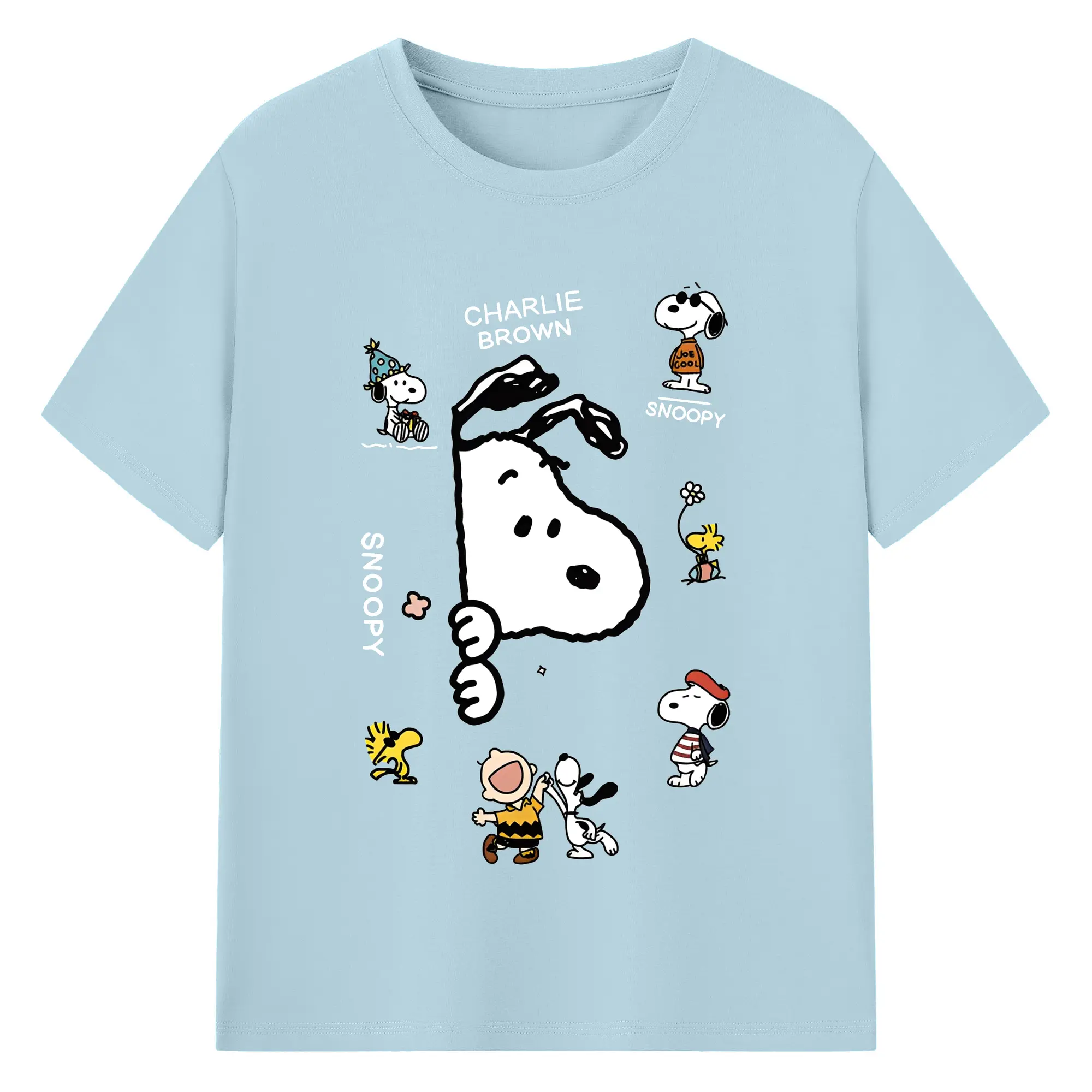 かわいいスヌーピー 大集合 - 綿100% 半袖Tシャツ ・ フロントプリント ・ 快適 通気性 ・ 日常使い 散歩 スポーツ用