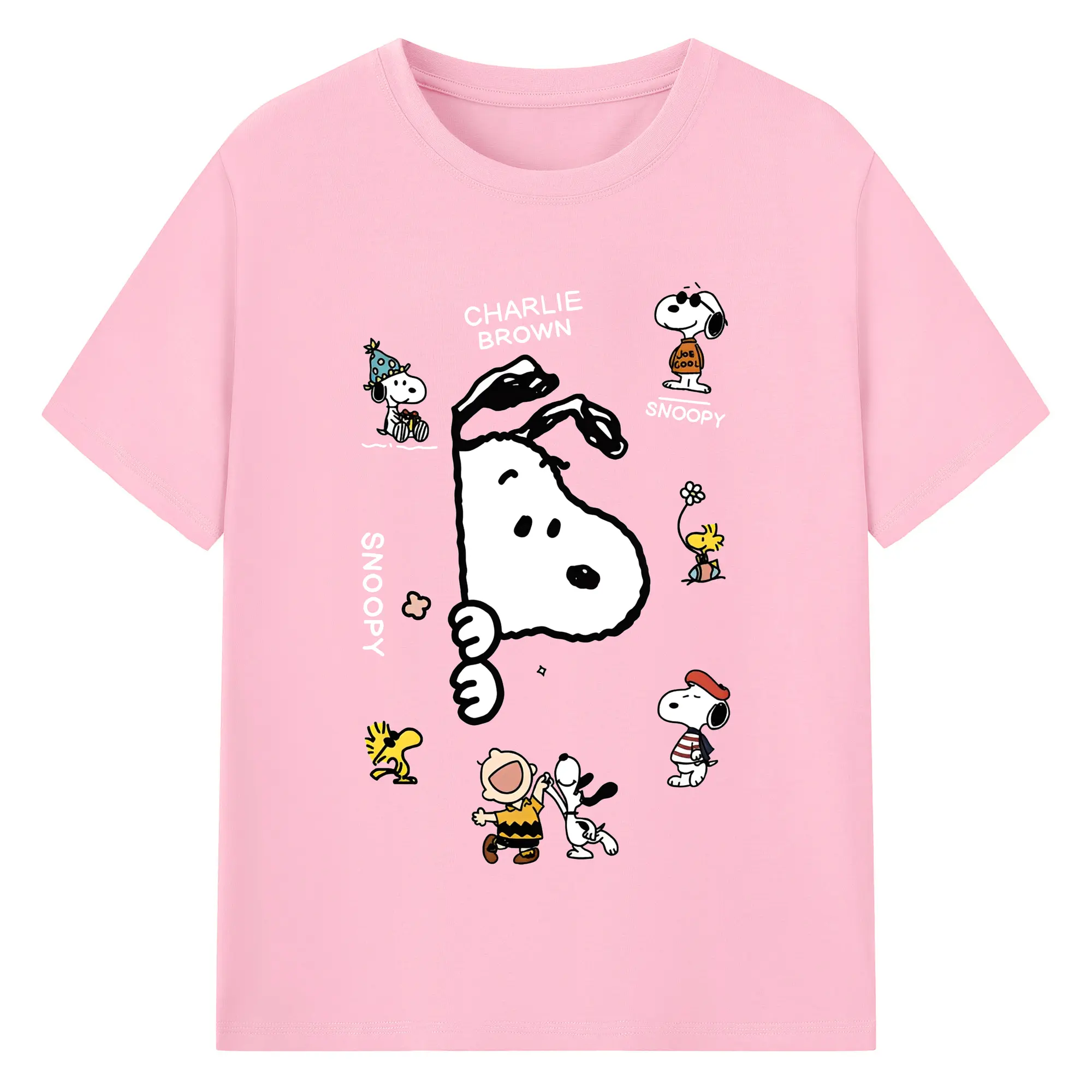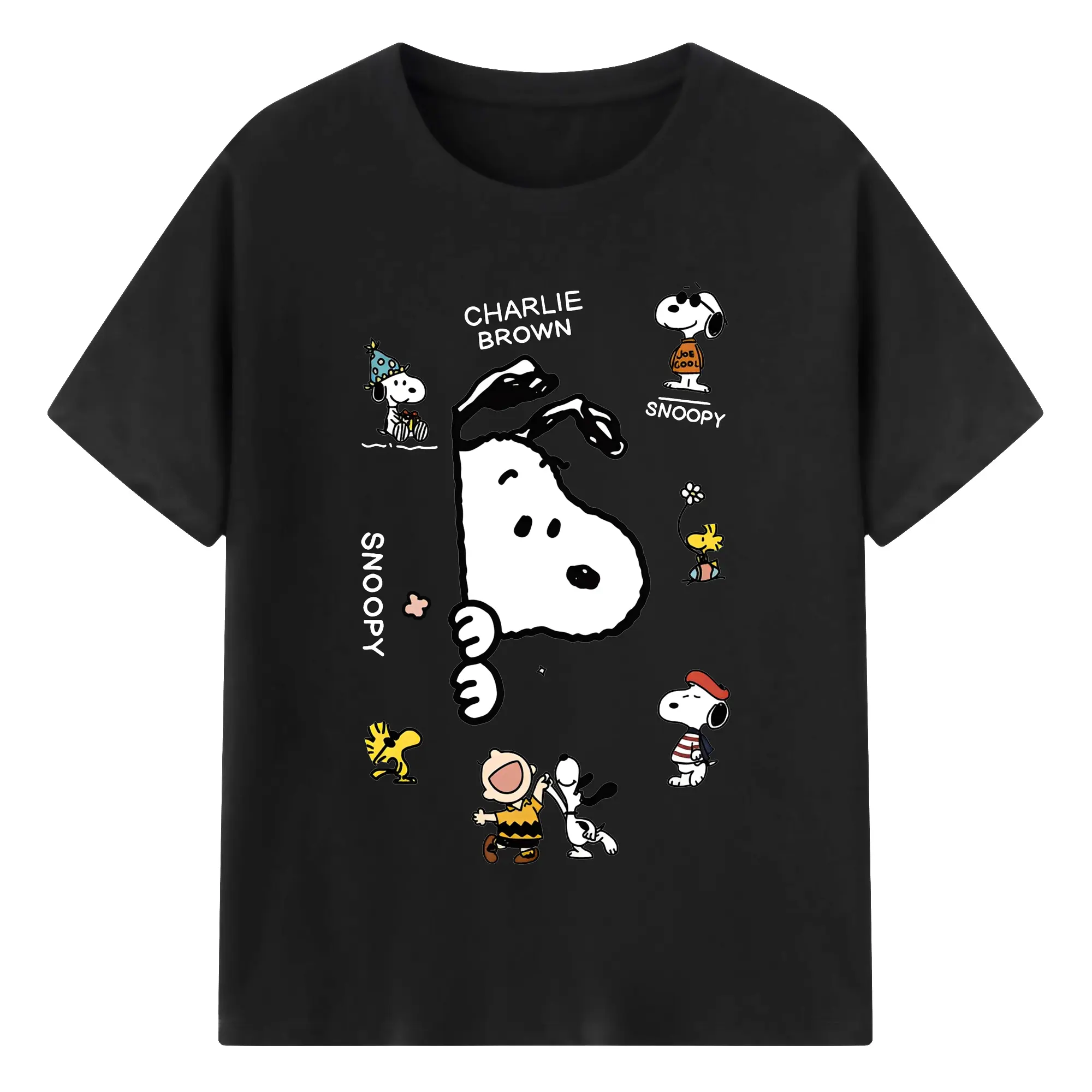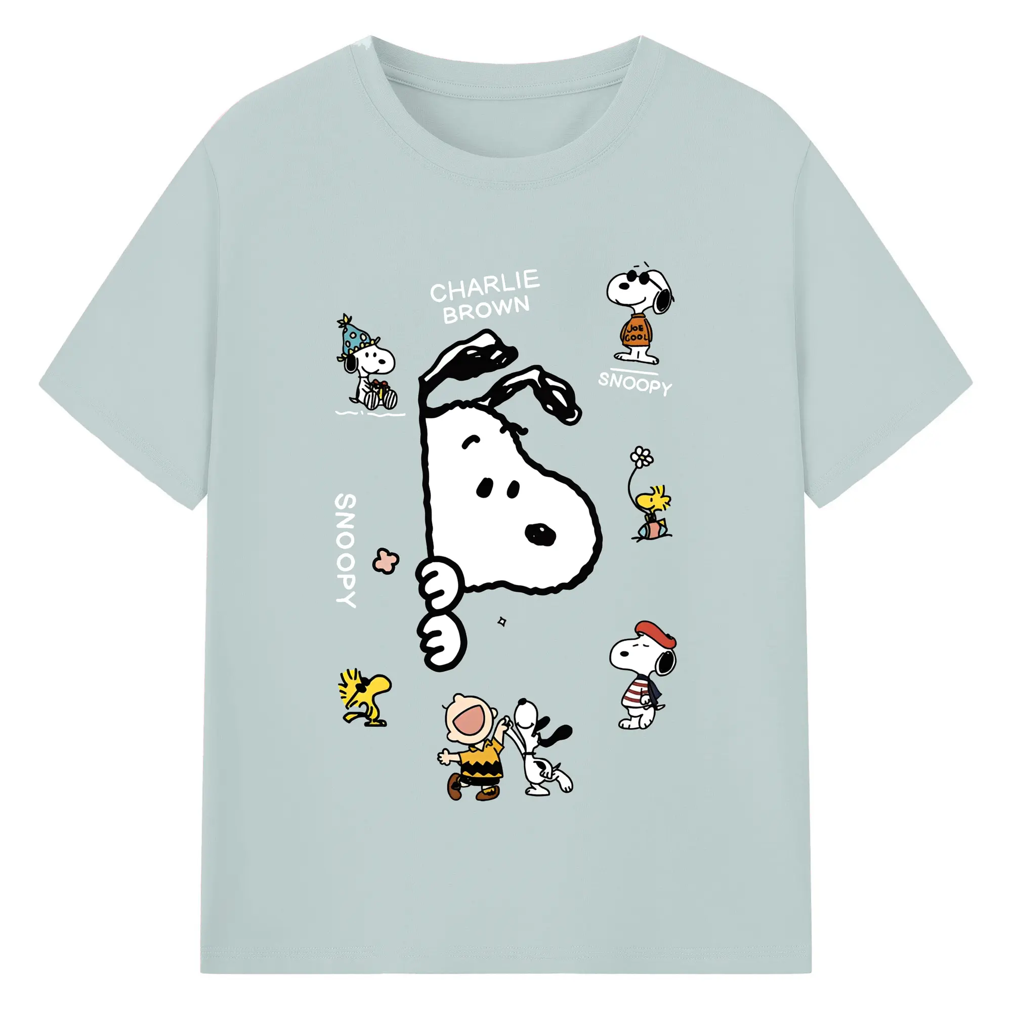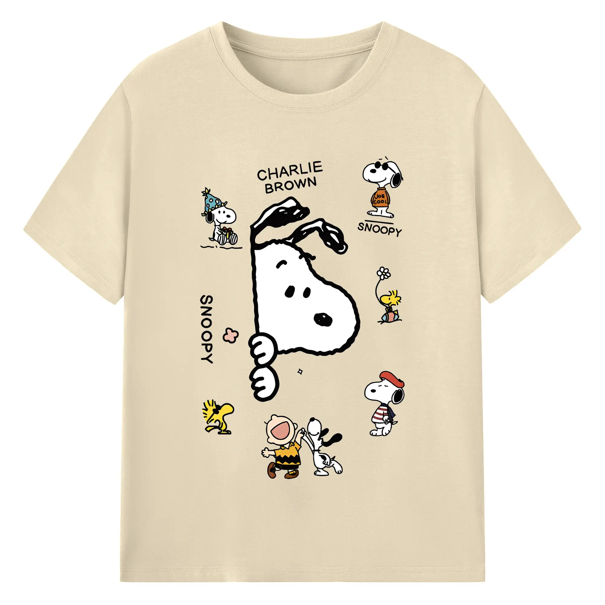 かわいいスヌーピー 大集合 - 綿100% 半袖Tシャツ ・ フロントプリント ・ 快適 通気性 ・ 日常使い 散歩 スポーツ用