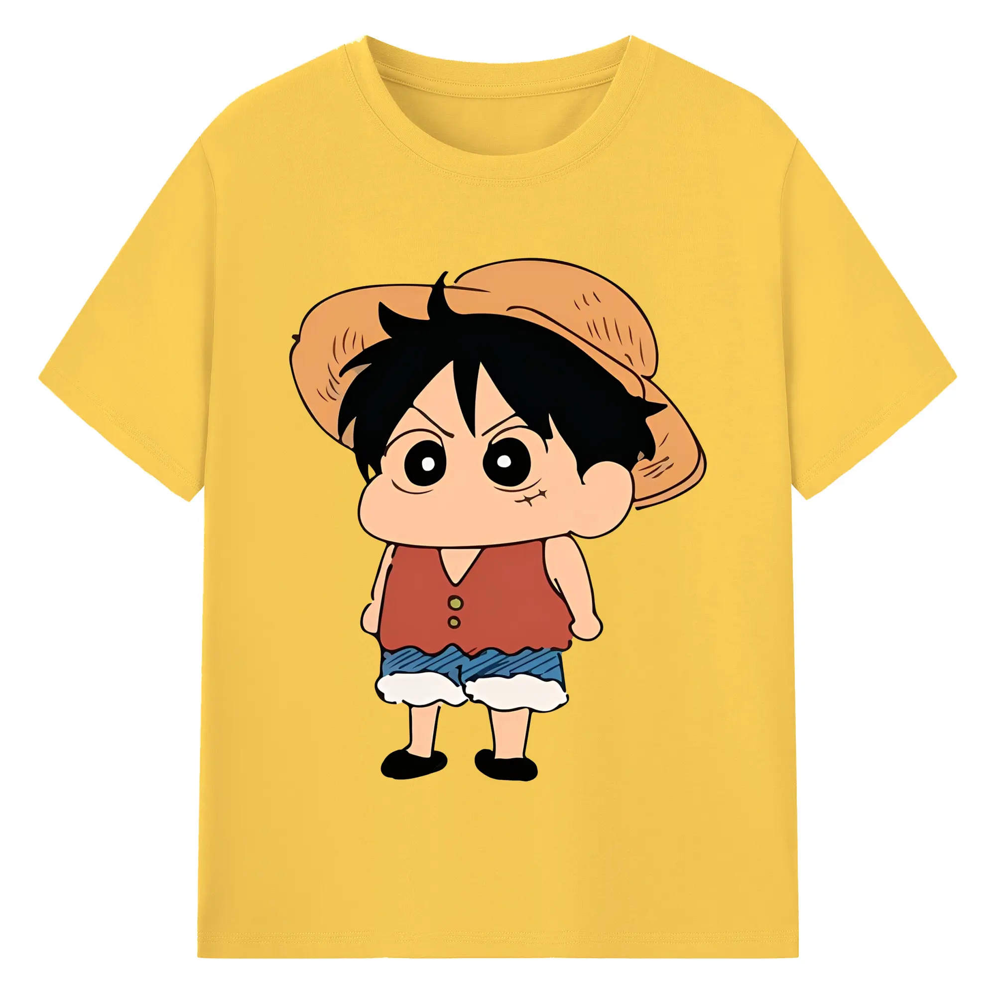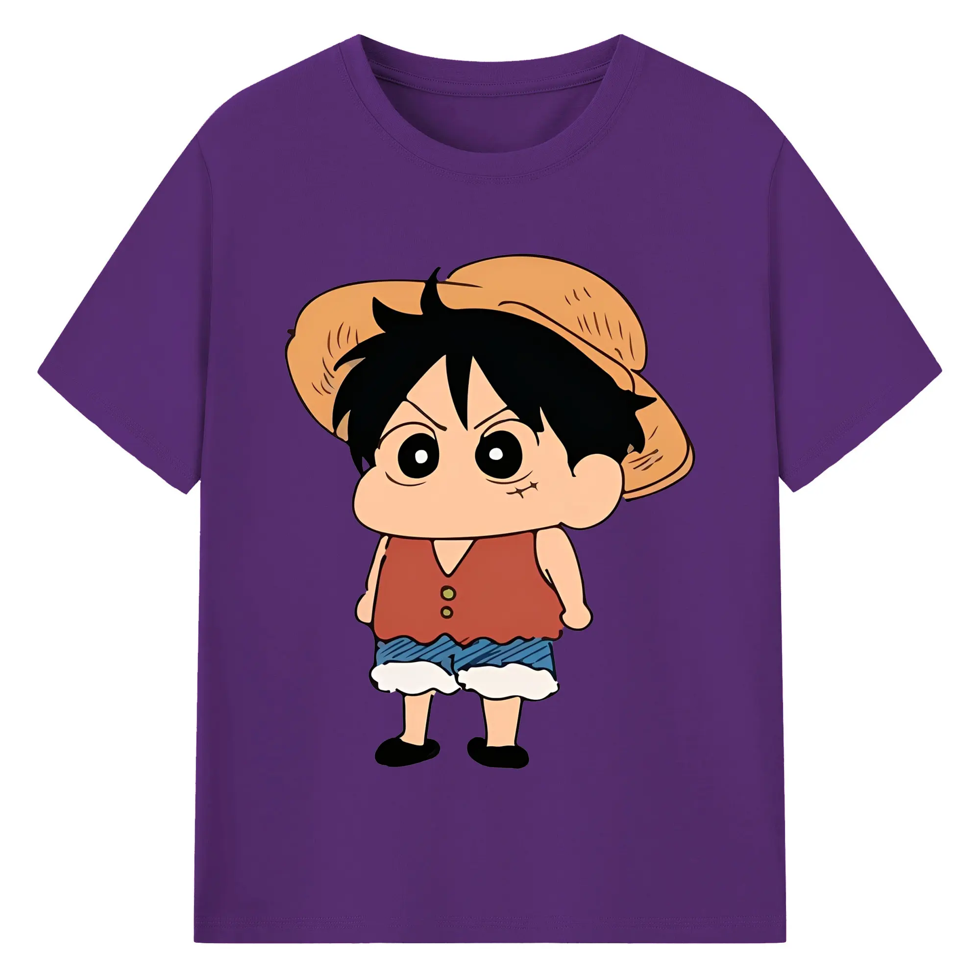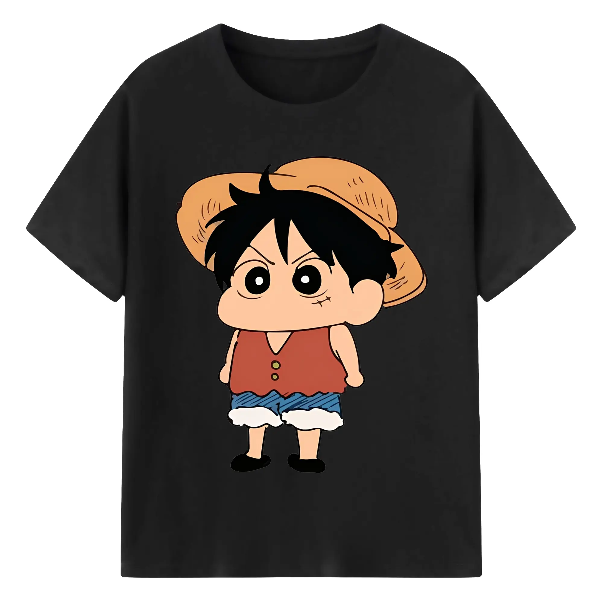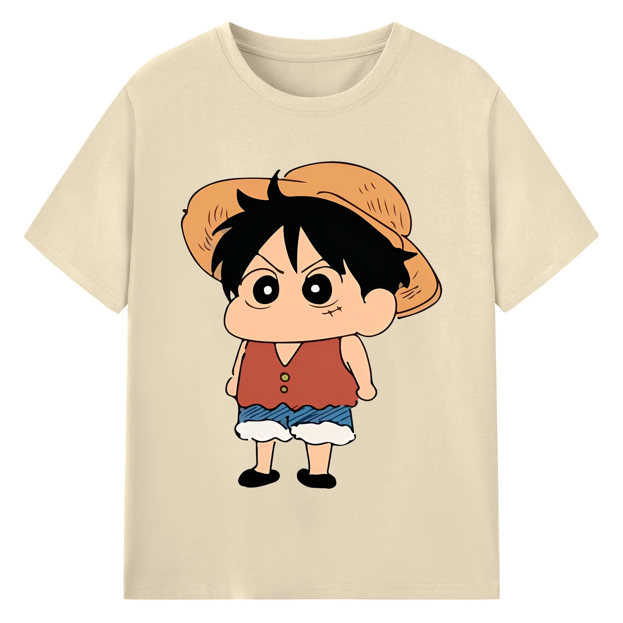 クレヨンしんちゃん × ルフィ 限定コラボ - 綿100% ヴィンテージ風 半袖Tシャツ ・ フロントプリント ・ 柔らか肌触り ・ 通気性 快適 ・ スポーツ カジュアル 外出用