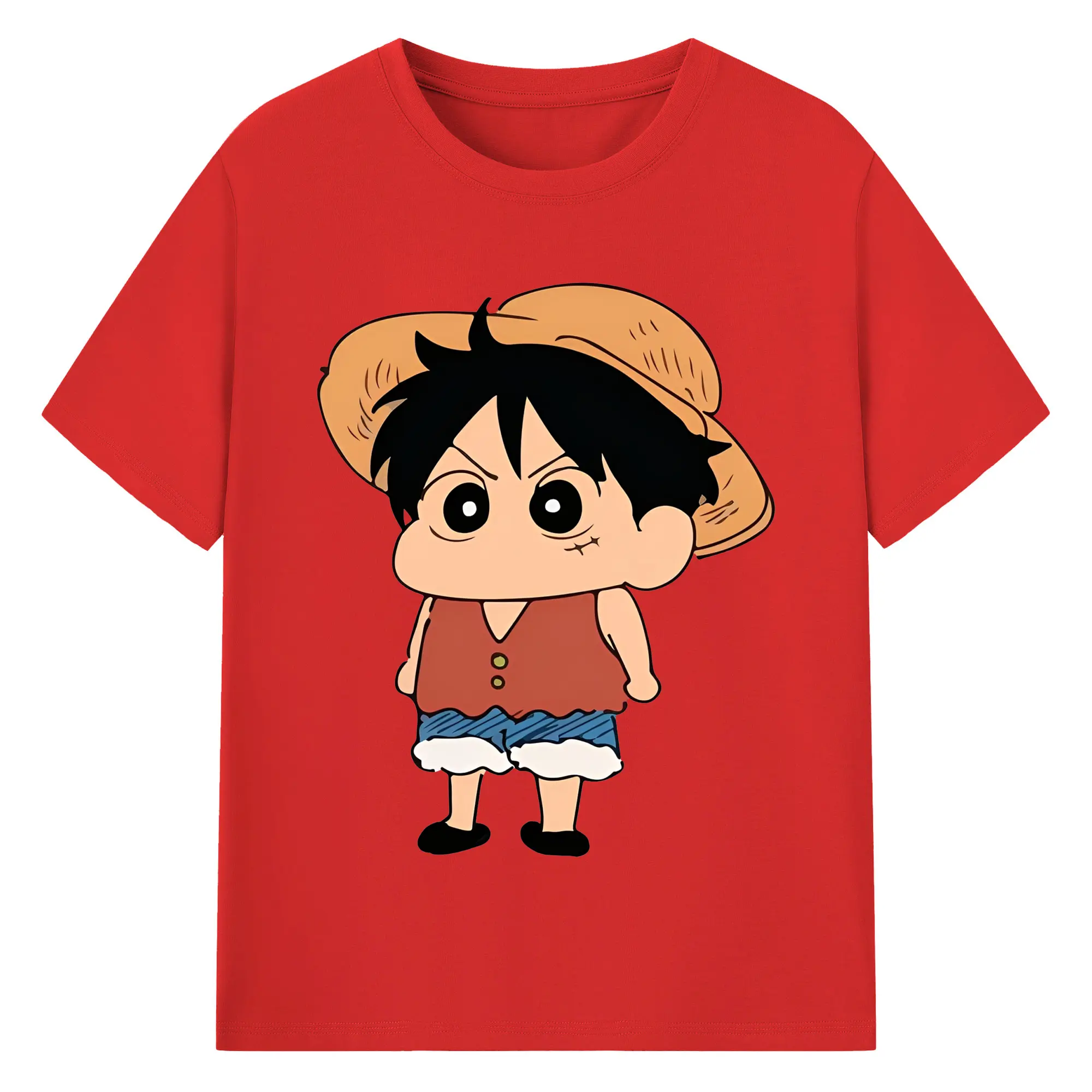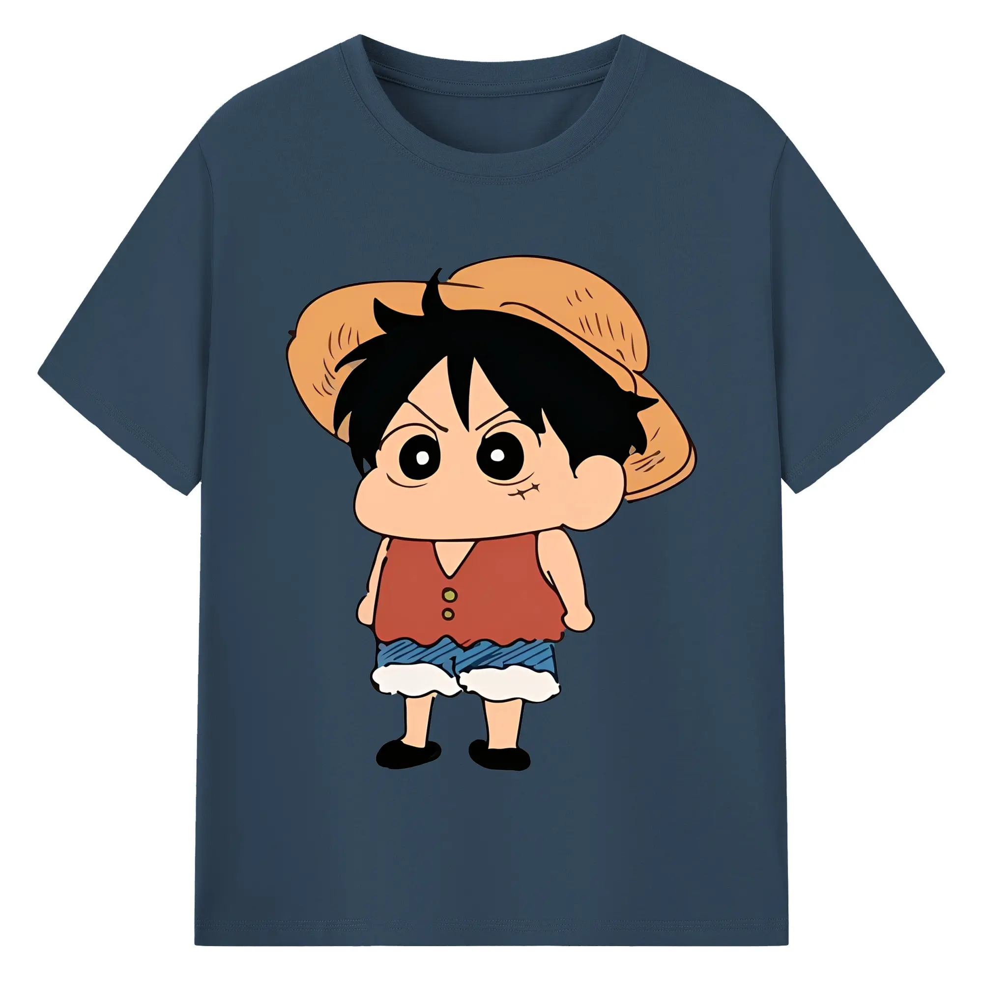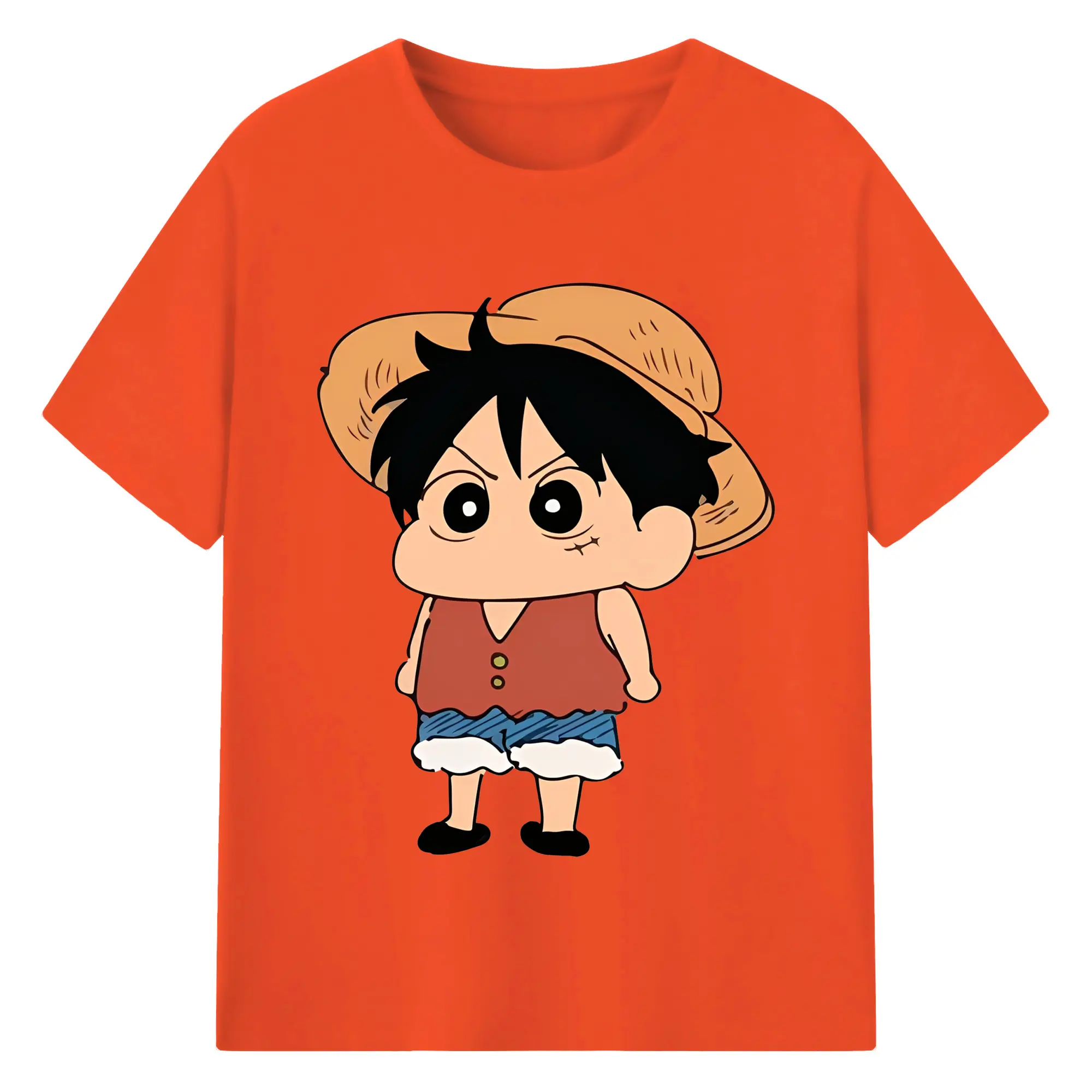 クレヨンしんちゃん × ルフィ 限定コラボ - 綿100% ヴィンテージ風 半袖Tシャツ ・ フロントプリント ・ 柔らか肌触り ・ 通気性 快適 ・ スポーツ カジュアル 外出用