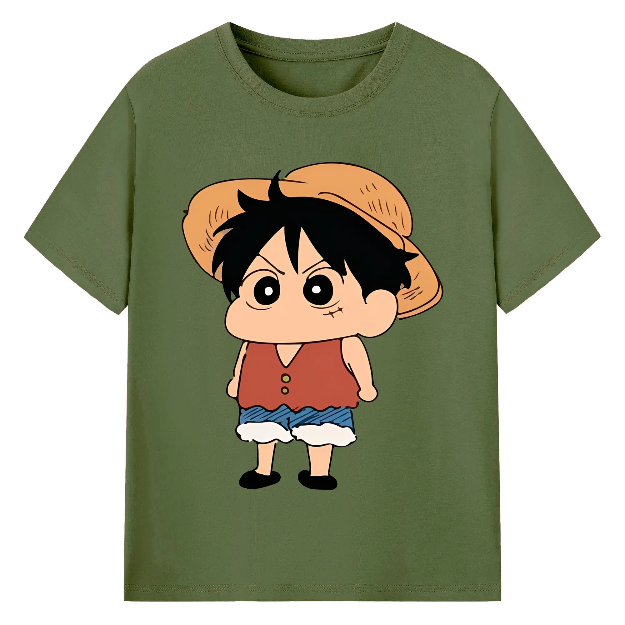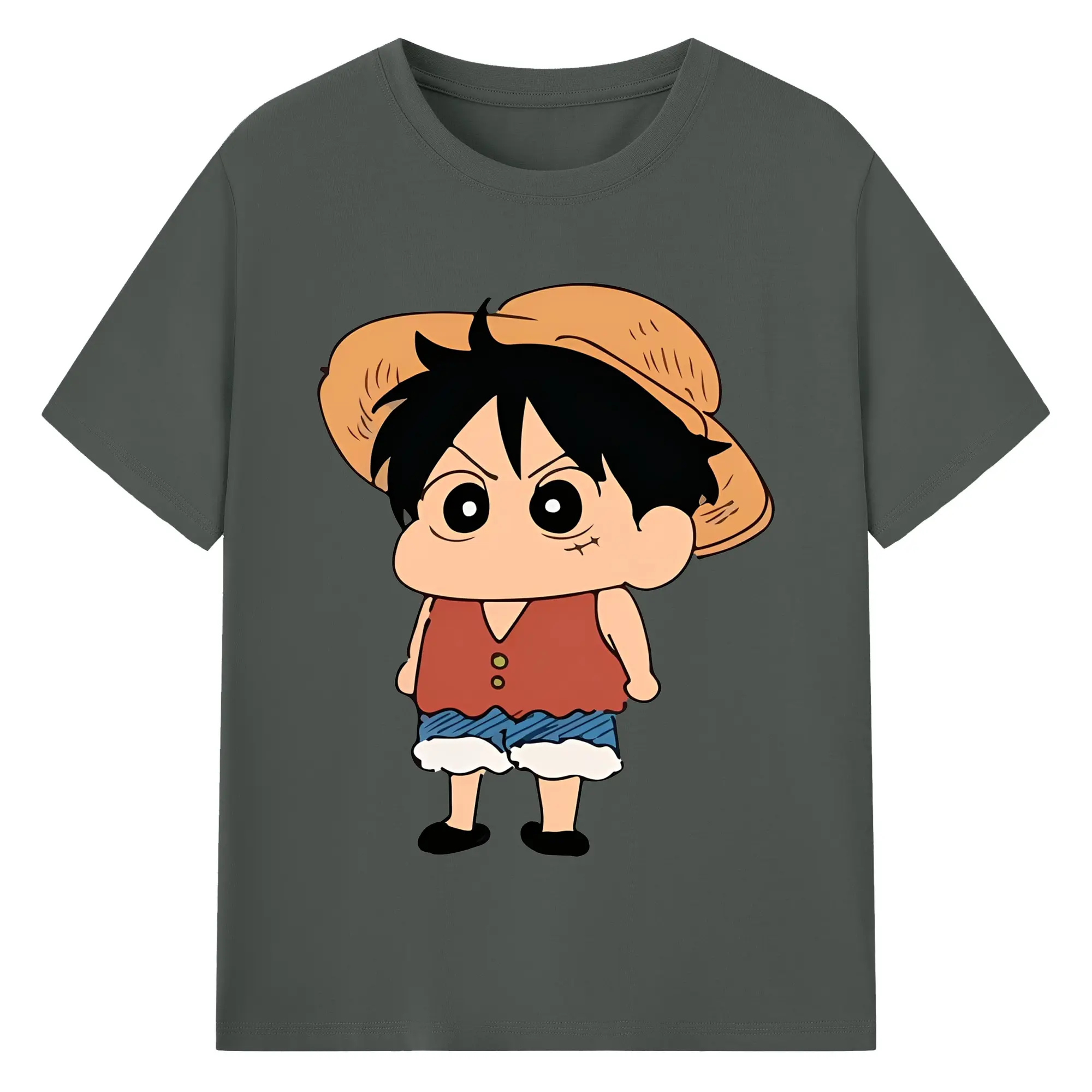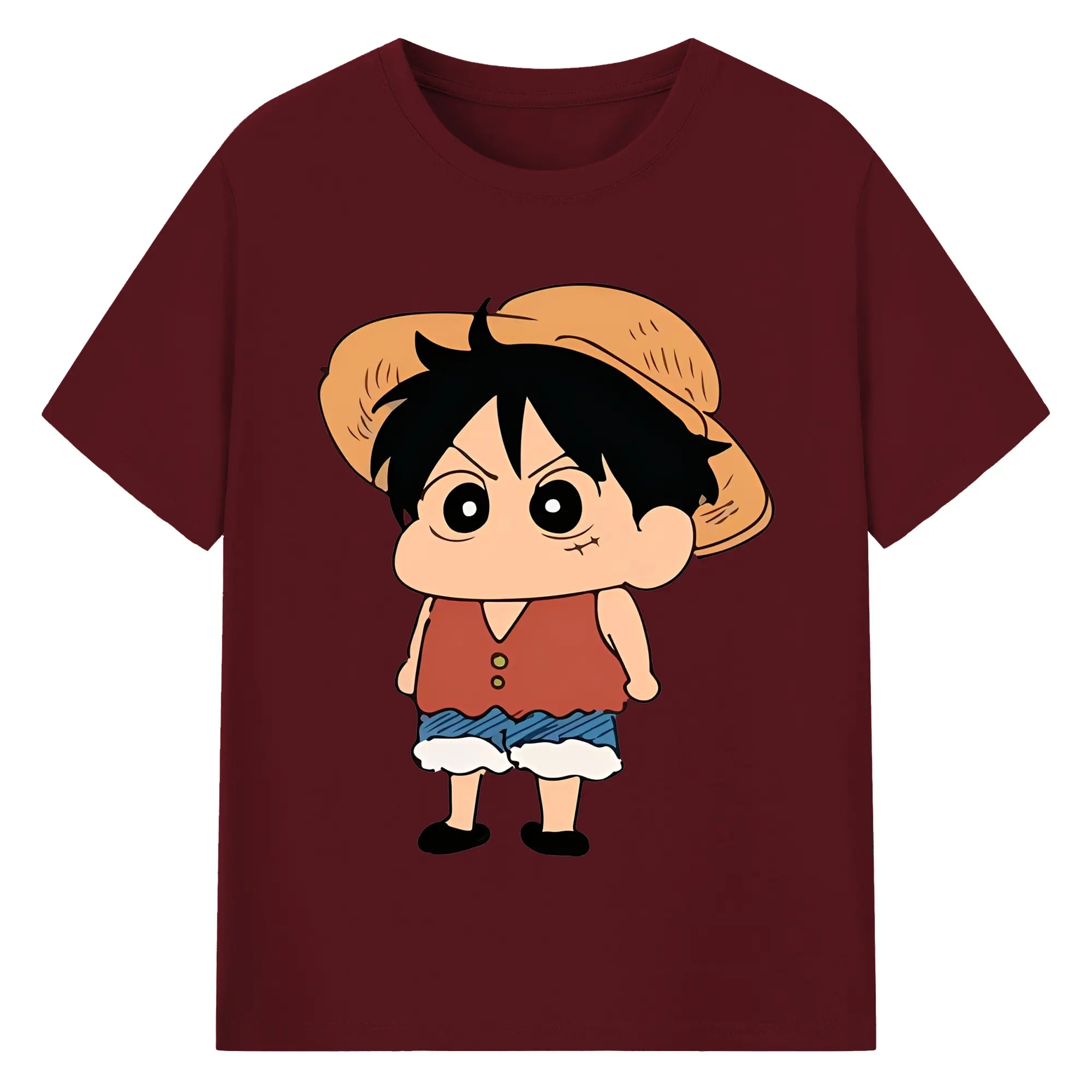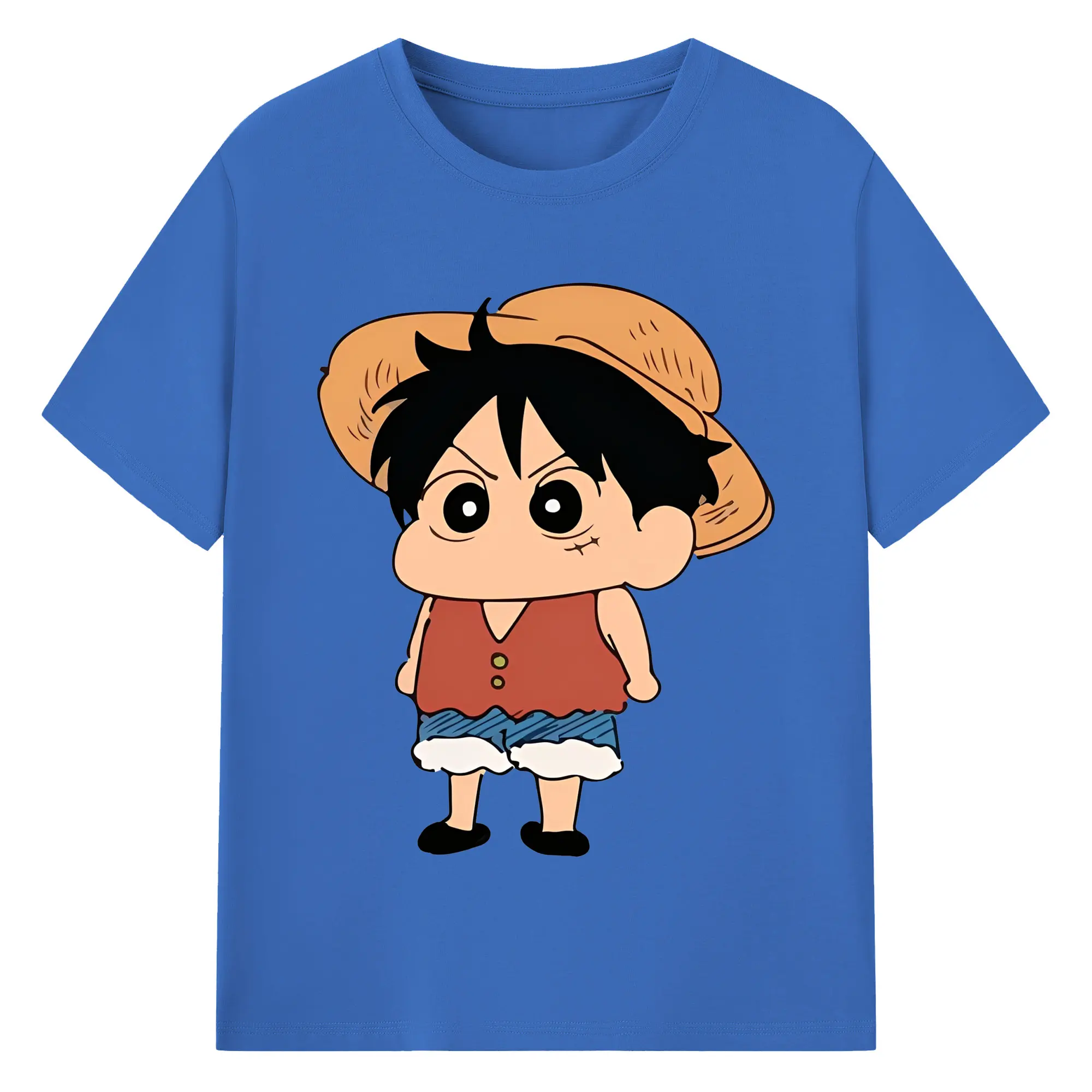 クレヨンしんちゃん × ルフィ 限定コラボ - 綿100% ヴィンテージ風 半袖Tシャツ ・ フロントプリント ・ 柔らか肌触り ・ 通気性 快適 ・ スポーツ カジュアル 外出用