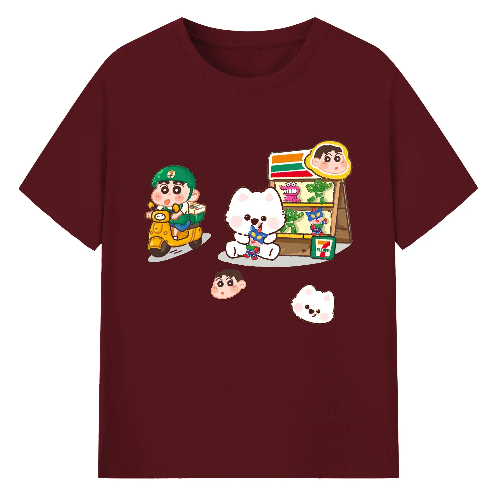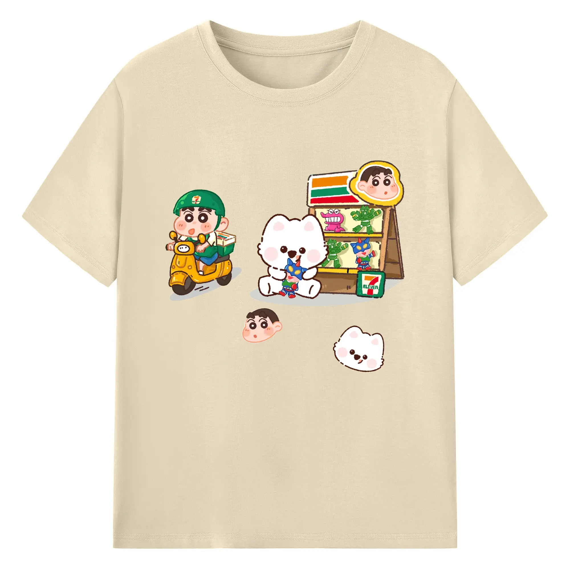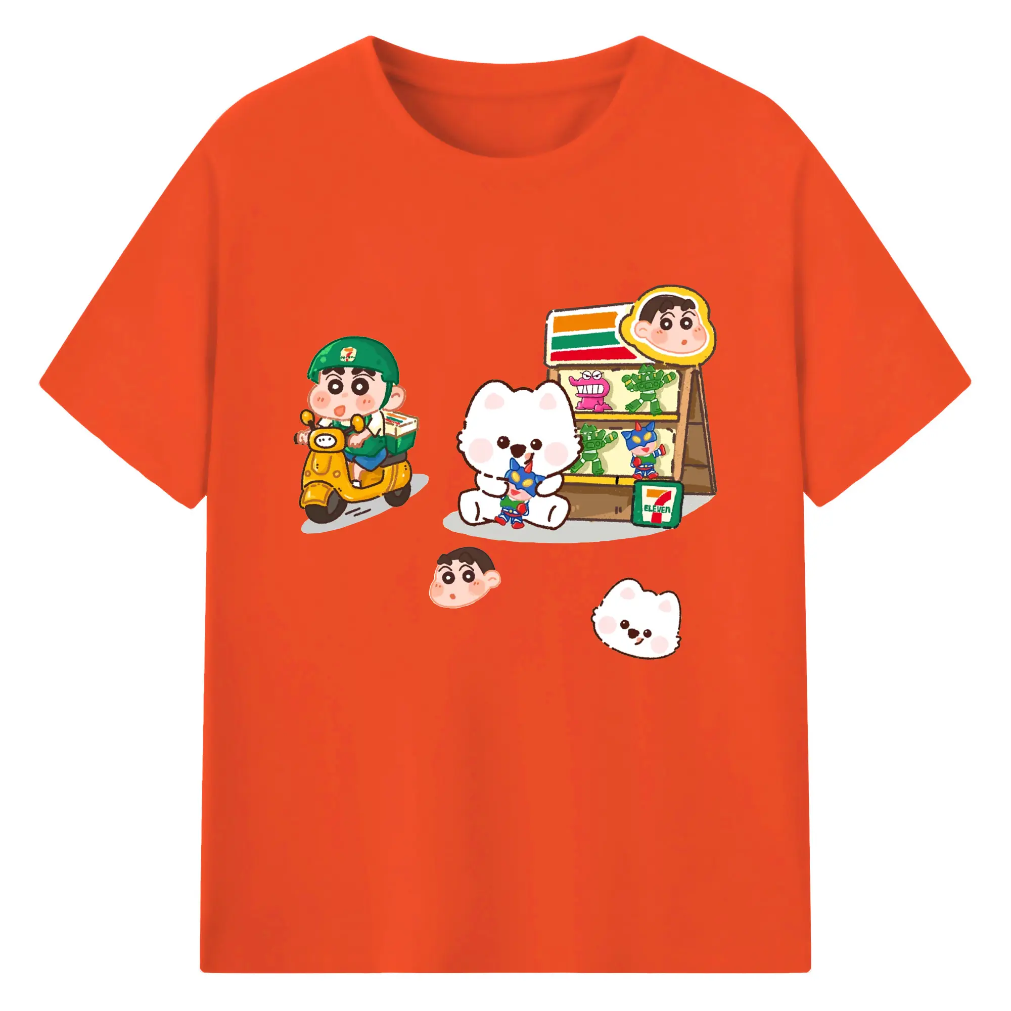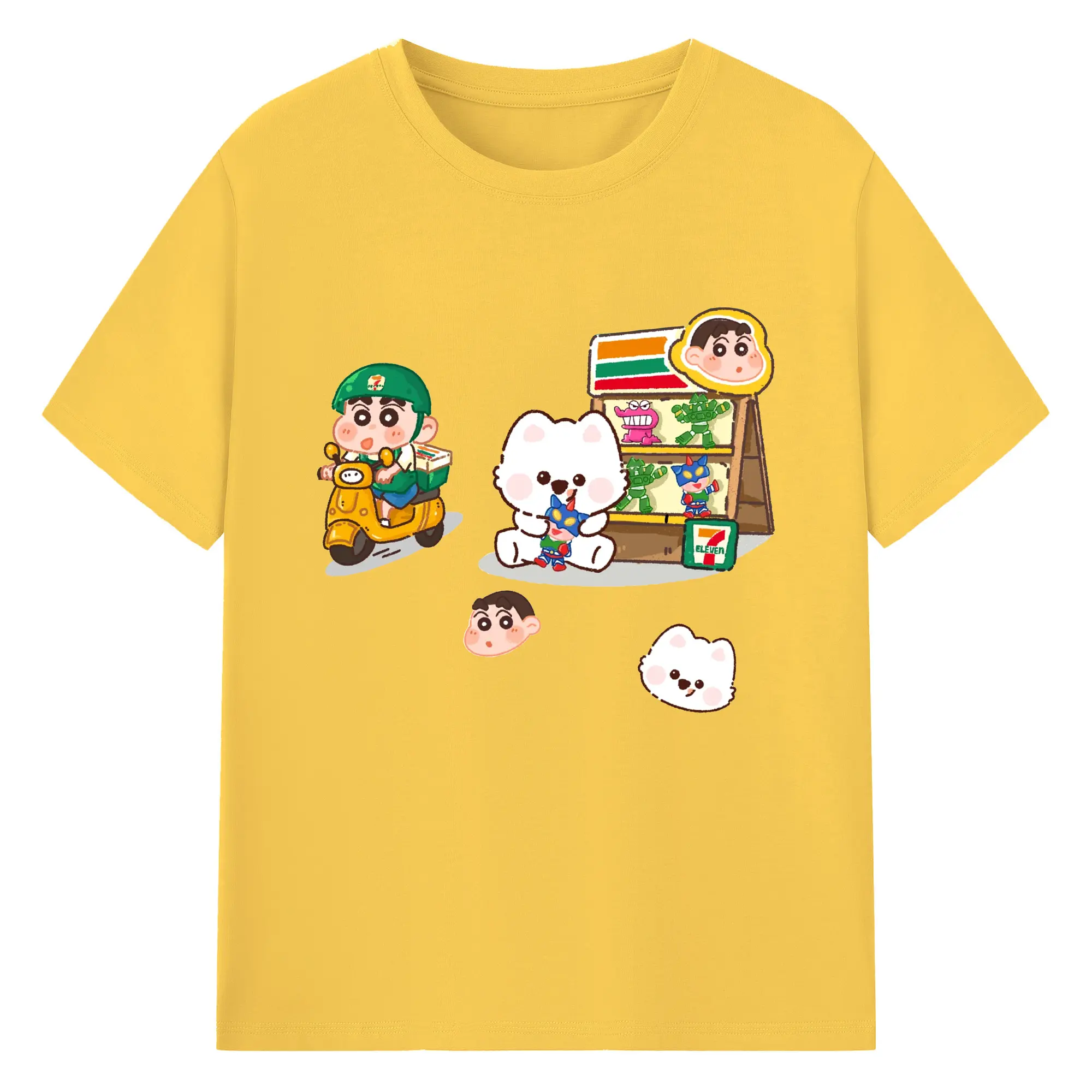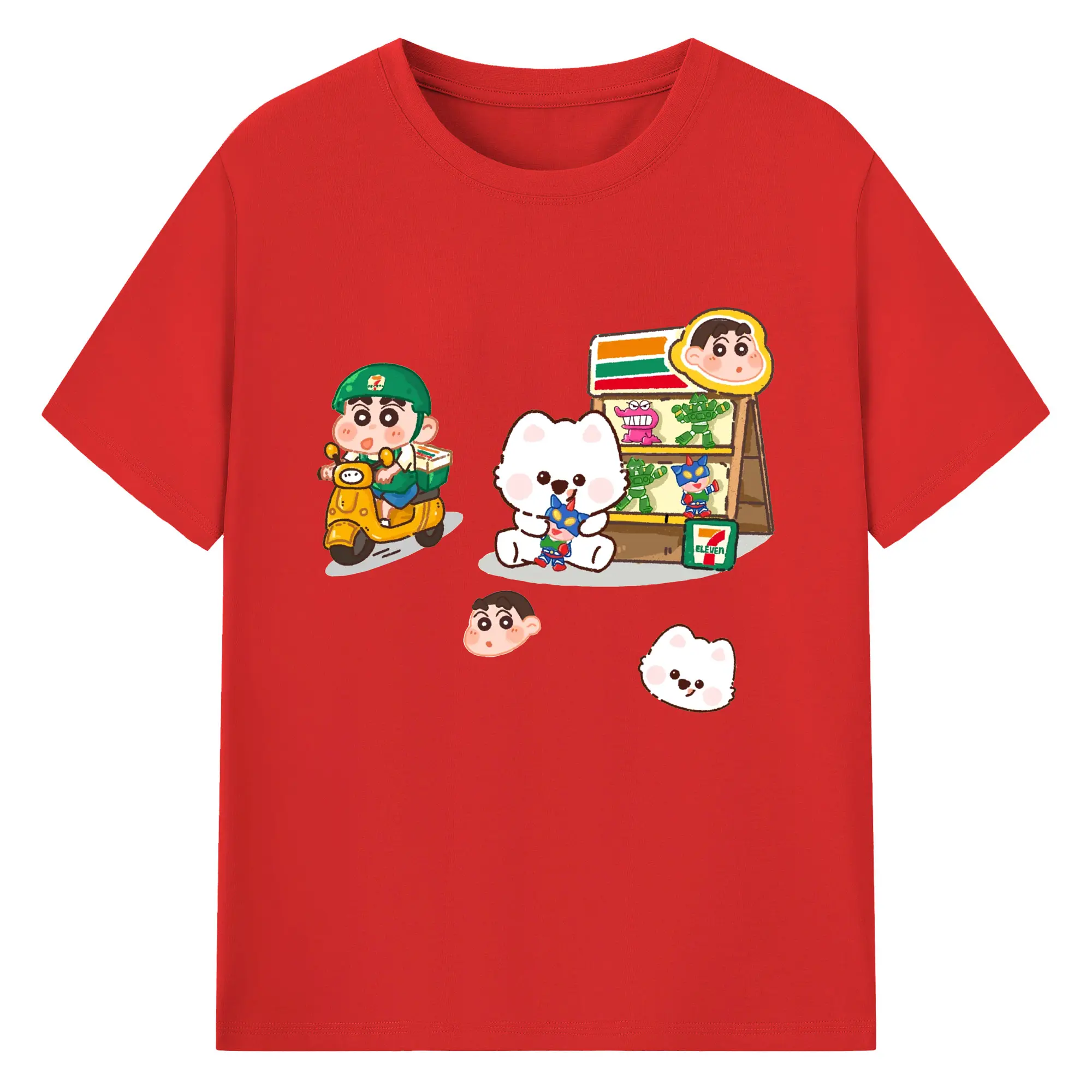 クレヨンしんちゃん × 7-Eleven 限定コラボ - 綿100% ヴィンテージ風 半袖Tシャツ ・ フロントプリント ・ 柔らか肌触り ・ 通気性 快適 ・ スポーツ カジュアル 外出用