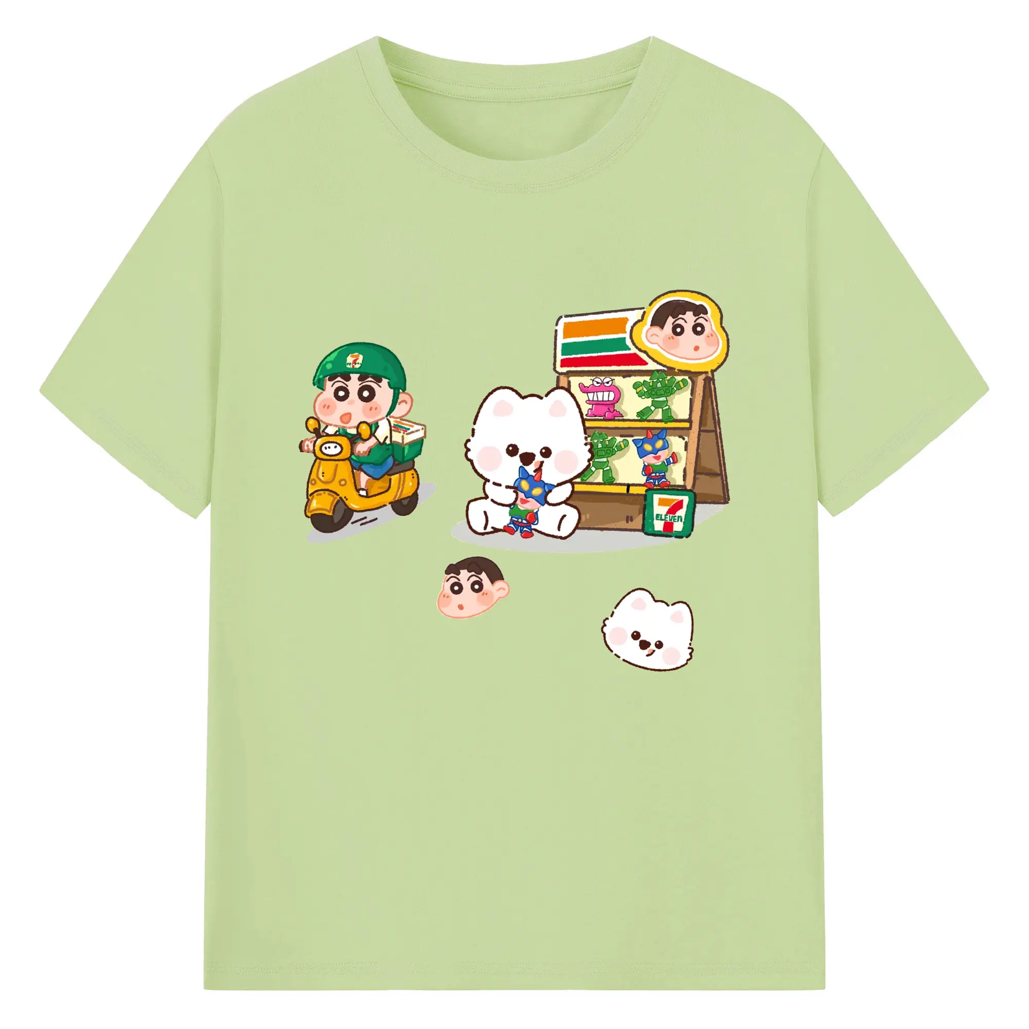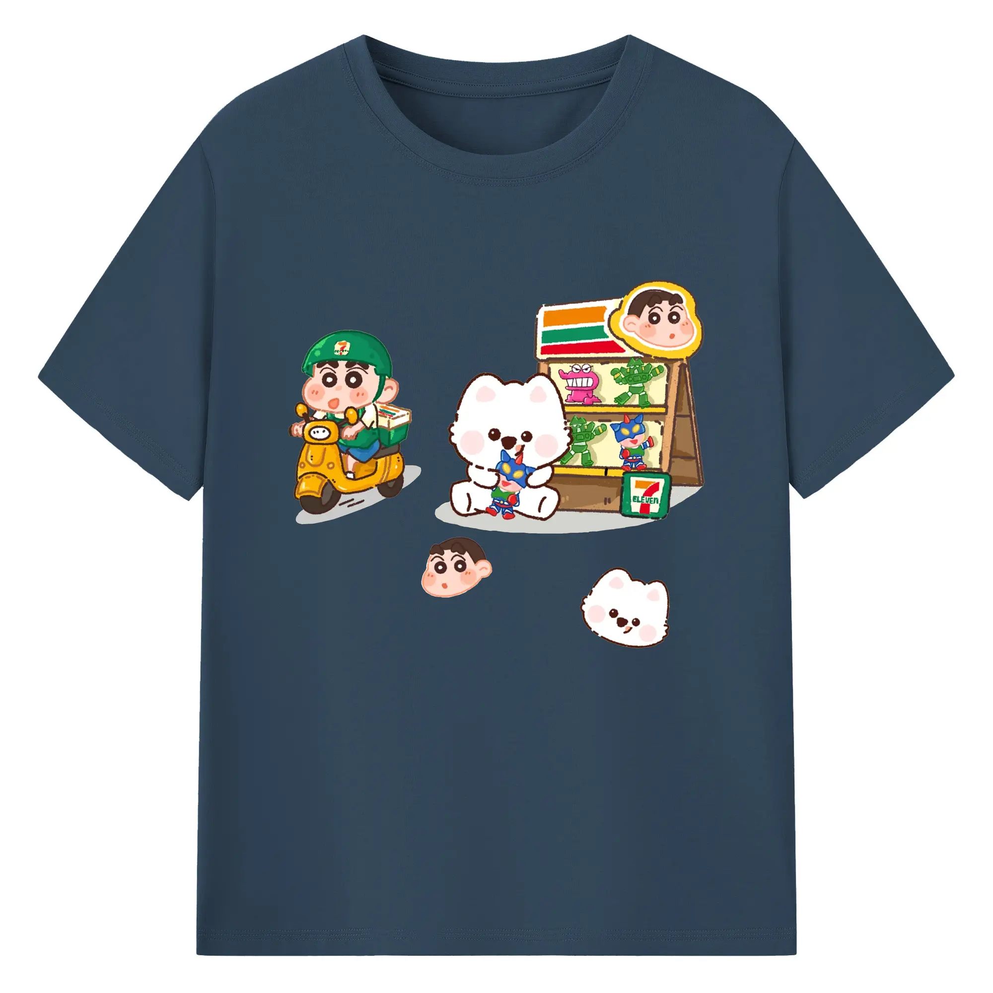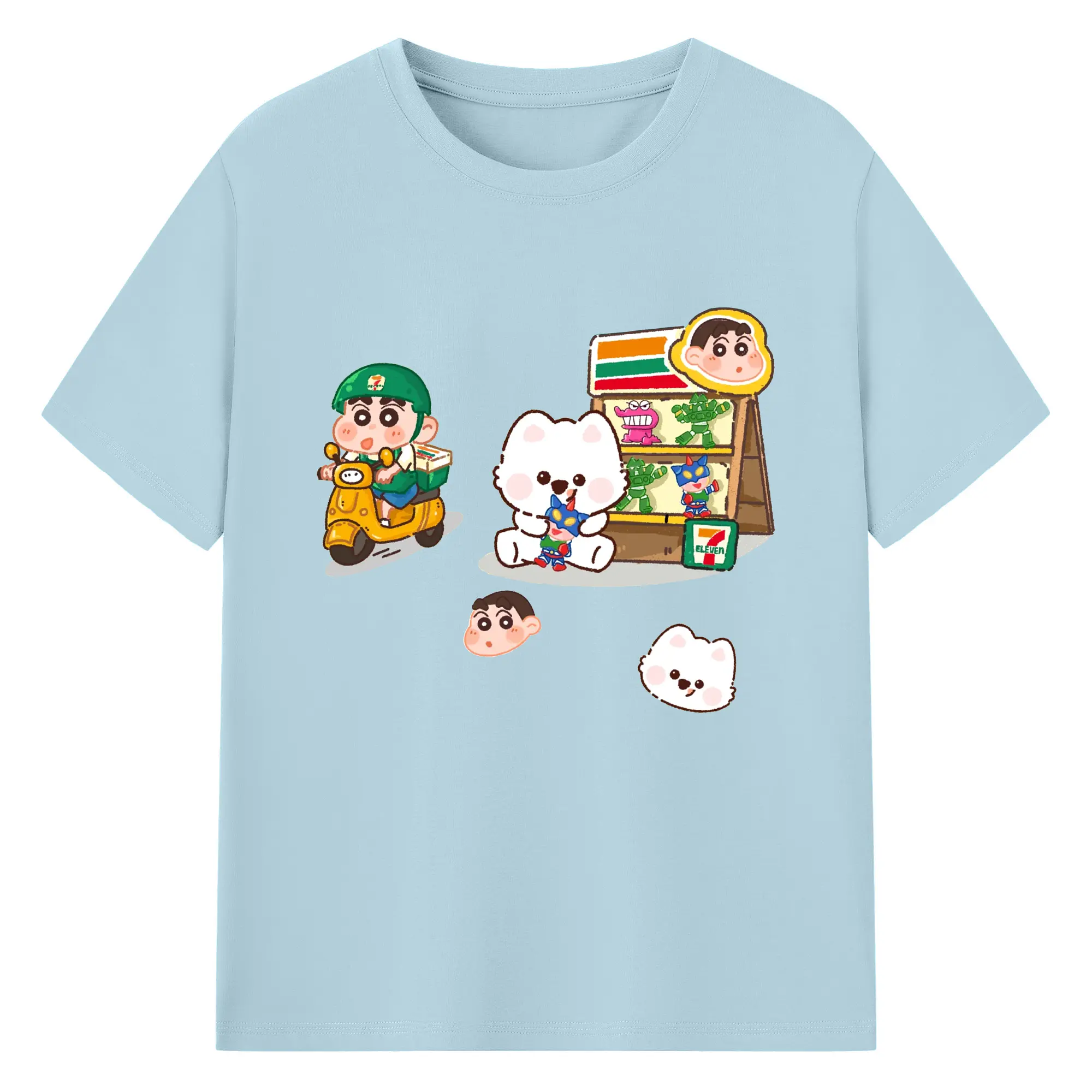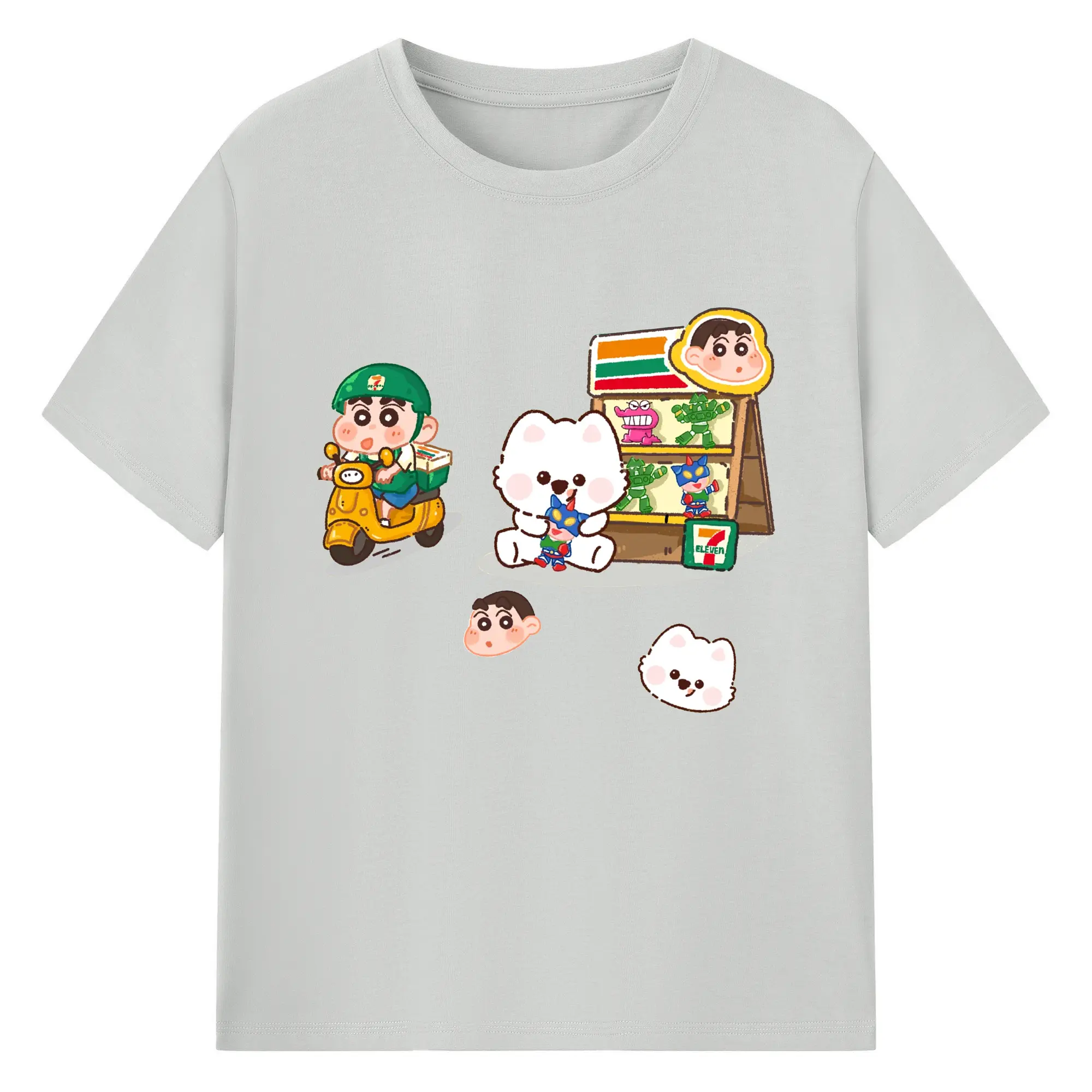 クレヨンしんちゃん × 7-Eleven 限定コラボ - 綿100% ヴィンテージ風 半袖Tシャツ ・ フロントプリント ・ 柔らか肌触り ・ 通気性 快適 ・ スポーツ カジュアル 外出用