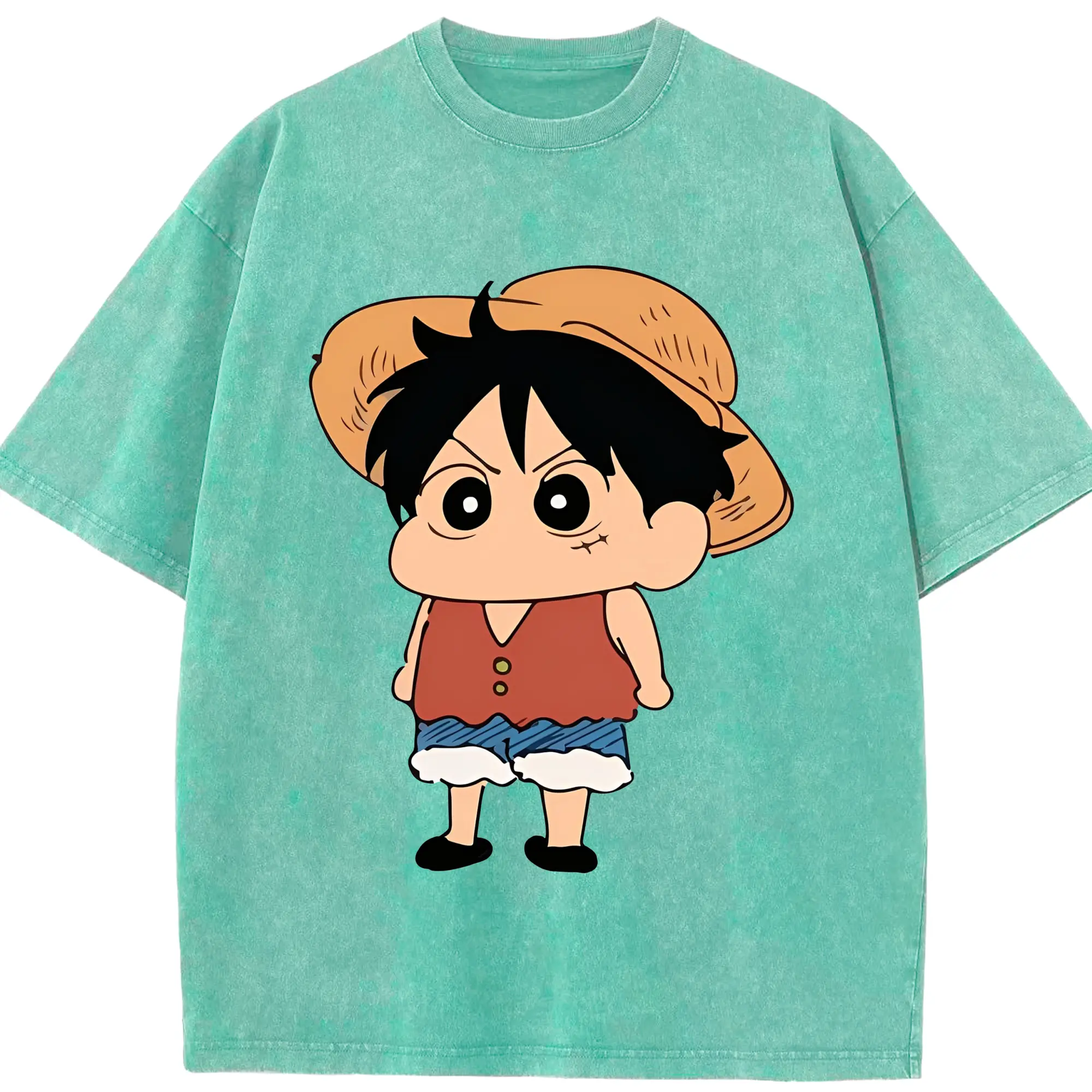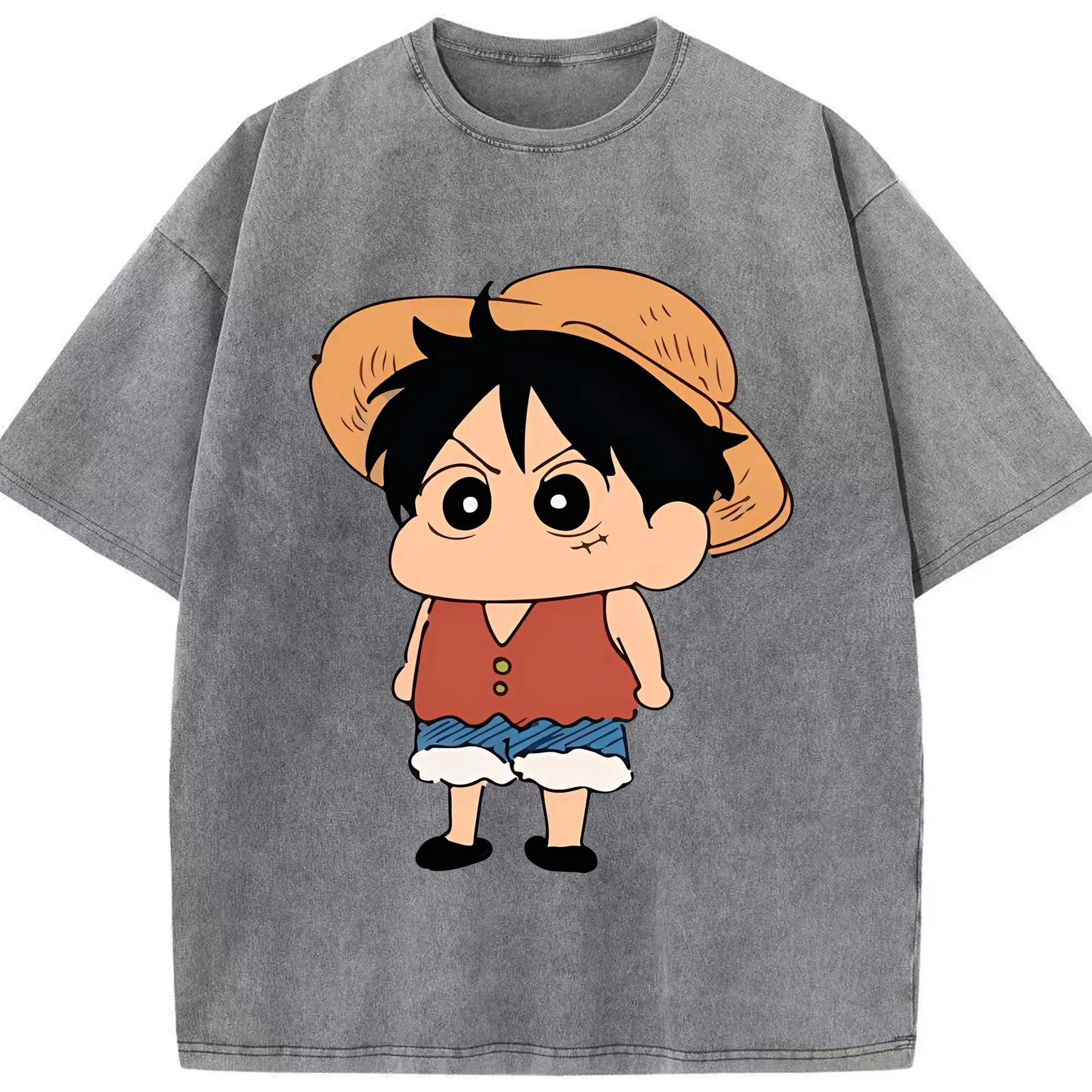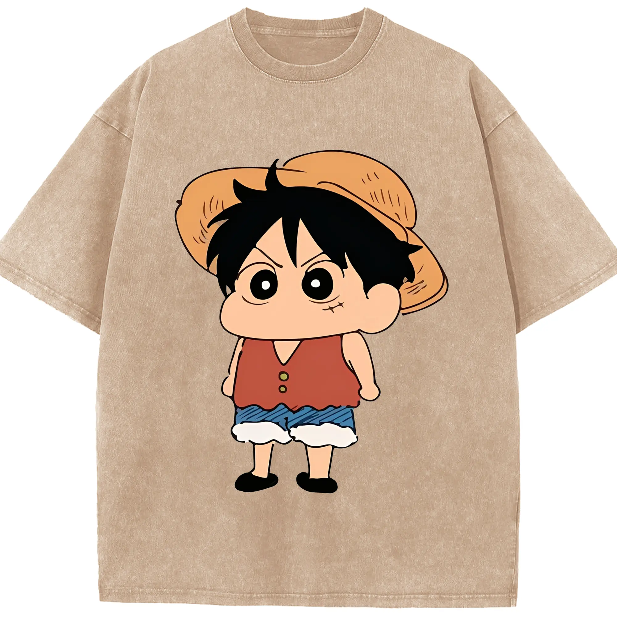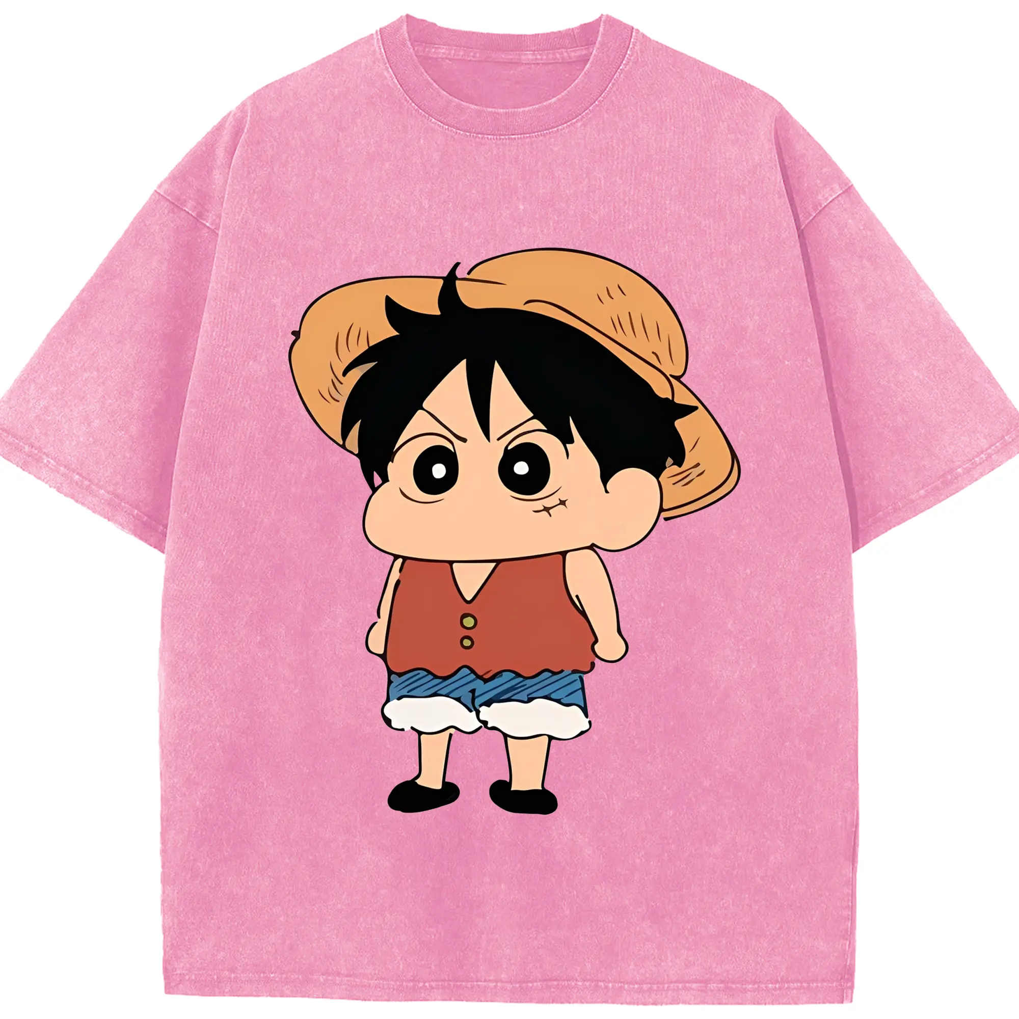 クレヨンしんちゃん × ルフィ 限定コラボ - 綿100% 半袖Tシャツ ・ フロントプリント ・ 快適 通気性 ・ 日常使い 散歩 スポーツ用