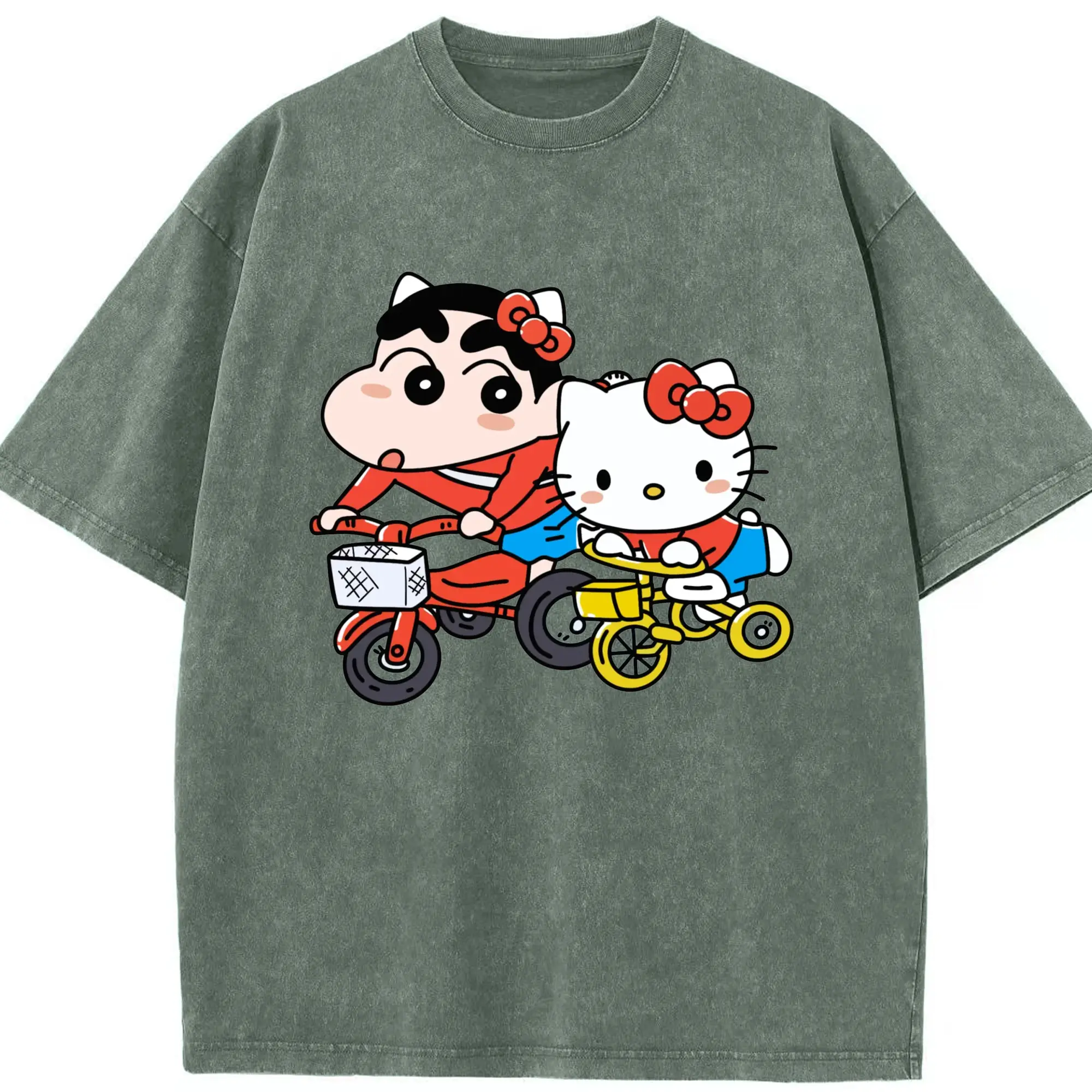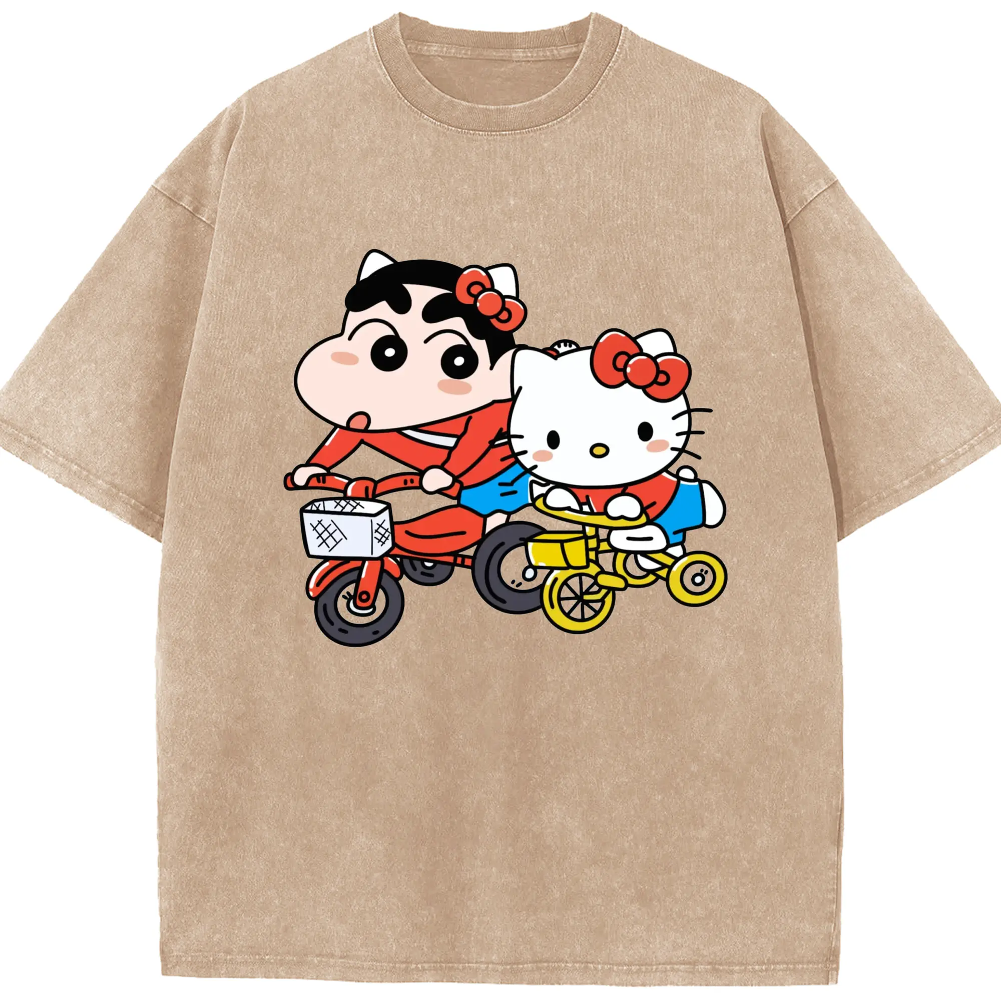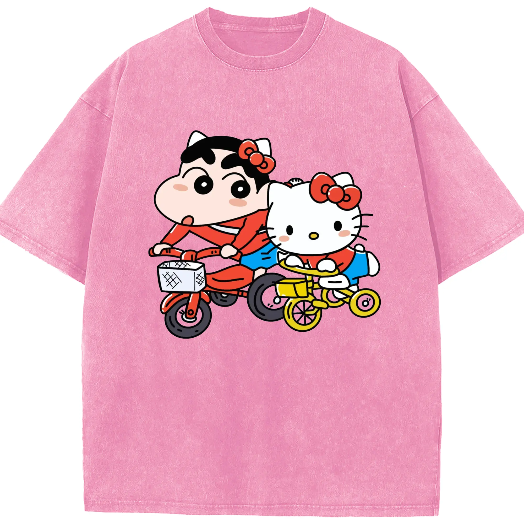 クレヨンしんちゃん × ハローキティ 限定コラボ - 綿100% 半袖Tシャツ ・ フロントプリント ・ 快適 通気性 ・ 日常使い 散歩 スポーツ用