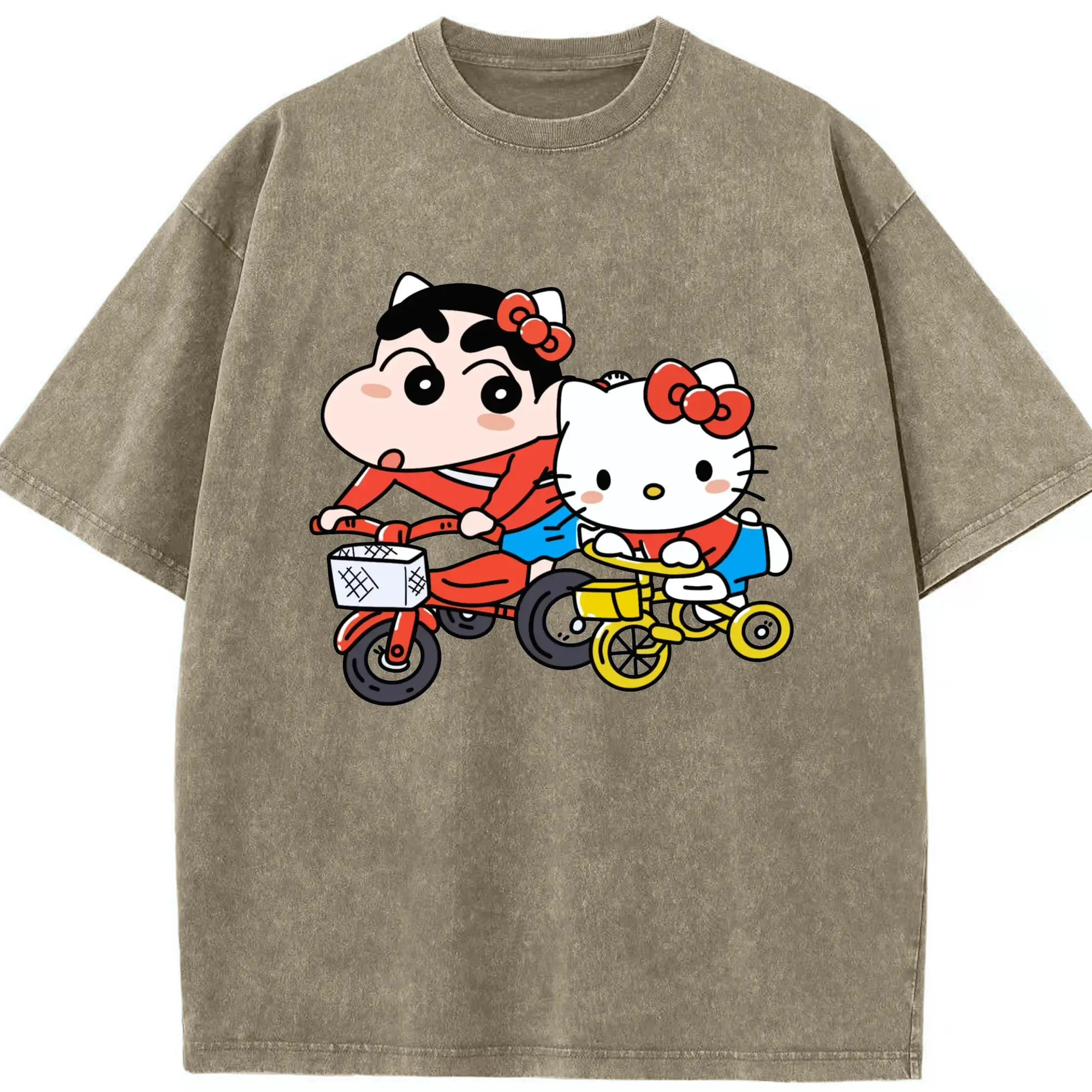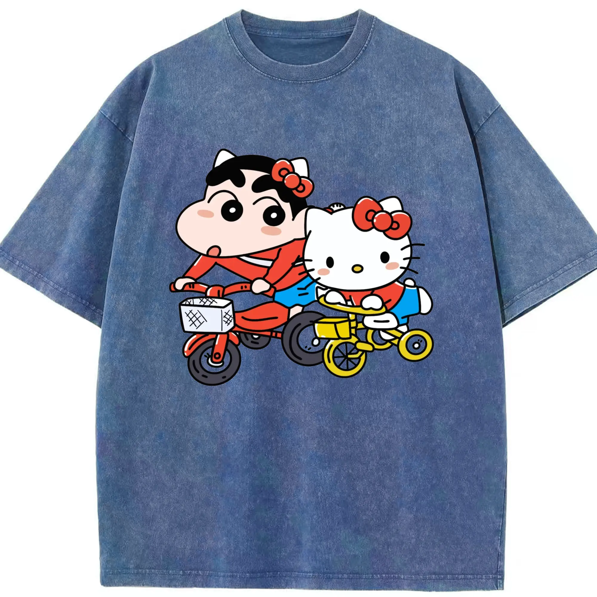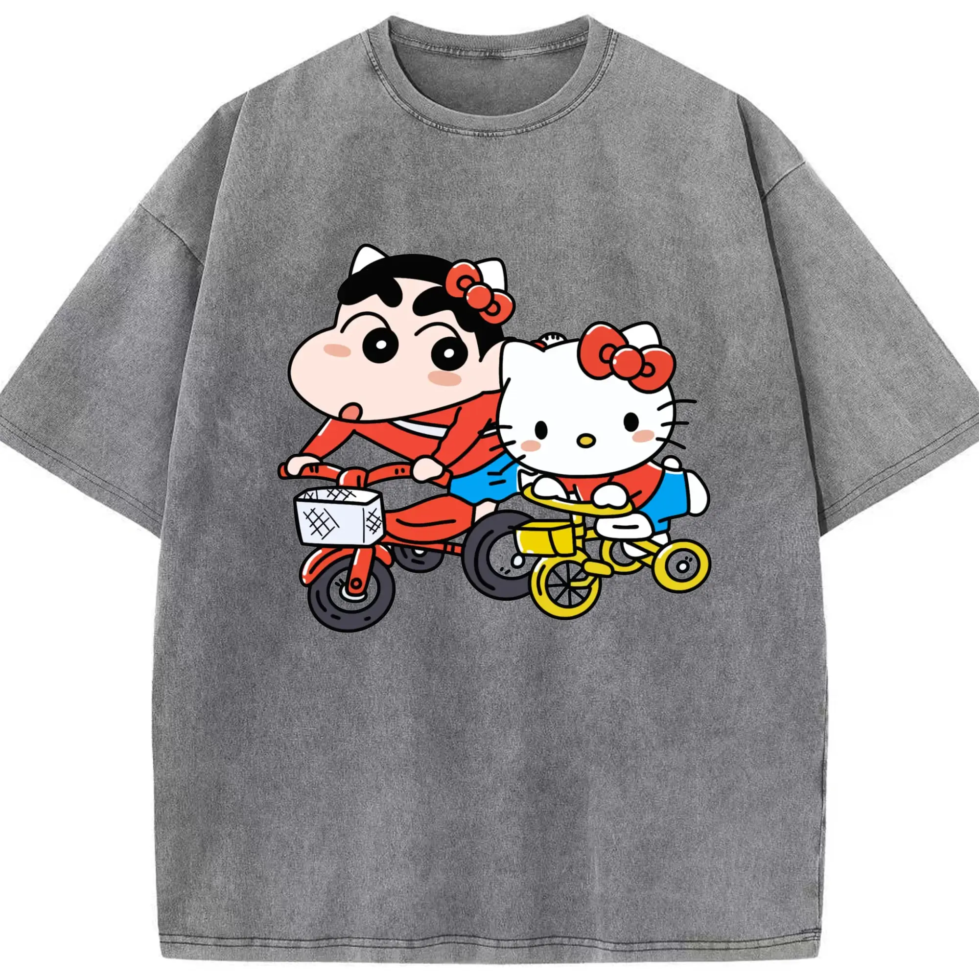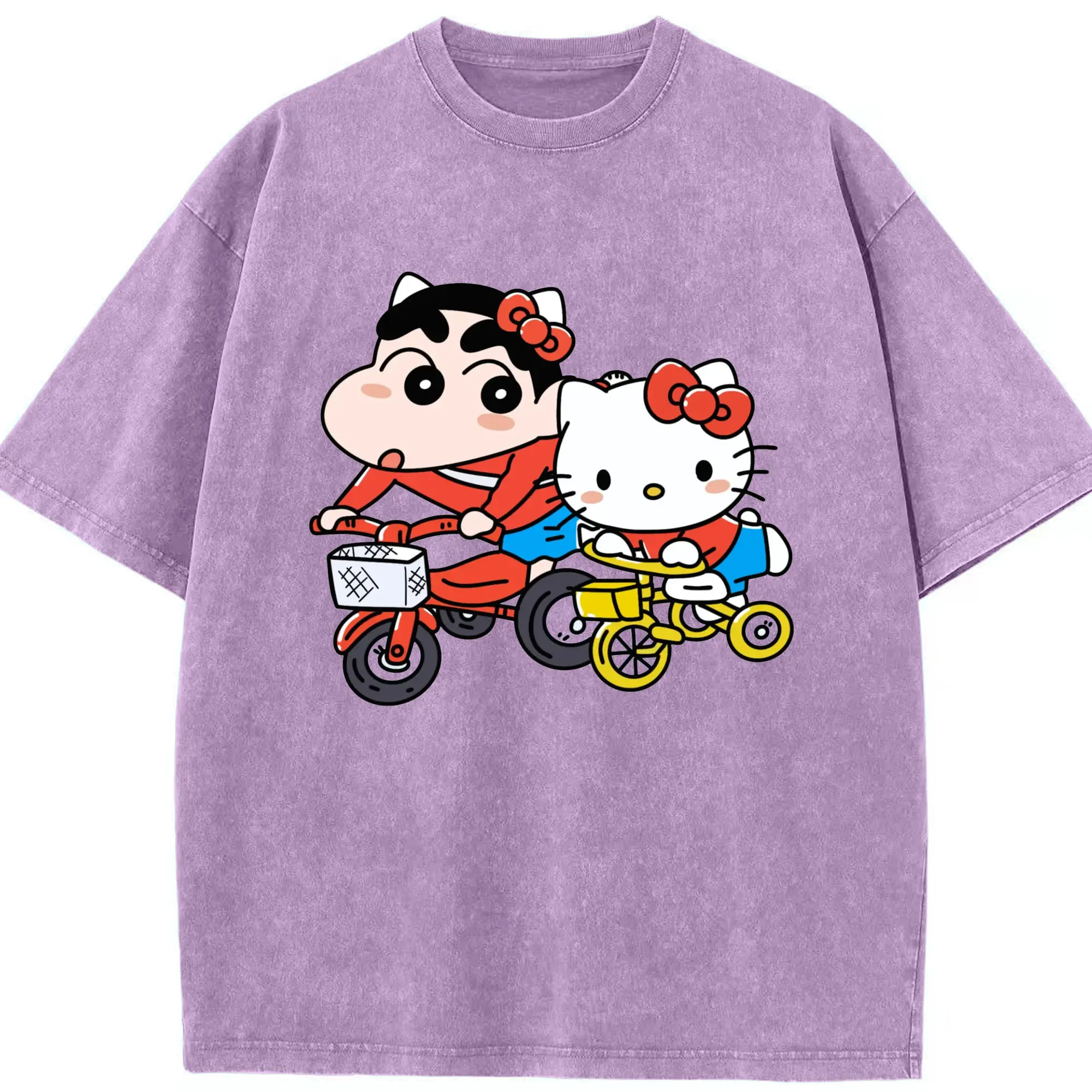 クレヨンしんちゃん × ハローキティ 限定コラボ - 綿100% 半袖Tシャツ ・ フロントプリント ・ 快適 通気性 ・ 日常使い 散歩 スポーツ用