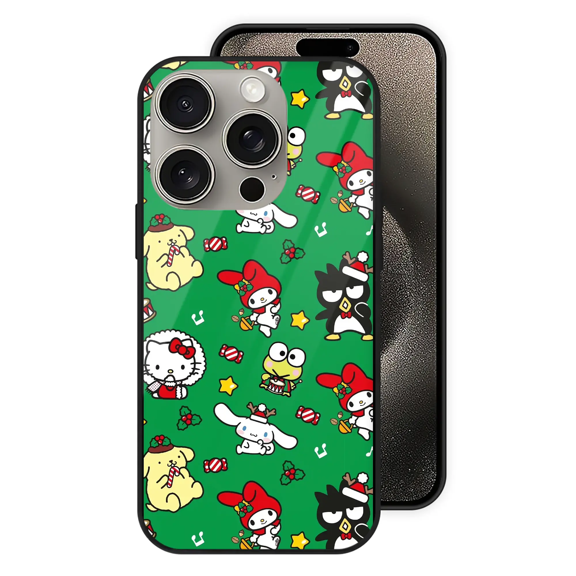サンリオキャラ集合クリスマス|ギフトに最適 - IPhone15Pro対応 ・ スマホケース ・ 背面ガラス ・ TPU+強化ガラス ・ 耐衝撃 ・ 黄変防止 ・ ワイヤレス充電対応 ・ 3D立体ボタン