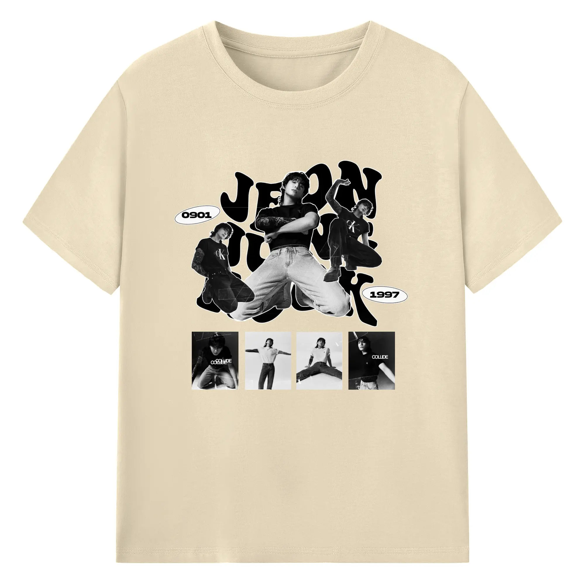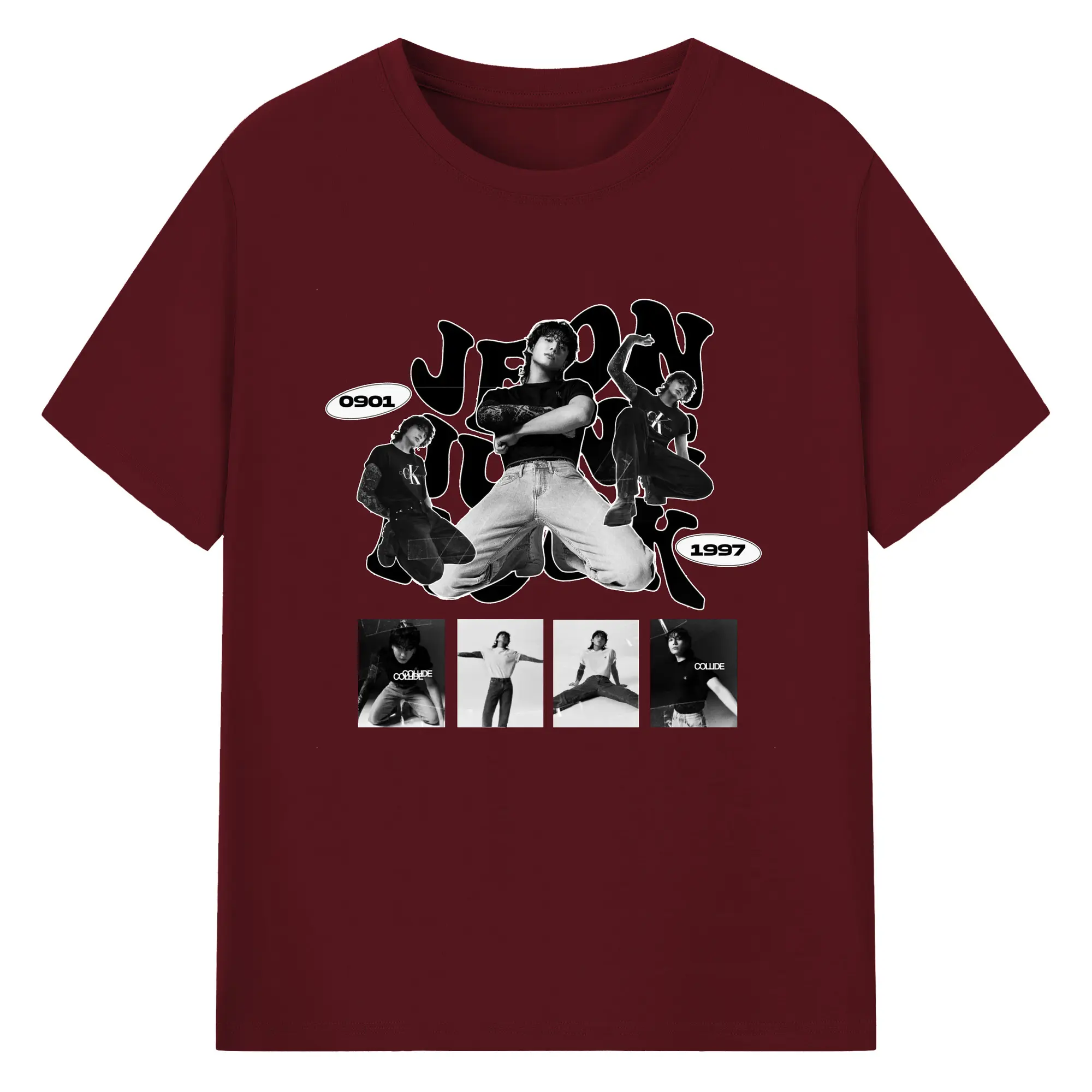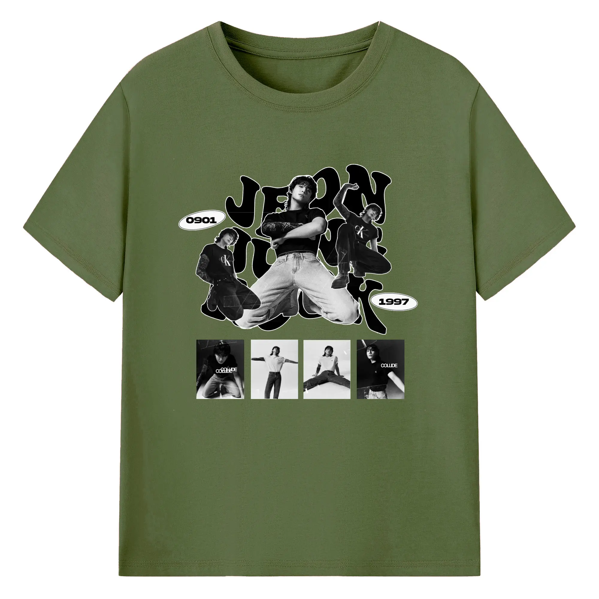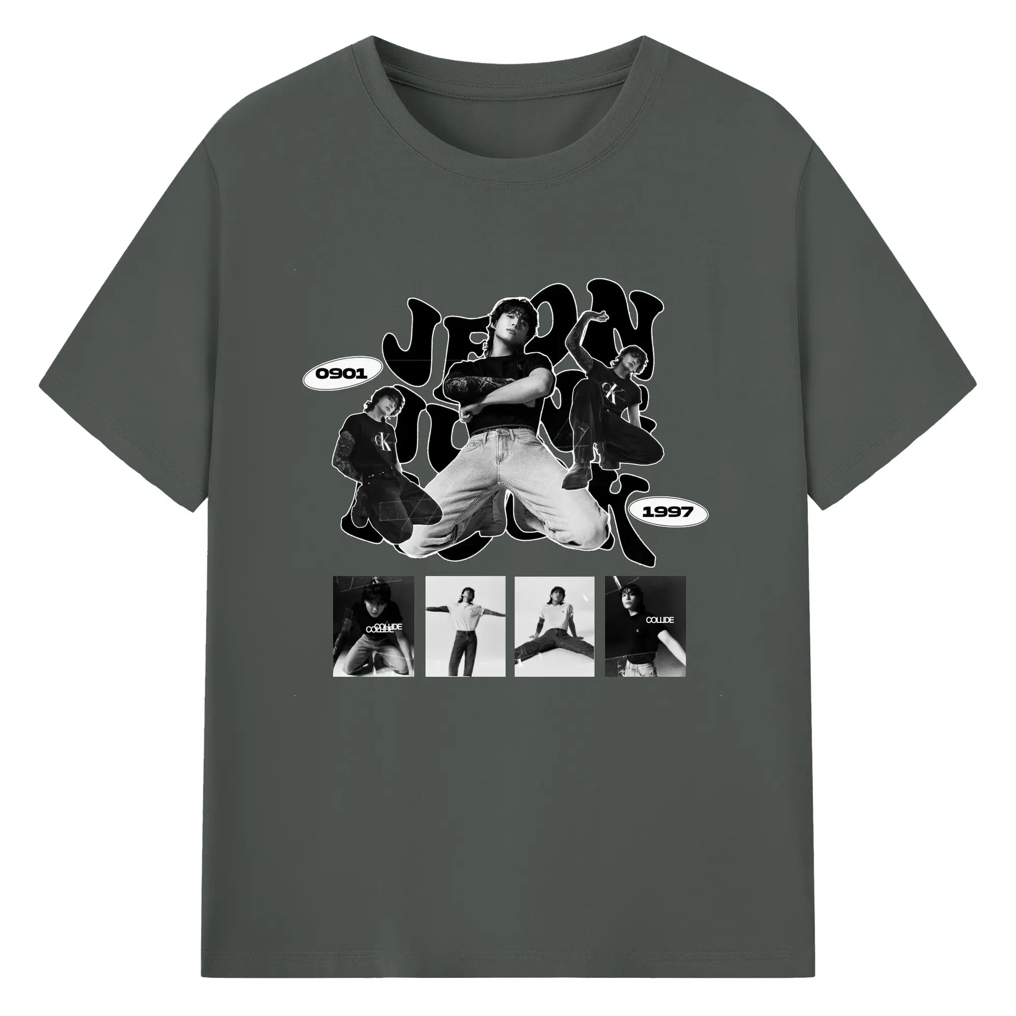 ジョングク アクションフォト 限定 韓流グッズ - 綿100% ヴィンテージ風 半袖Tシャツ ・ フロントプリント ・ 柔らか肌触り ・ 通気性 快適 ・ スポーツ カジュアル 外出用