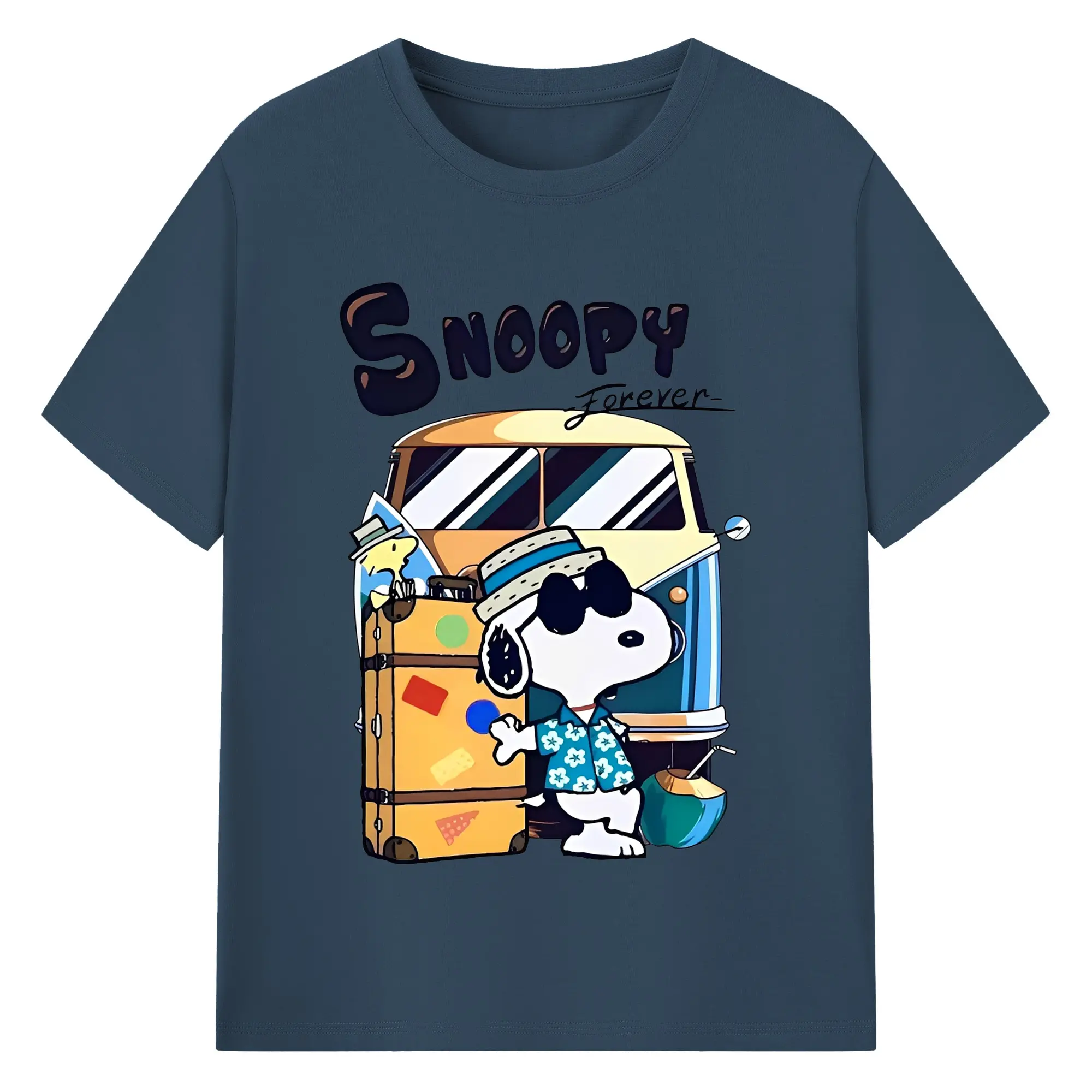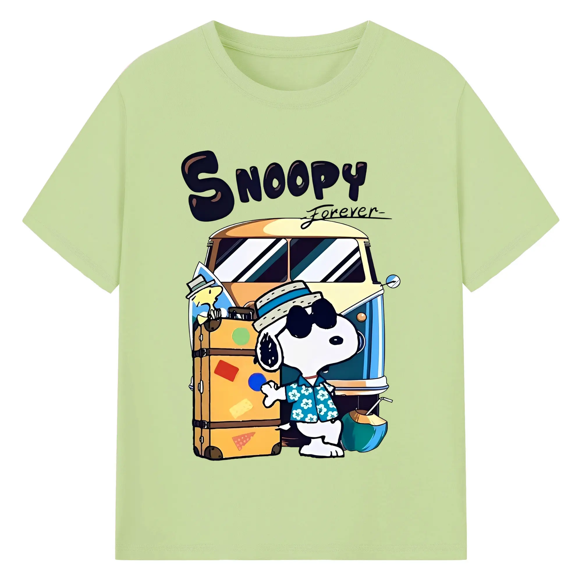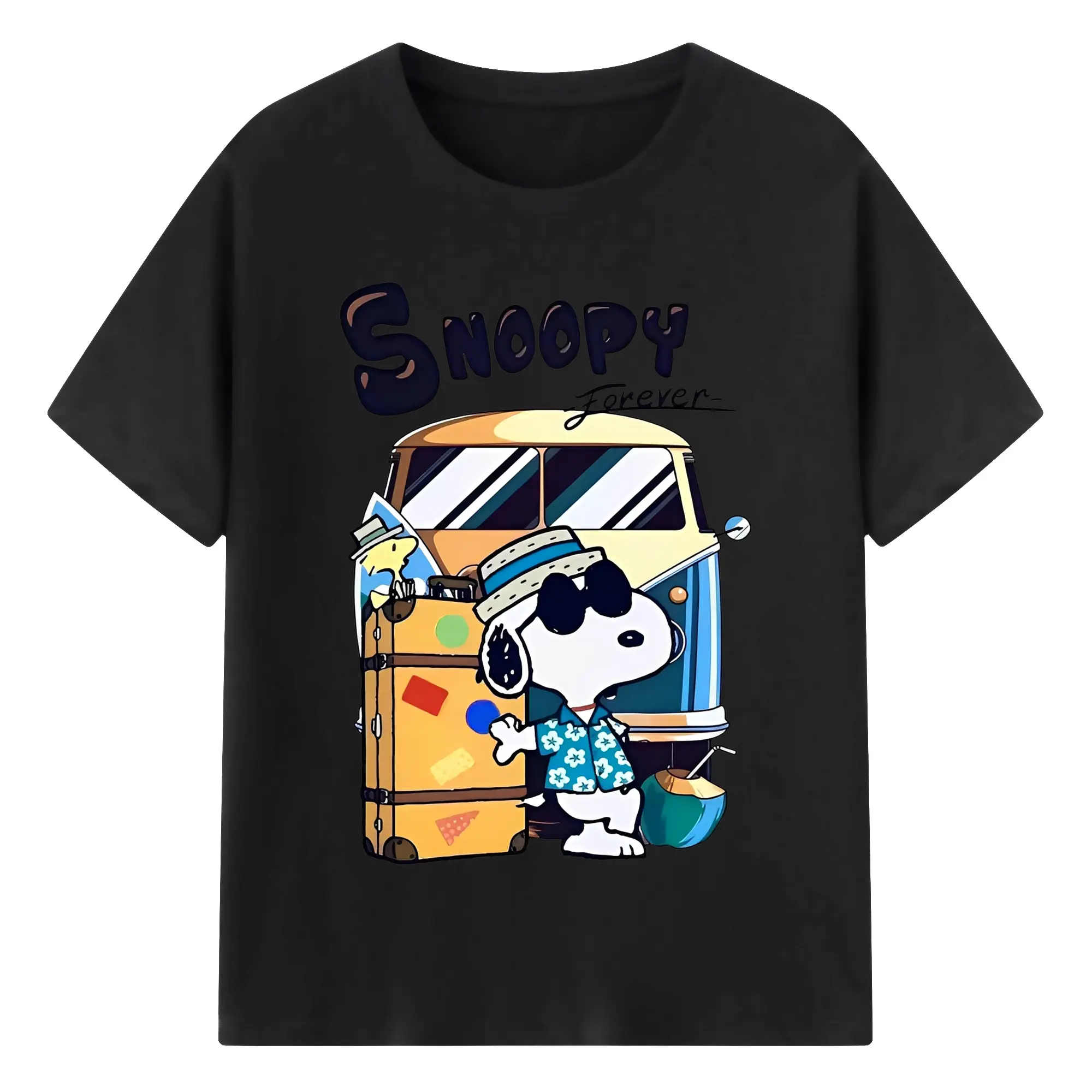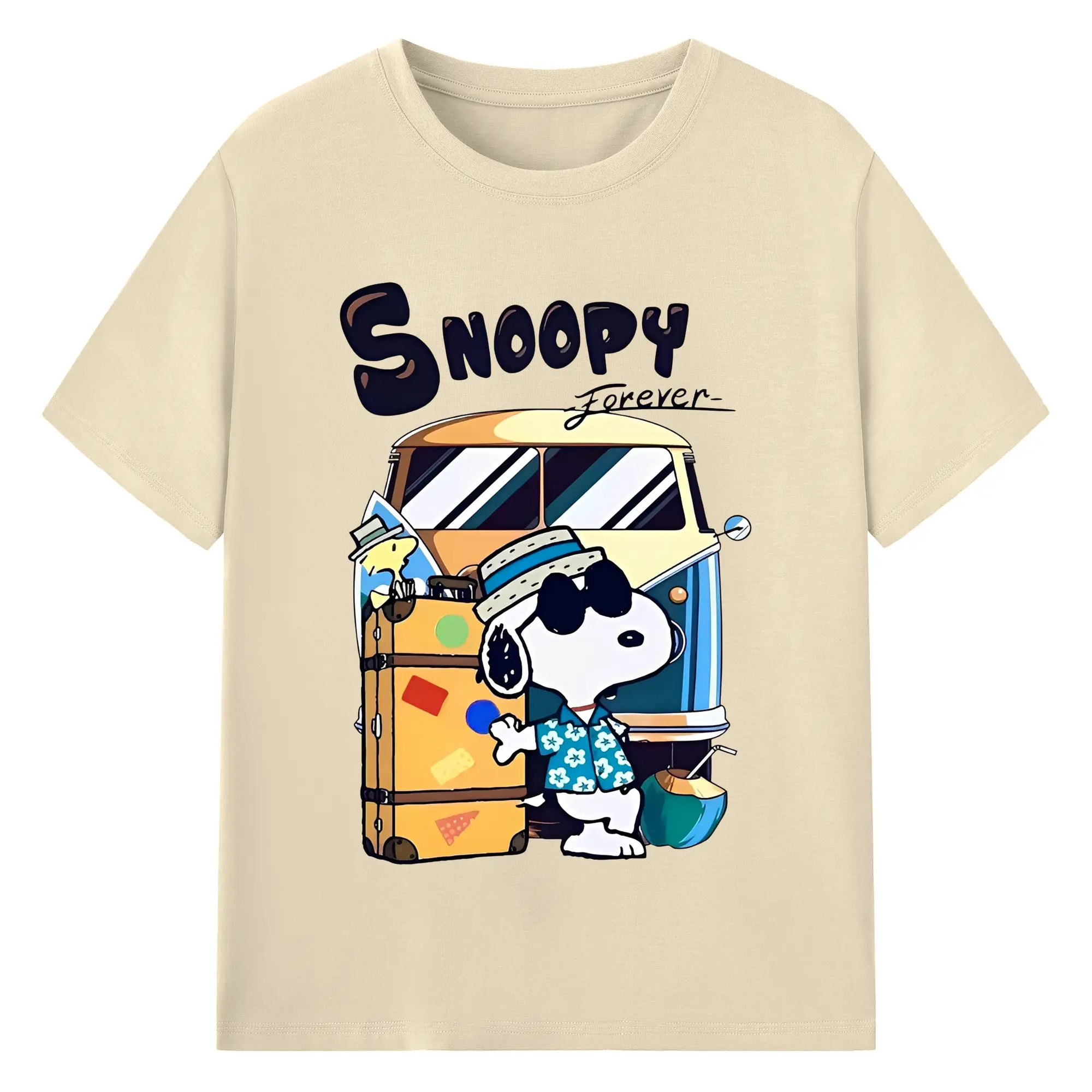 スヌーピー 夏の旅行のんびり - 綿100% ヴィンテージ風 半袖Tシャツ ・ フロントプリント ・ 柔らか肌触り ・ 通気性 快適 ・ スポーツ カジュアル 外出用