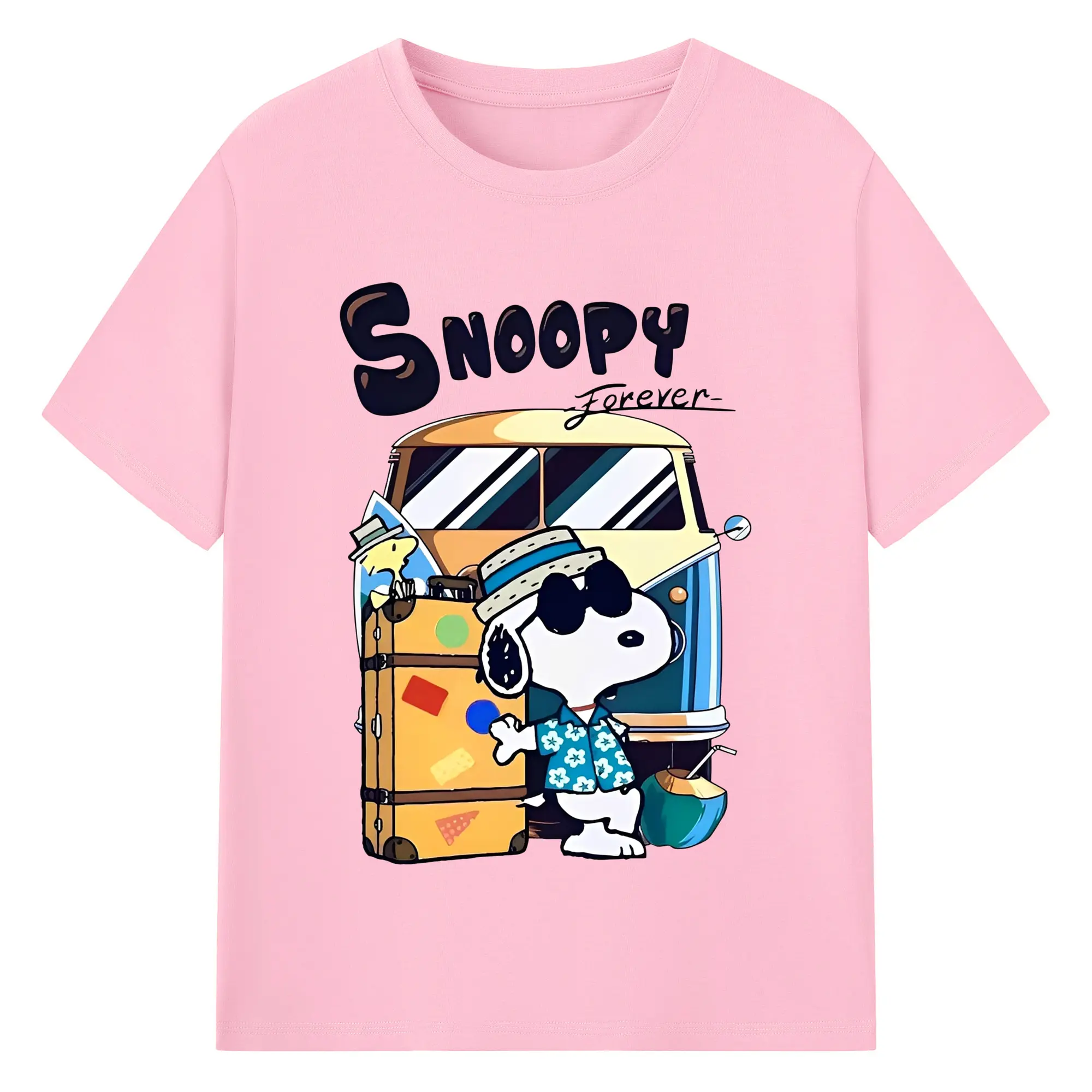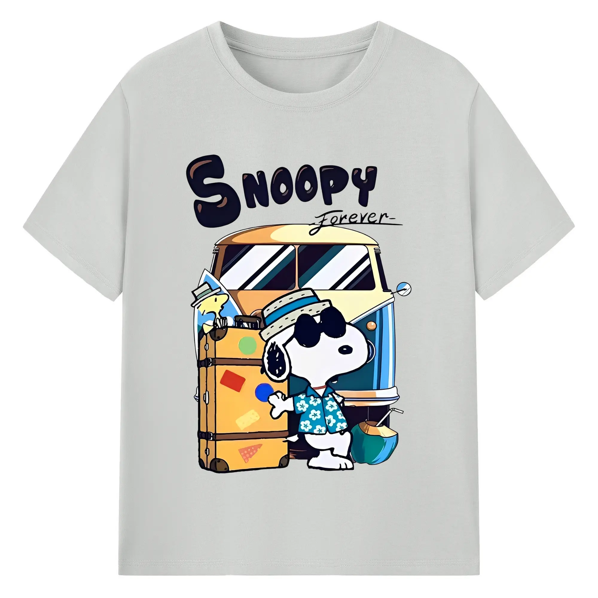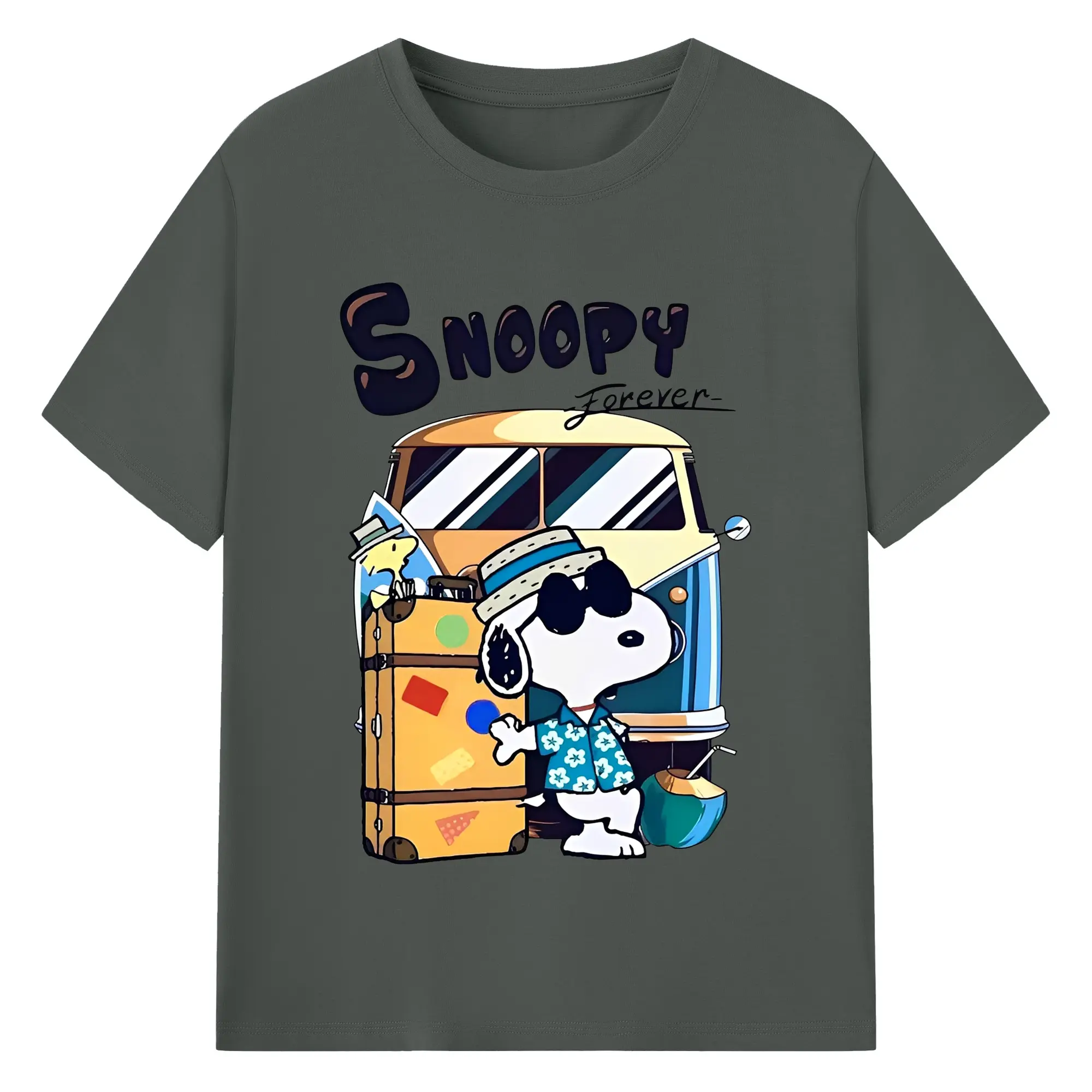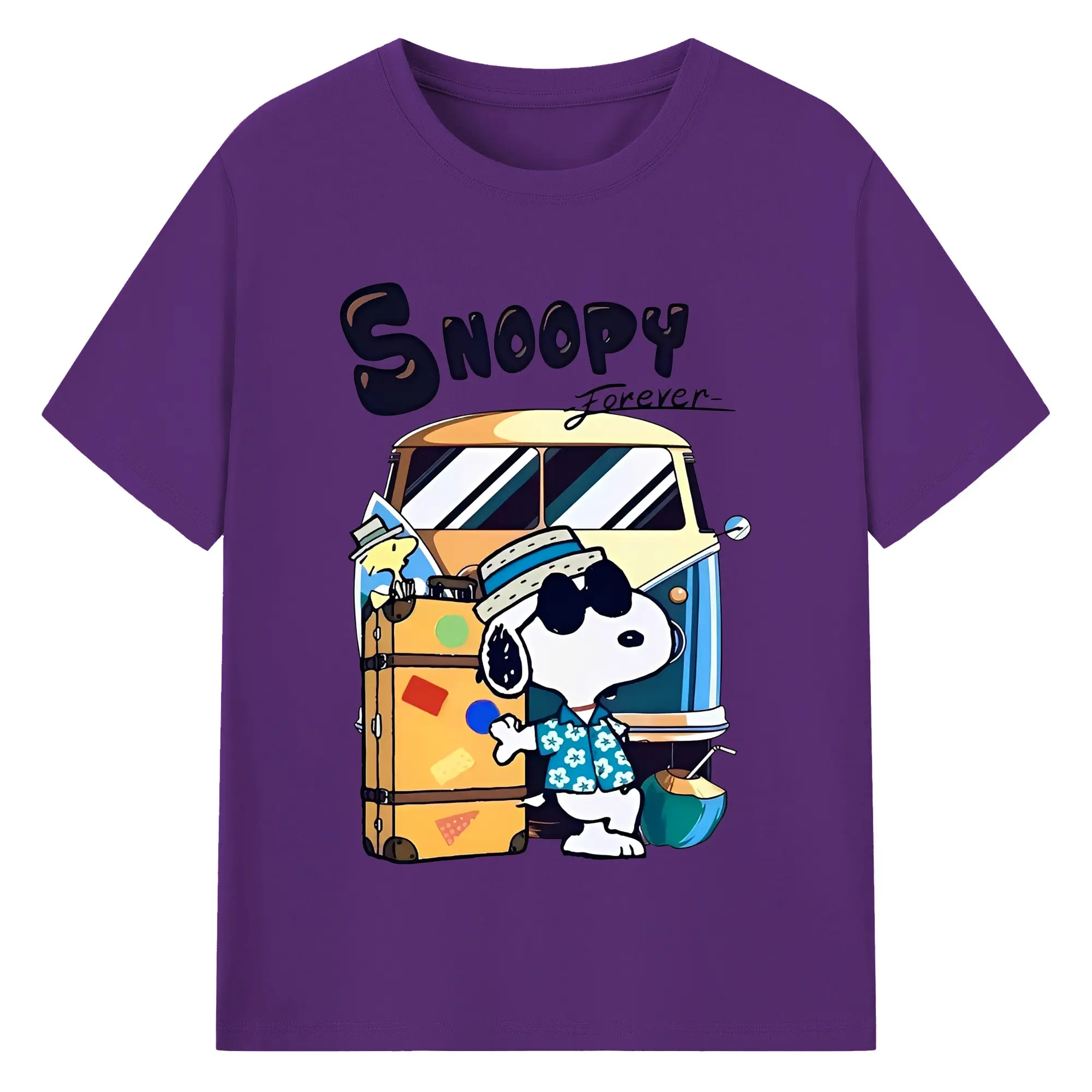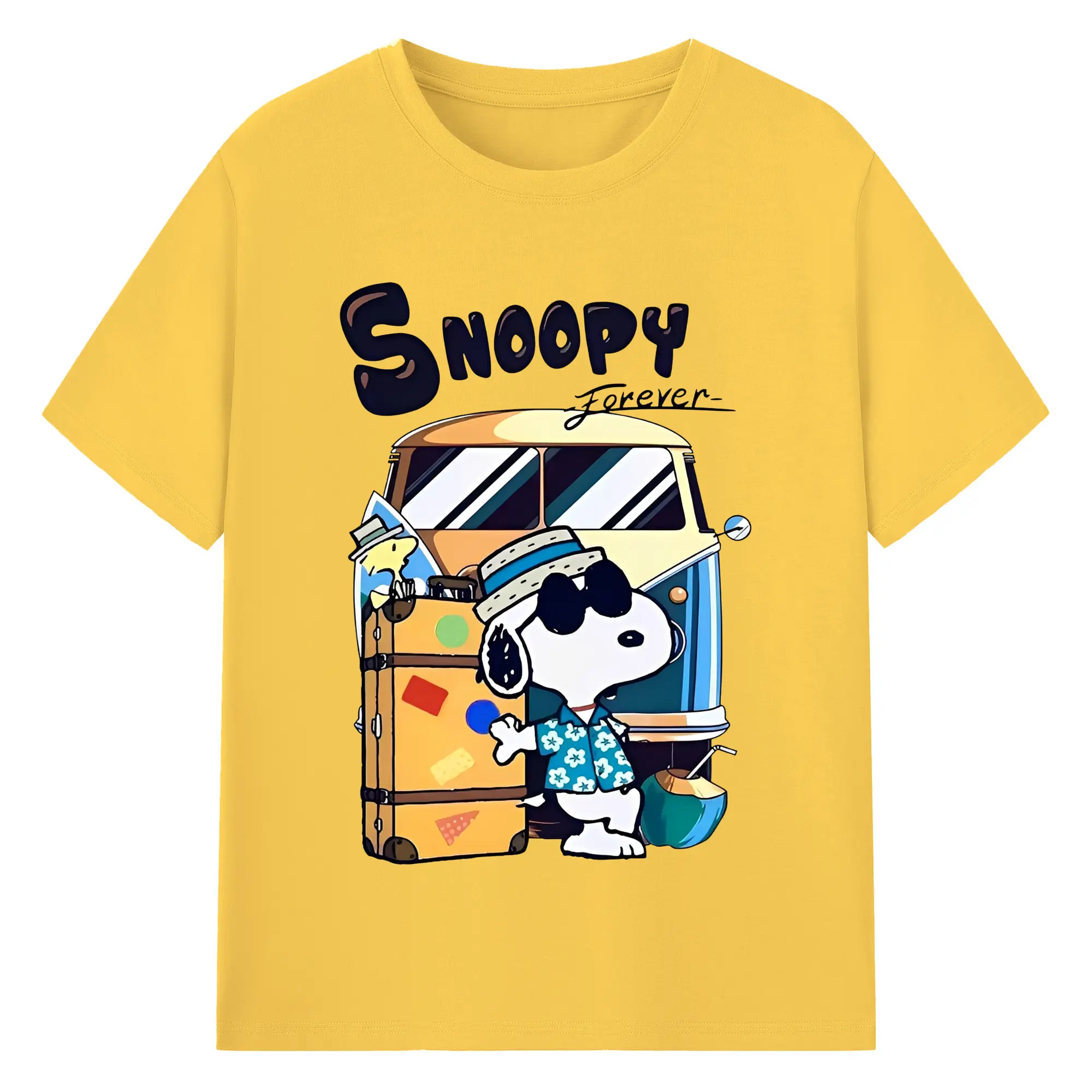 スヌーピー 夏の旅行のんびり - 綿100% ヴィンテージ風 半袖Tシャツ ・ フロントプリント ・ 柔らか肌触り ・ 通気性 快適 ・ スポーツ カジュアル 外出用