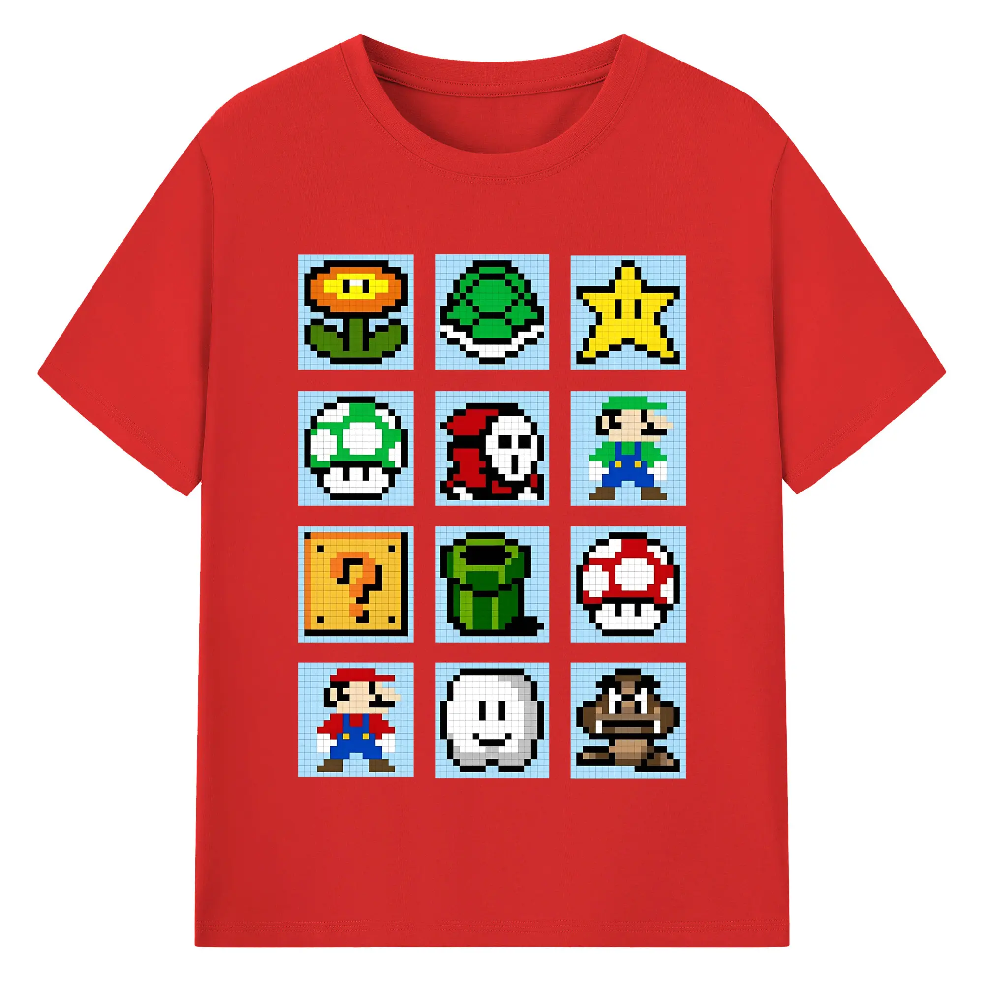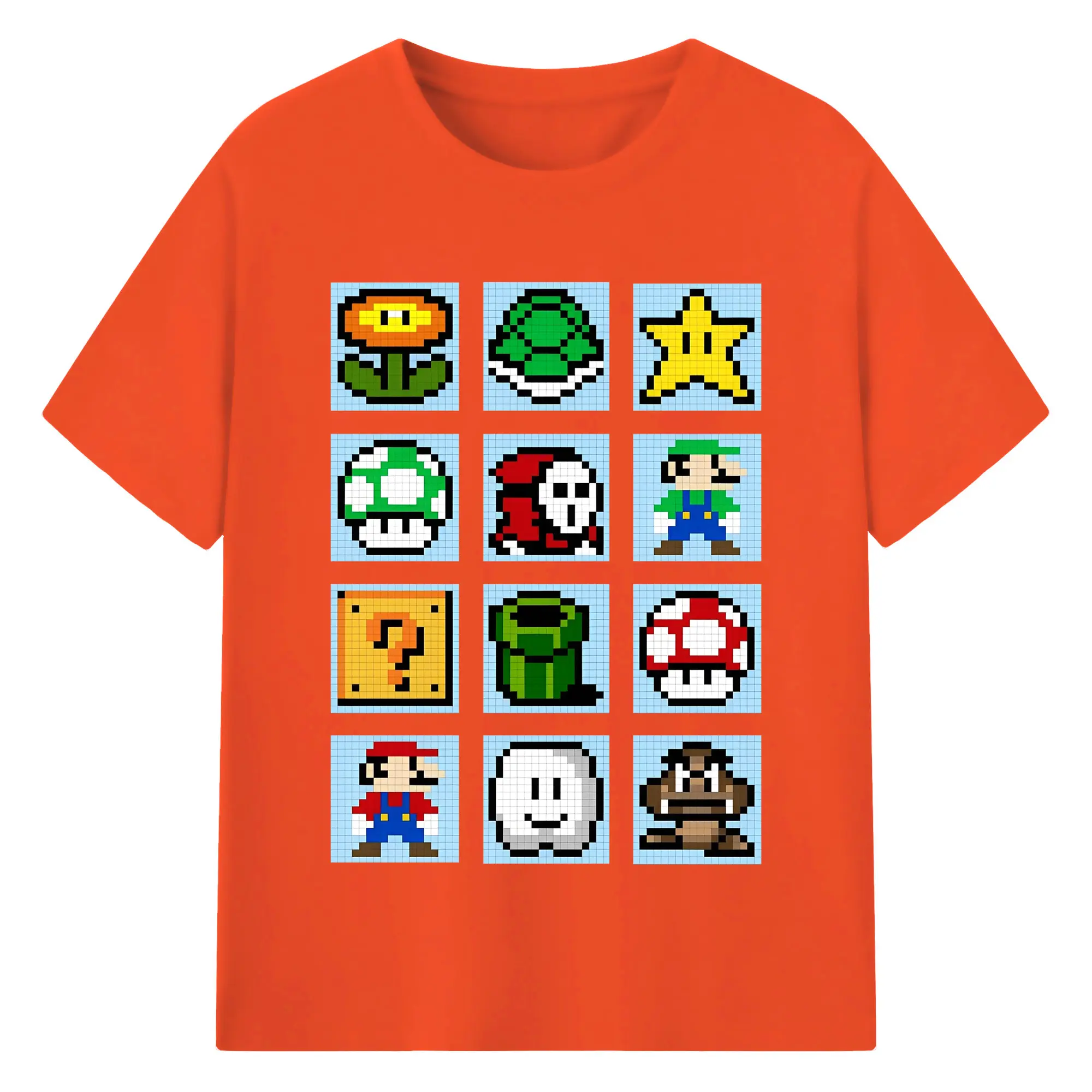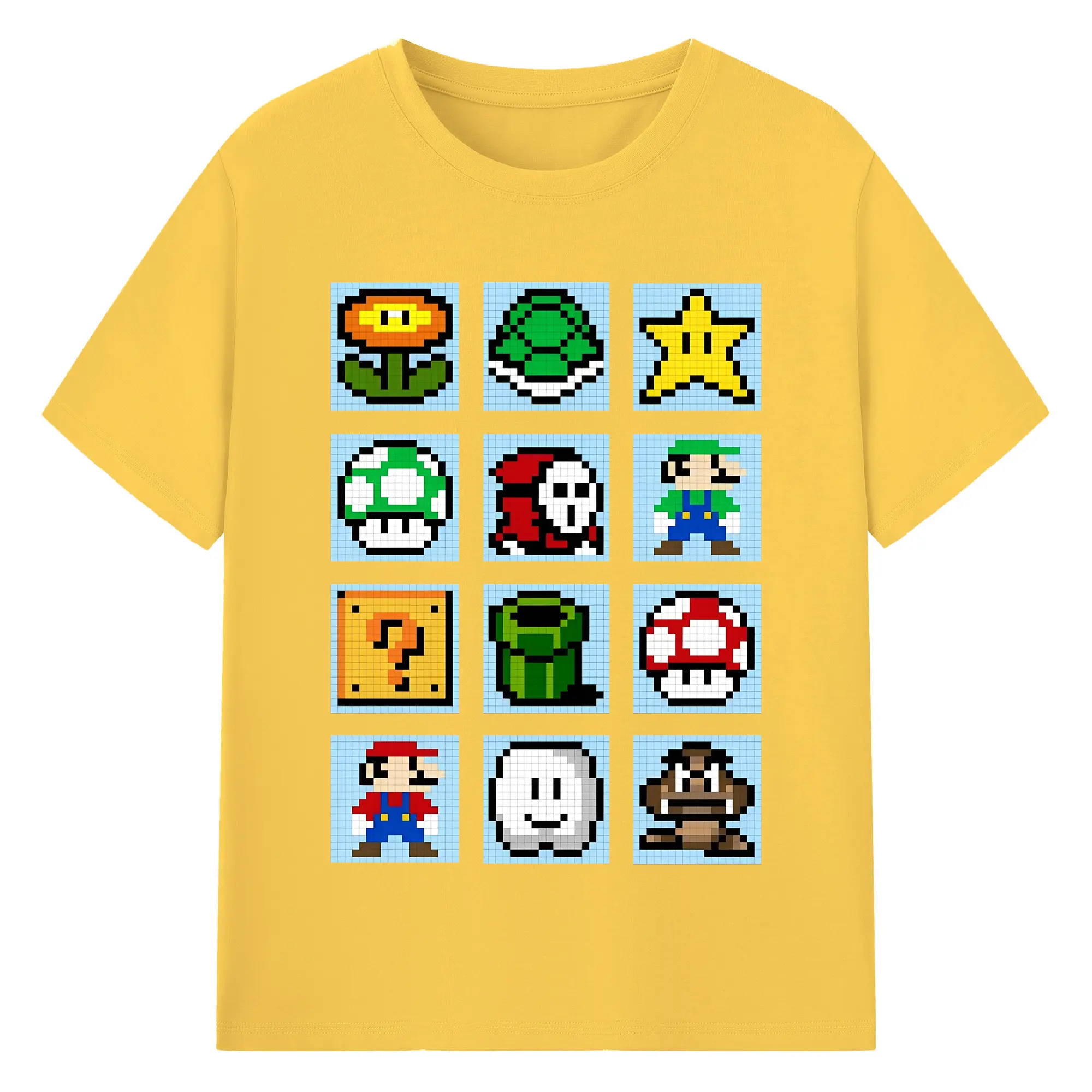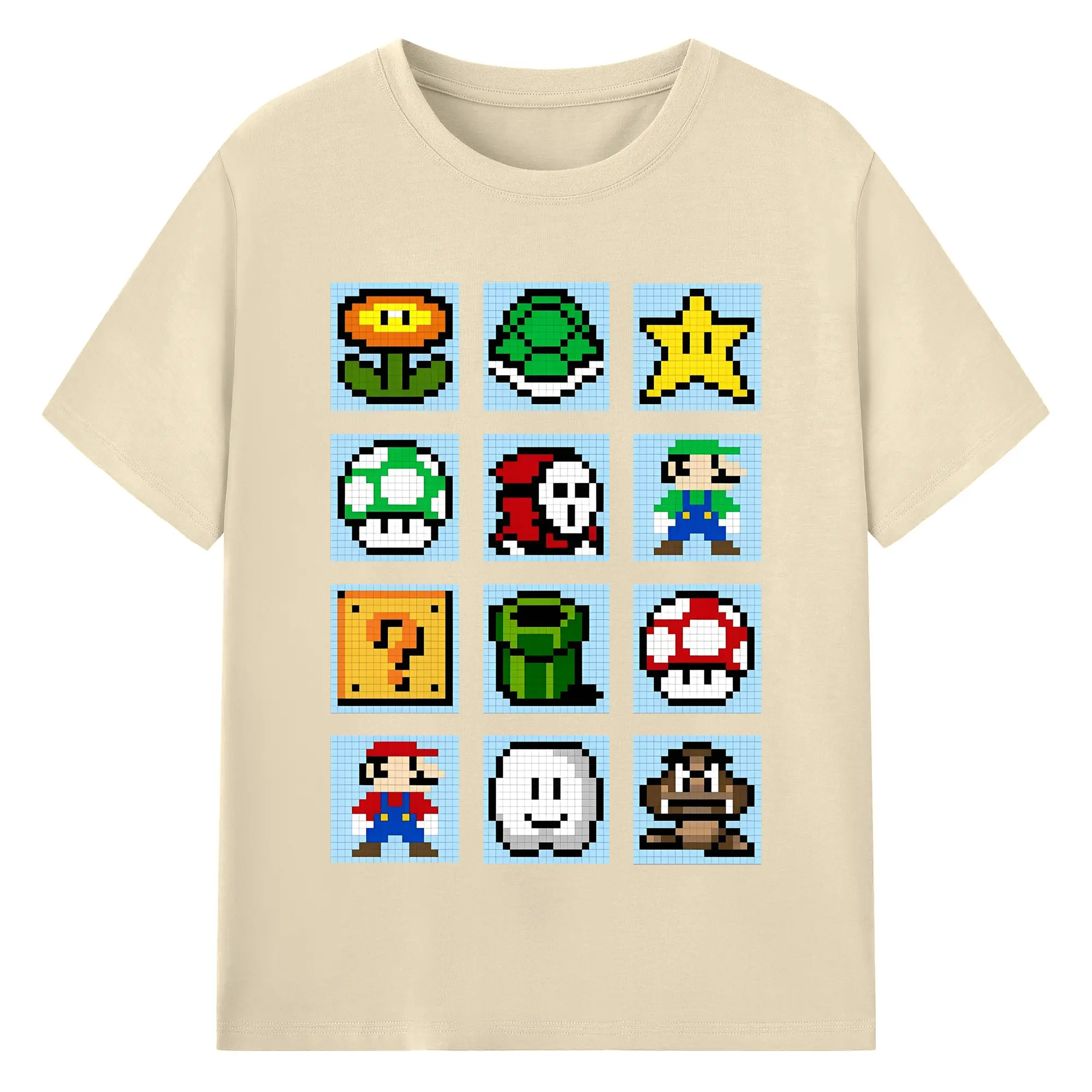 スーパーマリオ キャラクター総柄 - 綿100% ヴィンテージ風 半袖Tシャツ ・ フロントプリント ・ 柔らか肌触り ・ 通気性 快適 ・ スポーツ カジュアル 外出用