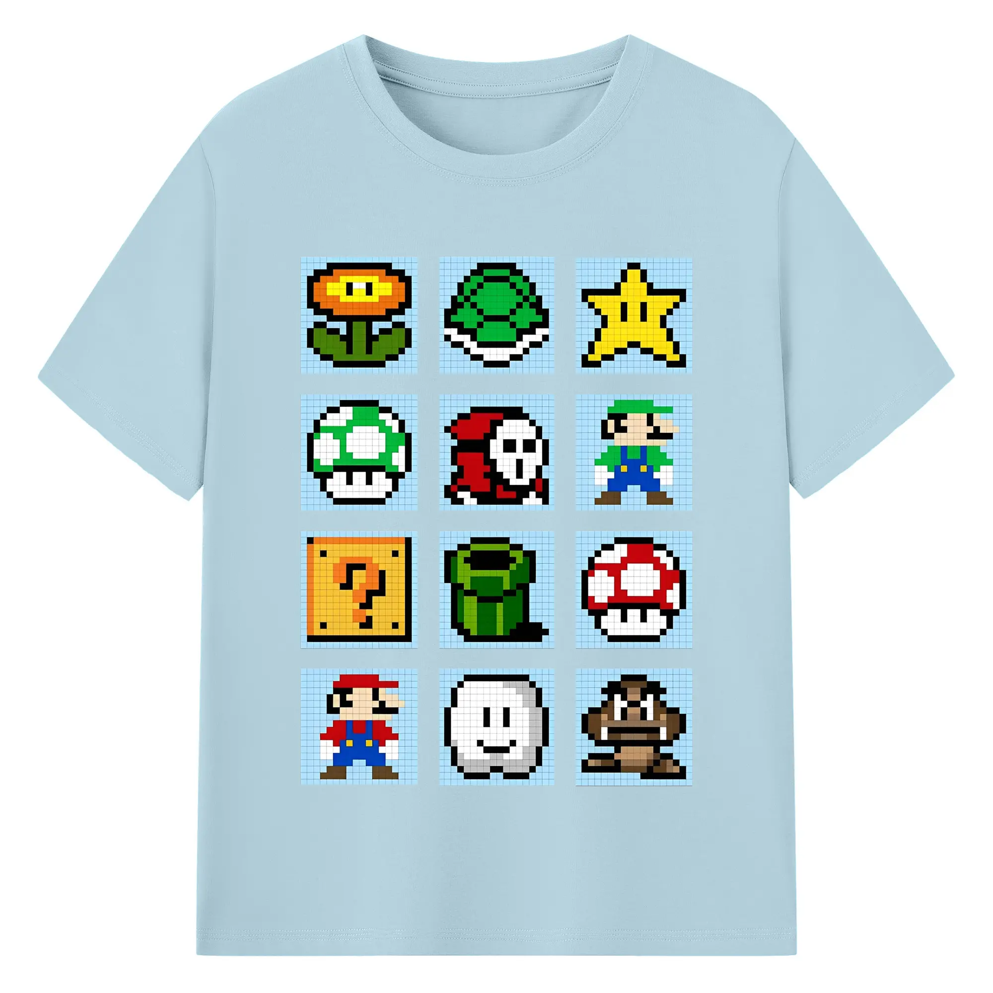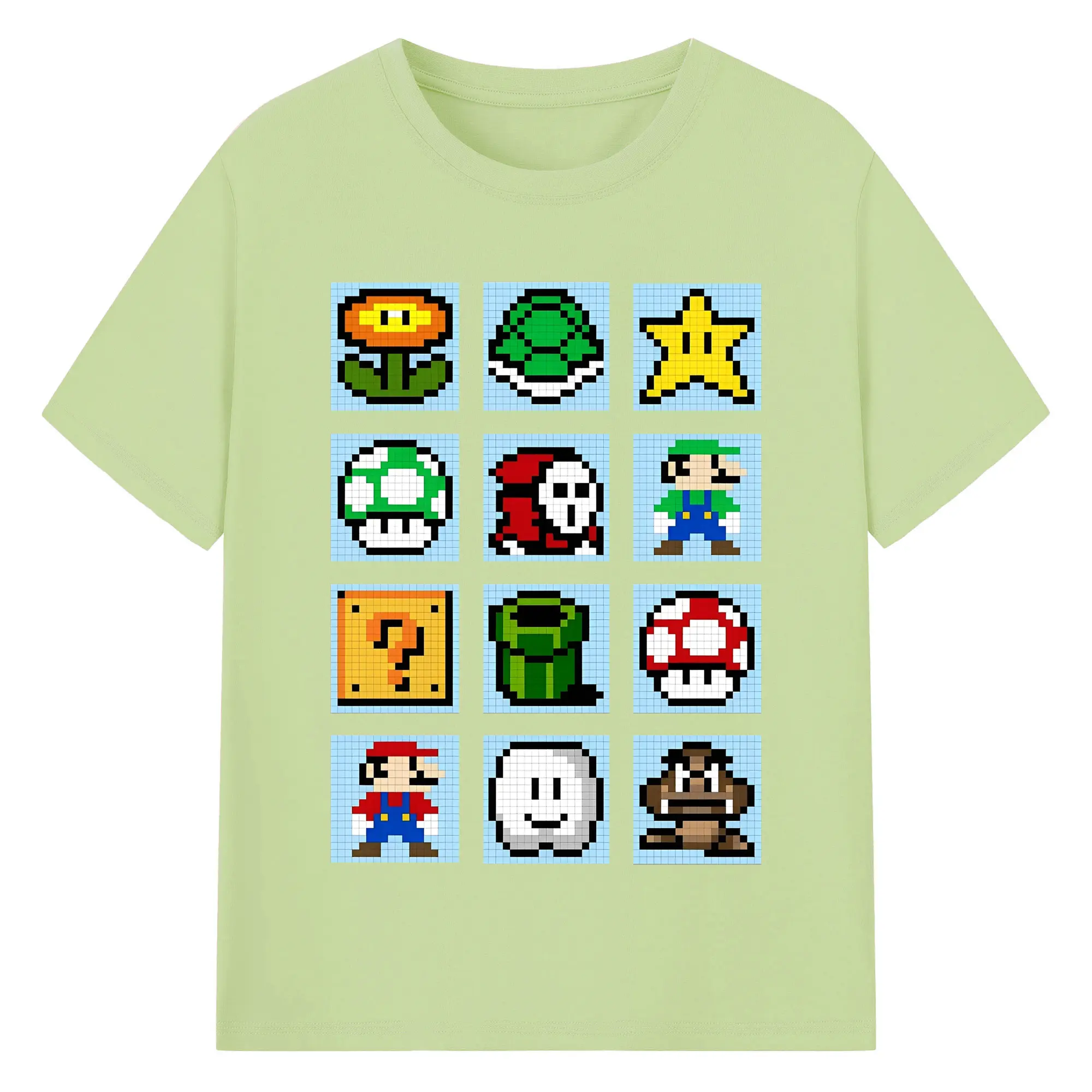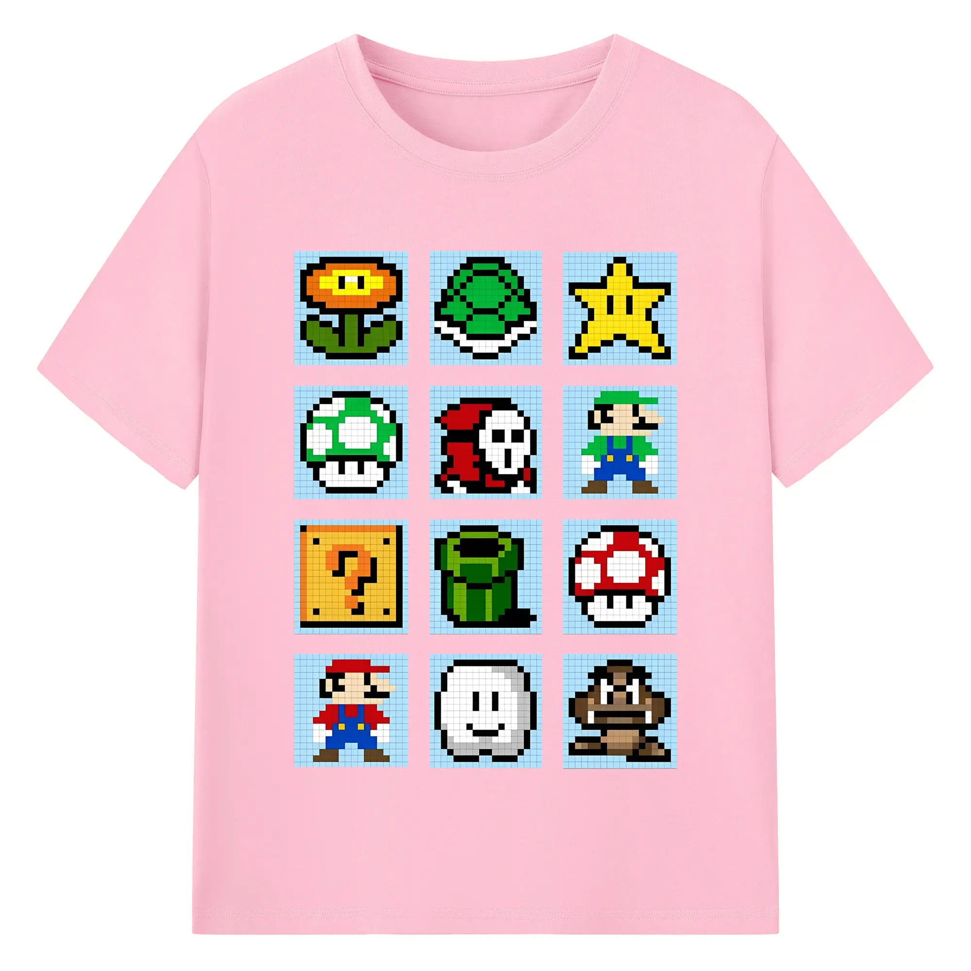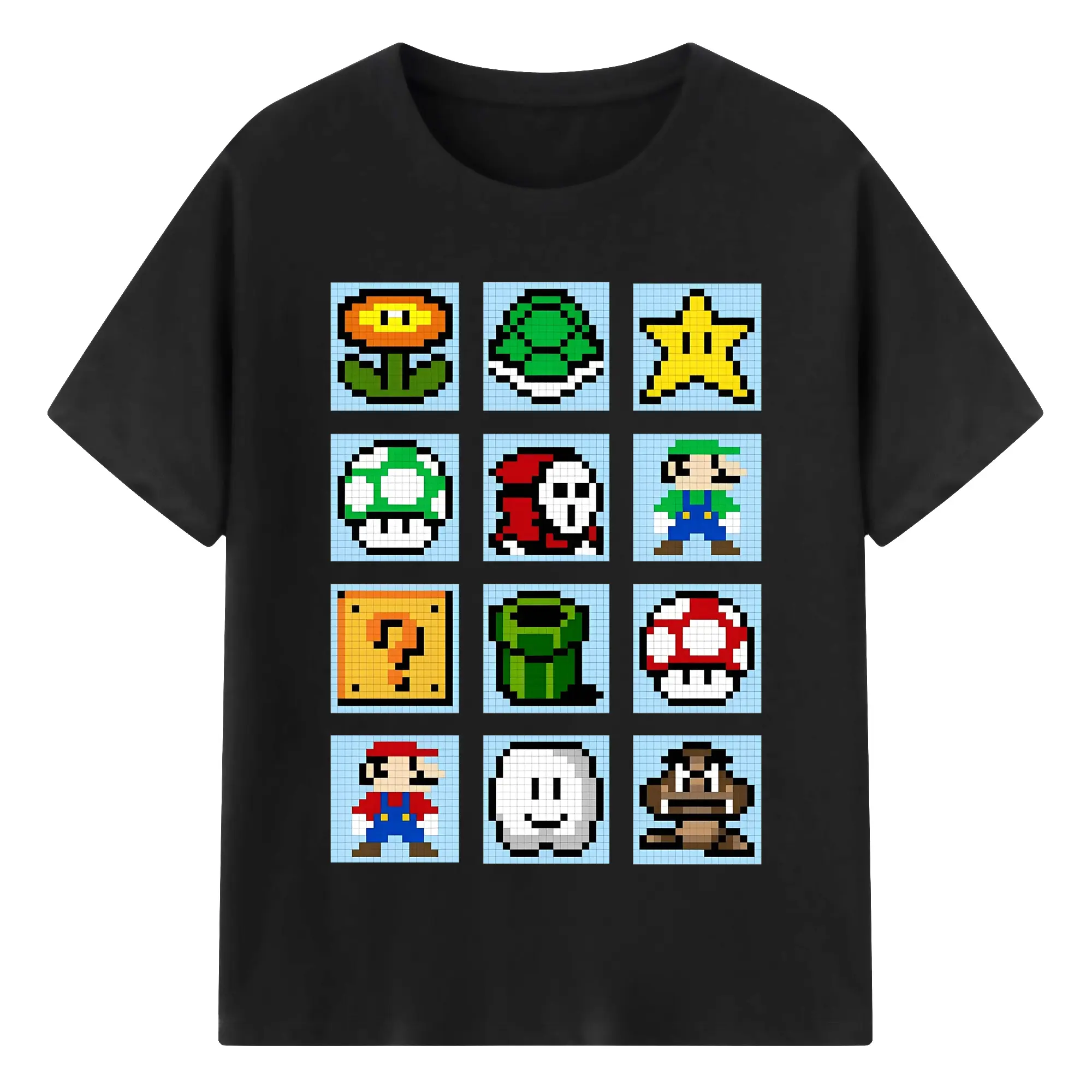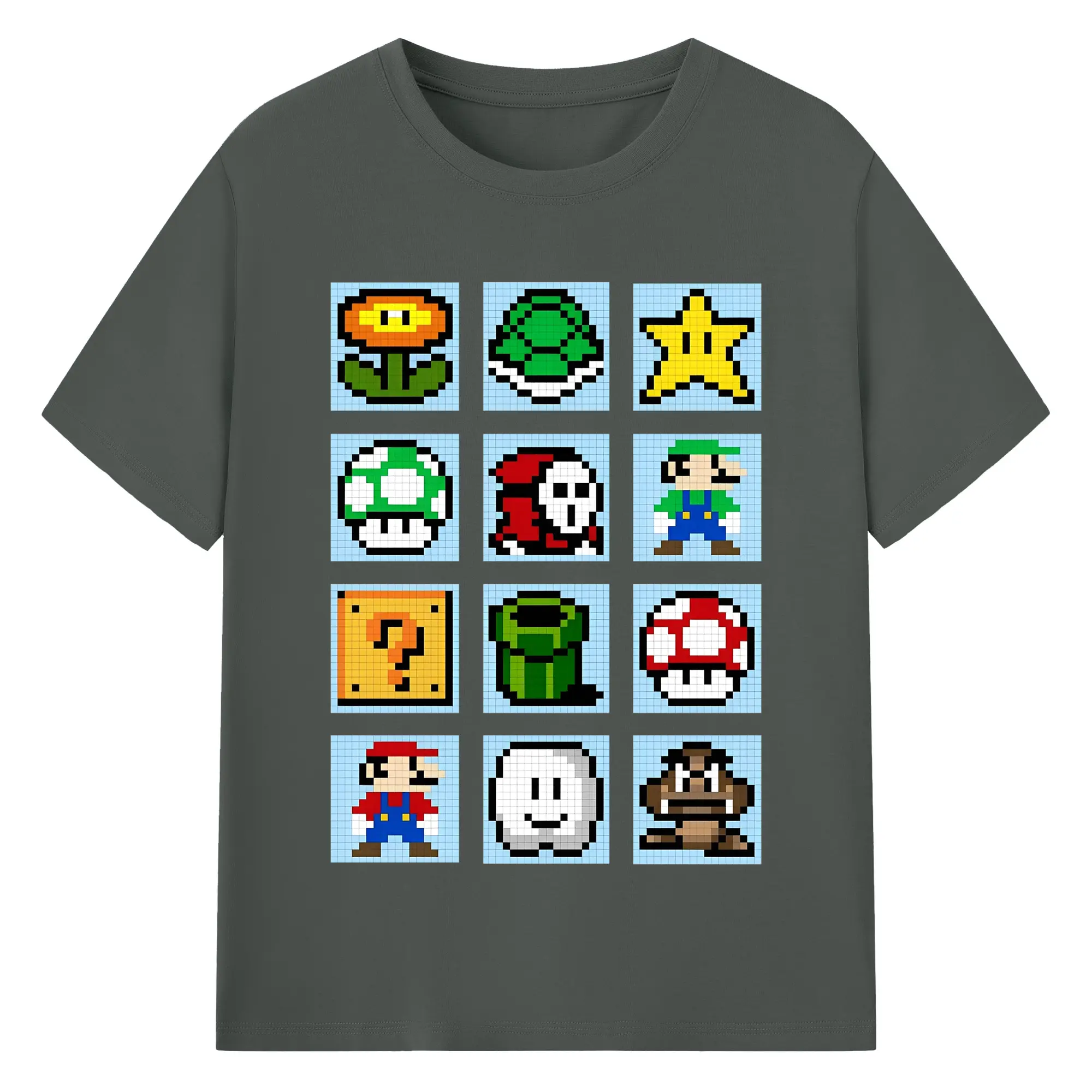 スーパーマリオ キャラクター総柄 - 綿100% ヴィンテージ風 半袖Tシャツ ・ フロントプリント ・ 柔らか肌触り ・ 通気性 快適 ・ スポーツ カジュアル 外出用