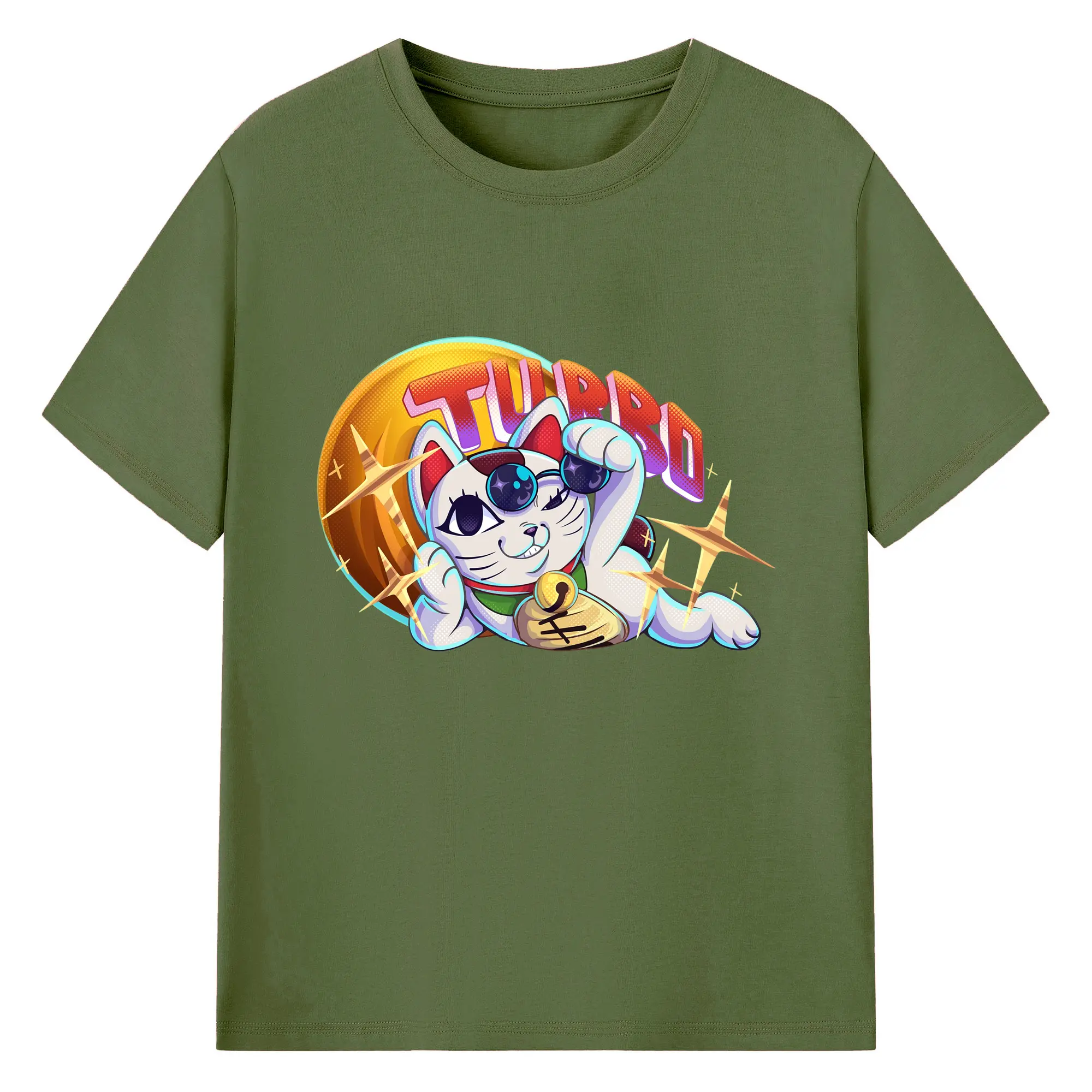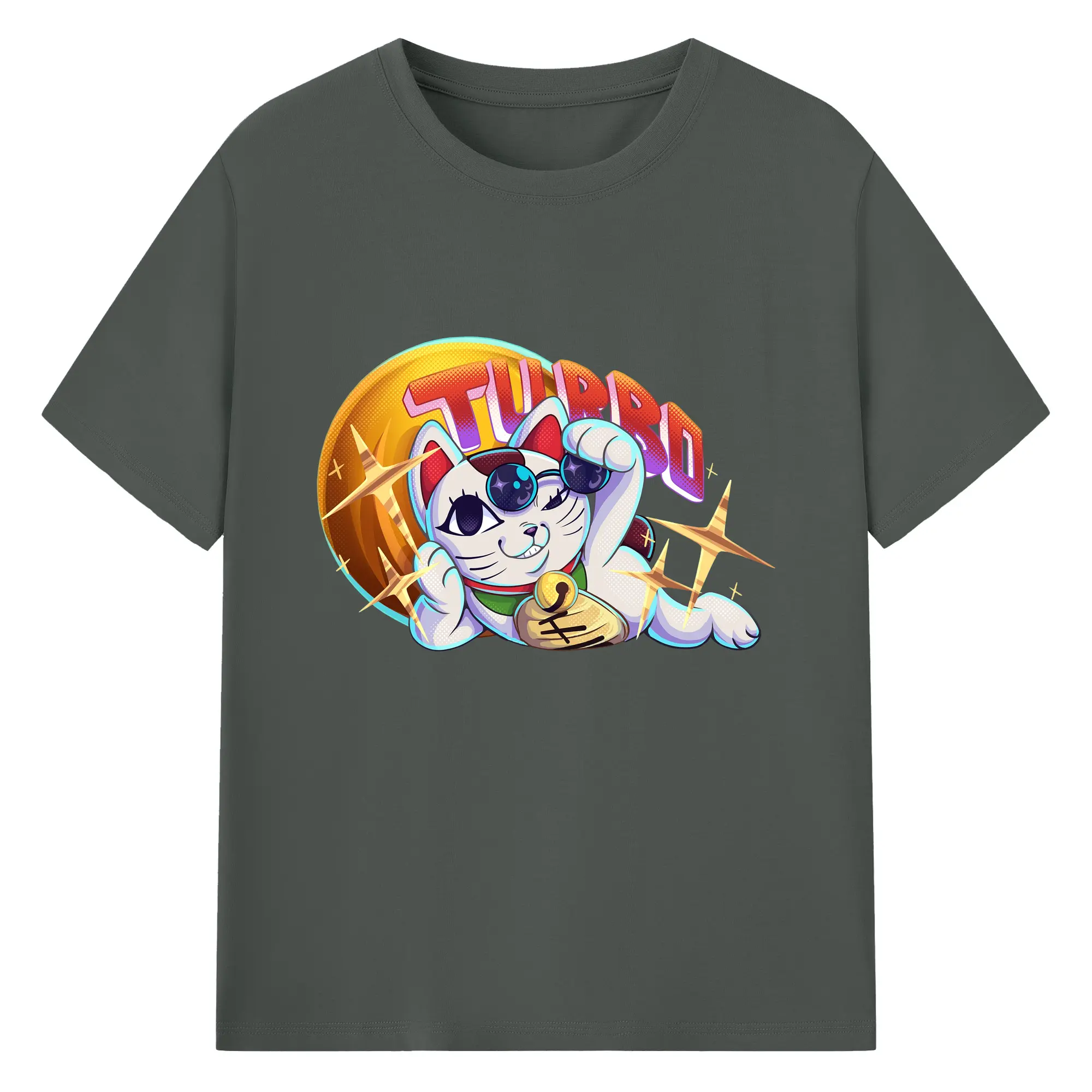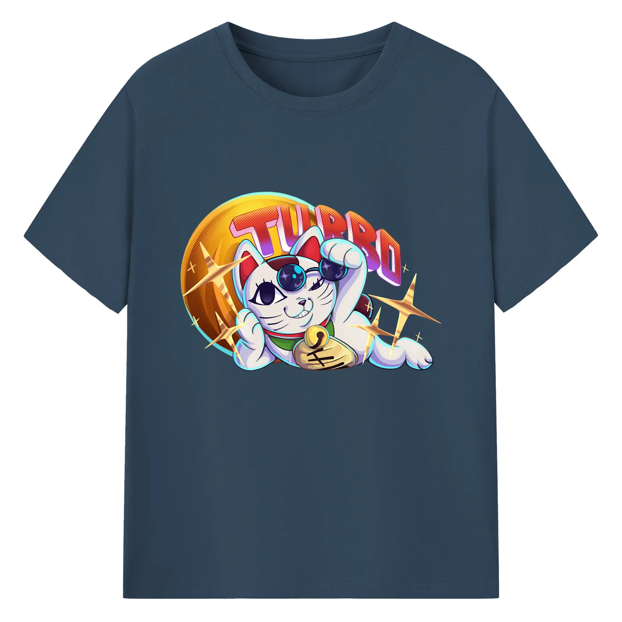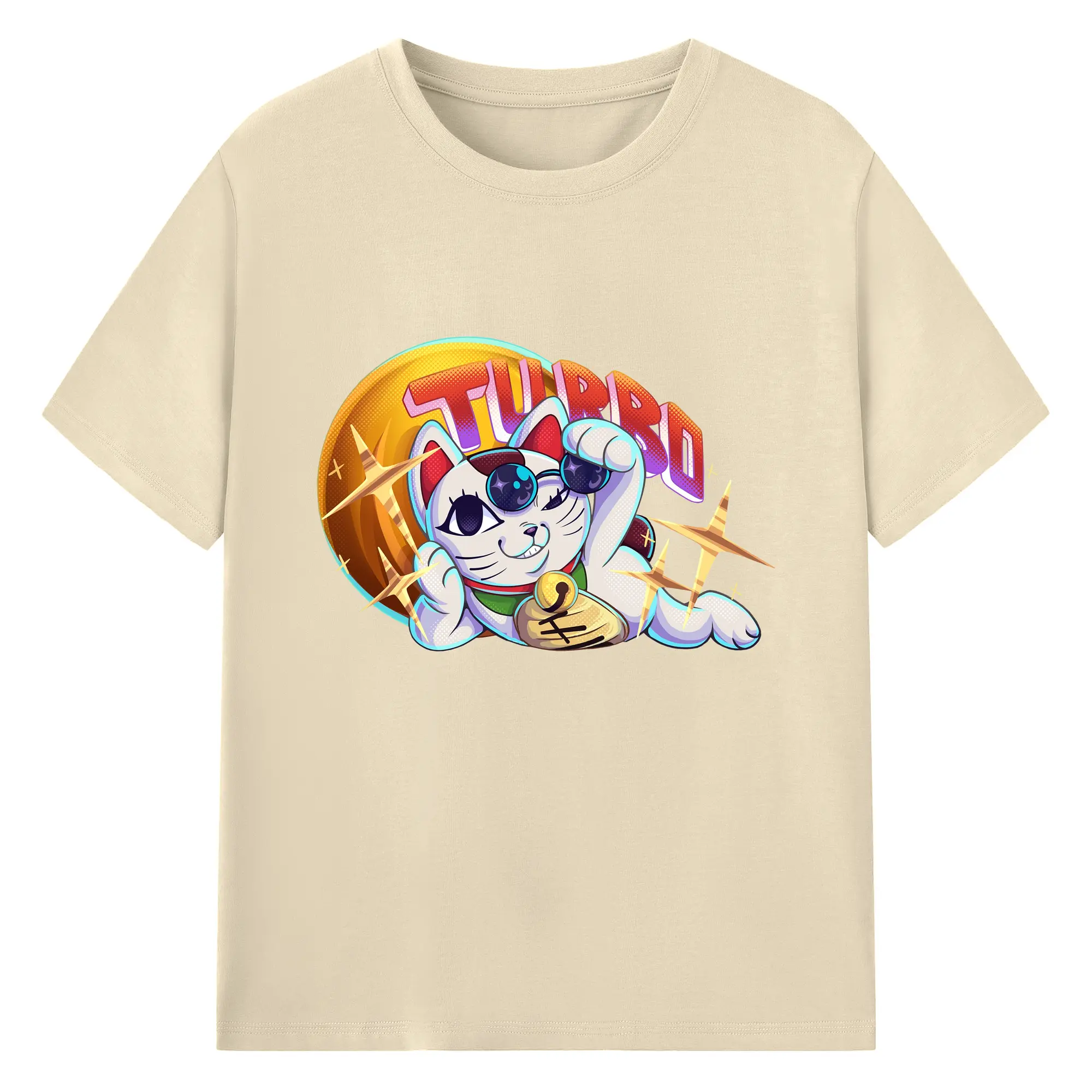 ダンダダンターボババア招き猫Turbo - 綿100% ヴィンテージ風 半袖Tシャツ ・ フロントプリント ・ 柔らか肌触り ・ 通気性 快適 ・ スポーツ カジュアル 外出用