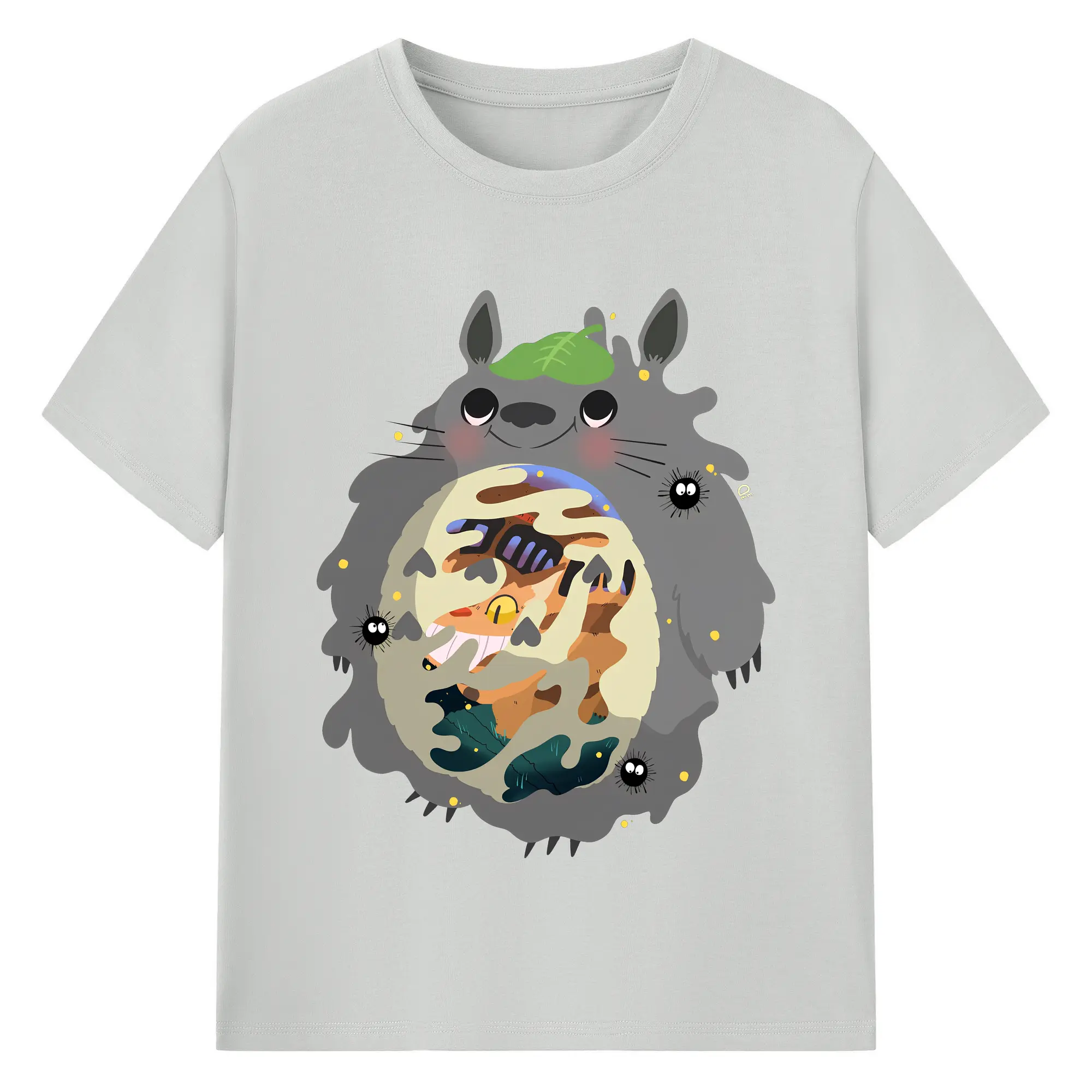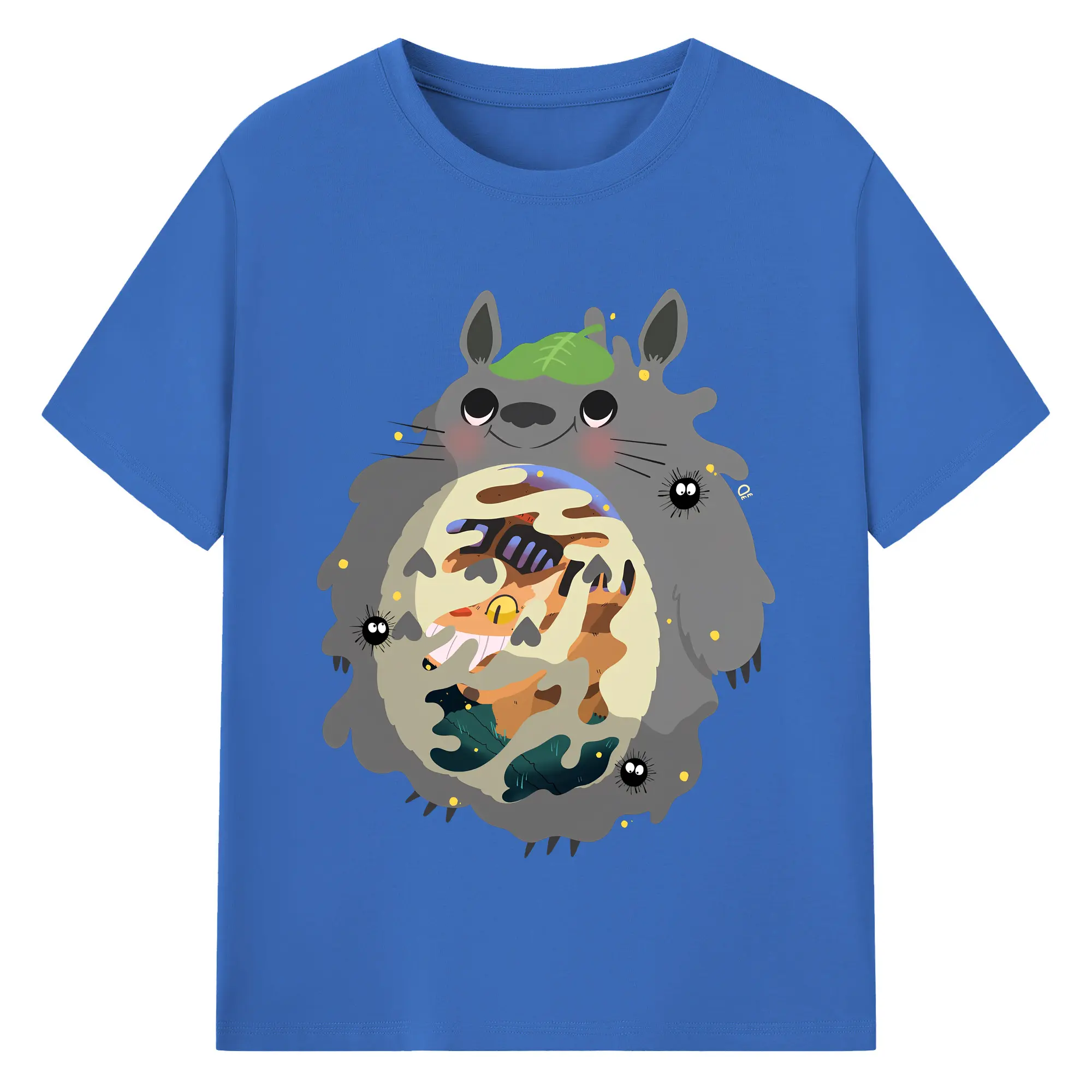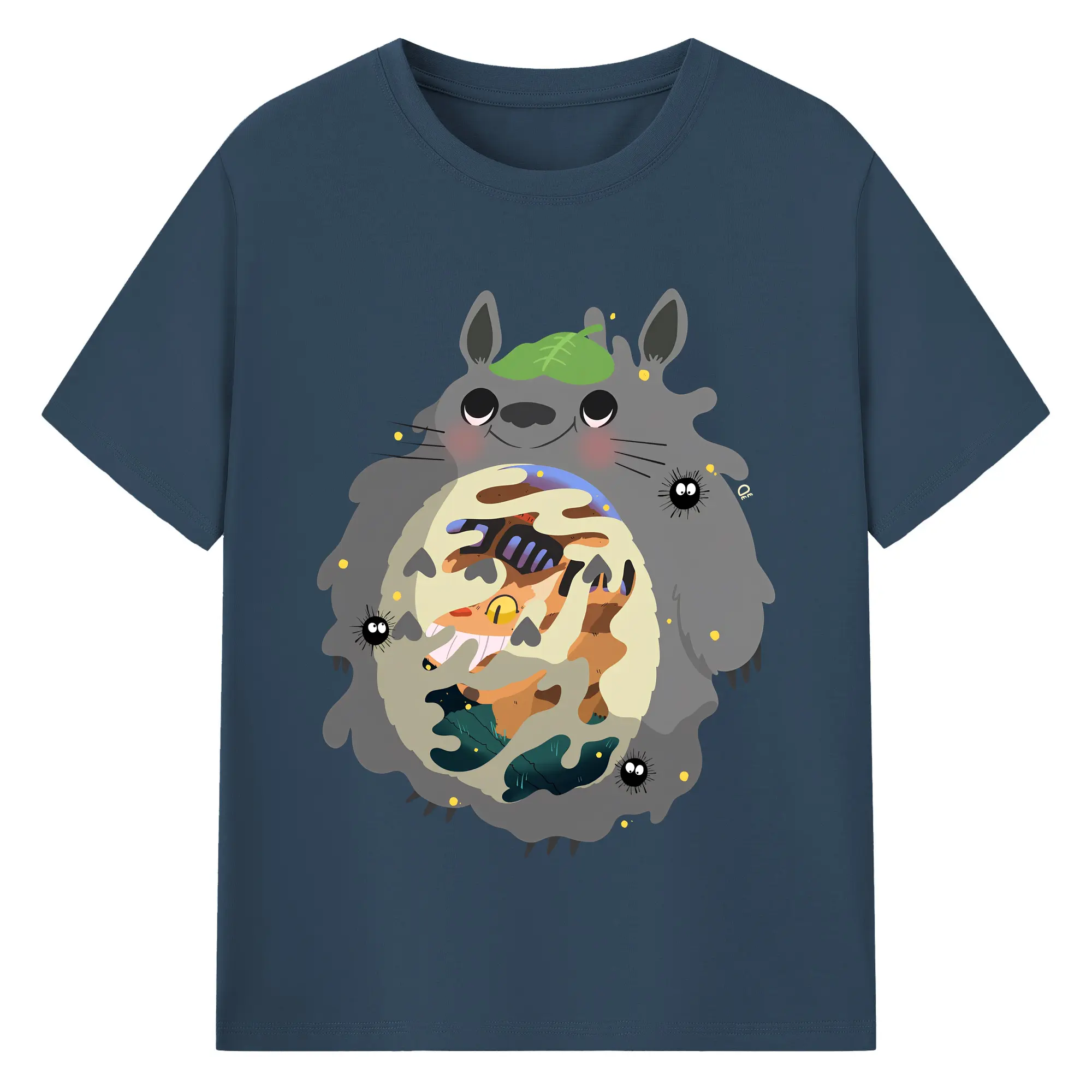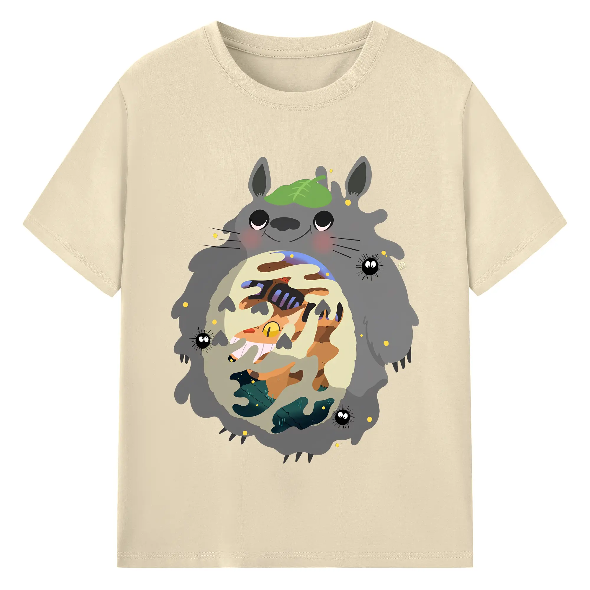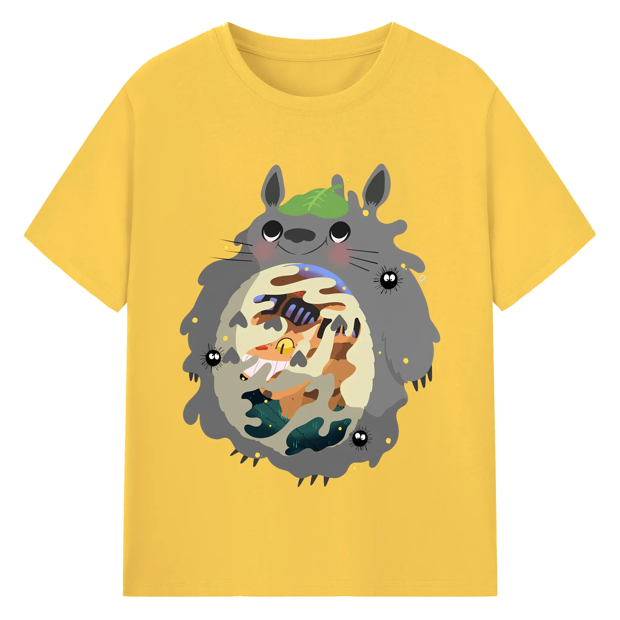 トトロ&ネコバス可愛い - 綿100% ヴィンテージ風 半袖Tシャツ ・ フロントプリント ・ 柔らか肌触り ・ 通気性 快適 ・ スポーツ カジュアル 外出用