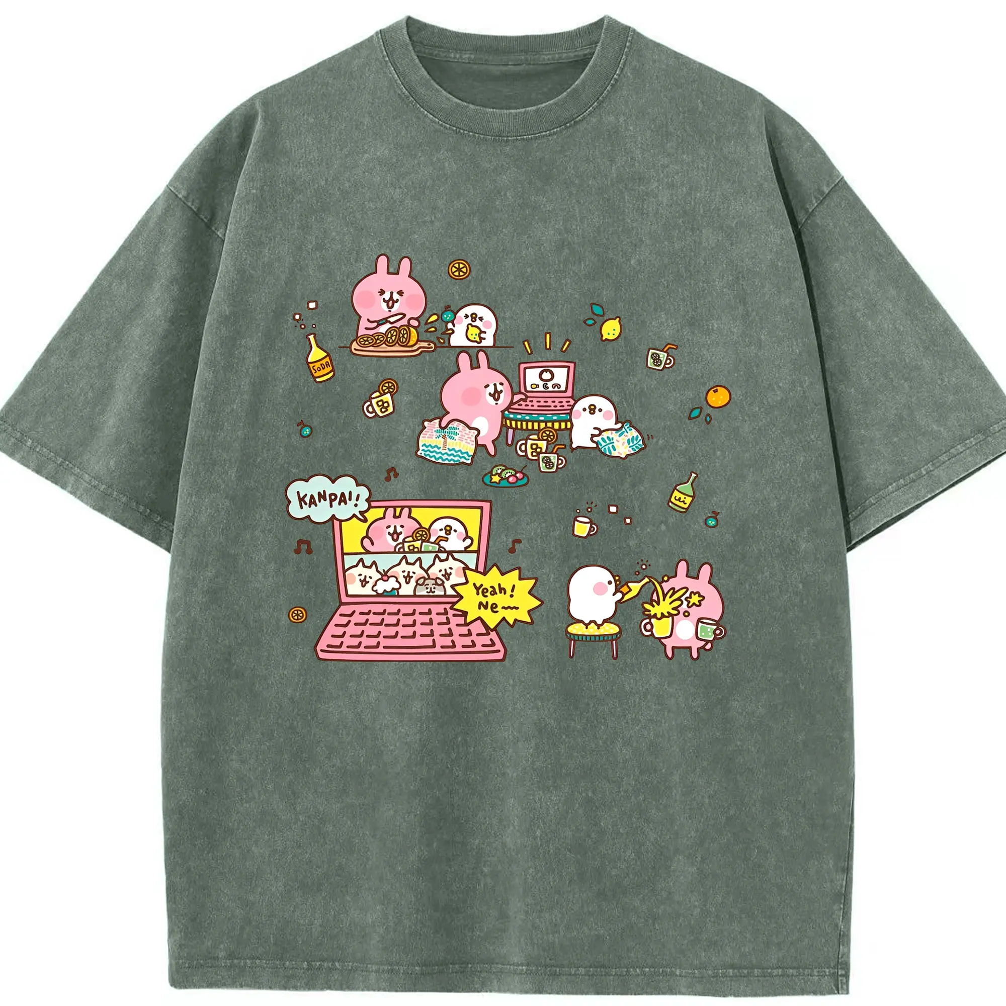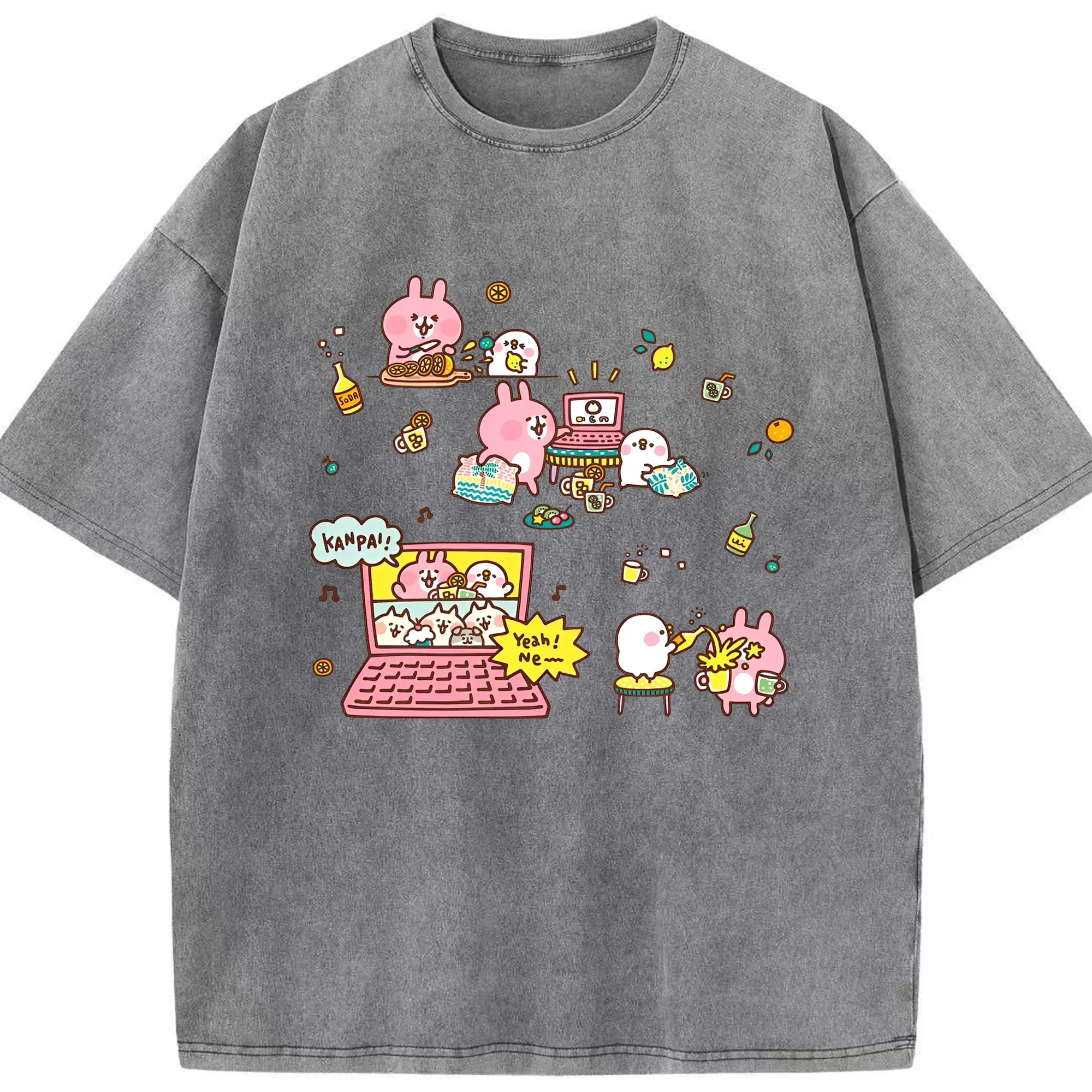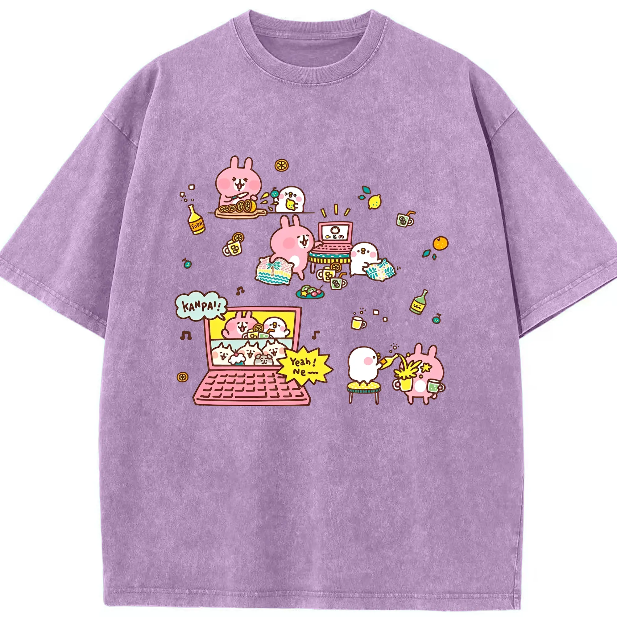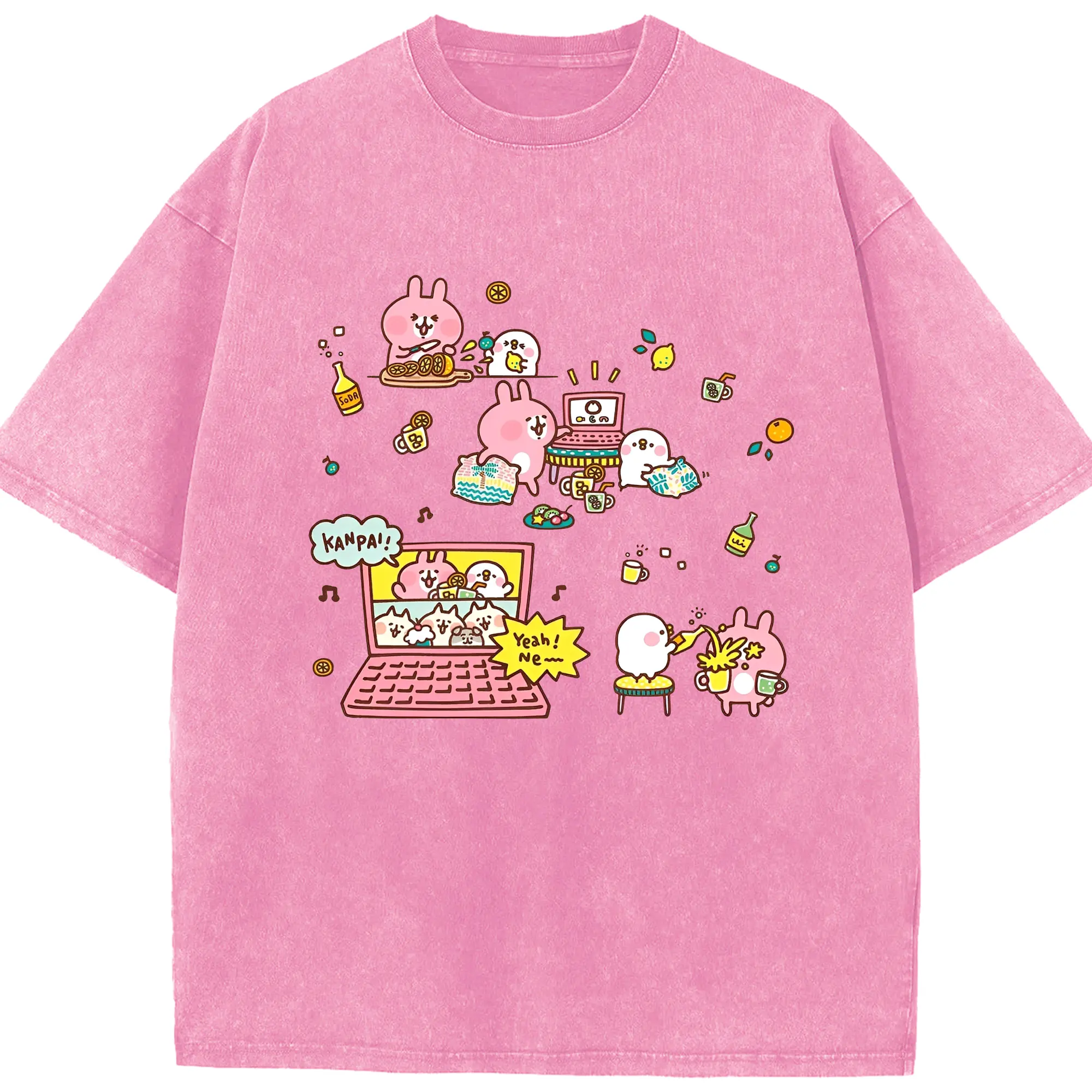ピスケ&うさぎのおうちパーリー🏠🥳 ねーねーねこ達とはオンラインで乾杯です🍻 - 綿100% 半袖Tシャツ ・ フロントプリント ・ 快適 通気性 ・ 日常使い 散歩 スポーツ用