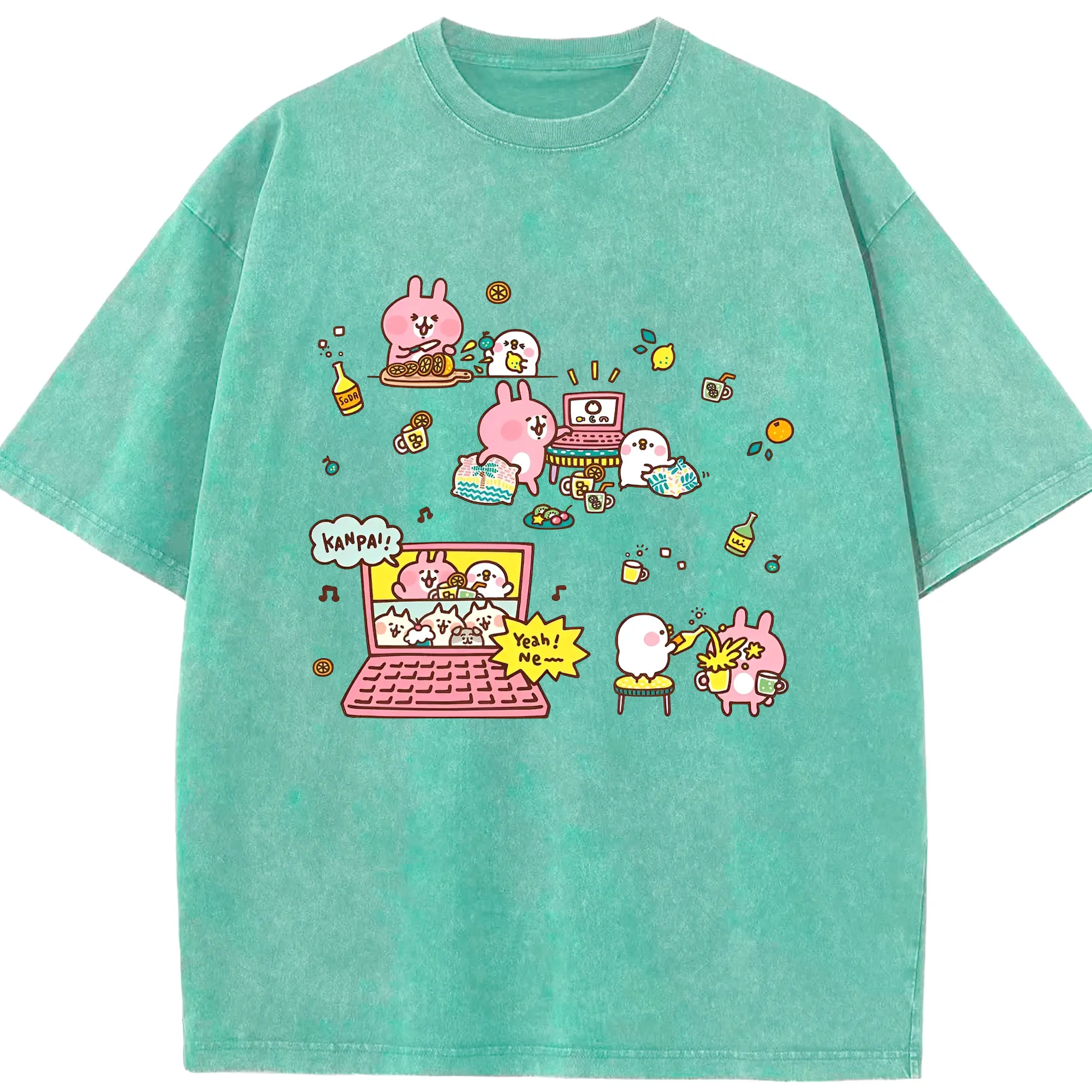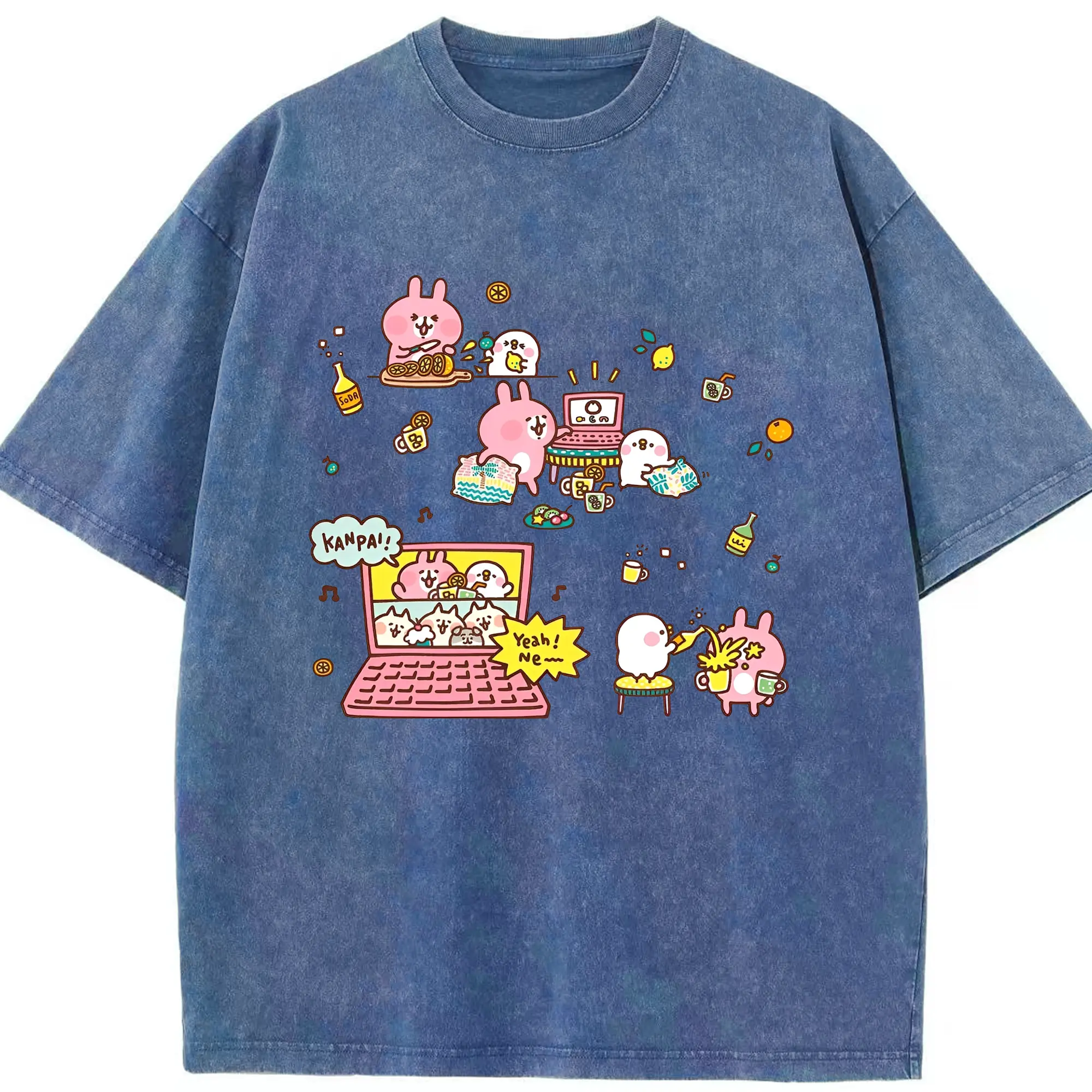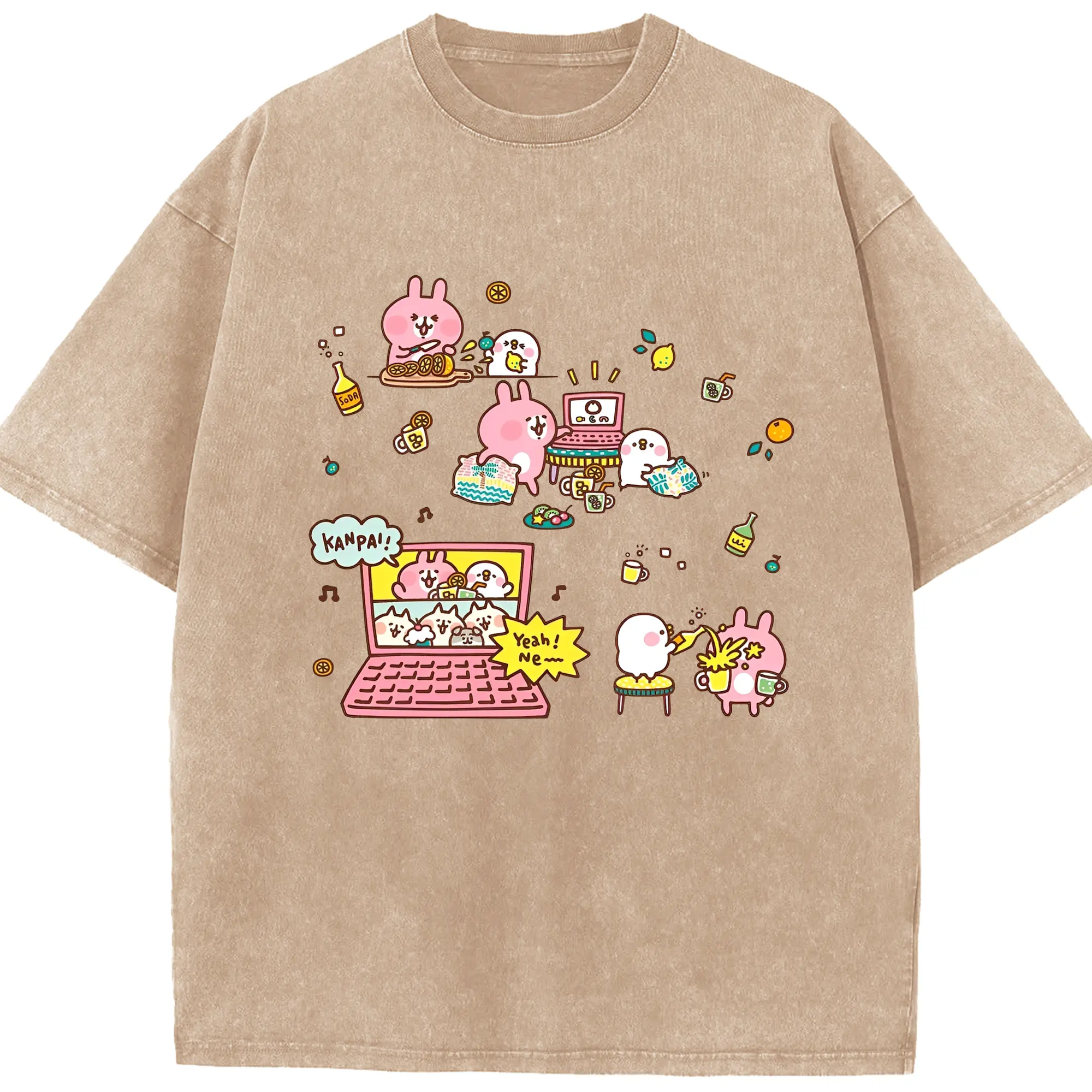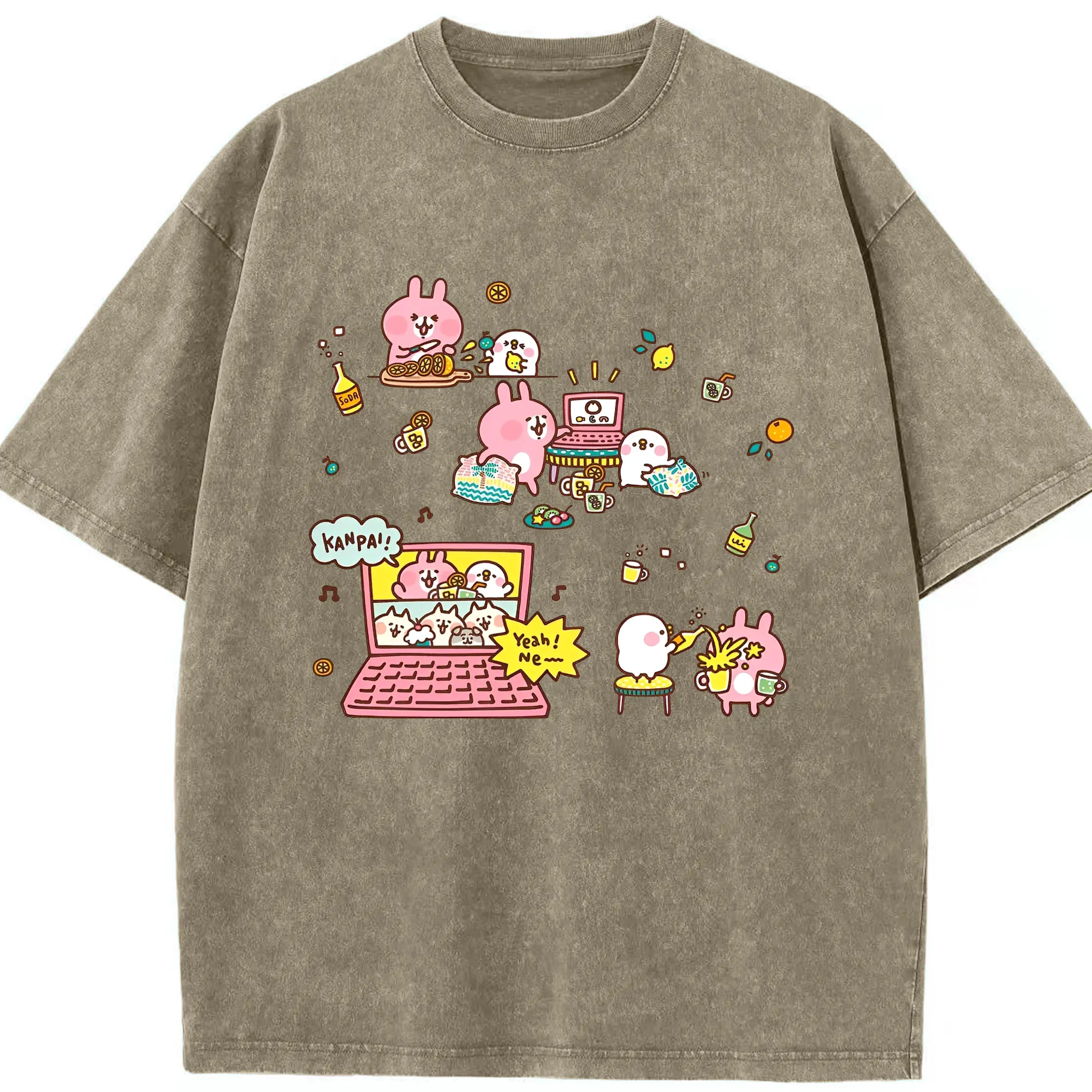 ピスケ&うさぎのおうちパーリー🏠🥳 ねーねーねこ達とはオンラインで乾杯です🍻 - 綿100% 半袖Tシャツ ・ フロントプリント ・ 快適 通気性 ・ 日常使い 散歩 スポーツ用