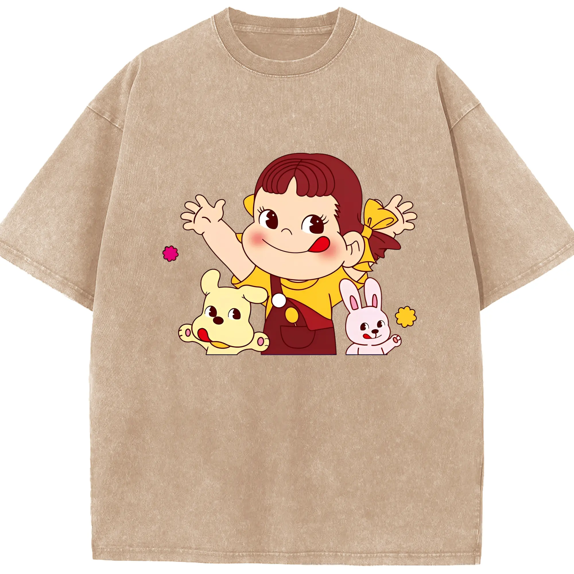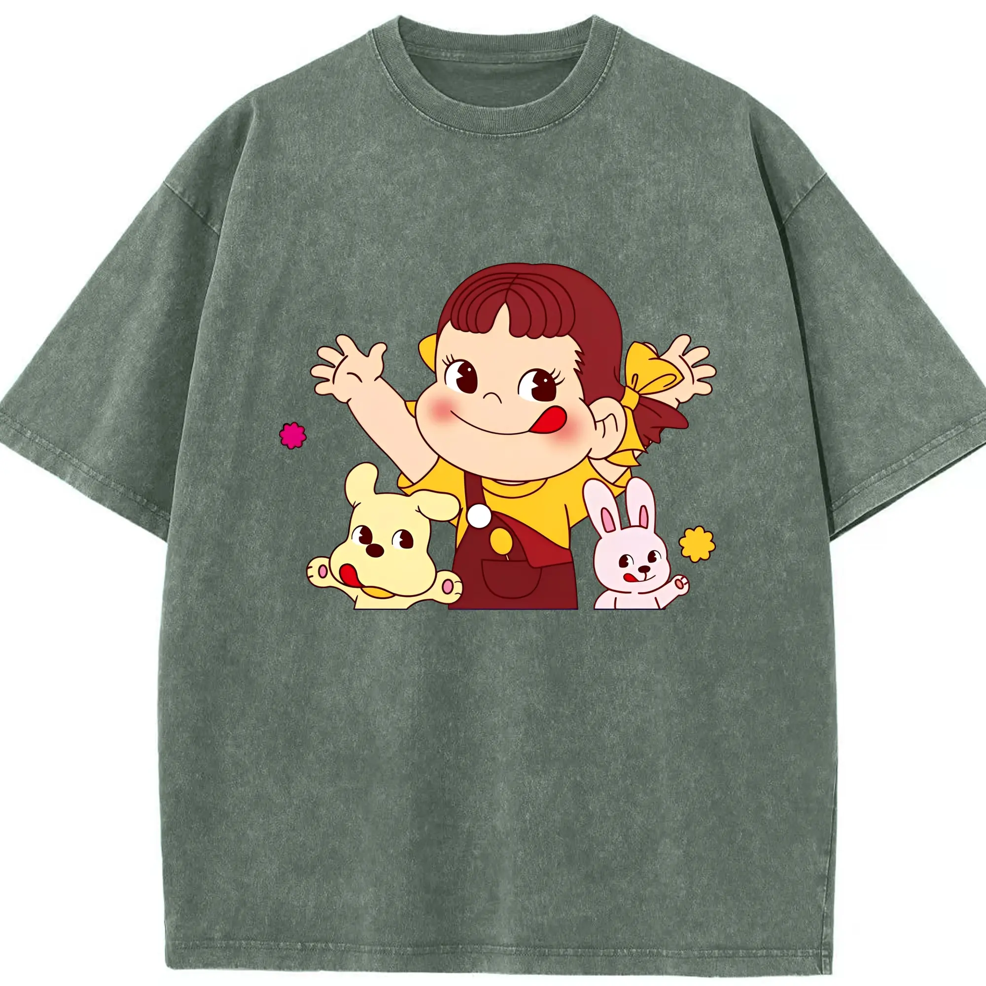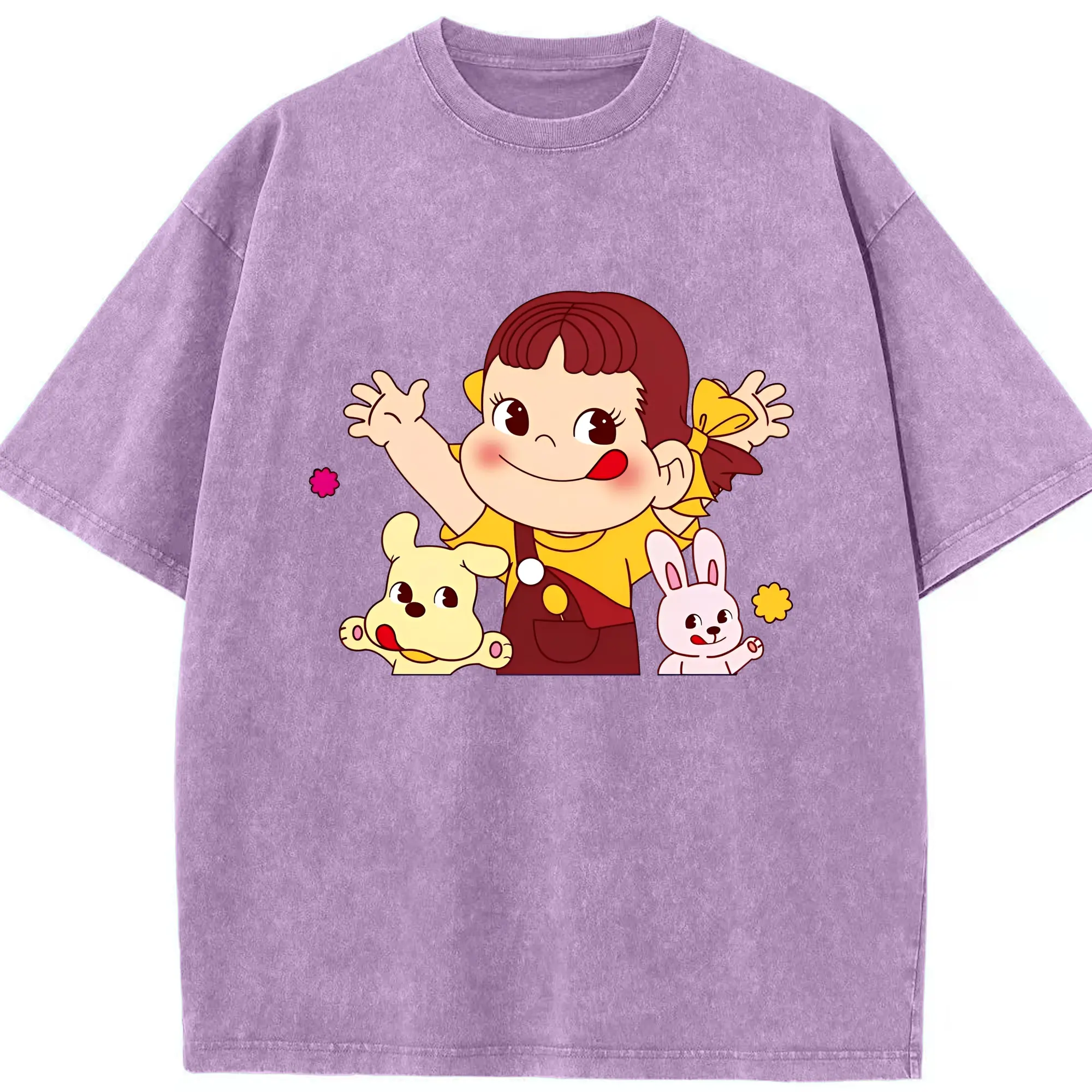 ペコちゃんの仲良しの犬のキャラクター - 綿100% 半袖Tシャツ ・ フロントプリント ・ 快適 通気性 ・ 日常使い 散歩 スポーツ用