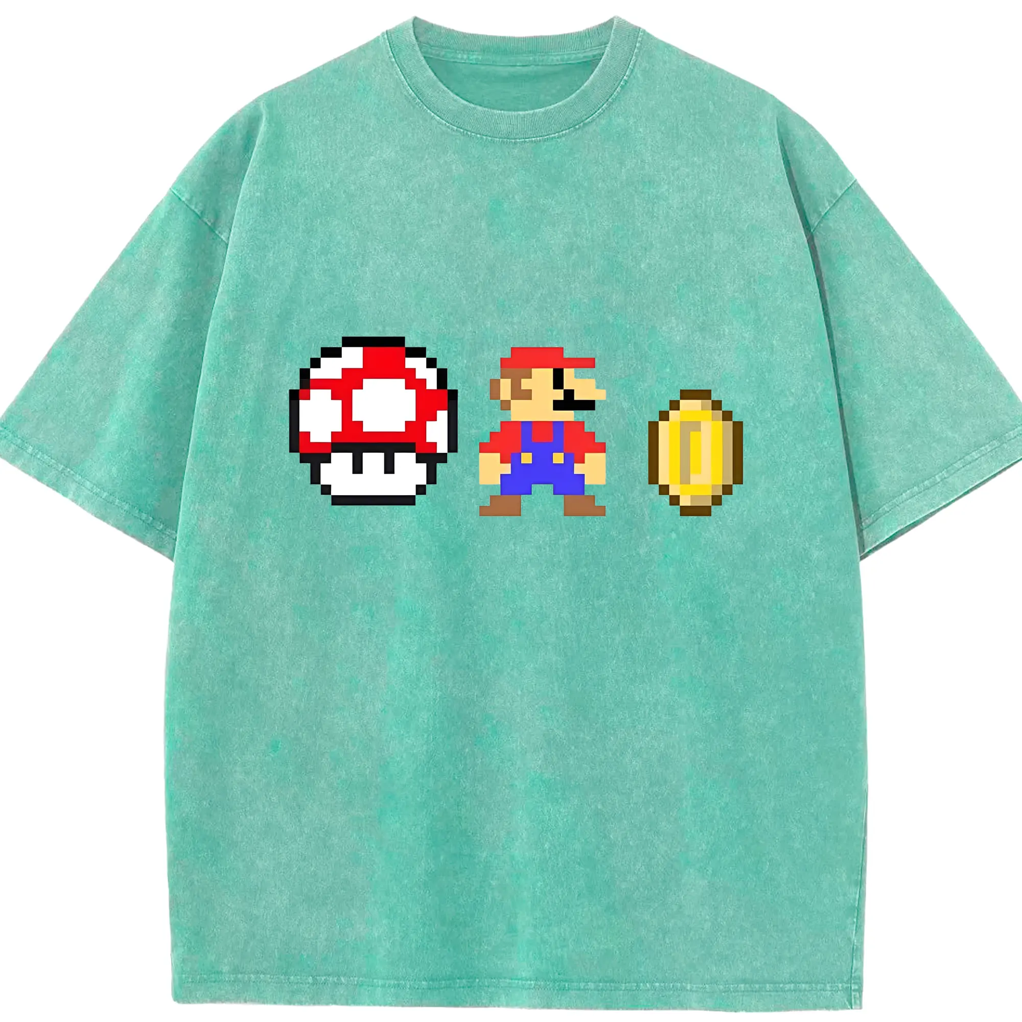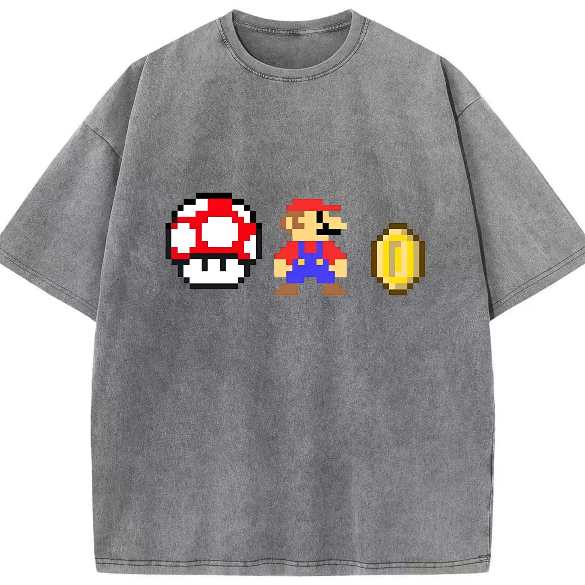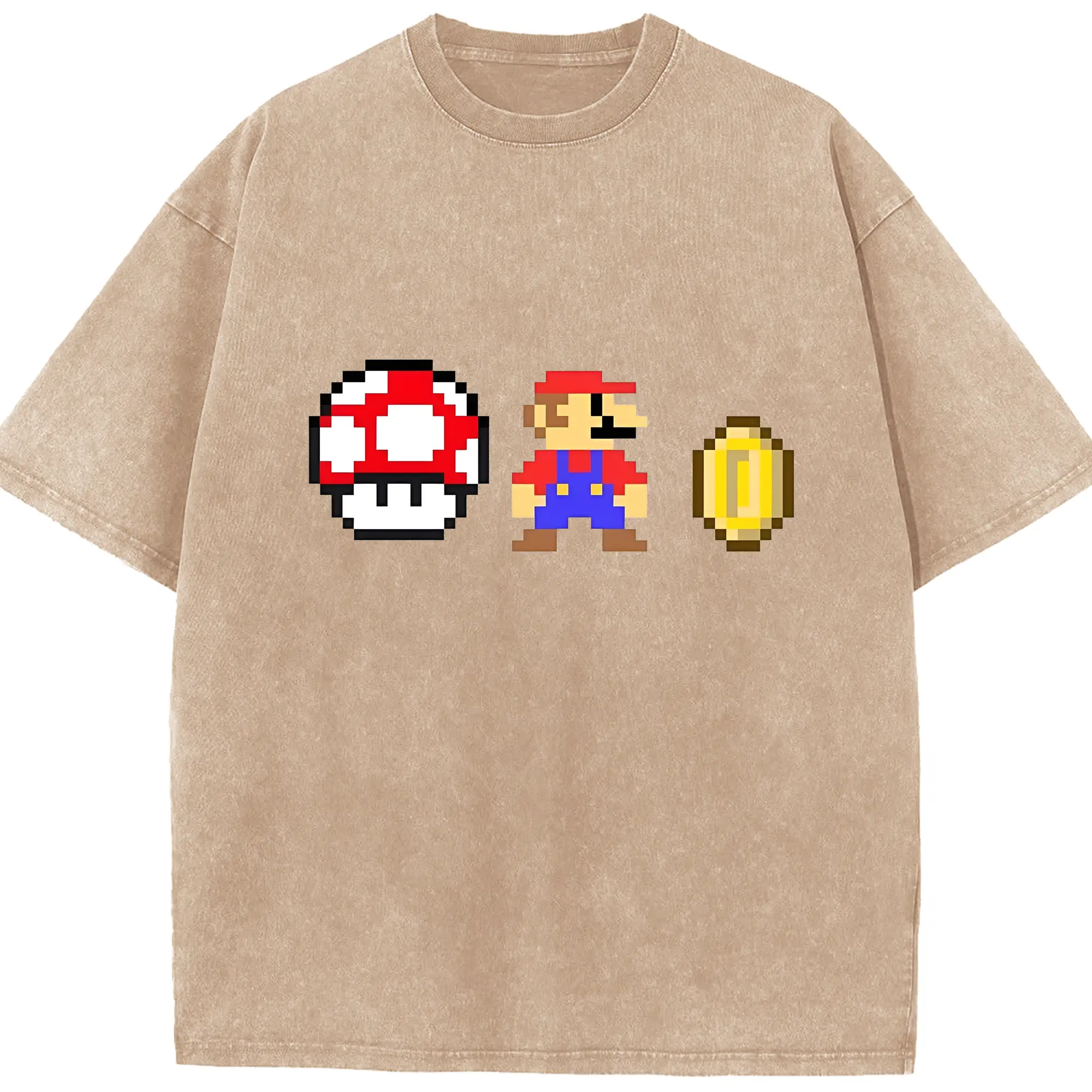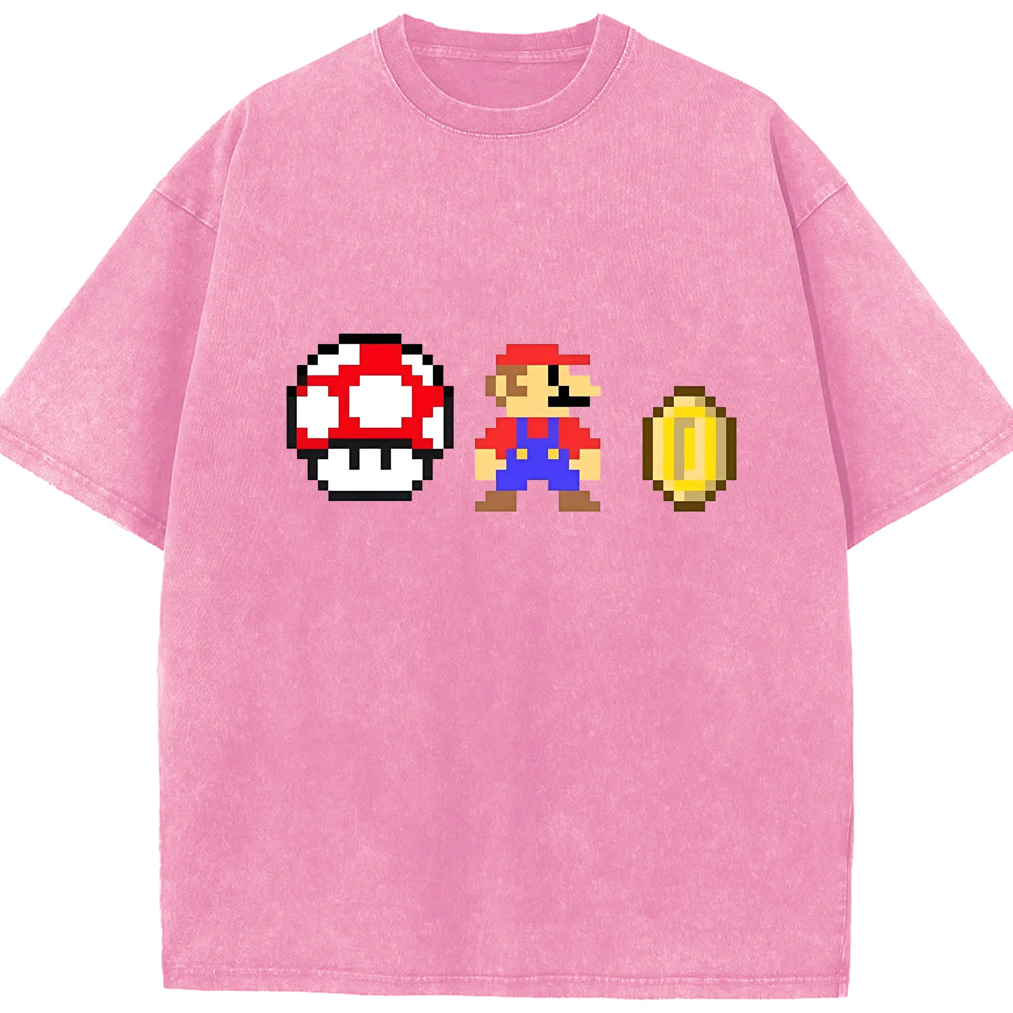 マリオとキノピオのコイン集めレトロゲーム風 - 綿100% 半袖Tシャツ ・ フロントプリント ・ 快適 通気性 ・ 日常使い 散歩 スポーツ用