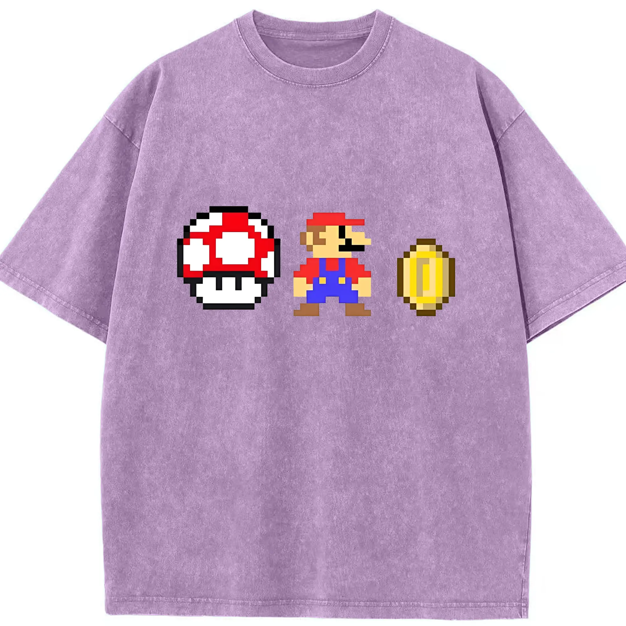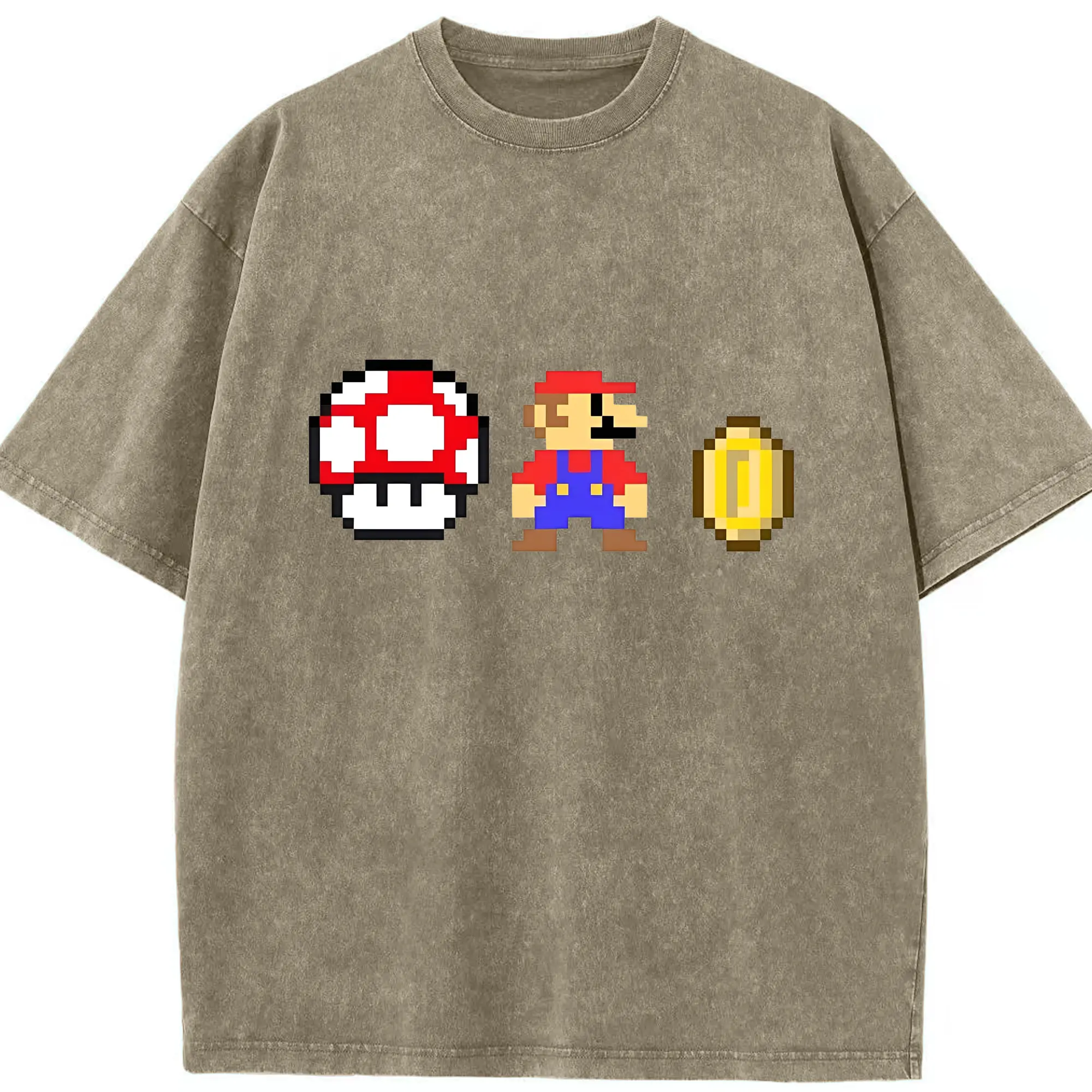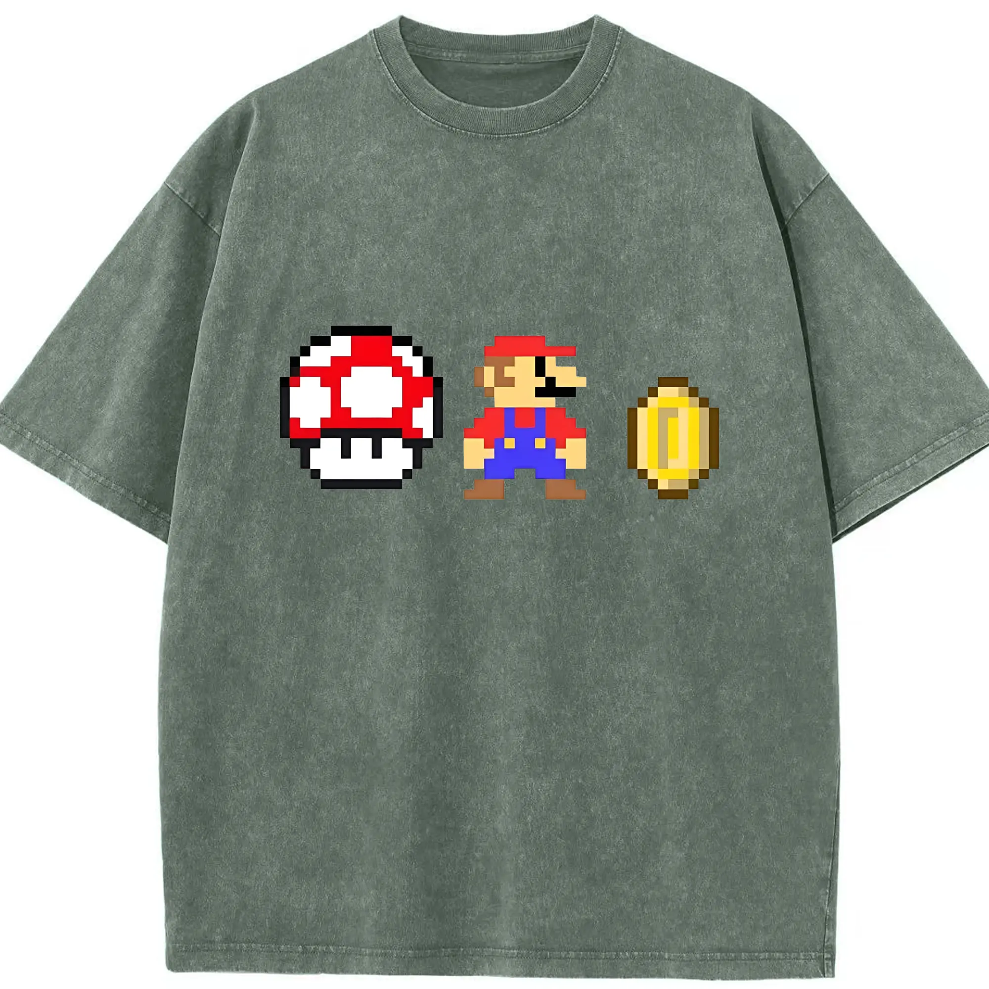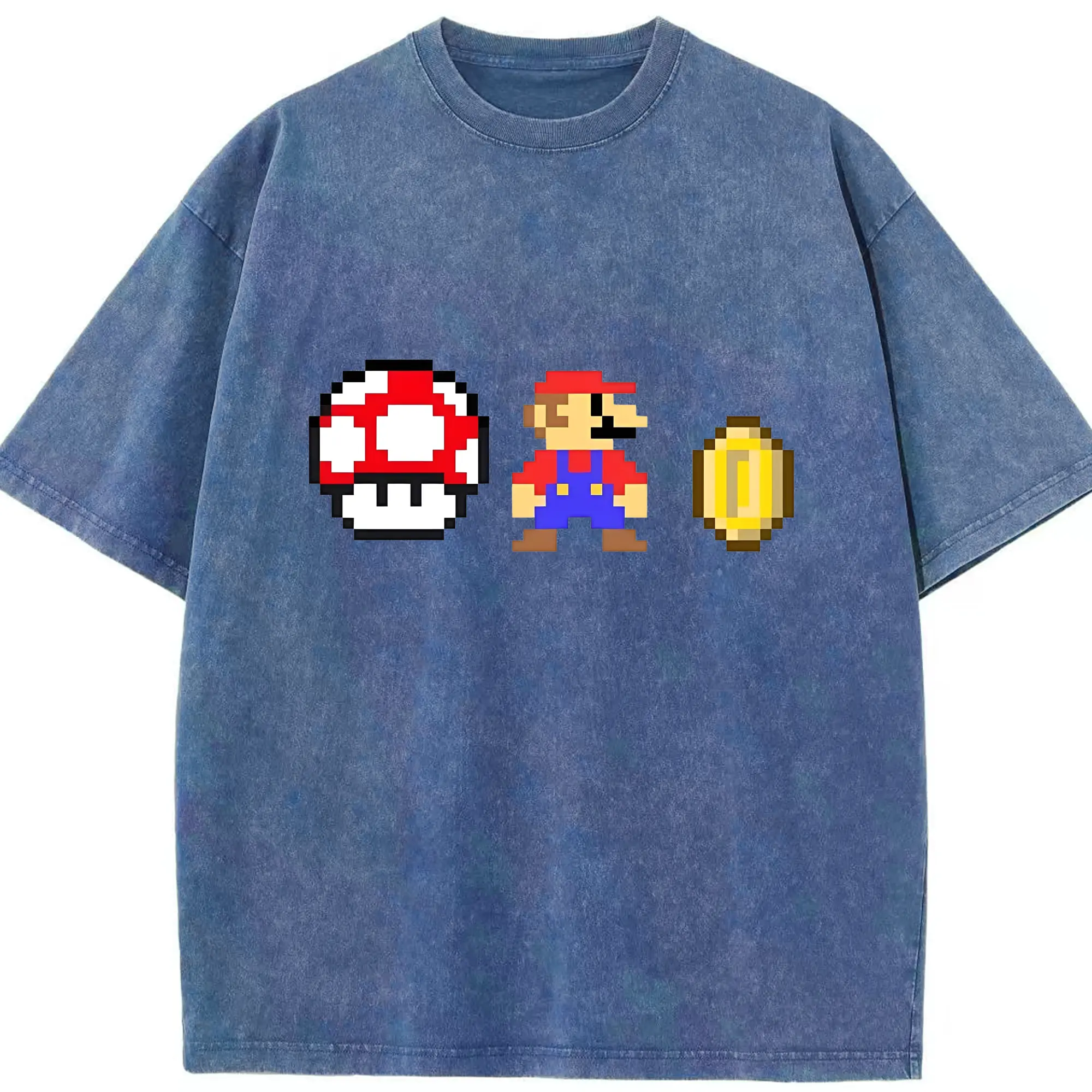 マリオとキノピオのコイン集めレトロゲーム風 - 綿100% 半袖Tシャツ ・ フロントプリント ・ 快適 通気性 ・ 日常使い 散歩 スポーツ用