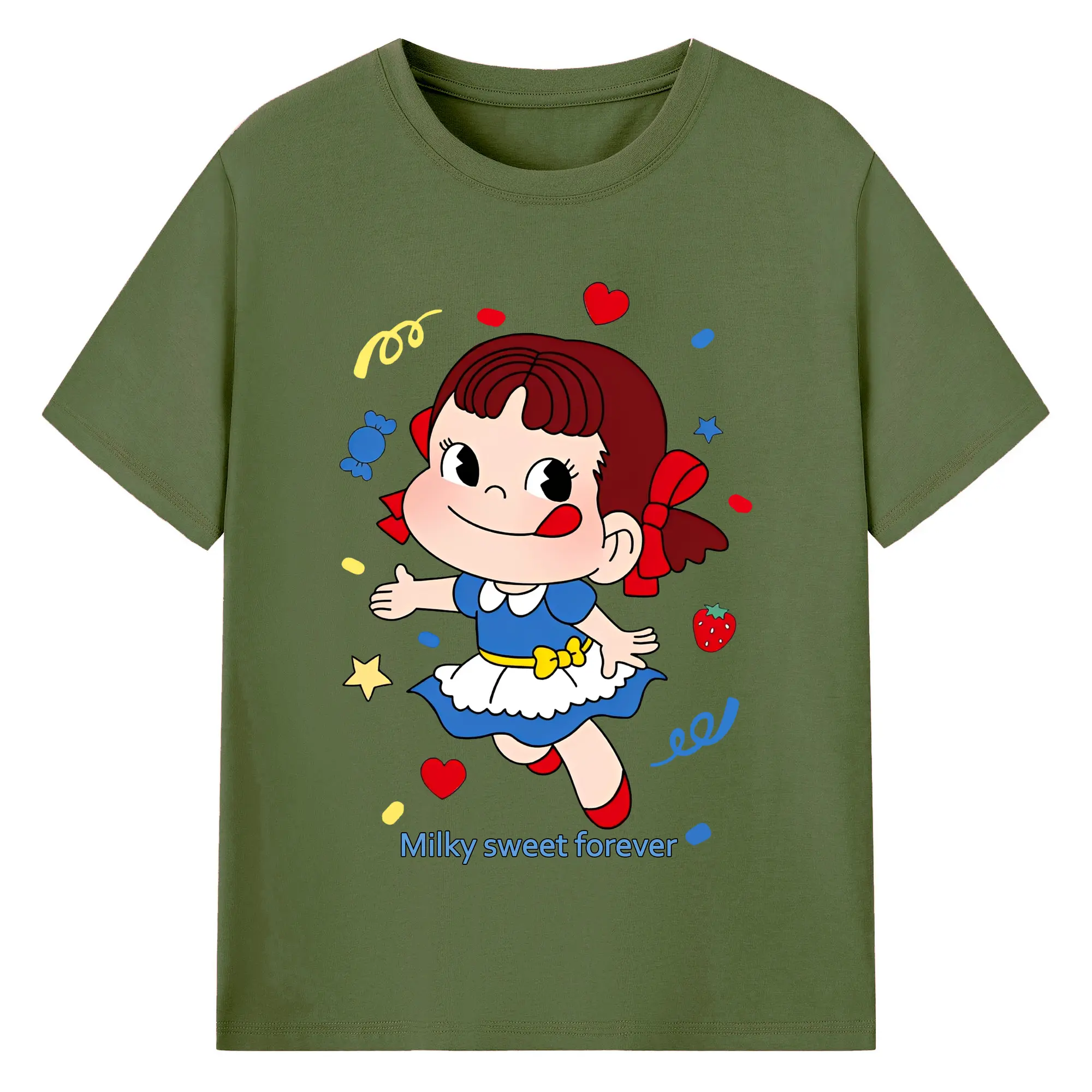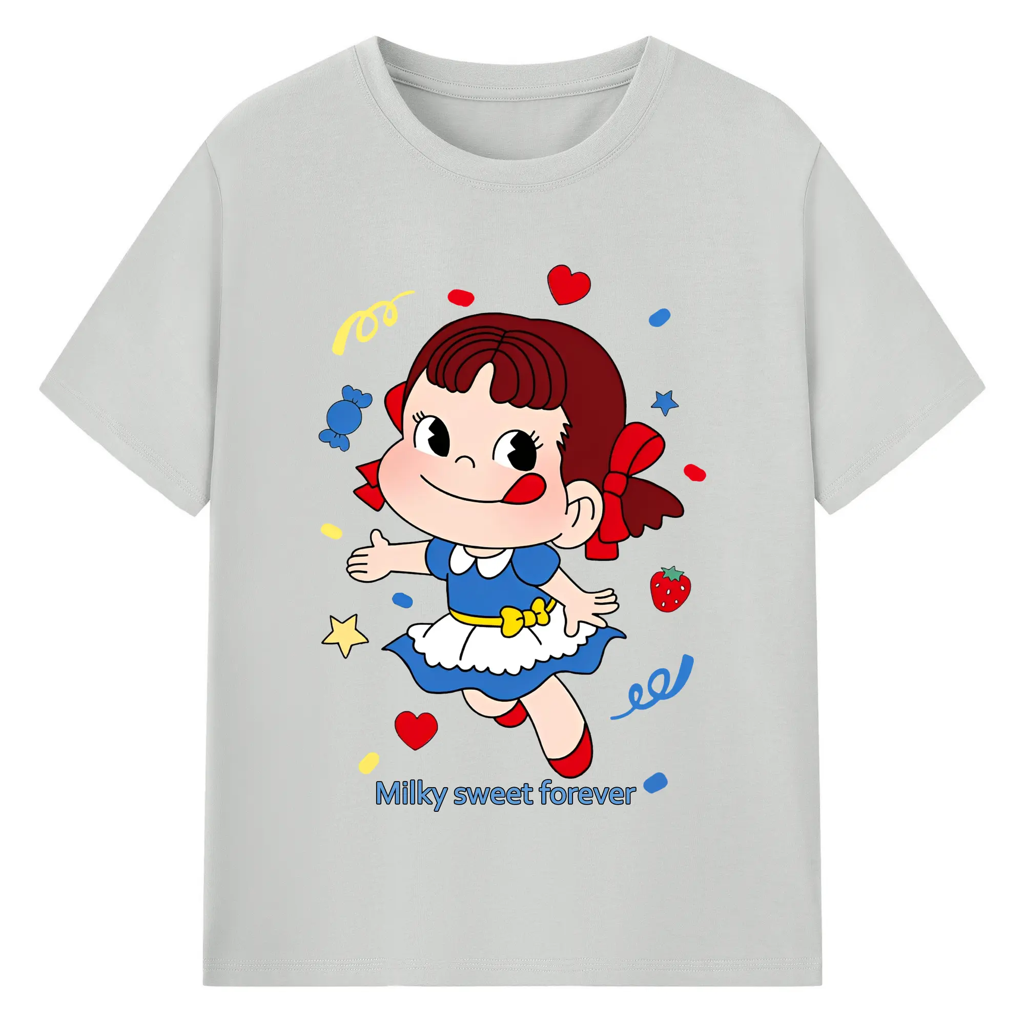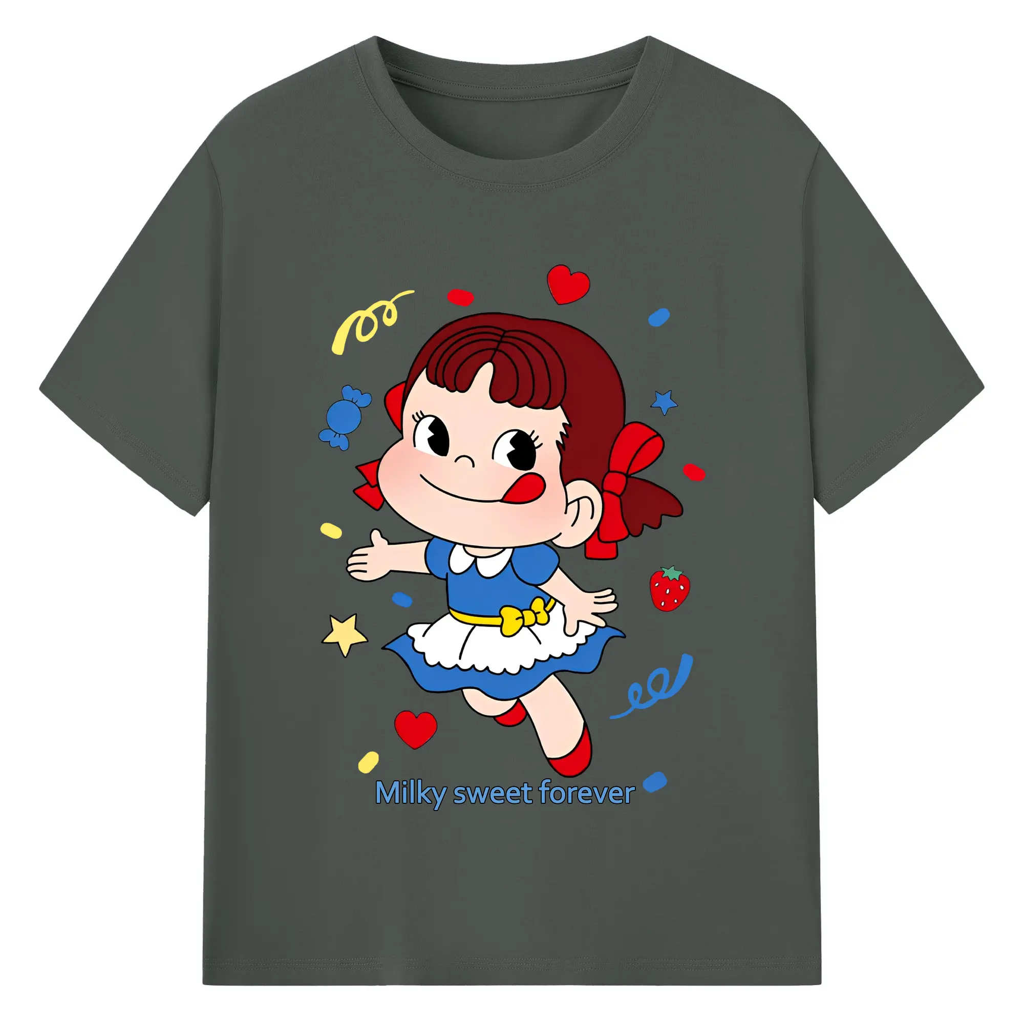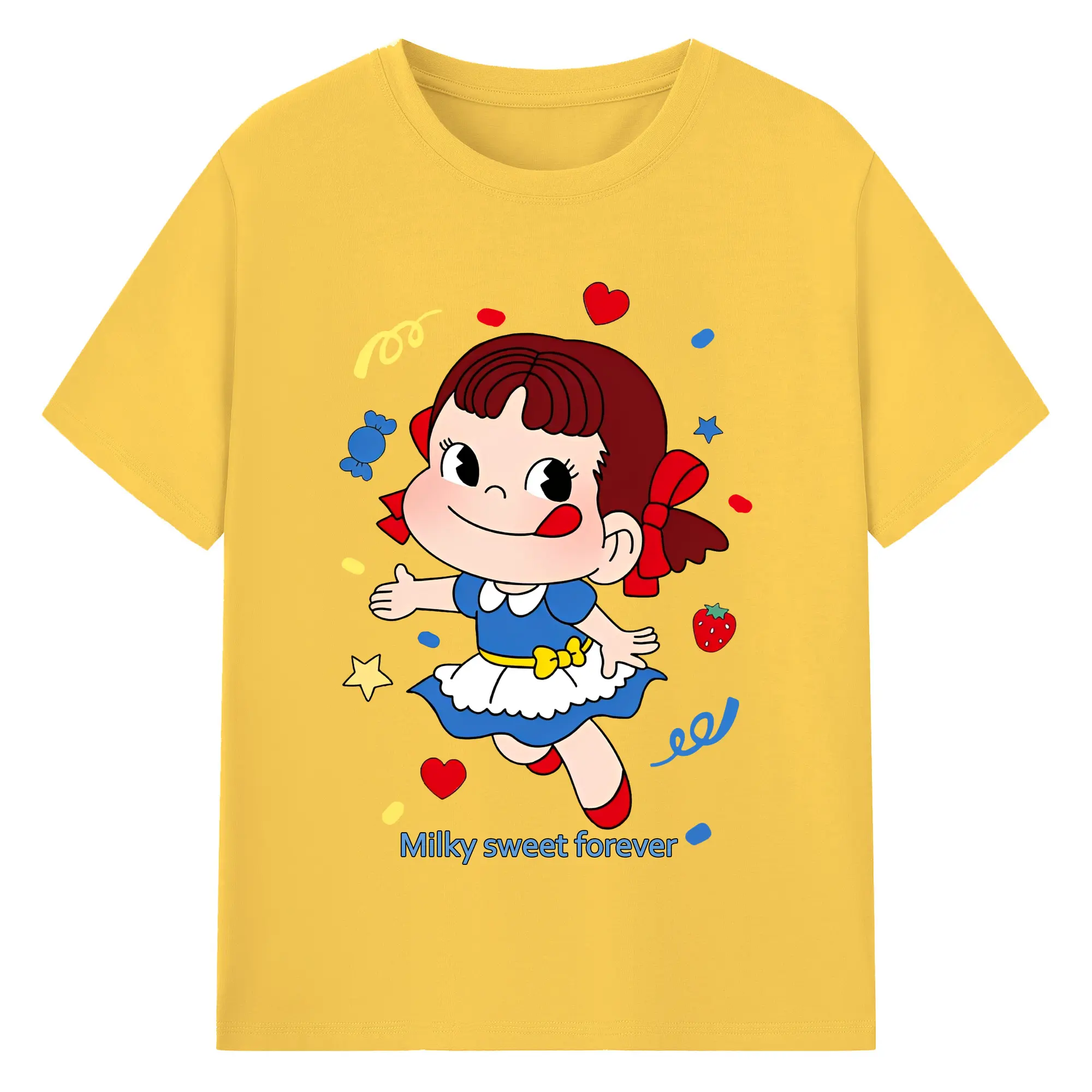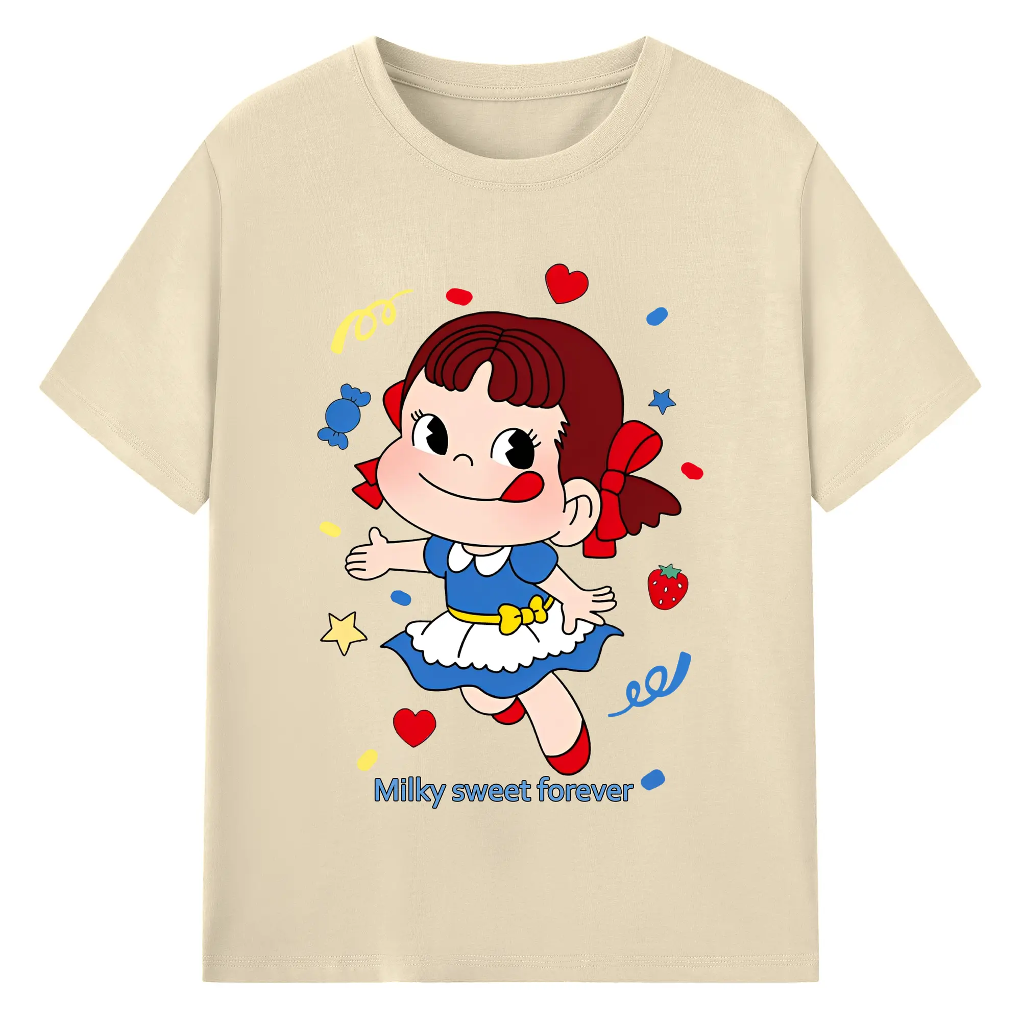 不二家 ペコちゃん スイーツ ミルク味 お菓子 - 綿100% ヴィンテージ風 半袖Tシャツ ・ フロントプリント ・ 柔らか肌触り ・ 通気性 快適 ・ スポーツ カジュアル 外出用