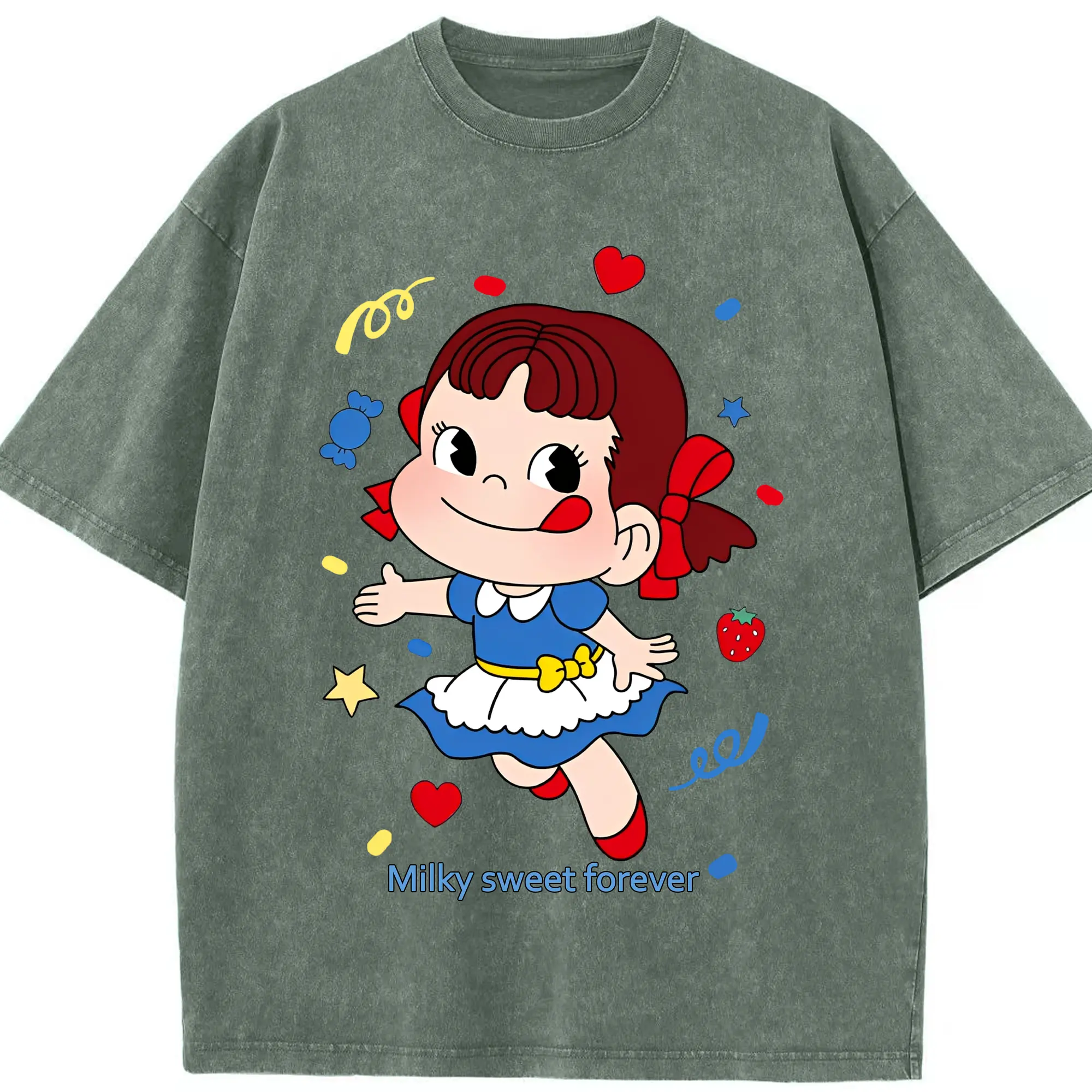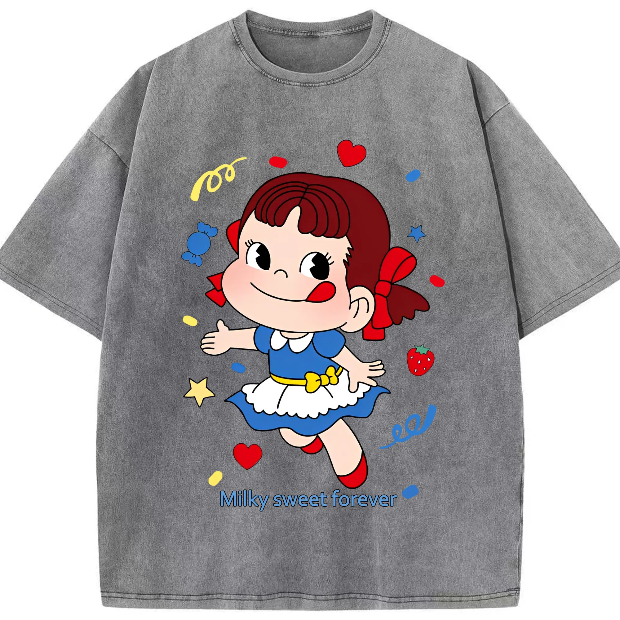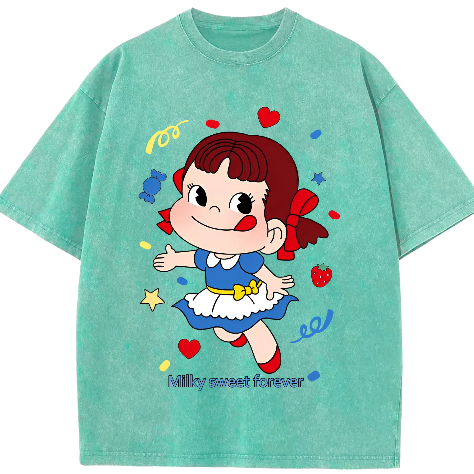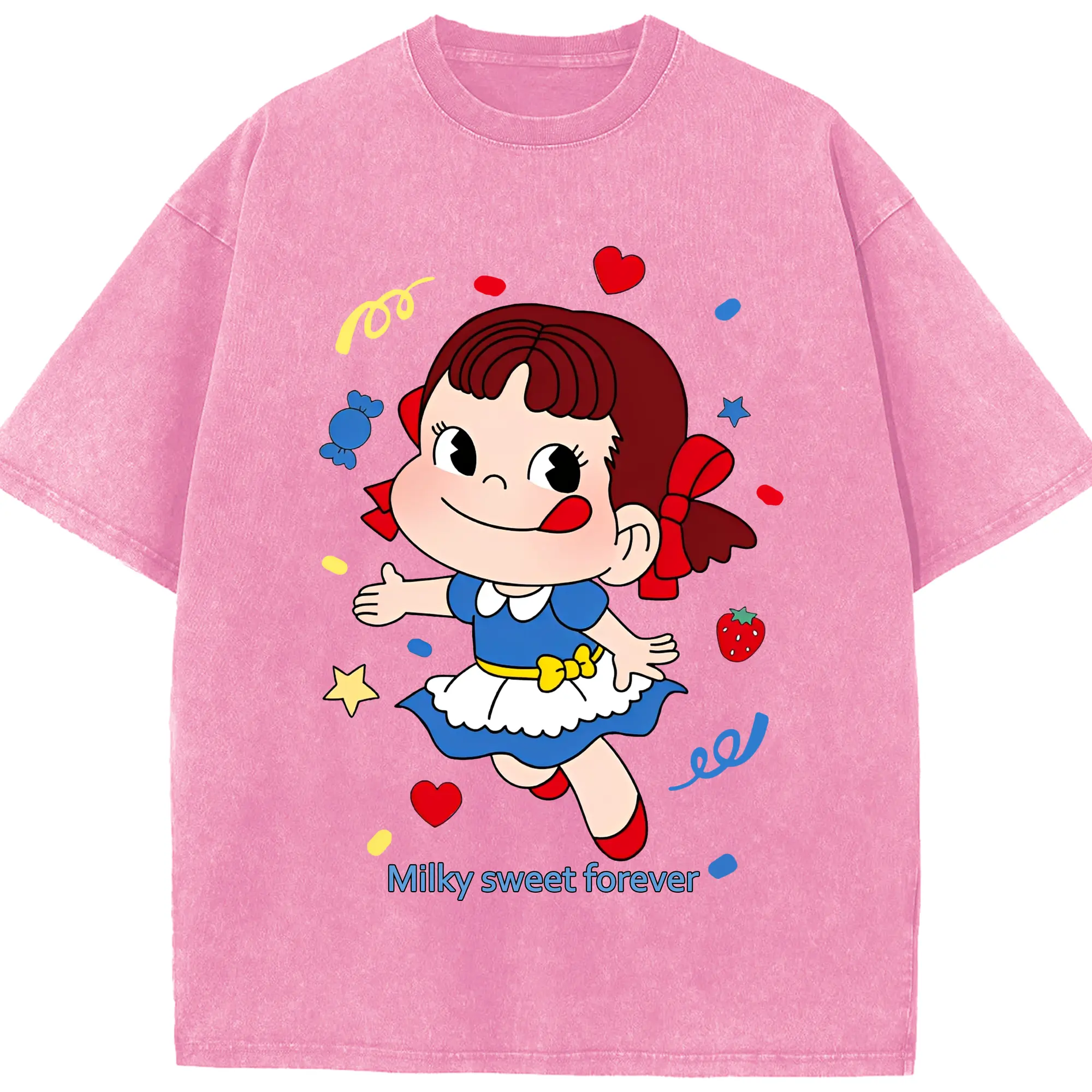 不二家 ペコちゃん スイーツ ミルク味 お菓子 - 綿100% 半袖Tシャツ ・ フロントプリント ・ 快適 通気性 ・ 日常使い 散歩 スポーツ用