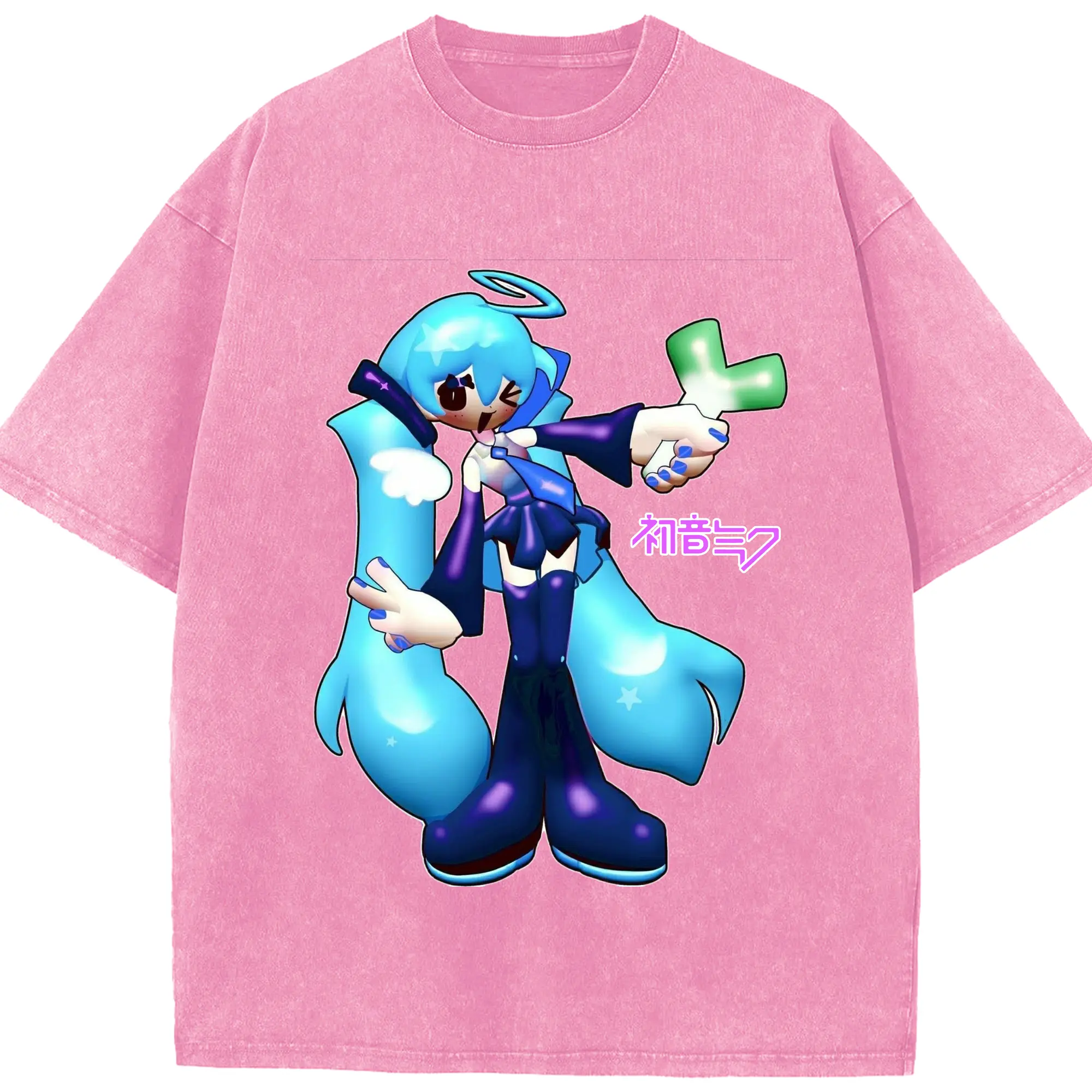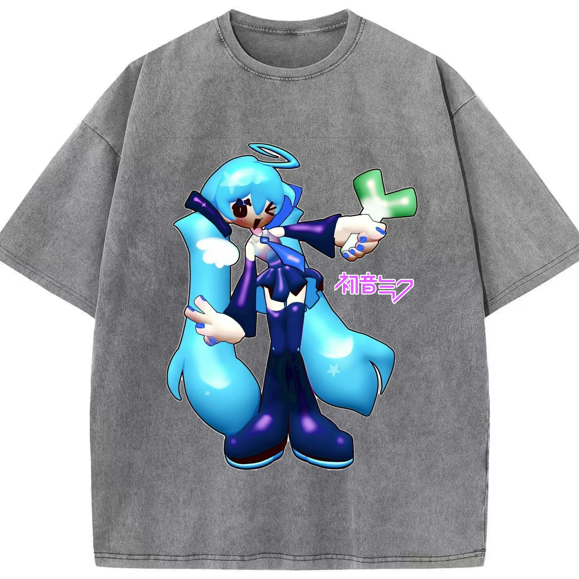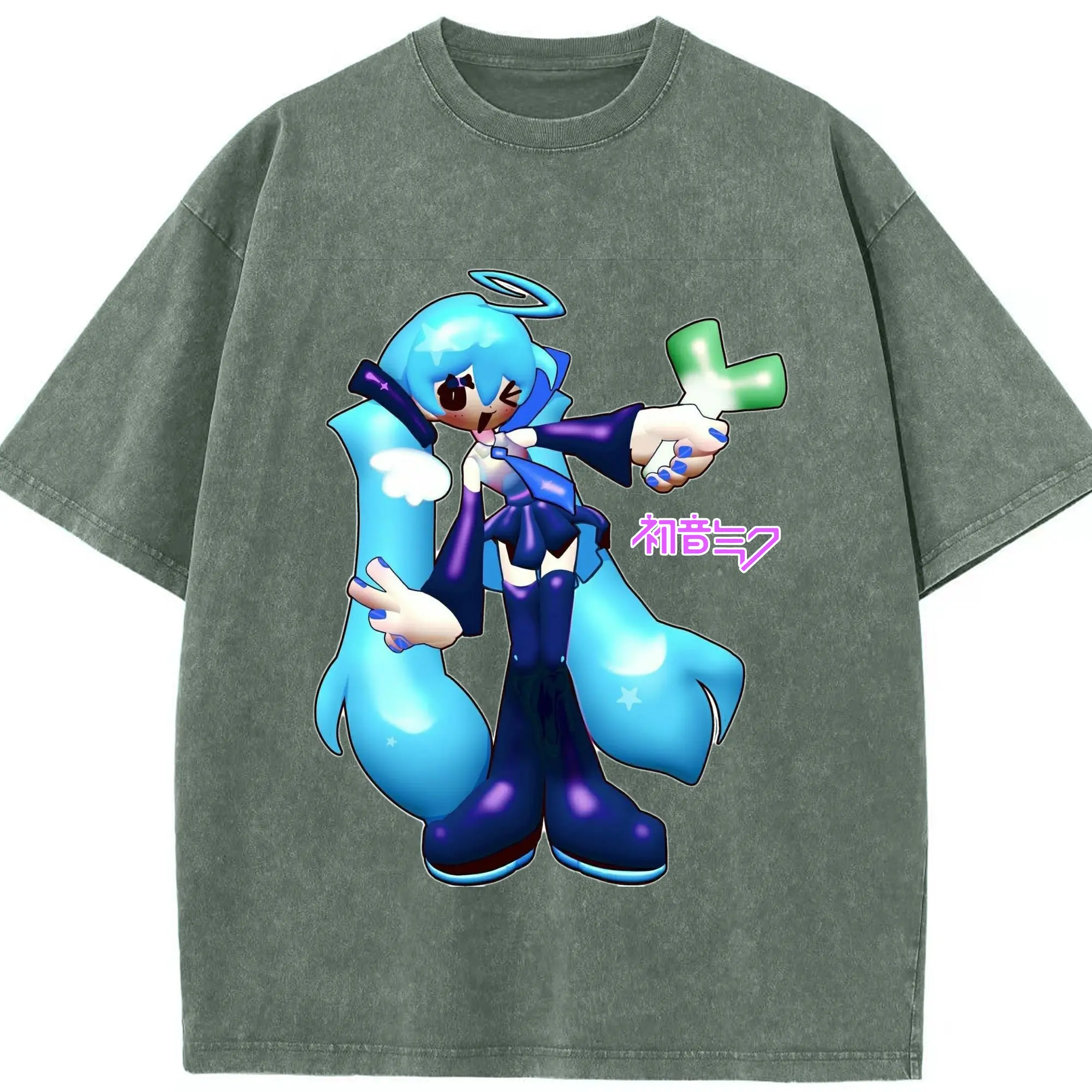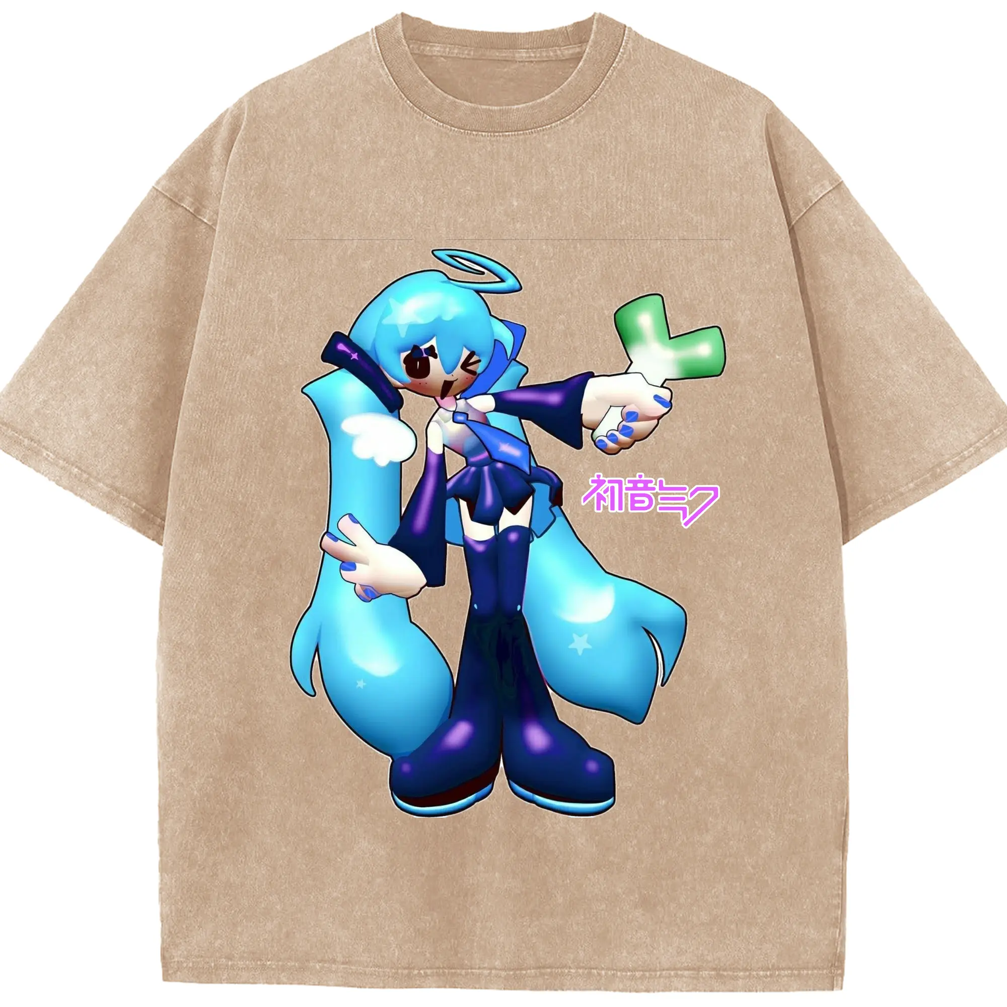初音ミク コラボ アニメ 二次元 - 綿100% ヴィンテージ風 半袖Tシャツ ・ フロントプリント ・ 柔らか肌触り ・ 通気性 快適 ・ スポーツ カジュアル 外出用