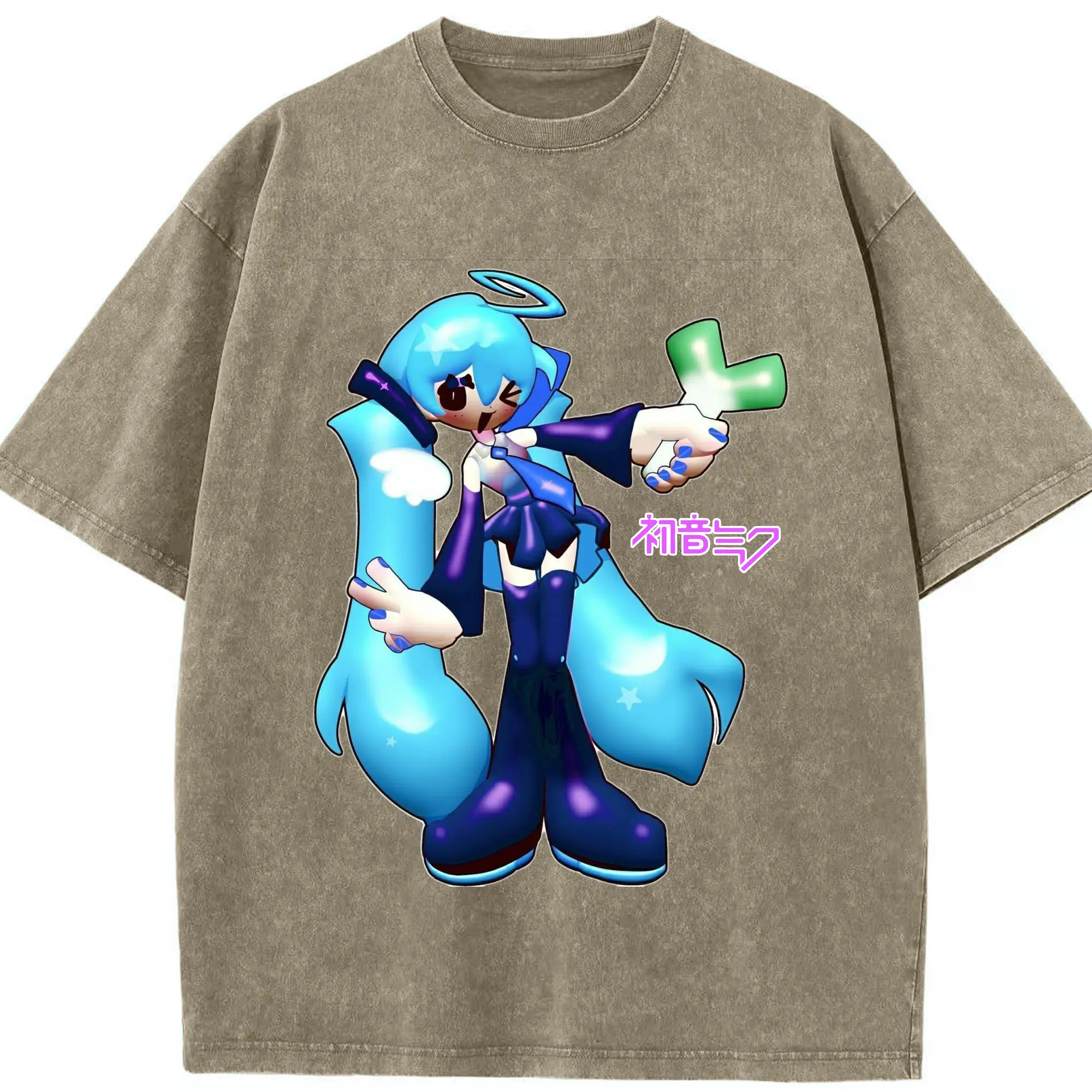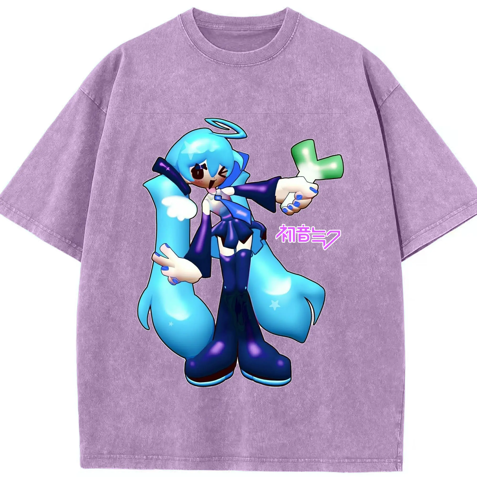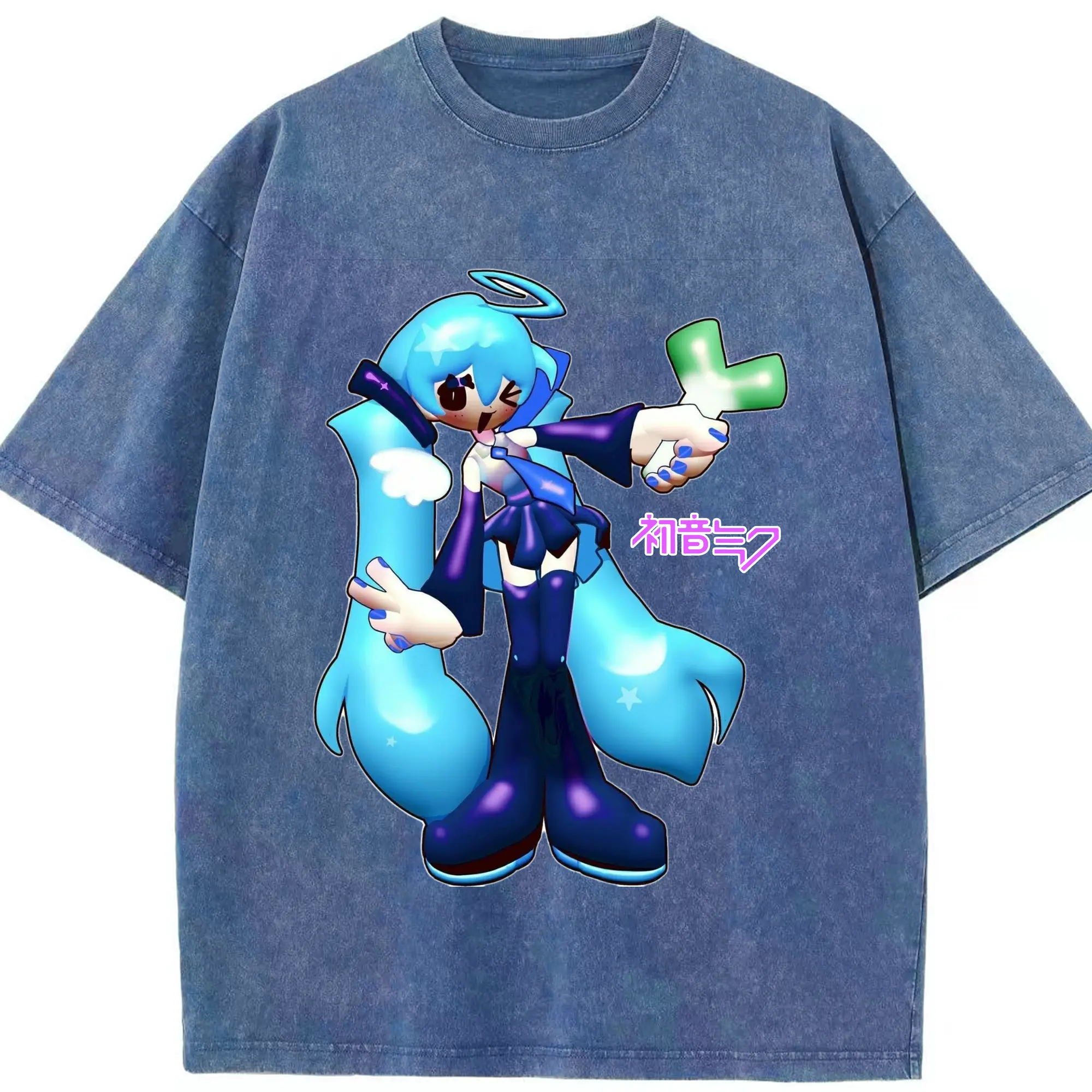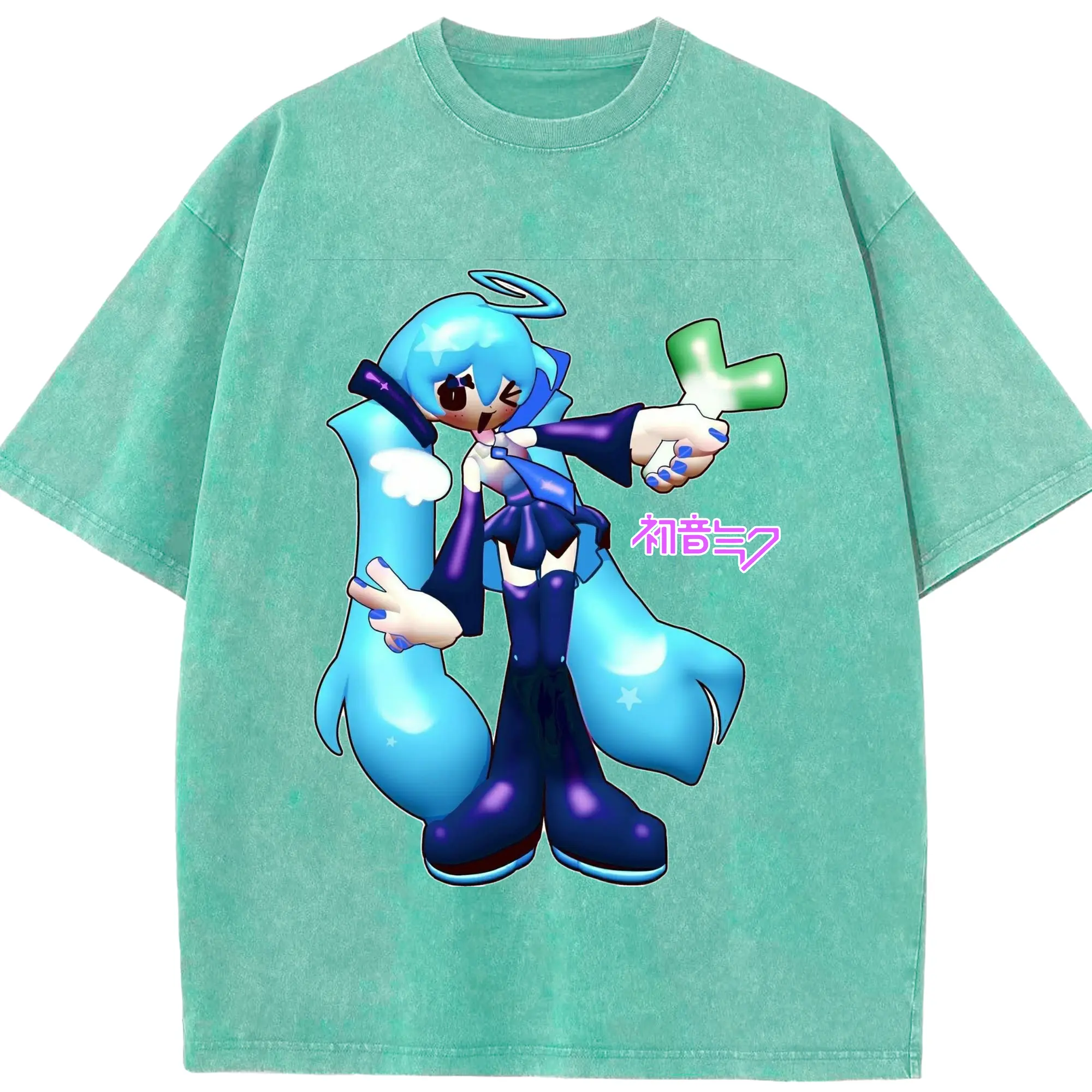 初音ミク コラボ アニメ 二次元 - 綿100% ヴィンテージ風 半袖Tシャツ ・ フロントプリント ・ 柔らか肌触り ・ 通気性 快適 ・ スポーツ カジュアル 外出用