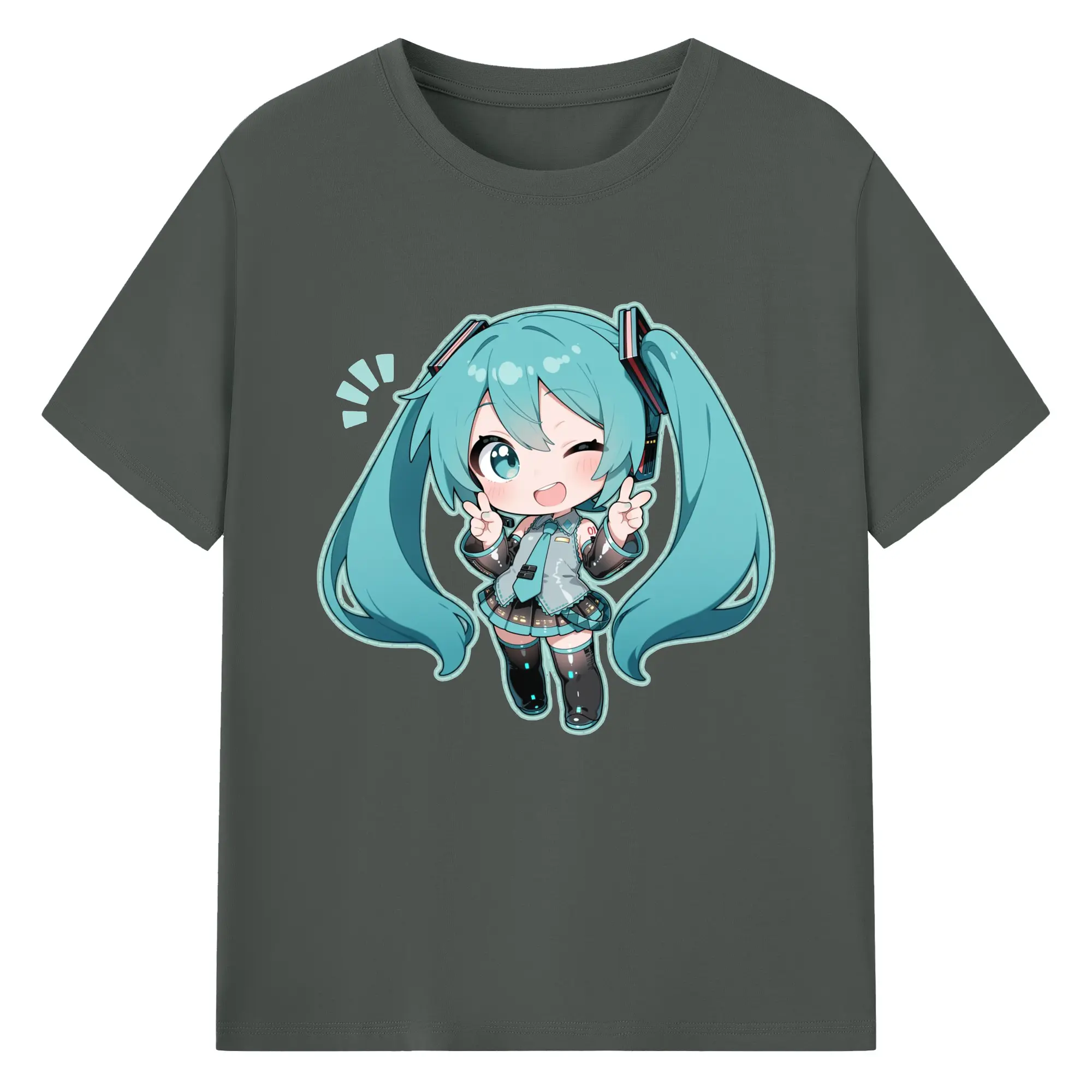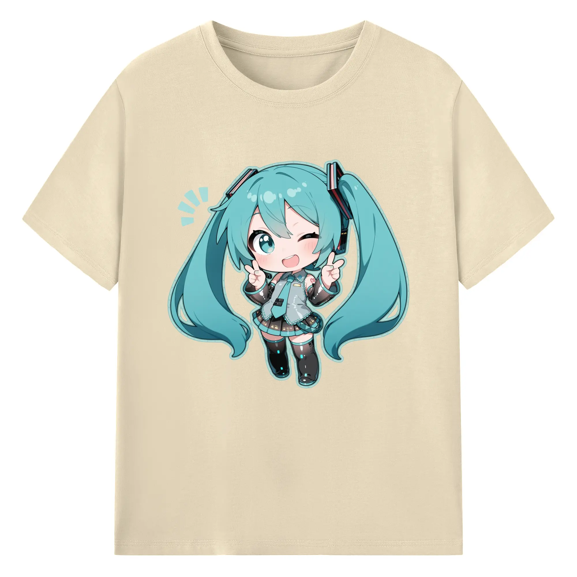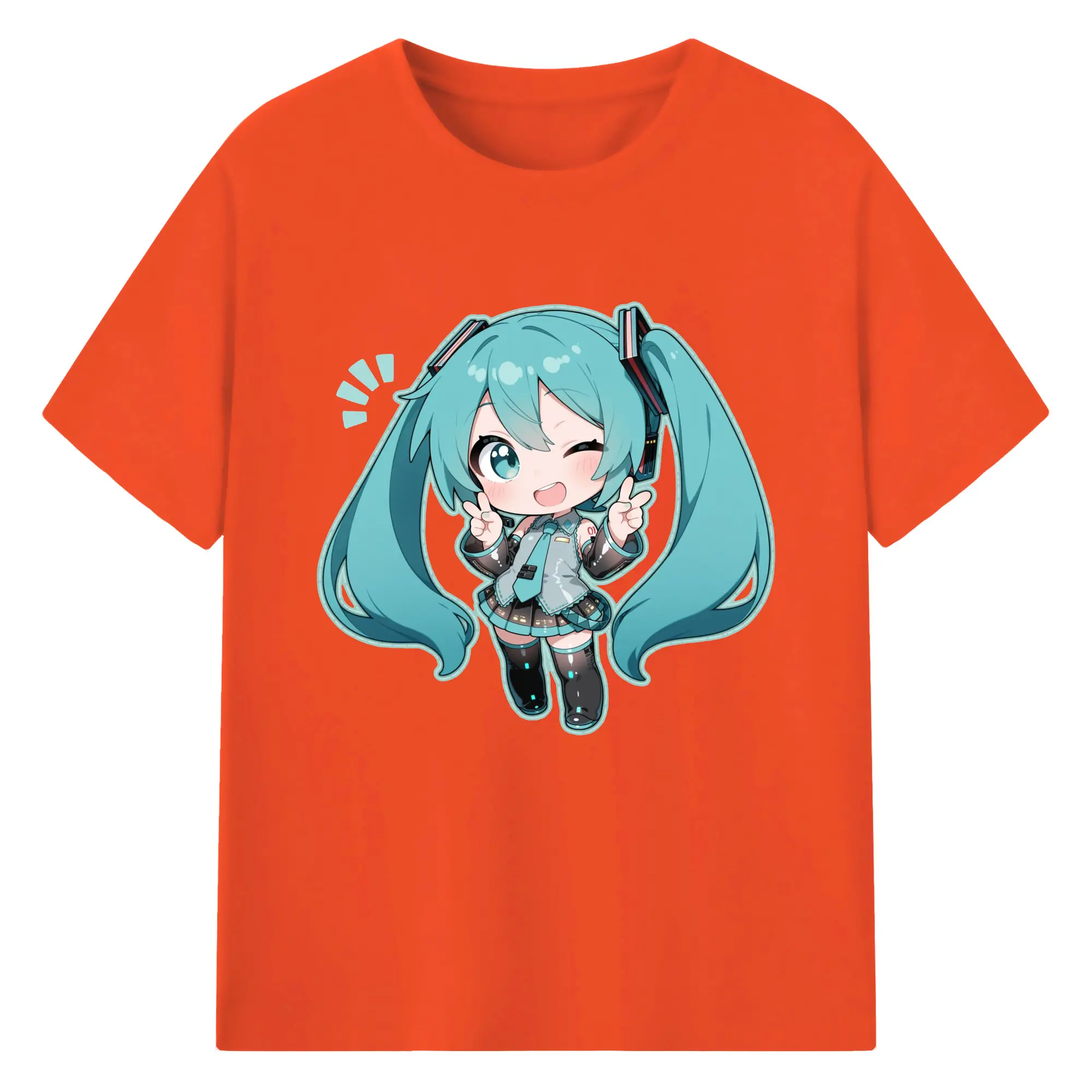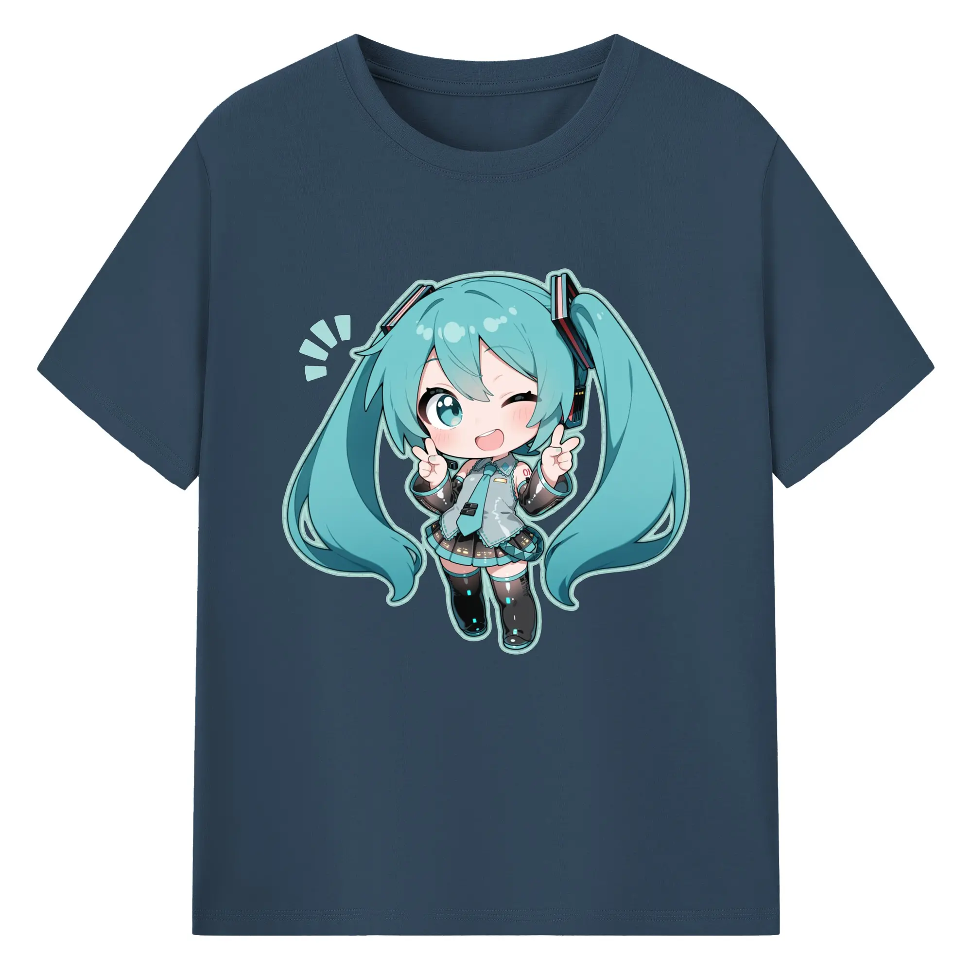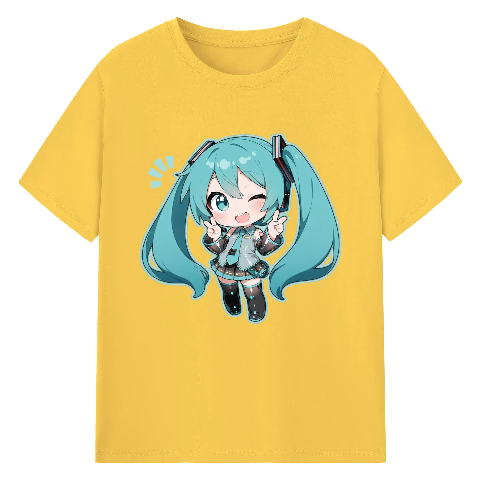 初音ミク アニメ 二次元 かわいい - 綿100% ヴィンテージ風 半袖Tシャツ ・ フロントプリント ・ 柔らか肌触り ・ 通気性 快適 ・ スポーツ カジュアル 外出用