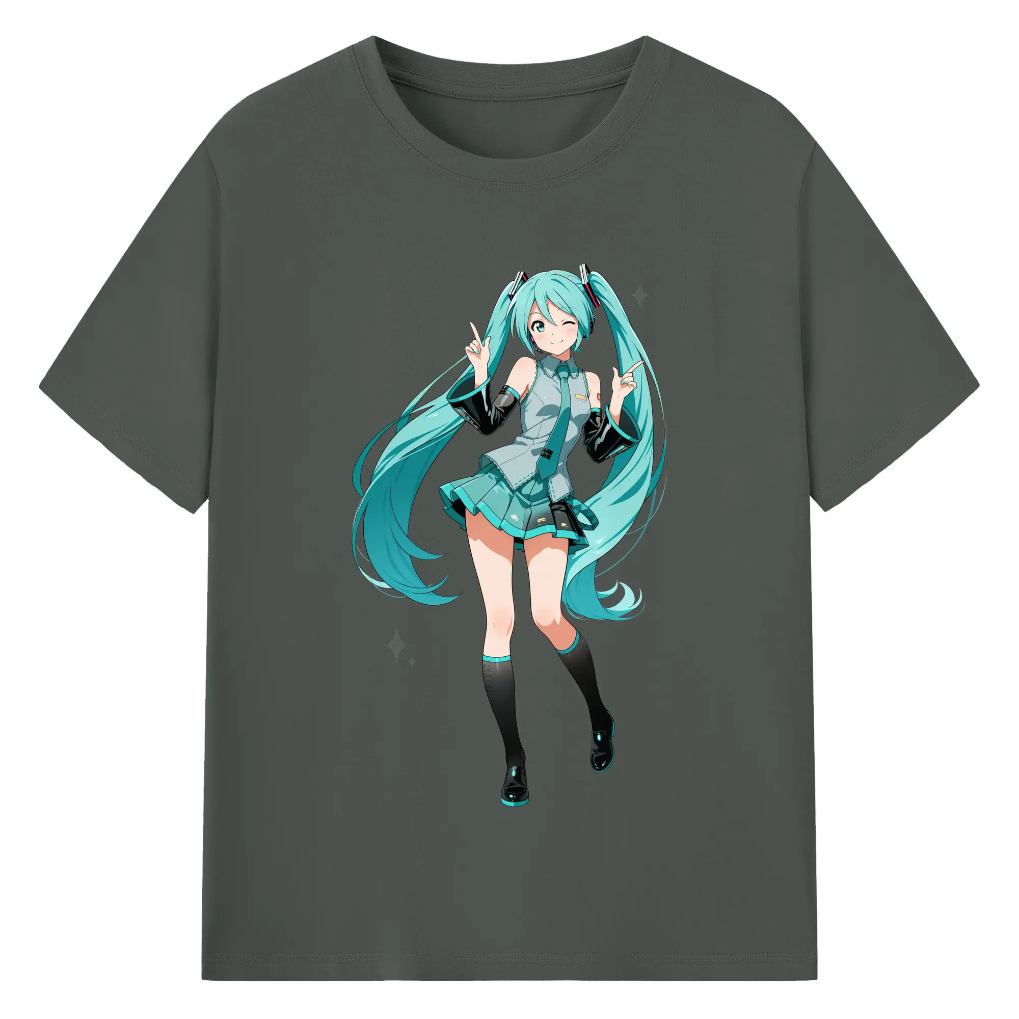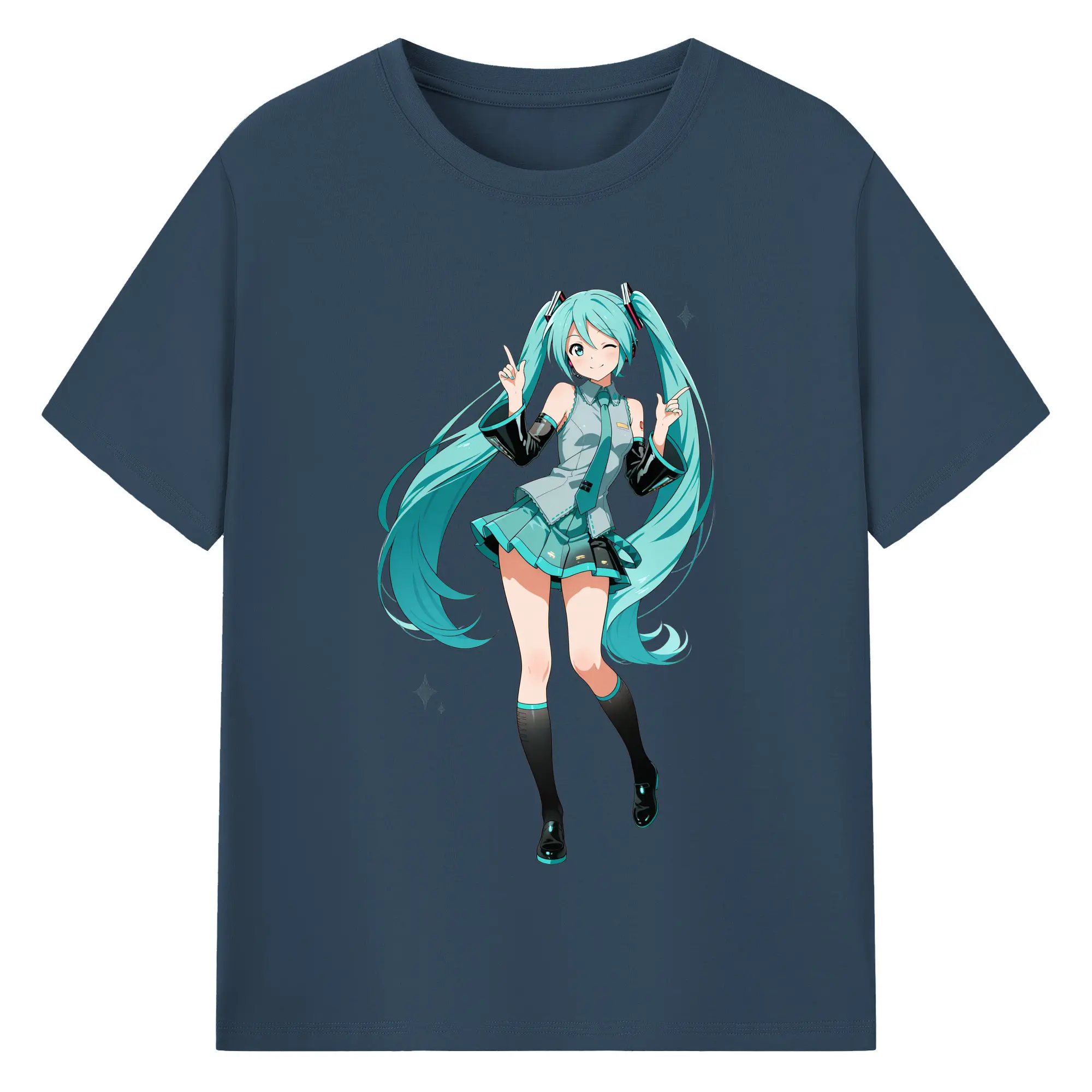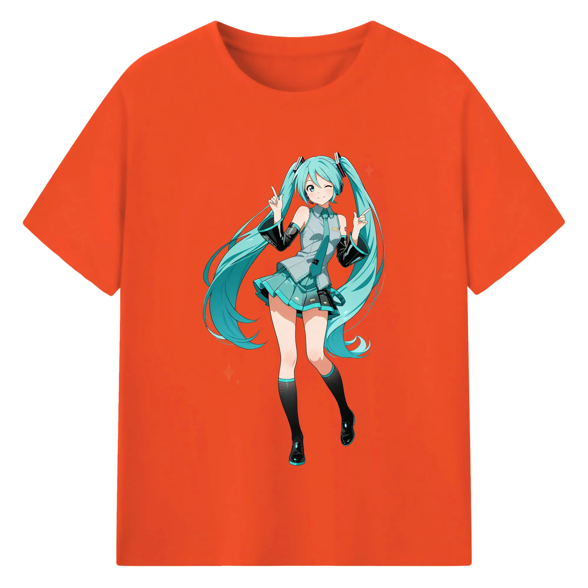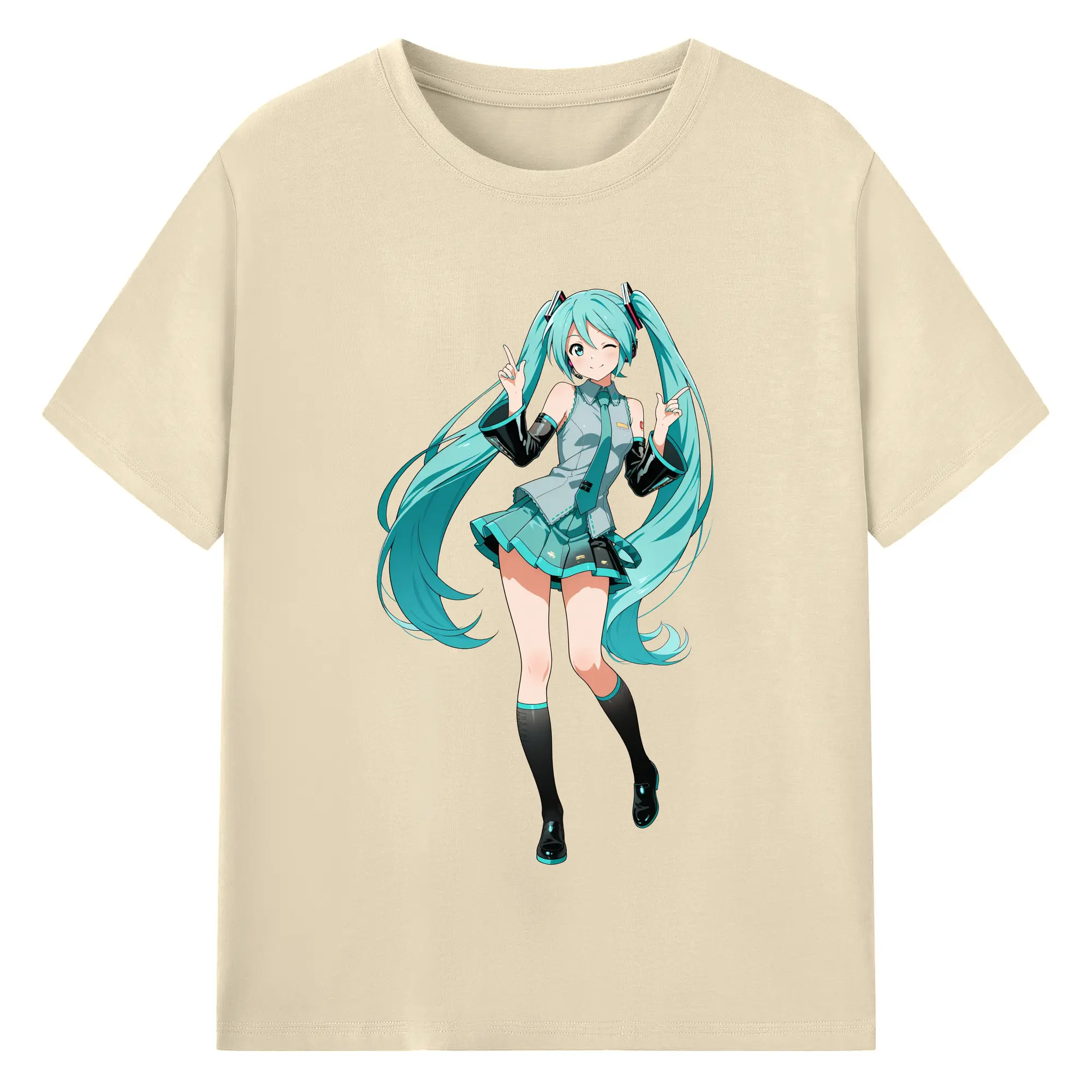 初音ミク バーチャル歌姫 二次元 - 綿100% ヴィンテージ風 半袖Tシャツ ・ フロントプリント ・ 柔らか肌触り ・ 通気性 快適 ・ スポーツ カジュアル 外出用