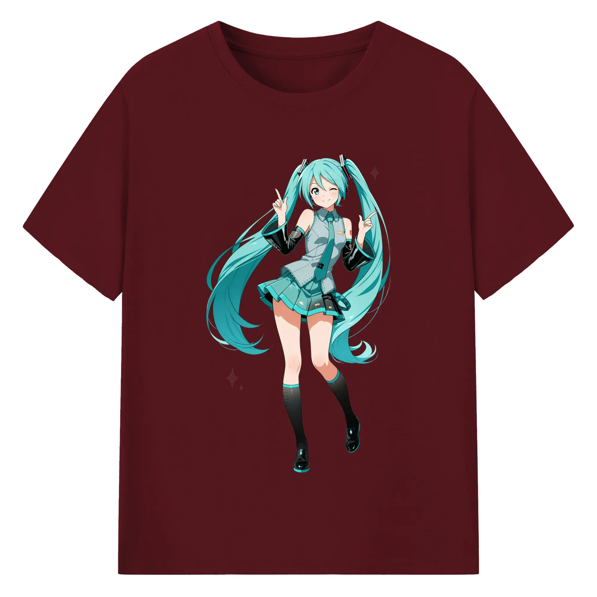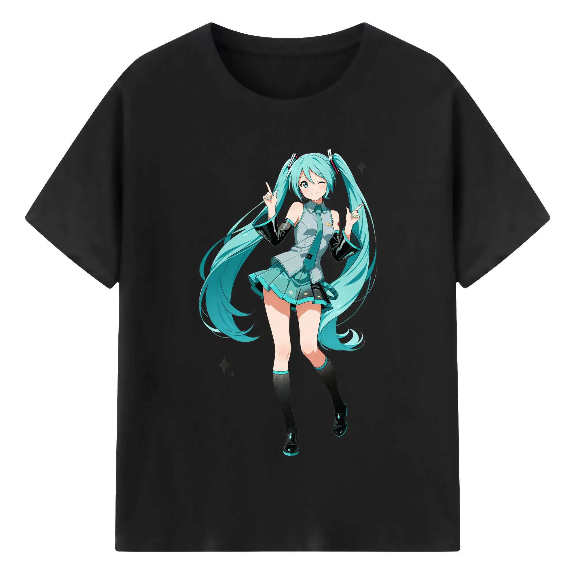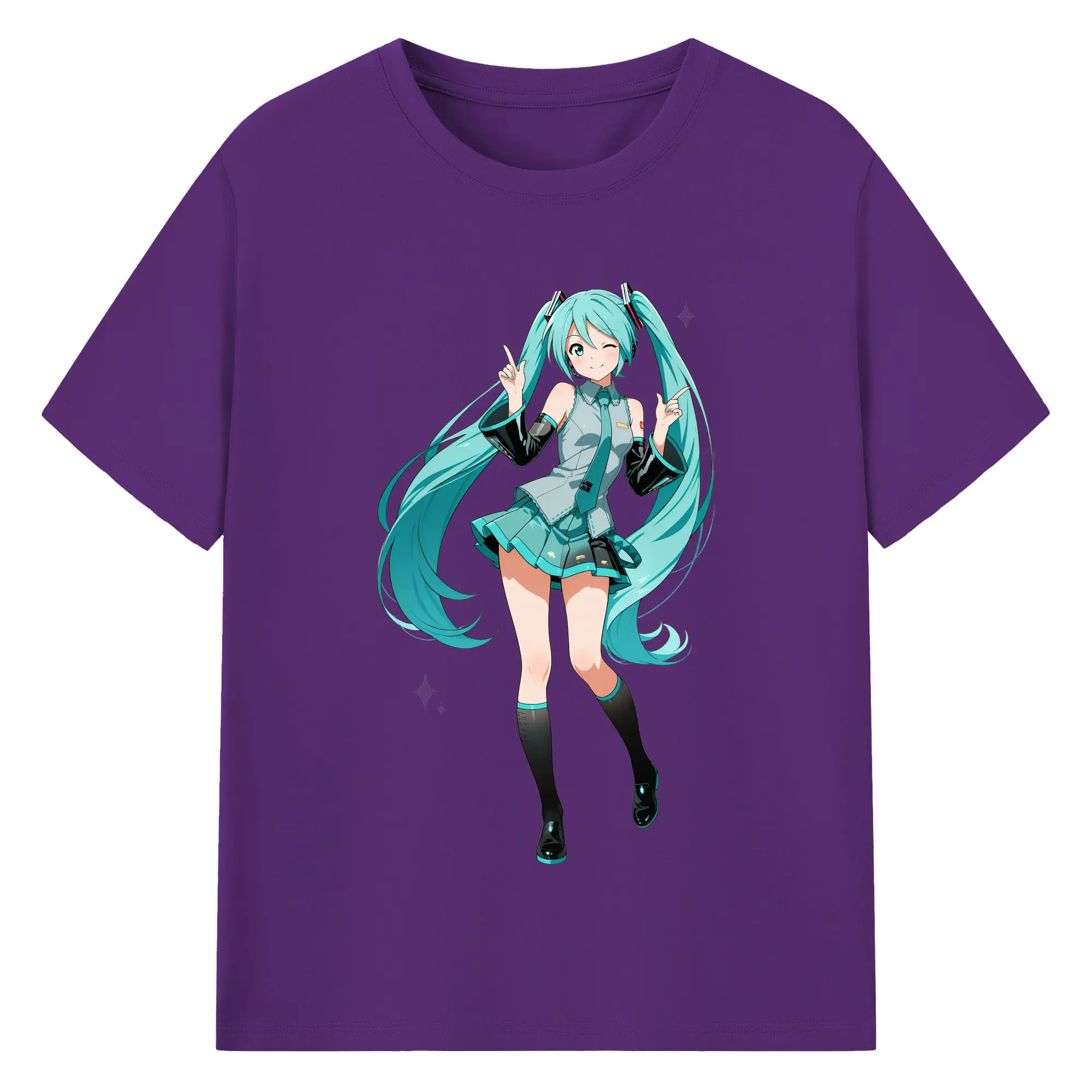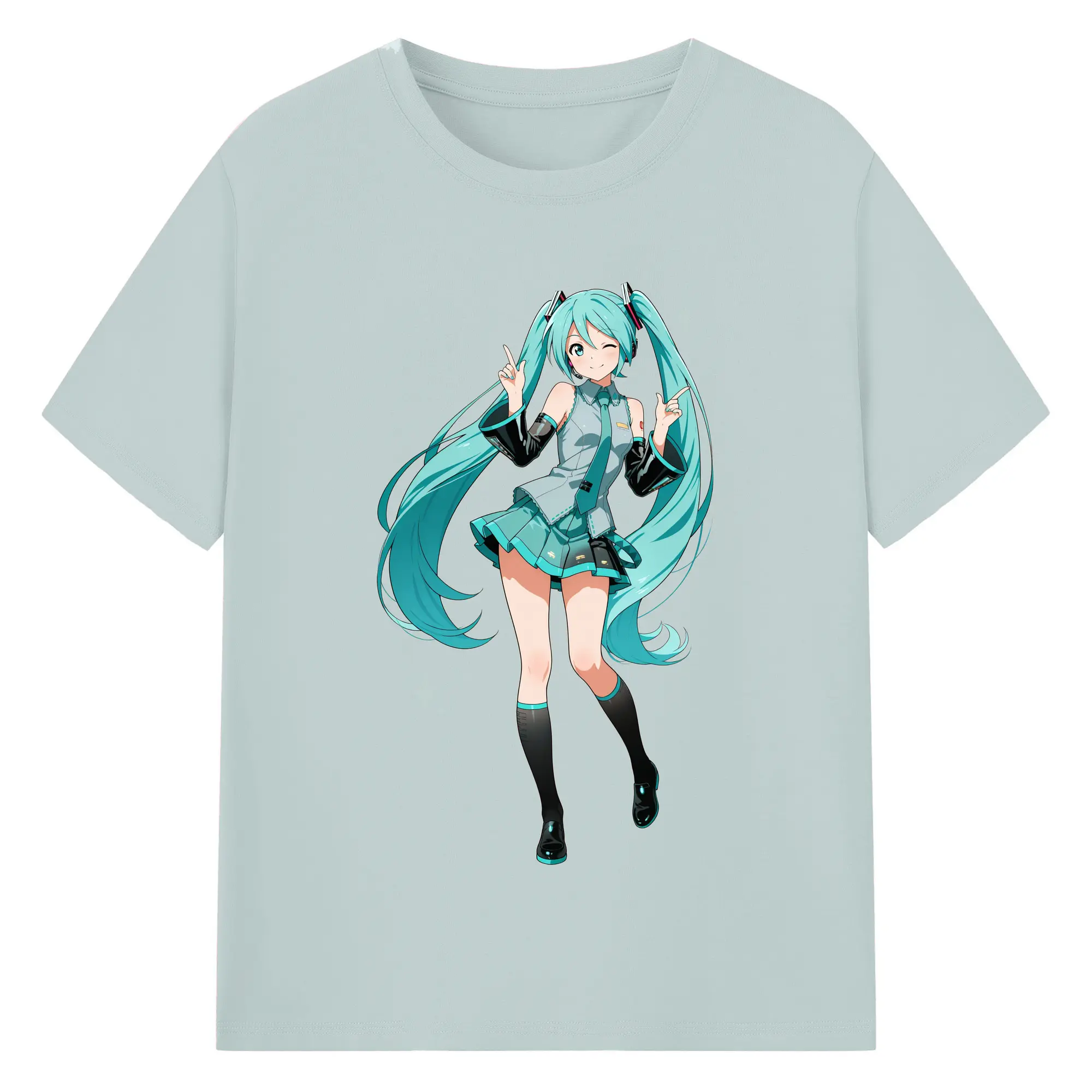 初音ミク バーチャル歌姫 二次元 - 綿100% ヴィンテージ風 半袖Tシャツ ・ フロントプリント ・ 柔らか肌触り ・ 通気性 快適 ・ スポーツ カジュアル 外出用