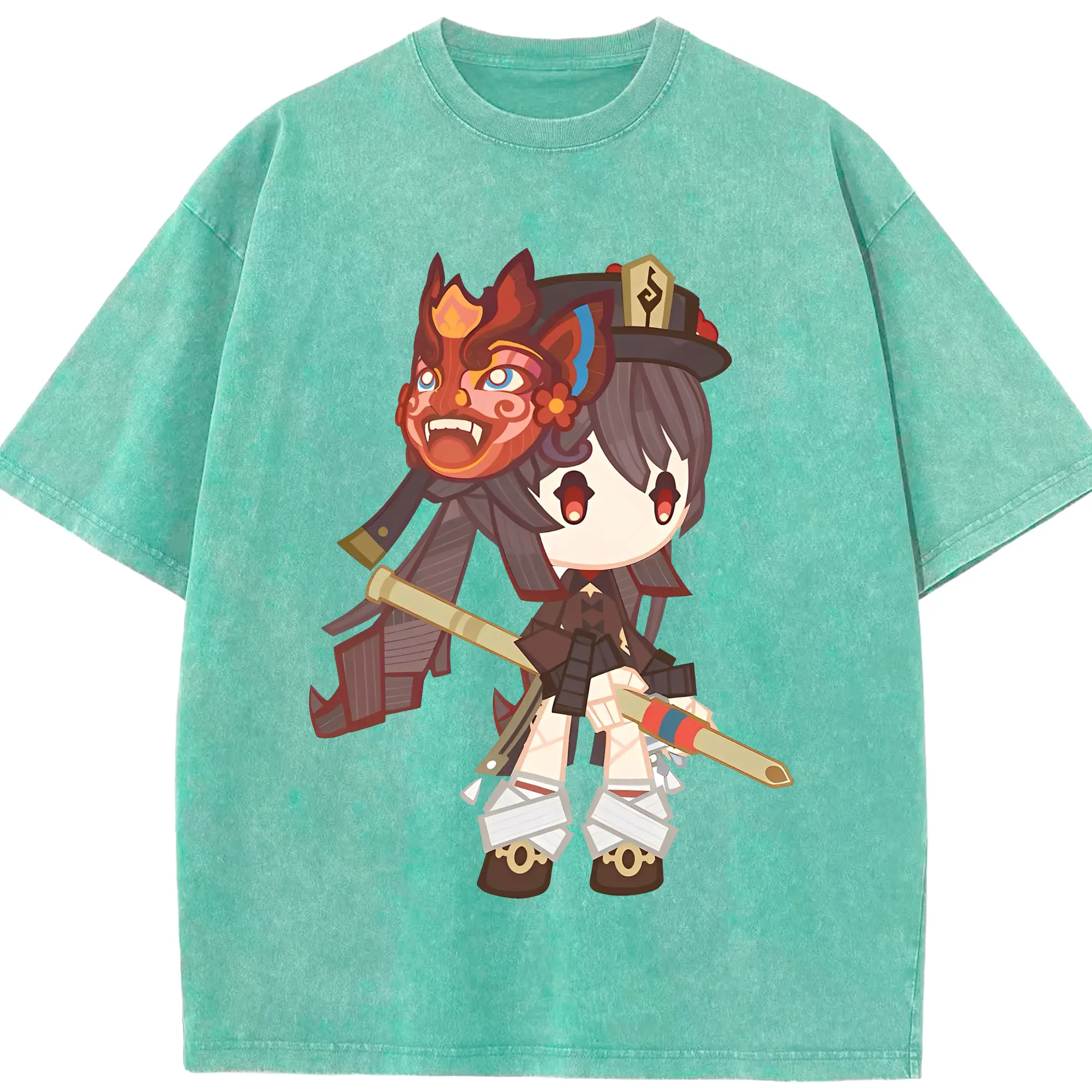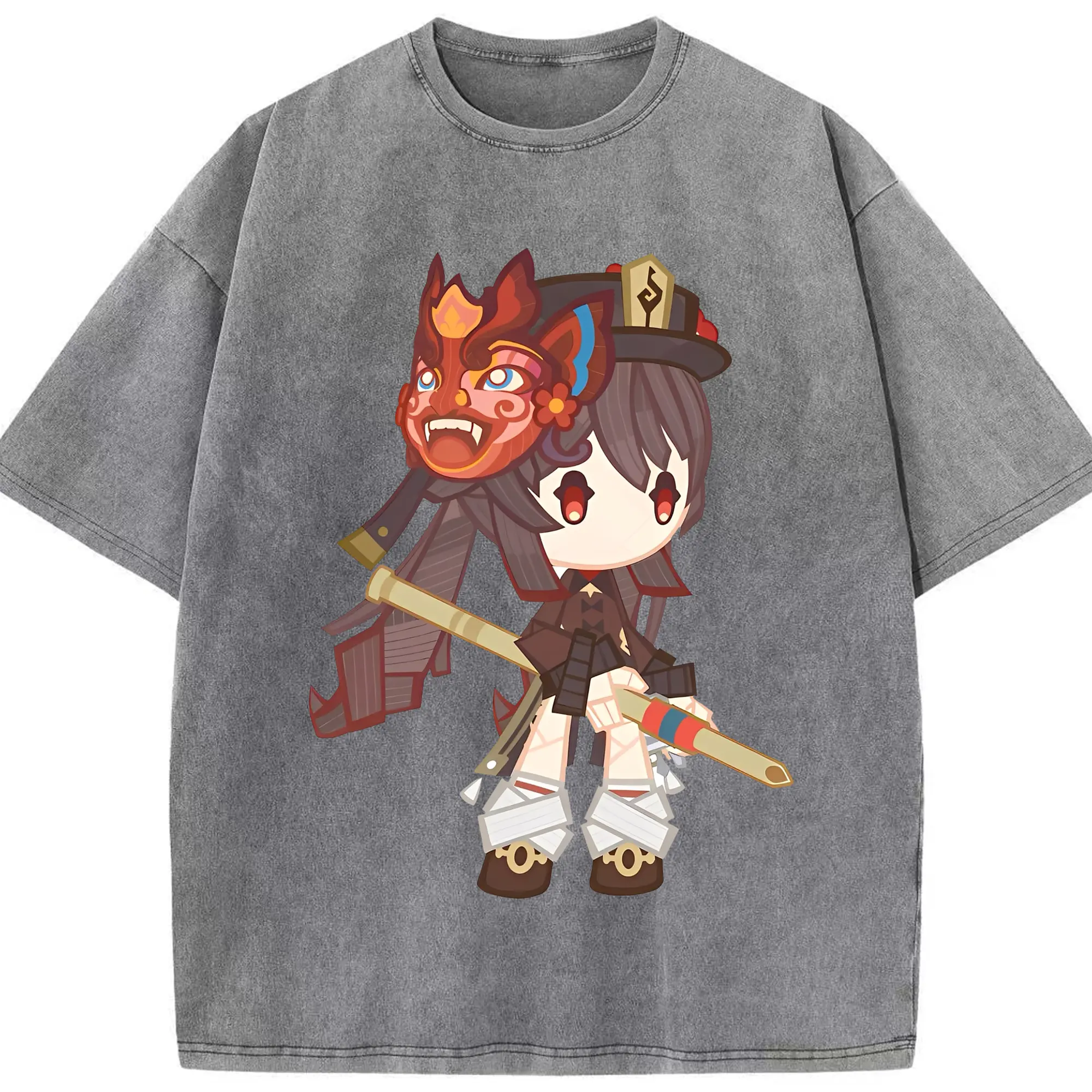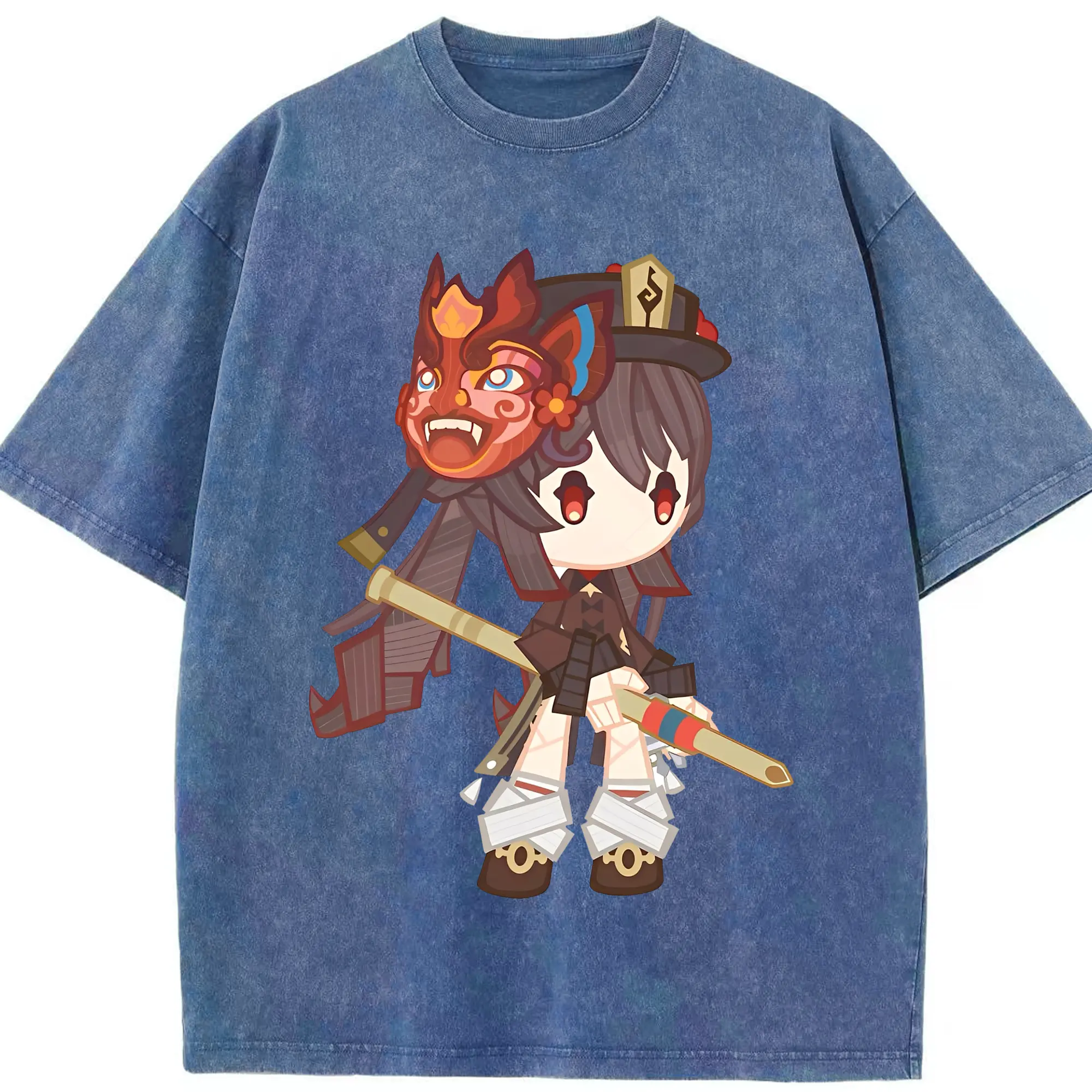 Genshin Impact 放浪者 Q版キャラクター 可愛いファングッズ - 綿100% ヴィンテージ風 半袖Tシャツ ・ フロントプリント ・ 柔らか肌触り ・ 通気性 快適 ・ スポーツ カジュアル 外出用