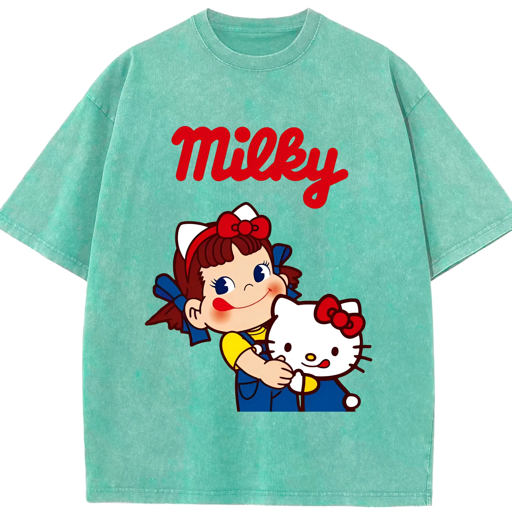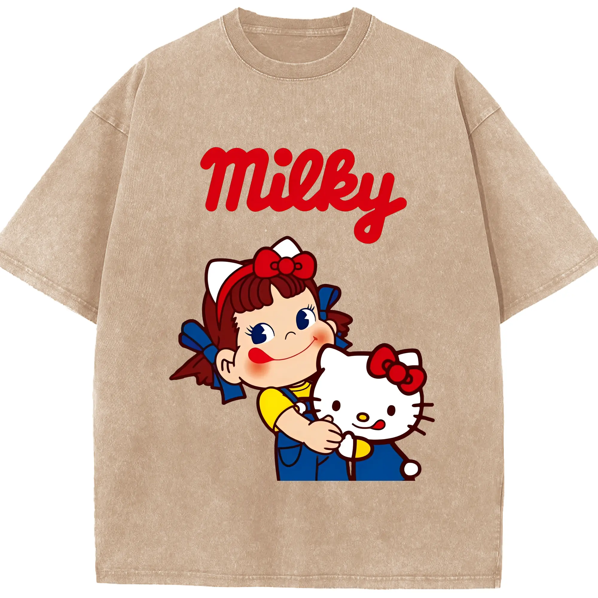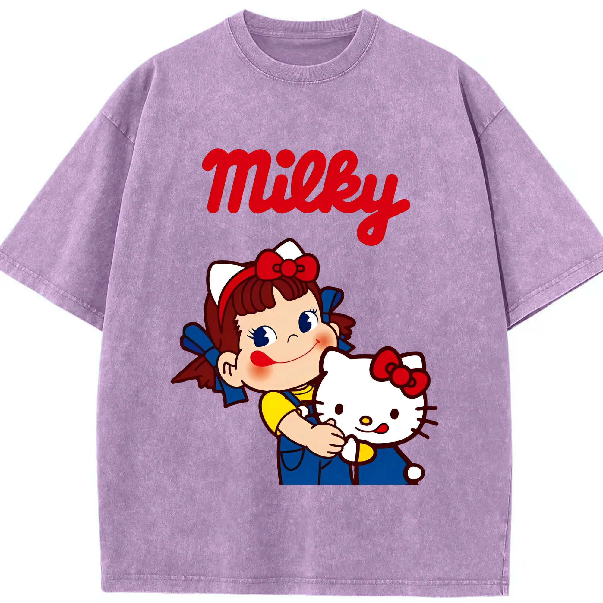 夢のコラボ!ペコちゃんとハローキティ - 綿100% 半袖Tシャツ ・ フロントプリント ・ 快適 通気性 ・ 日常使い 散歩 スポーツ用