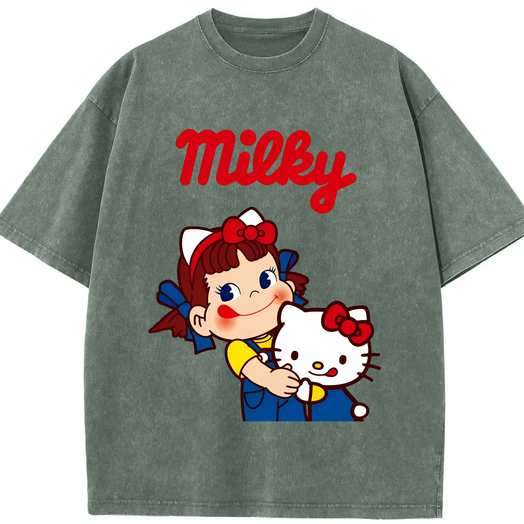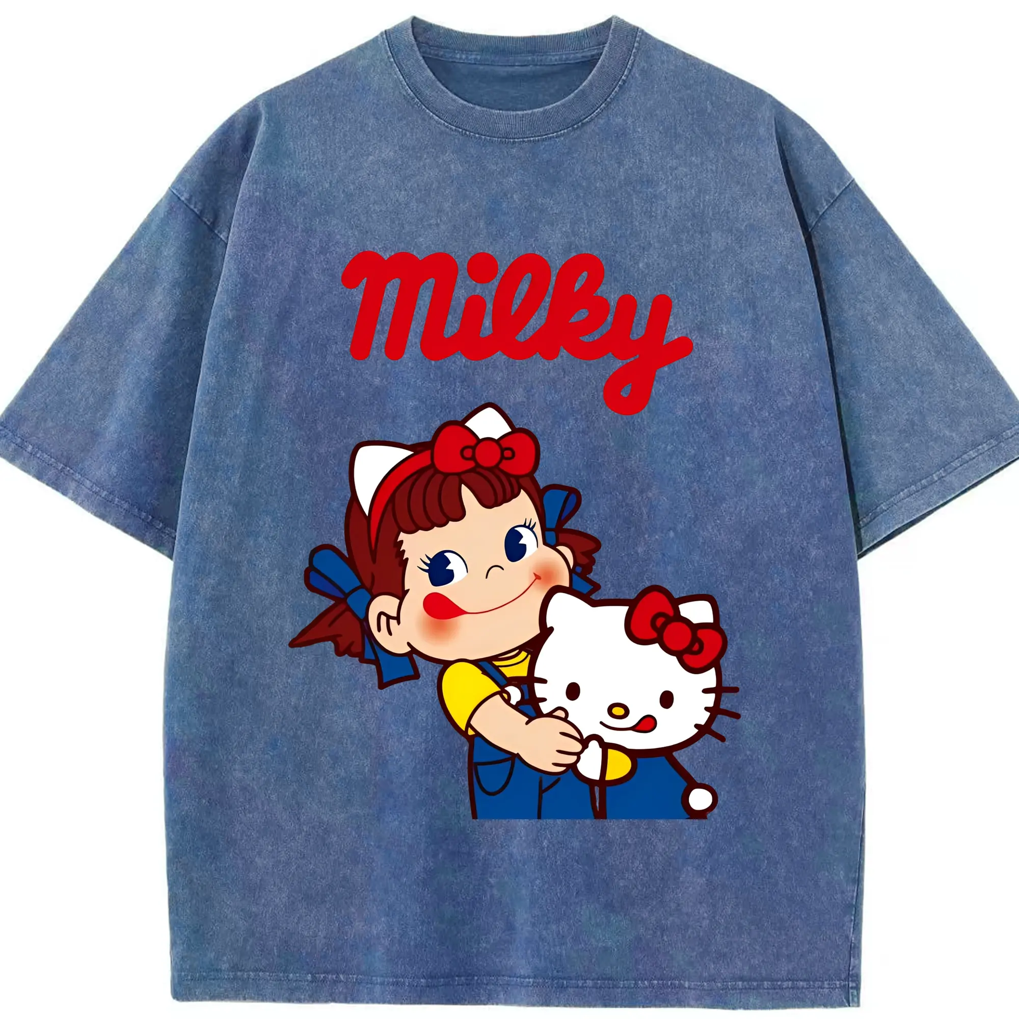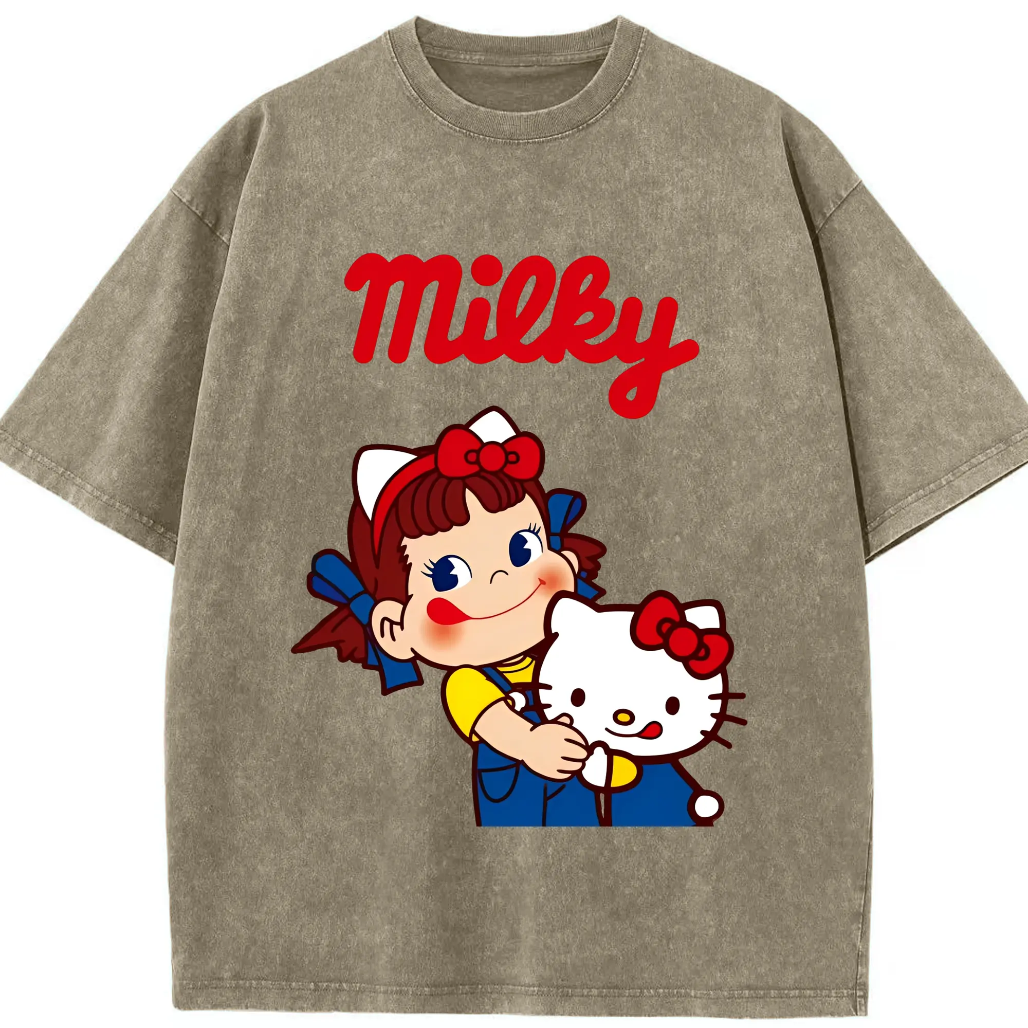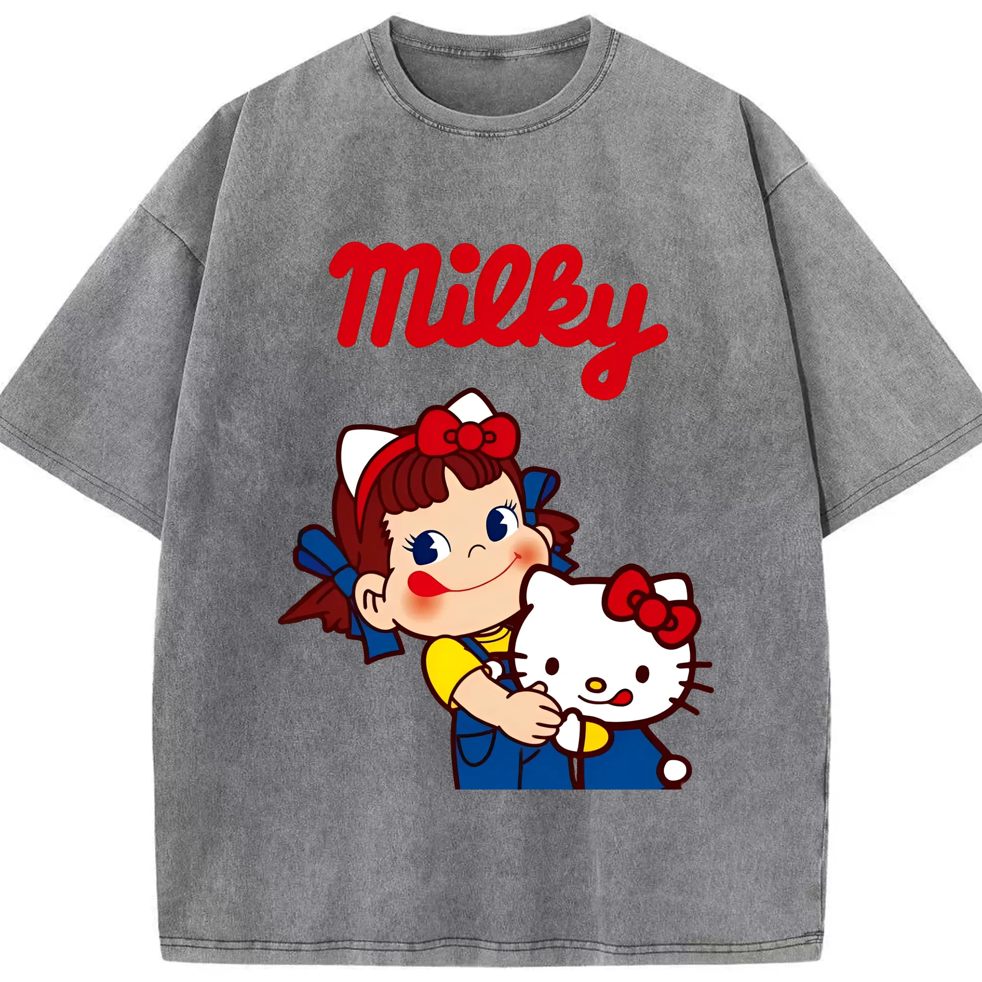 夢のコラボ!ペコちゃんとハローキティ - 綿100% 半袖Tシャツ ・ フロントプリント ・ 快適 通気性 ・ 日常使い 散歩 スポーツ用