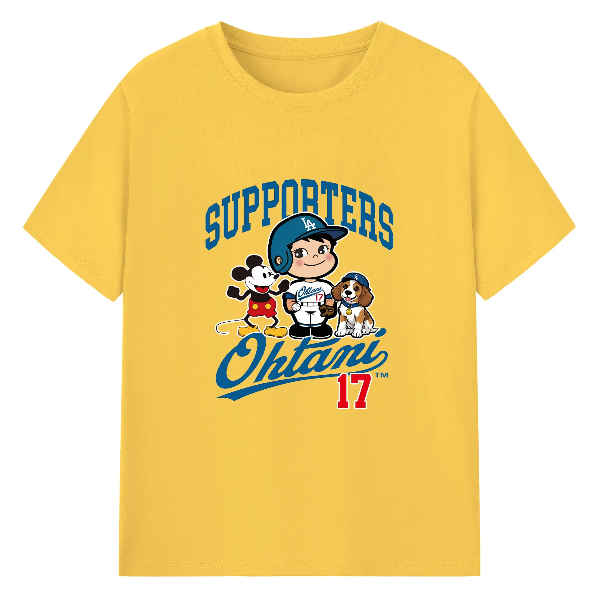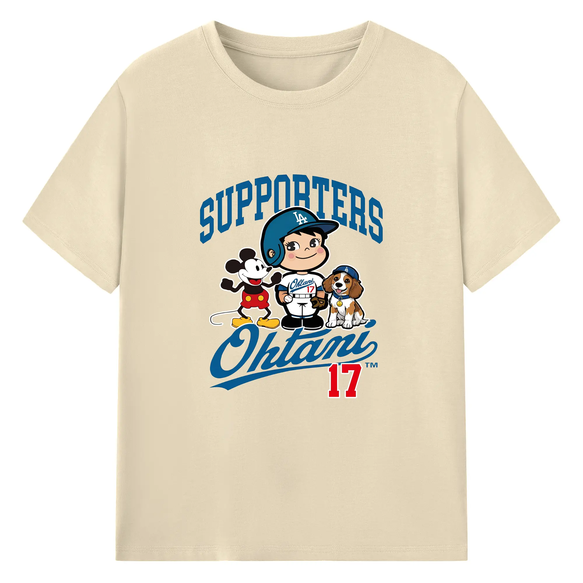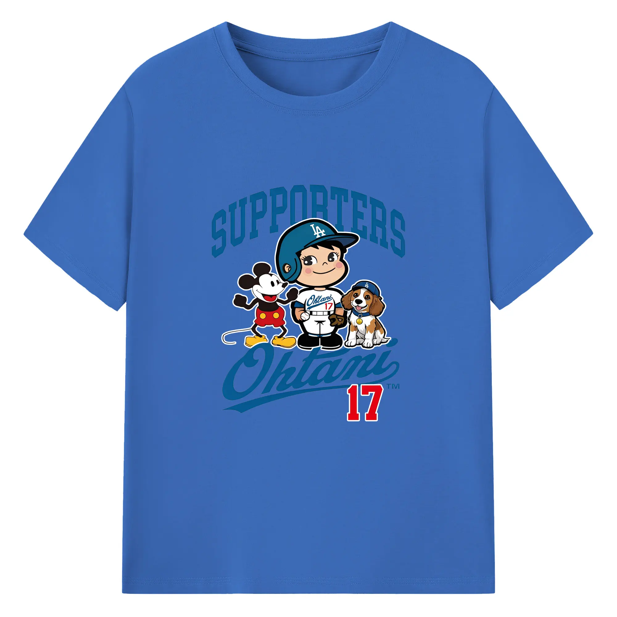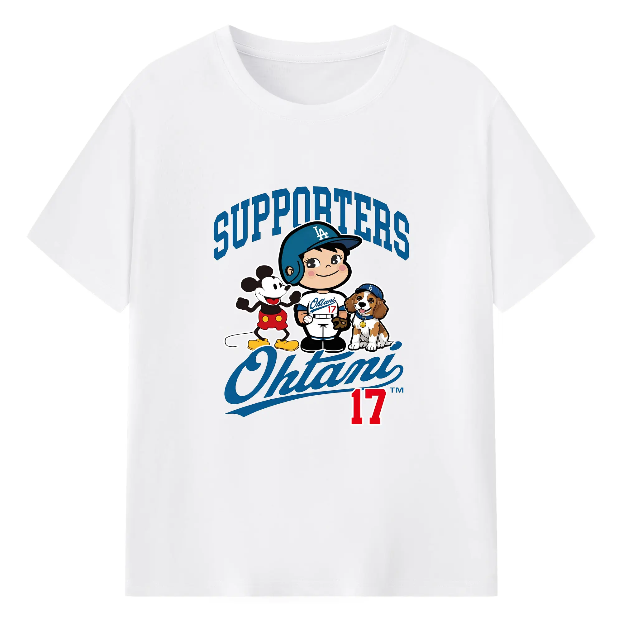 大谷翔平&愛犬×ペコちゃん×ミッキーマウス ドジャース限定キュートグッズ - 綿100% ヴィンテージ風 半袖Tシャツ ・ フロントプリント ・ 柔らか肌触り ・ 通気性 快適 ・ スポーツ カジュアル 外出用