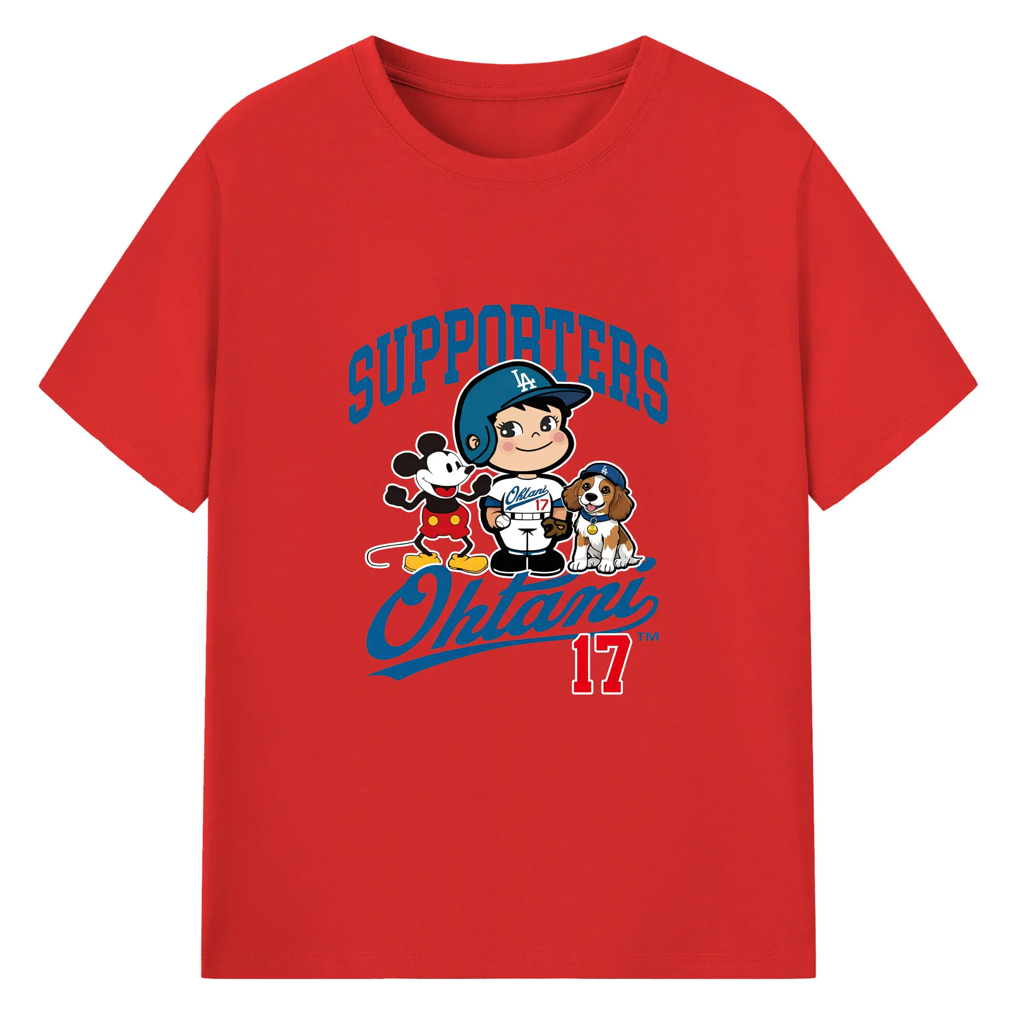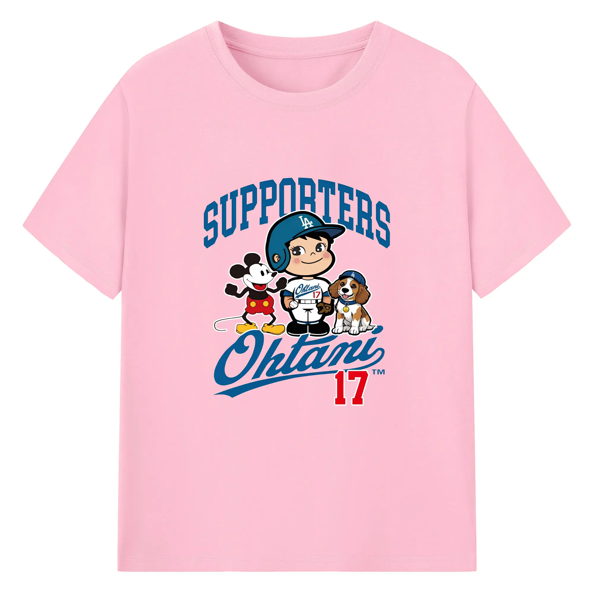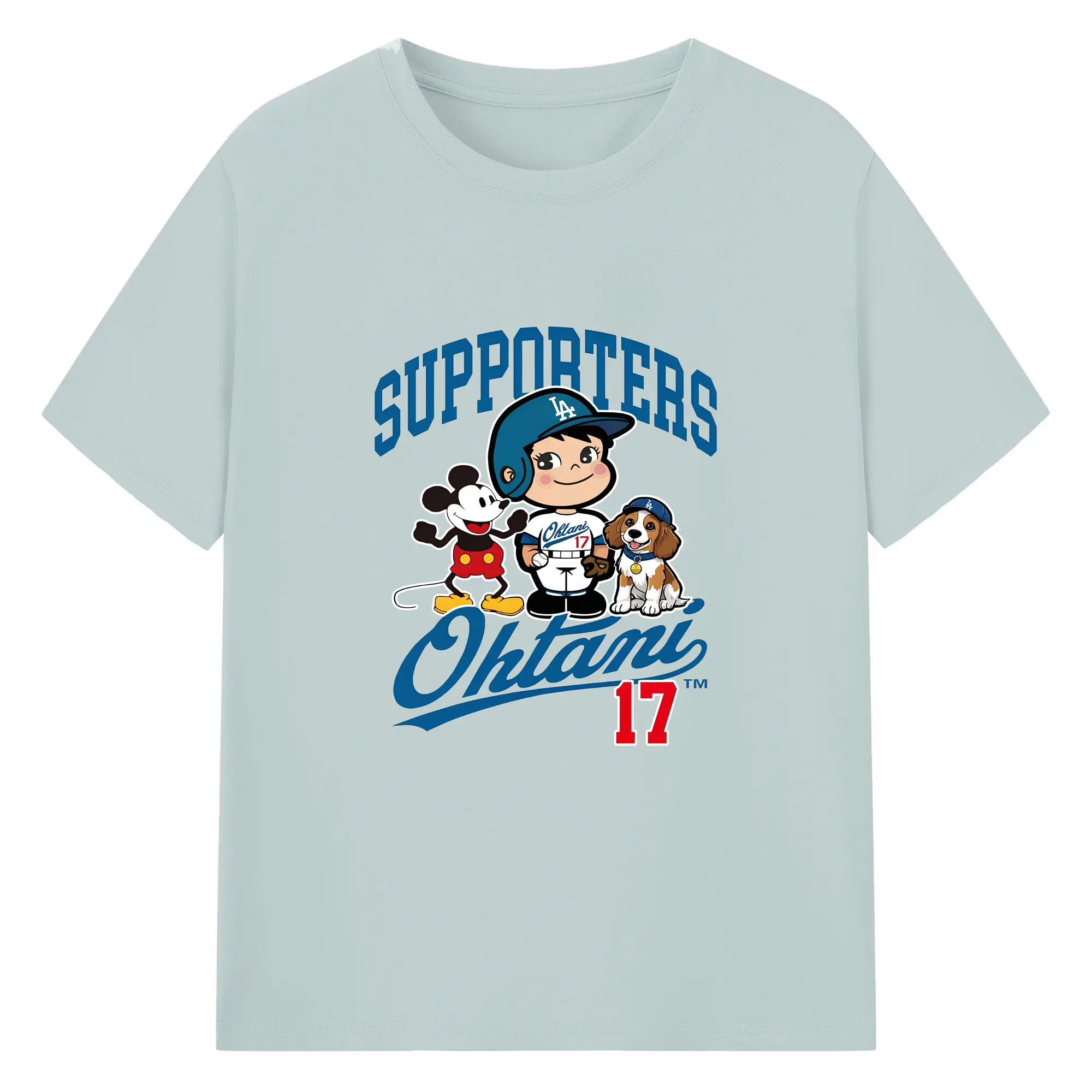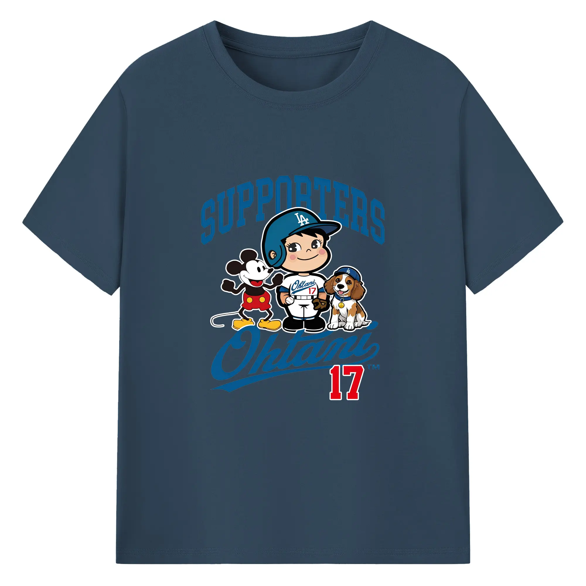 大谷翔平&愛犬×ペコちゃん×ミッキーマウス ドジャース限定キュートグッズ - 綿100% ヴィンテージ風 半袖Tシャツ ・ フロントプリント ・ 柔らか肌触り ・ 通気性 快適 ・ スポーツ カジュアル 外出用