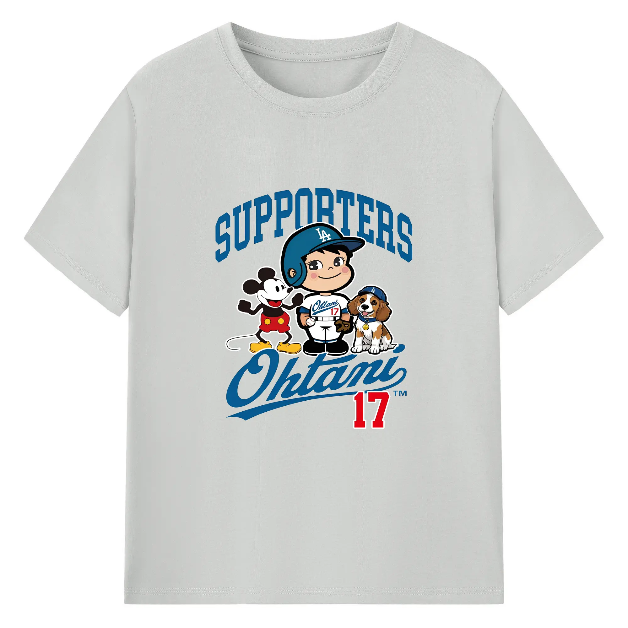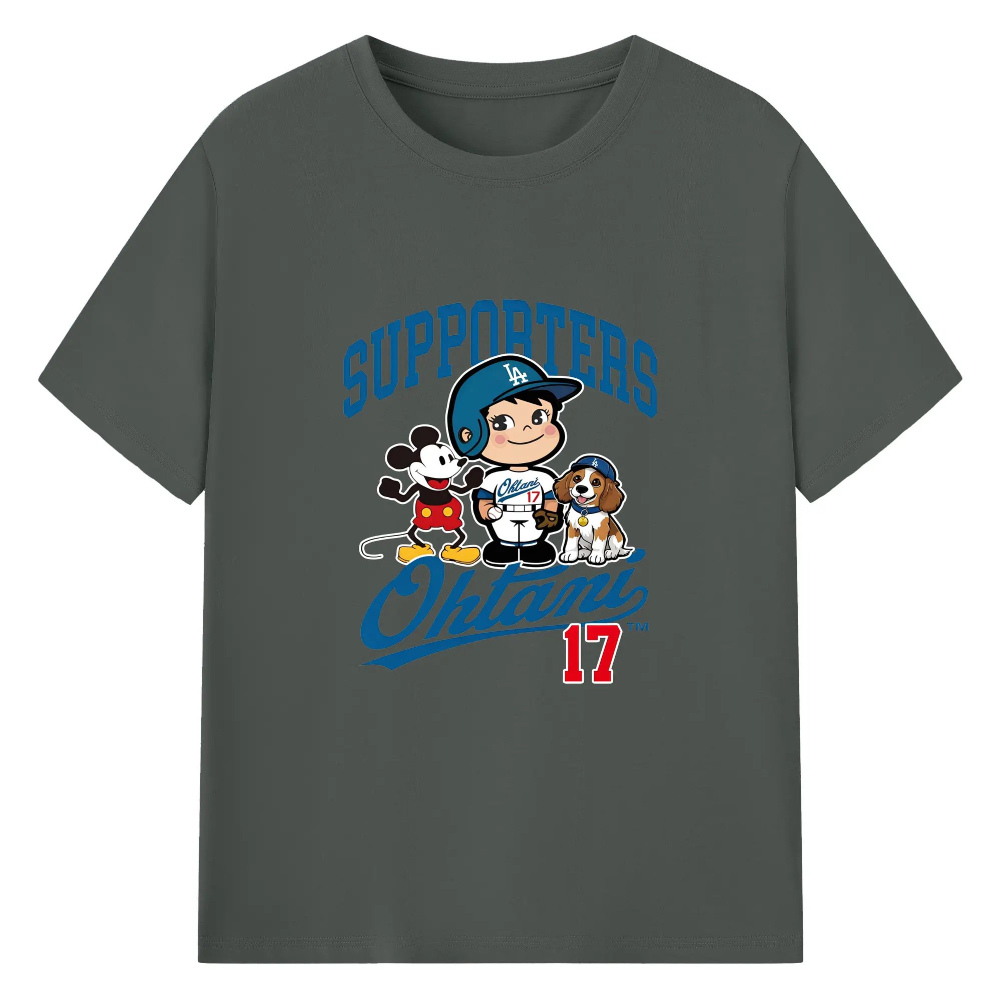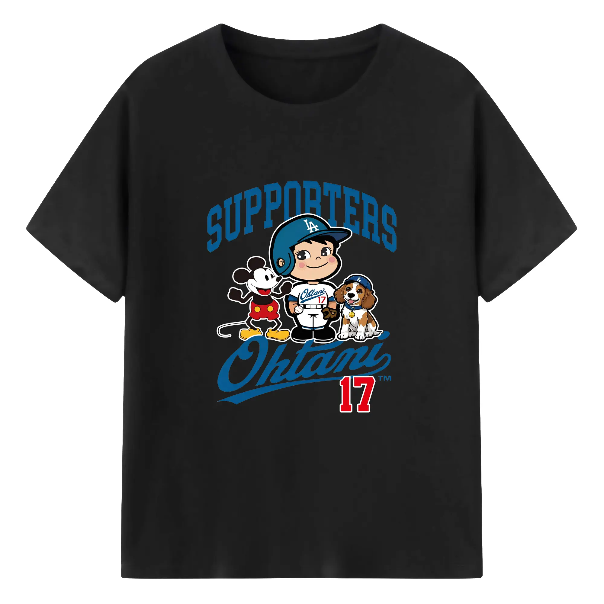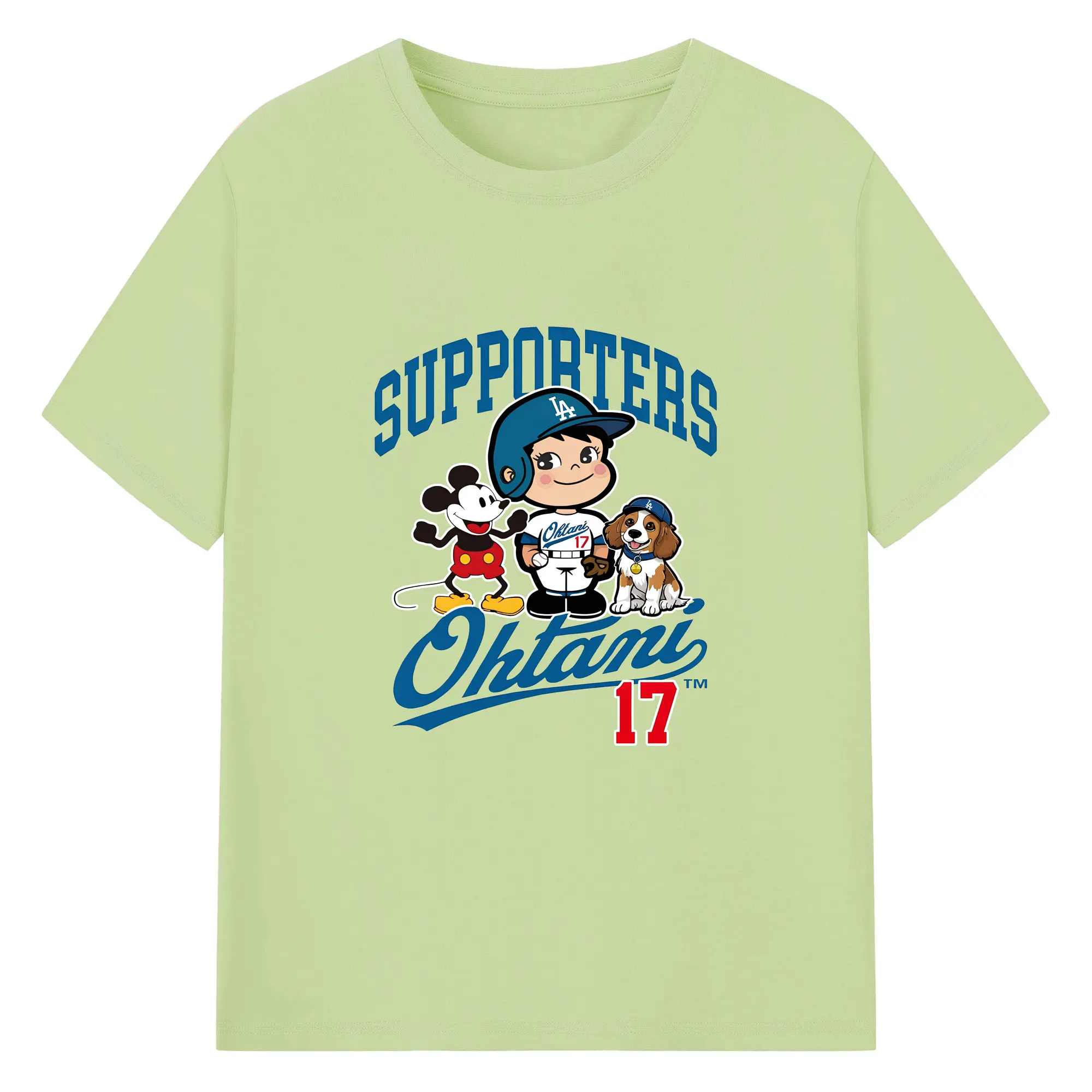 大谷翔平&愛犬×ペコちゃん×ミッキーマウス ドジャース限定キュートグッズ - 綿100% ヴィンテージ風 半袖Tシャツ ・ フロントプリント ・ 柔らか肌触り ・ 通気性 快適 ・ スポーツ カジュアル 外出用