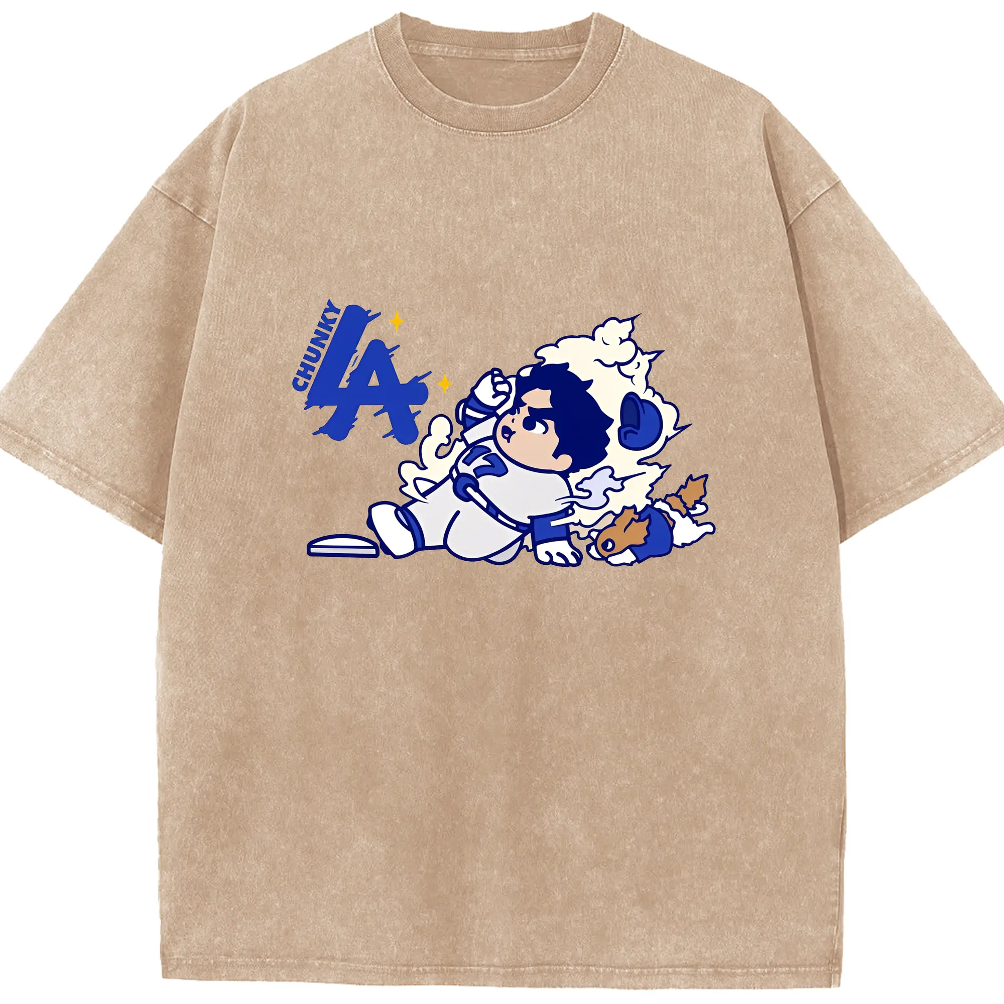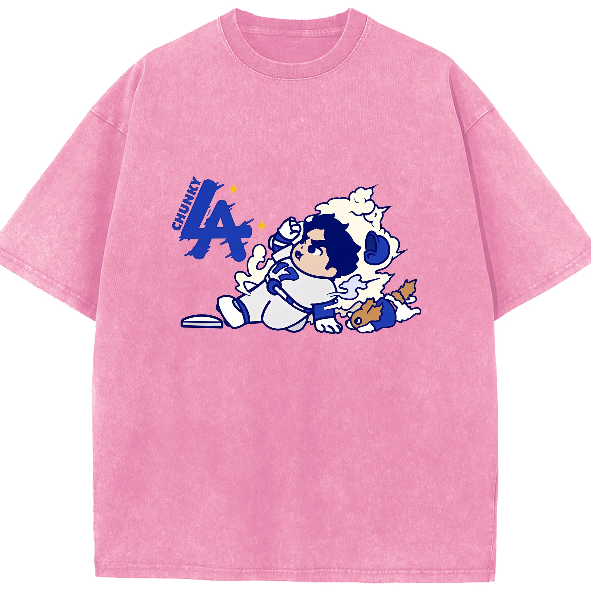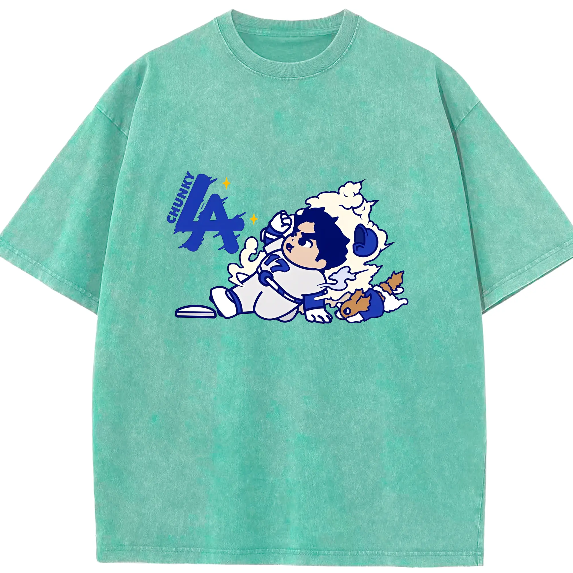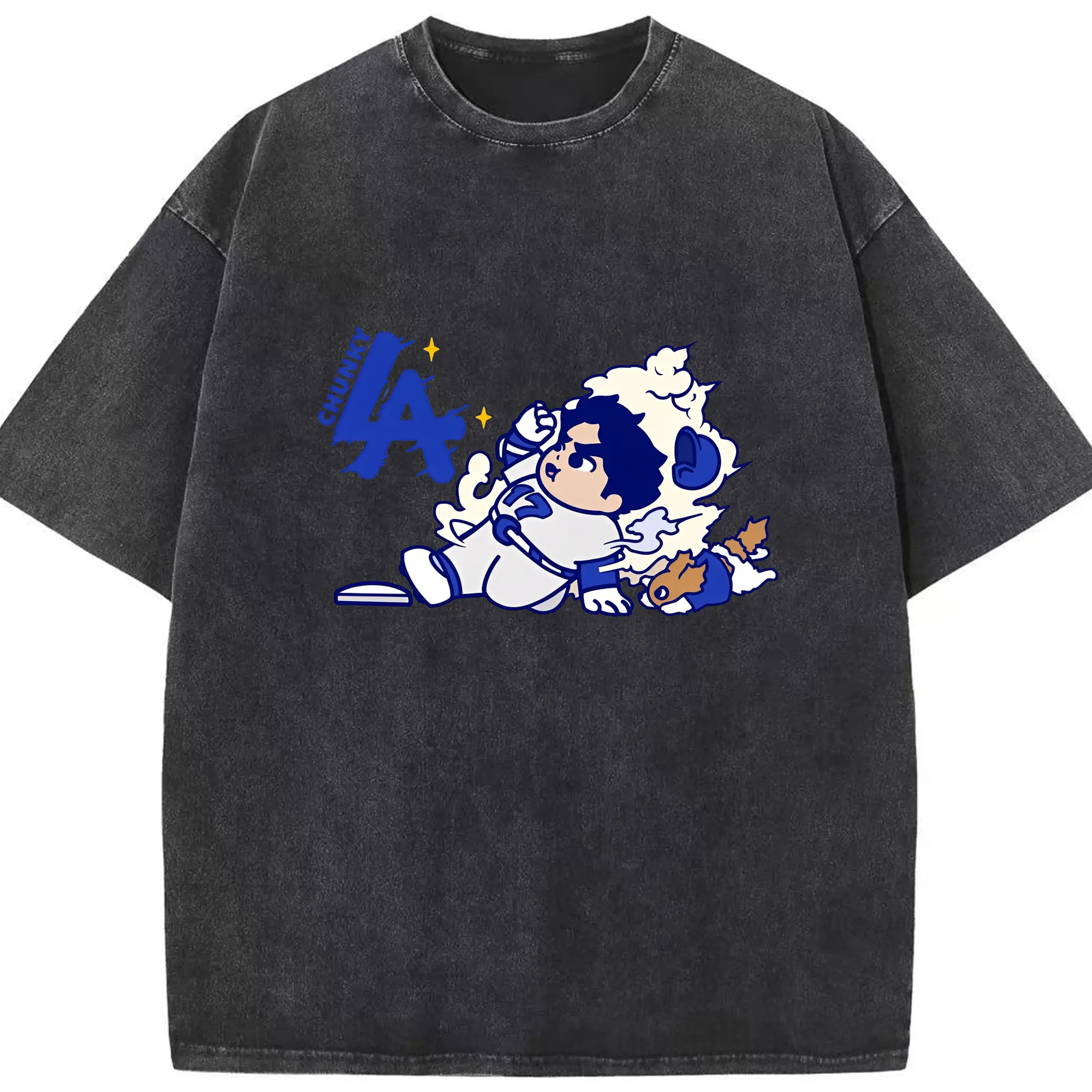 大谷翔平愛犬 LAロゴコラボ chunkyデザイン 新作アイテム - 綿100% 半袖Tシャツ ・ フロントプリント ・ 快適 通気性 ・ 日常使い 散歩 スポーツ用