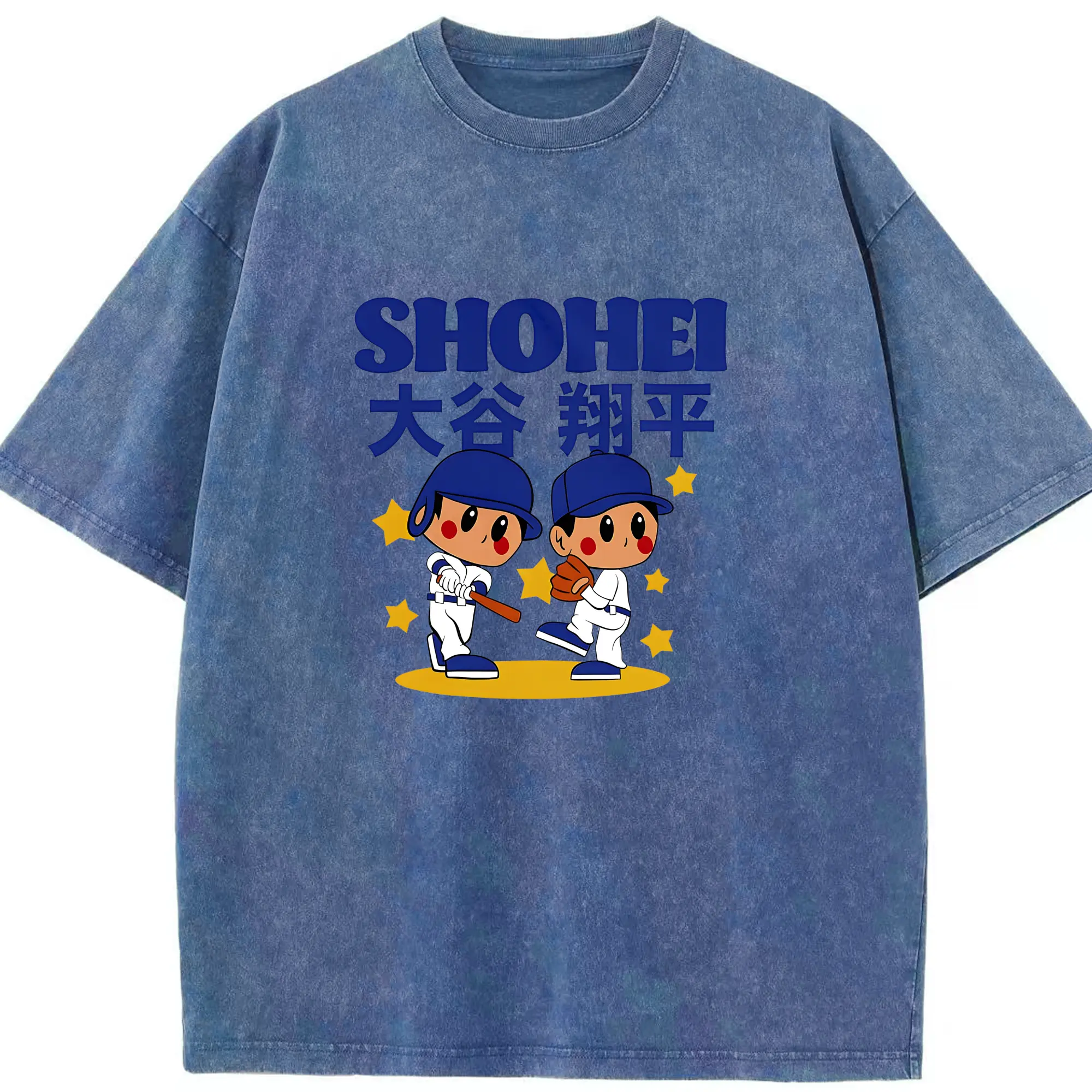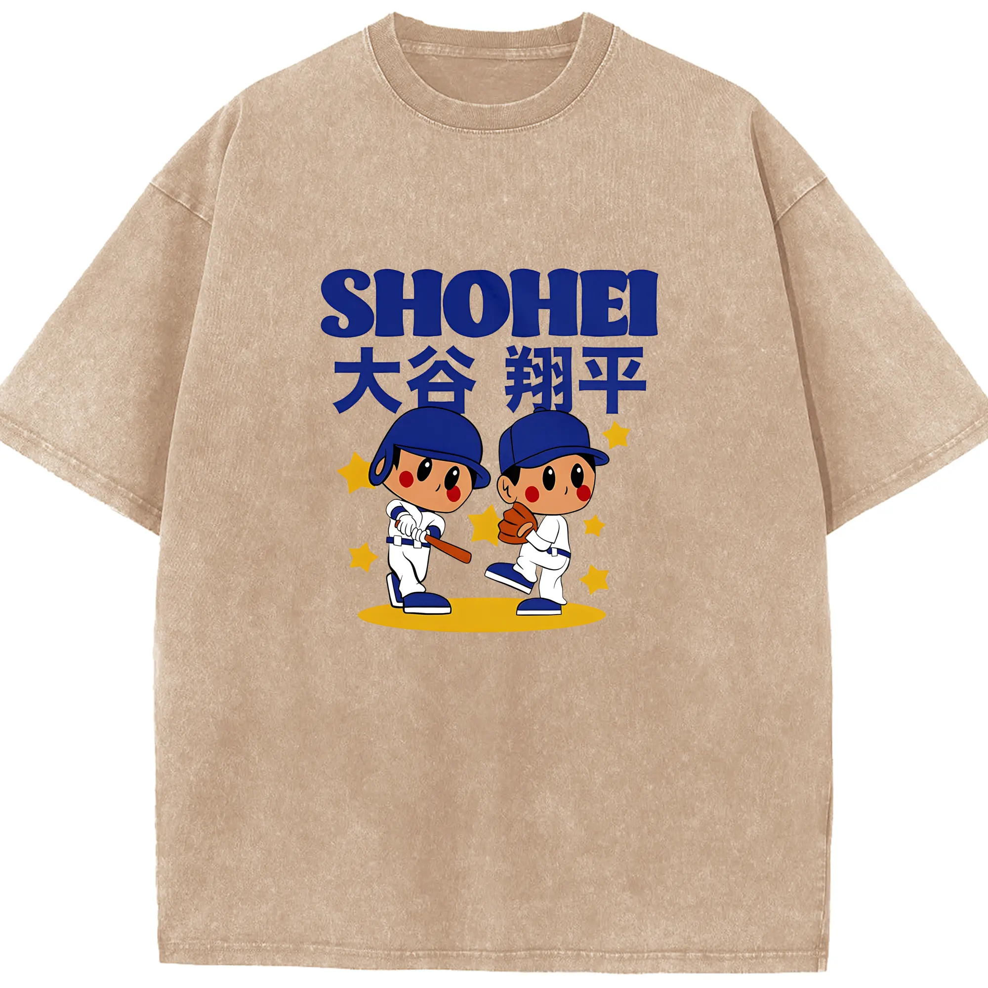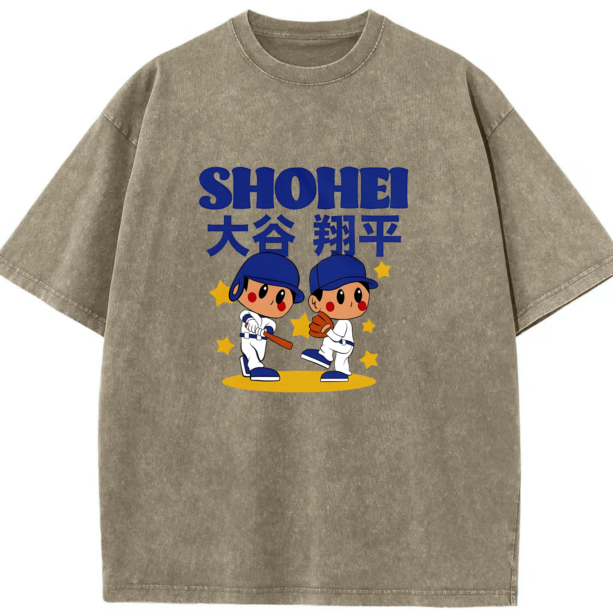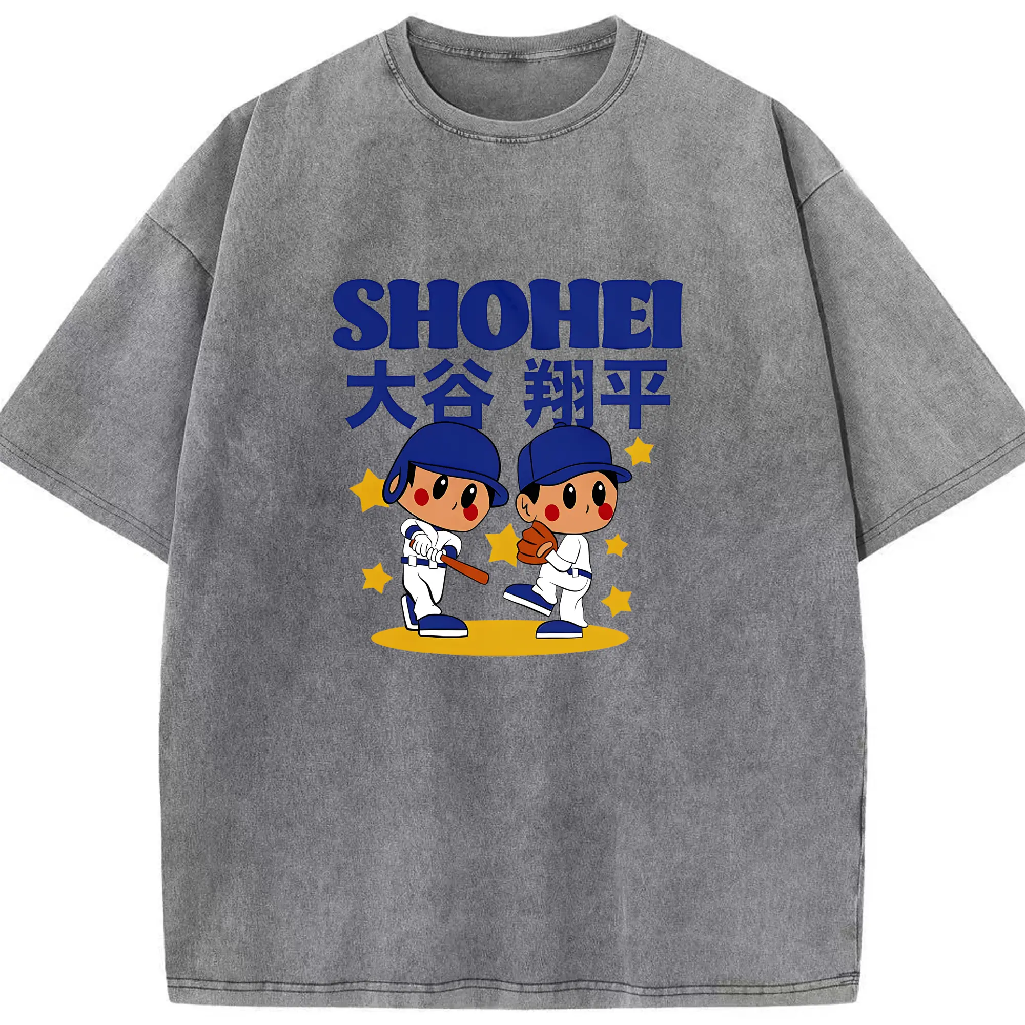 大谷翔平&愛犬デコピン 限定コレクション - 綿100% ヴィンテージ風 半袖Tシャツ ・ フロントプリント ・ 柔らか肌触り ・ 通気性 快適 ・ スポーツ カジュアル 外出用