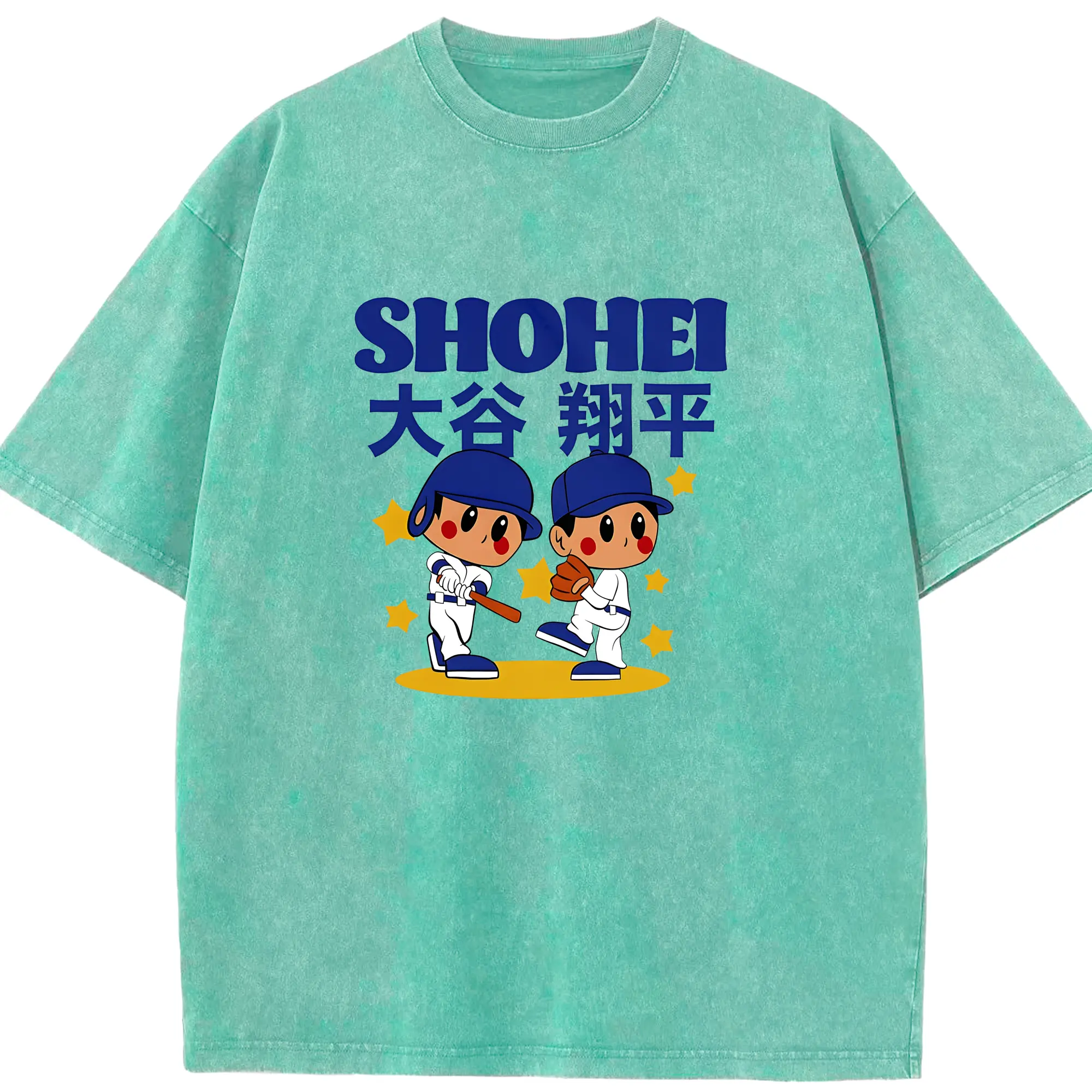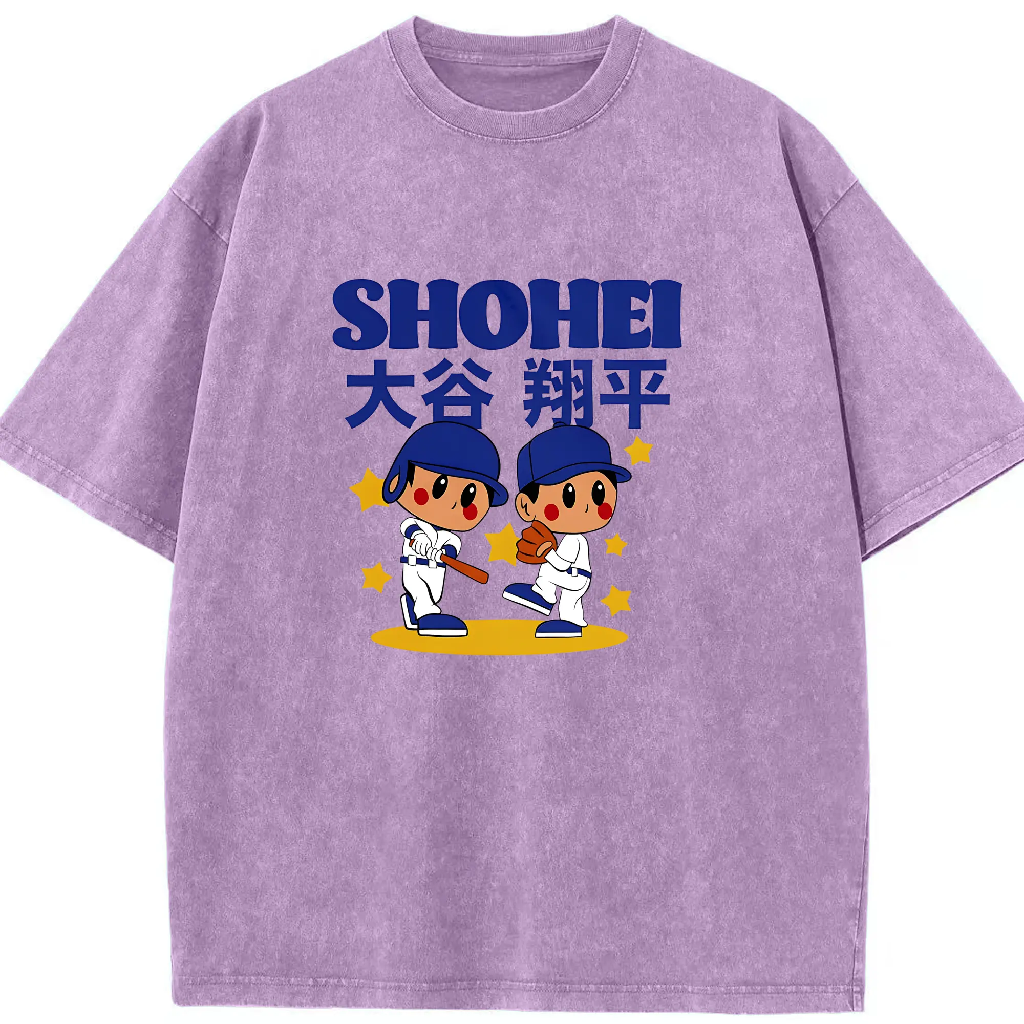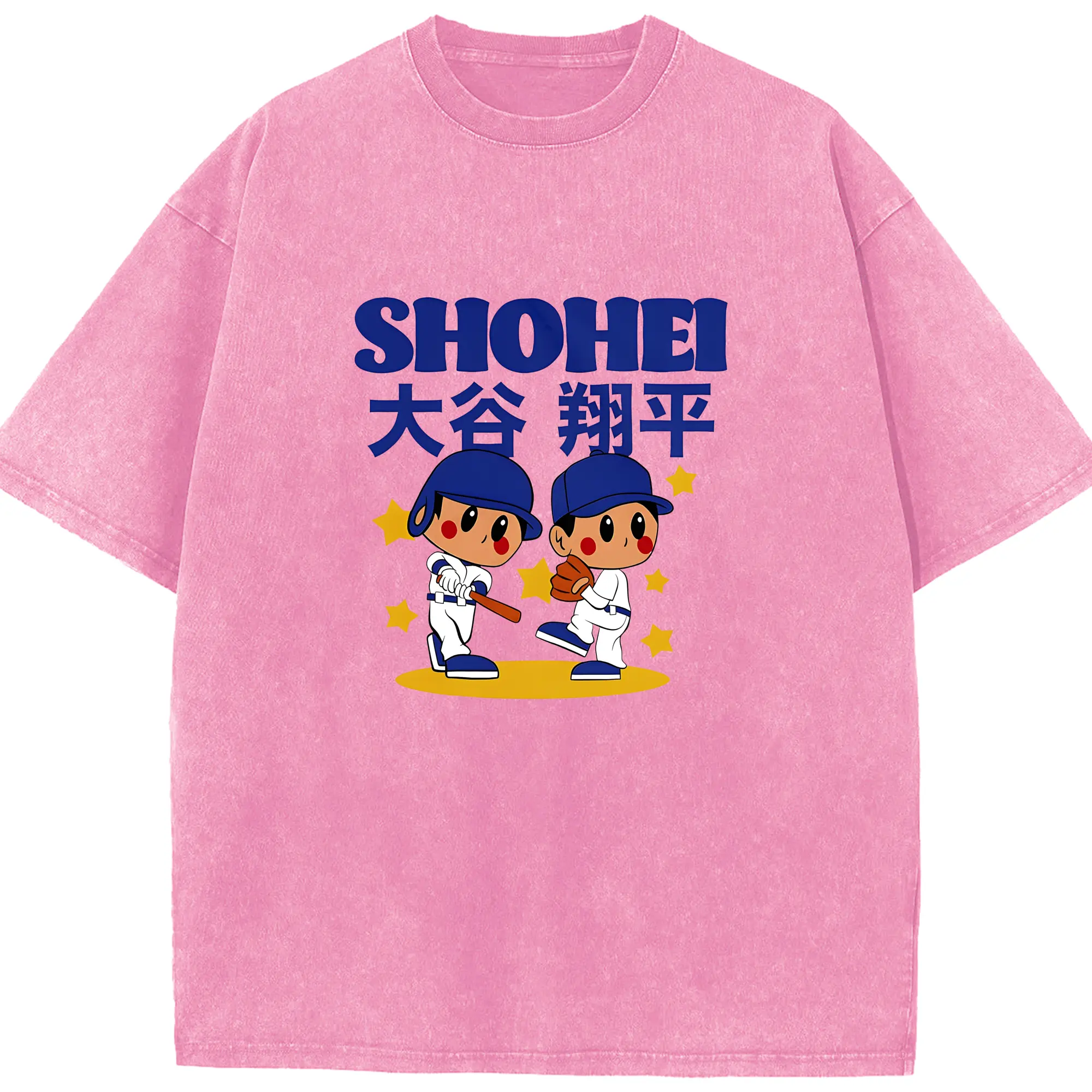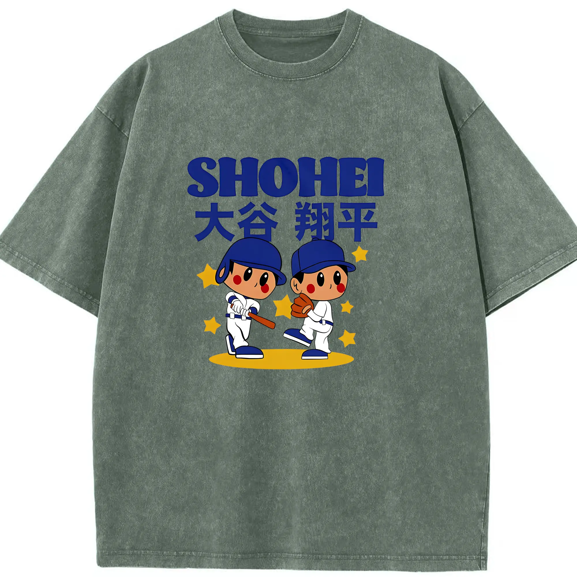大谷翔平&愛犬デコピン 限定コレクション - 綿100% ヴィンテージ風 半袖Tシャツ ・ フロントプリント ・ 柔らか肌触り ・ 通気性 快適 ・ スポーツ カジュアル 外出用