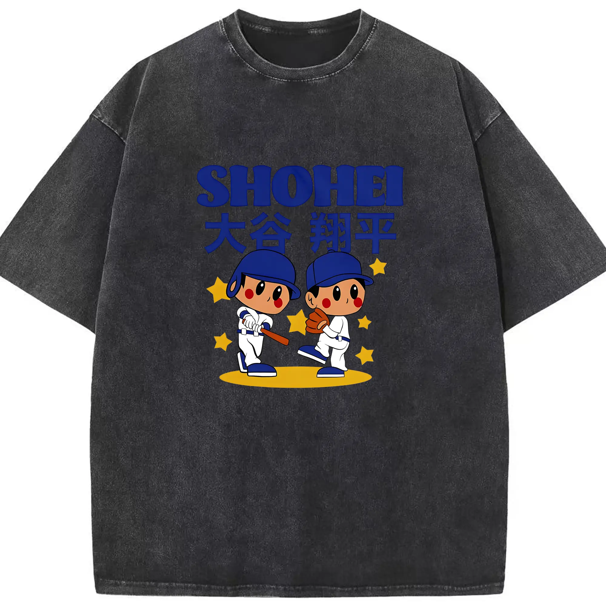 大谷翔平 可愛いカートゥーン × ロサンゼルス・ドジャース 人気限定 - 綿100% 半袖Tシャツ ・ フロントプリント ・ 快適 通気性 ・ 日常使い 散歩 スポーツ用