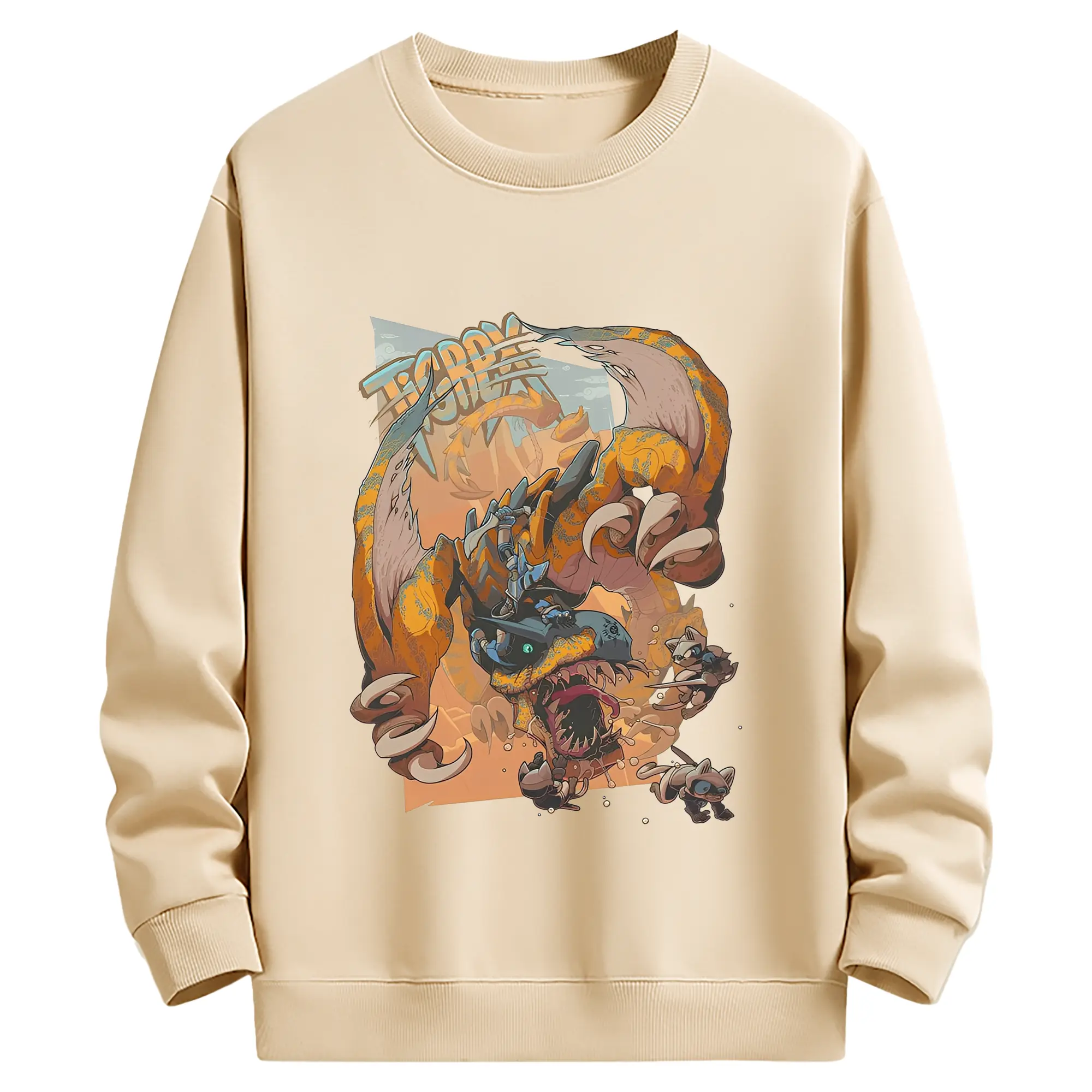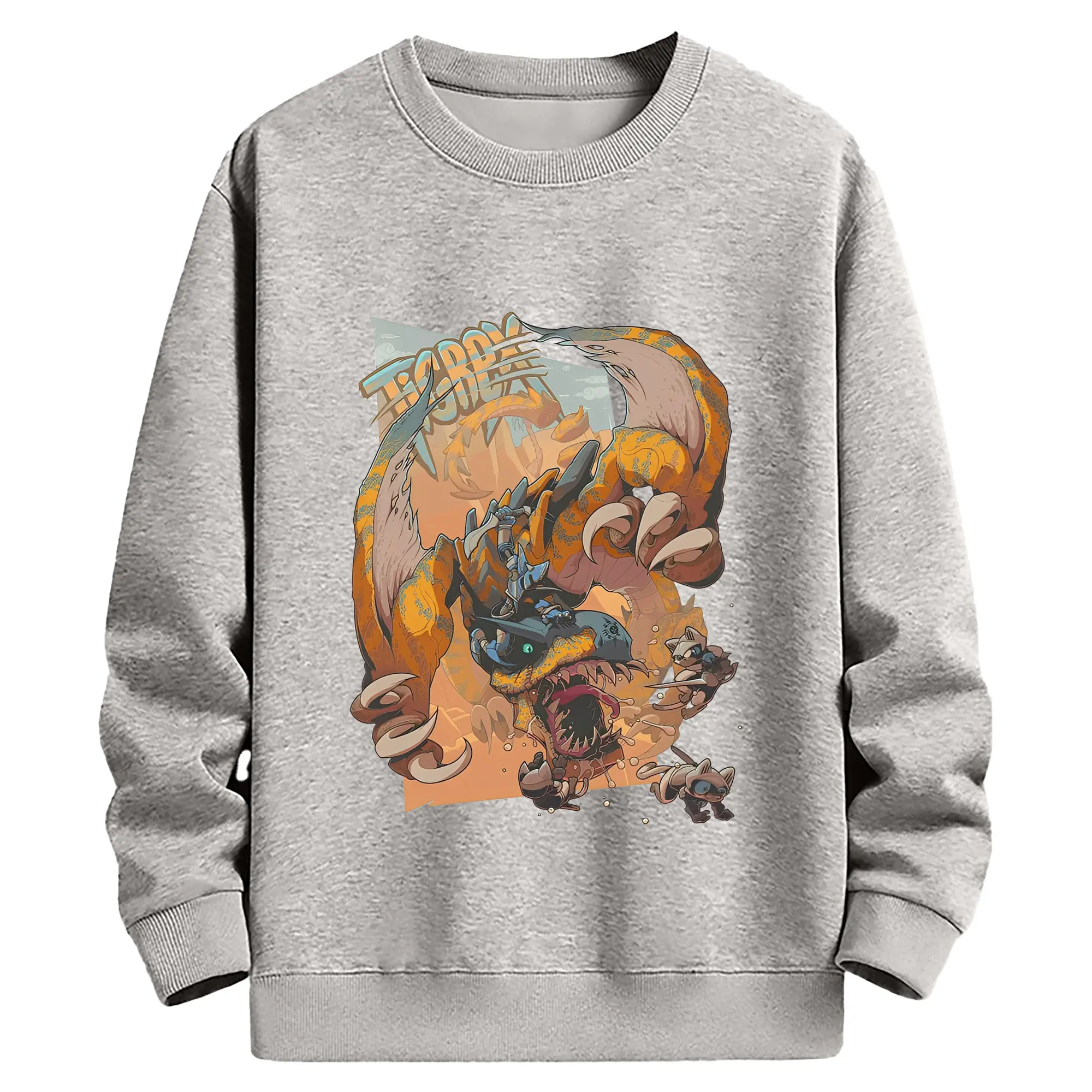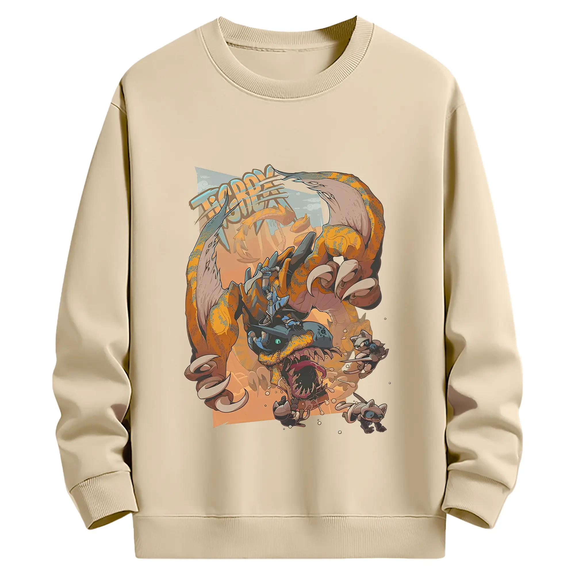 怒涛の突進!ティガレックス ド迫力プリント - 綿100% ヴィンテージ風 半袖Tシャツ ・ フロントプリント ・ 柔らか肌触り ・ 通気性 快適 ・ スポーツ カジュアル 外出用