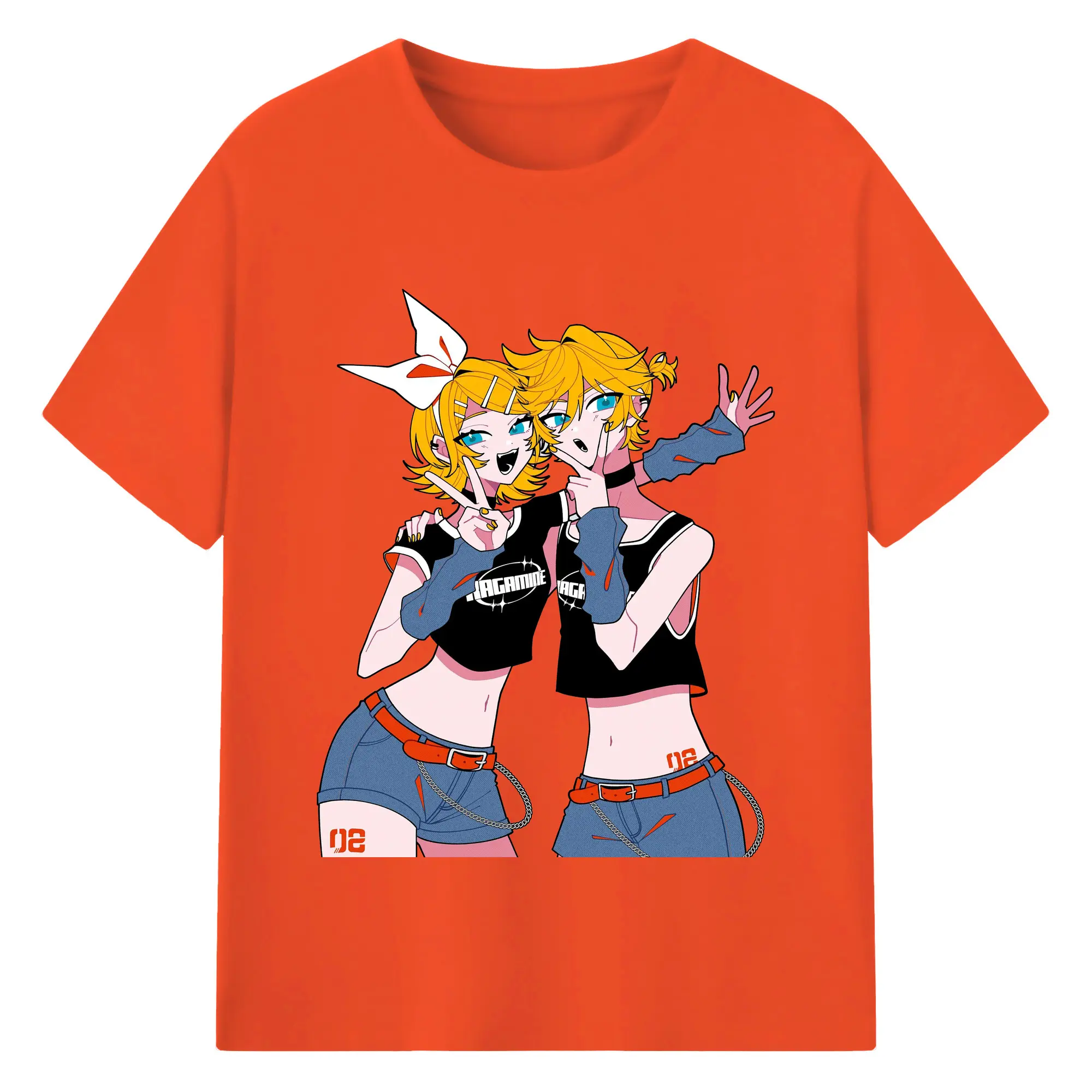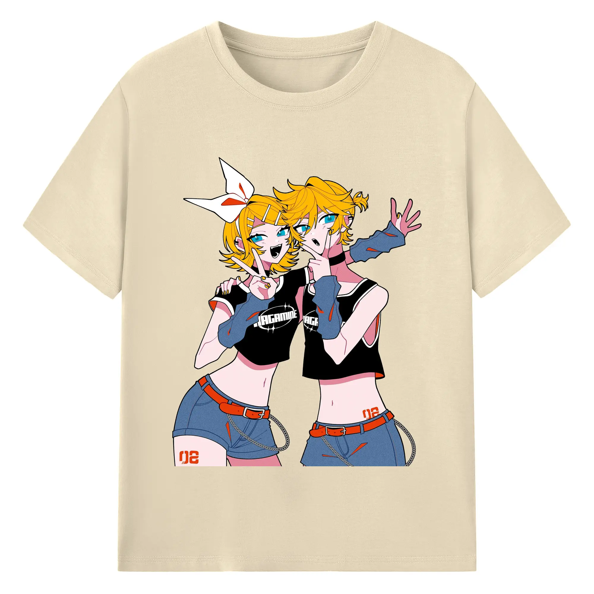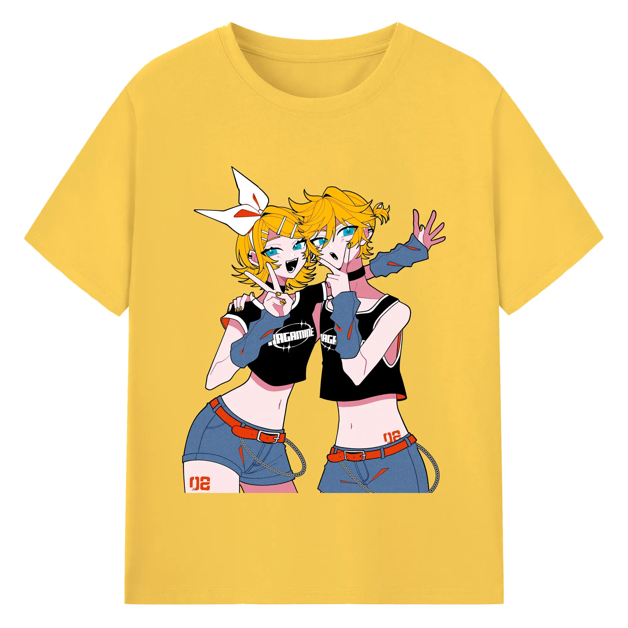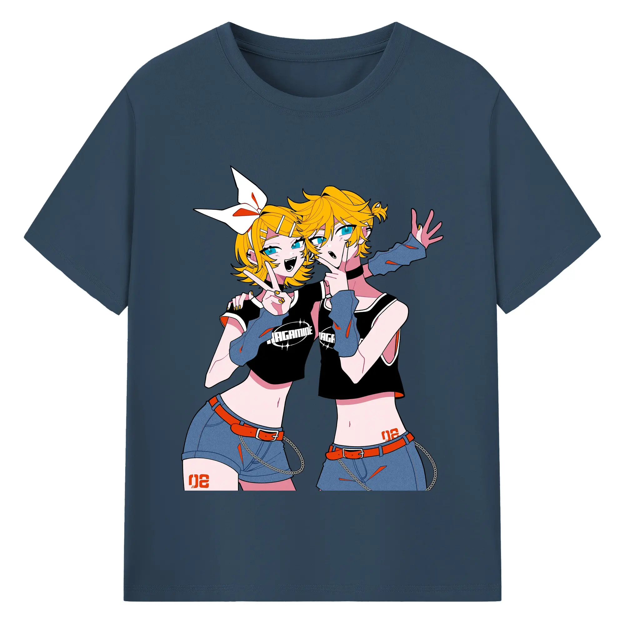 鏡音リン・レン クールスタイル - 綿100% ヴィンテージ風 半袖Tシャツ ・ フロントプリント ・ 柔らか肌触り ・ 通気性 快適 ・ スポーツ カジュアル 外出用