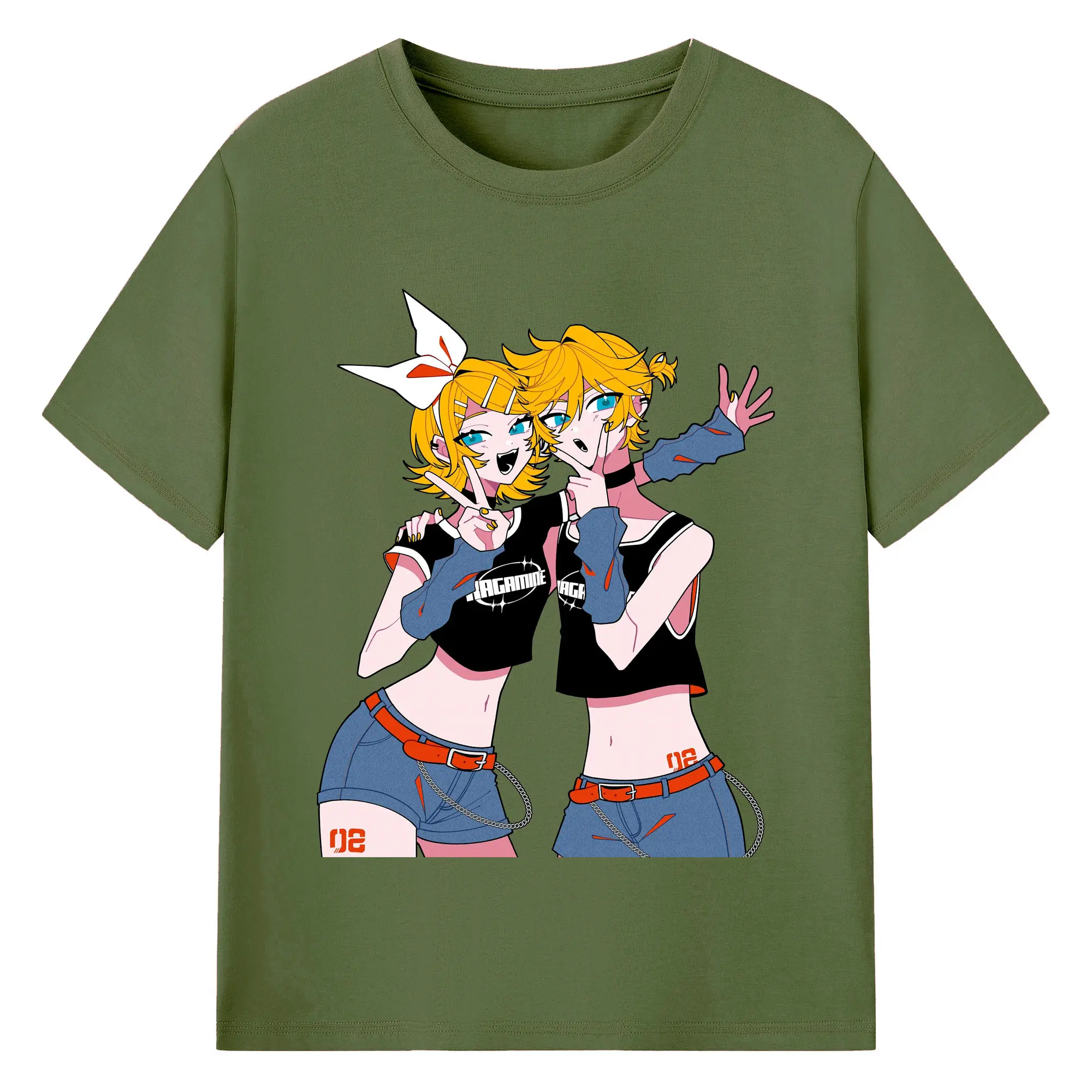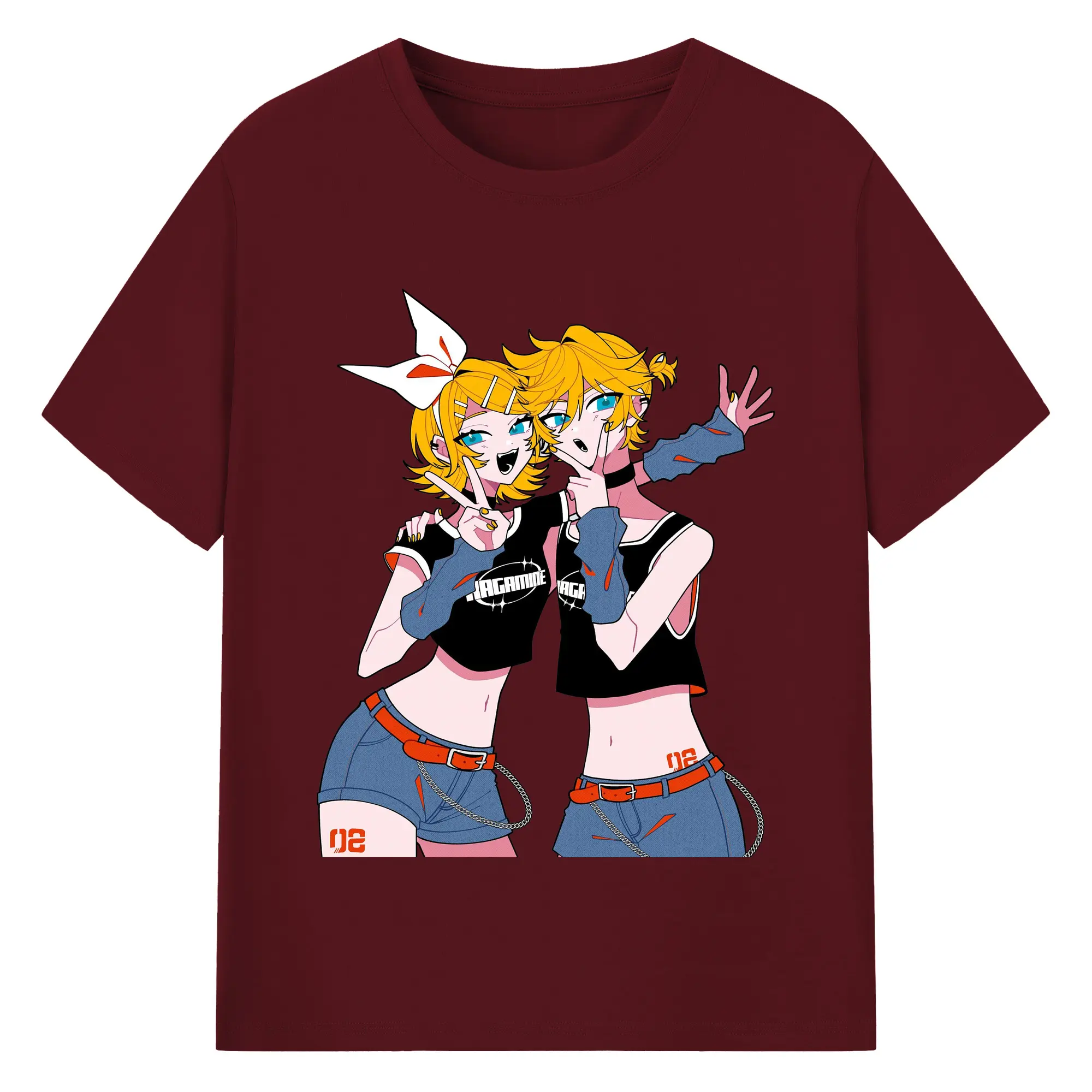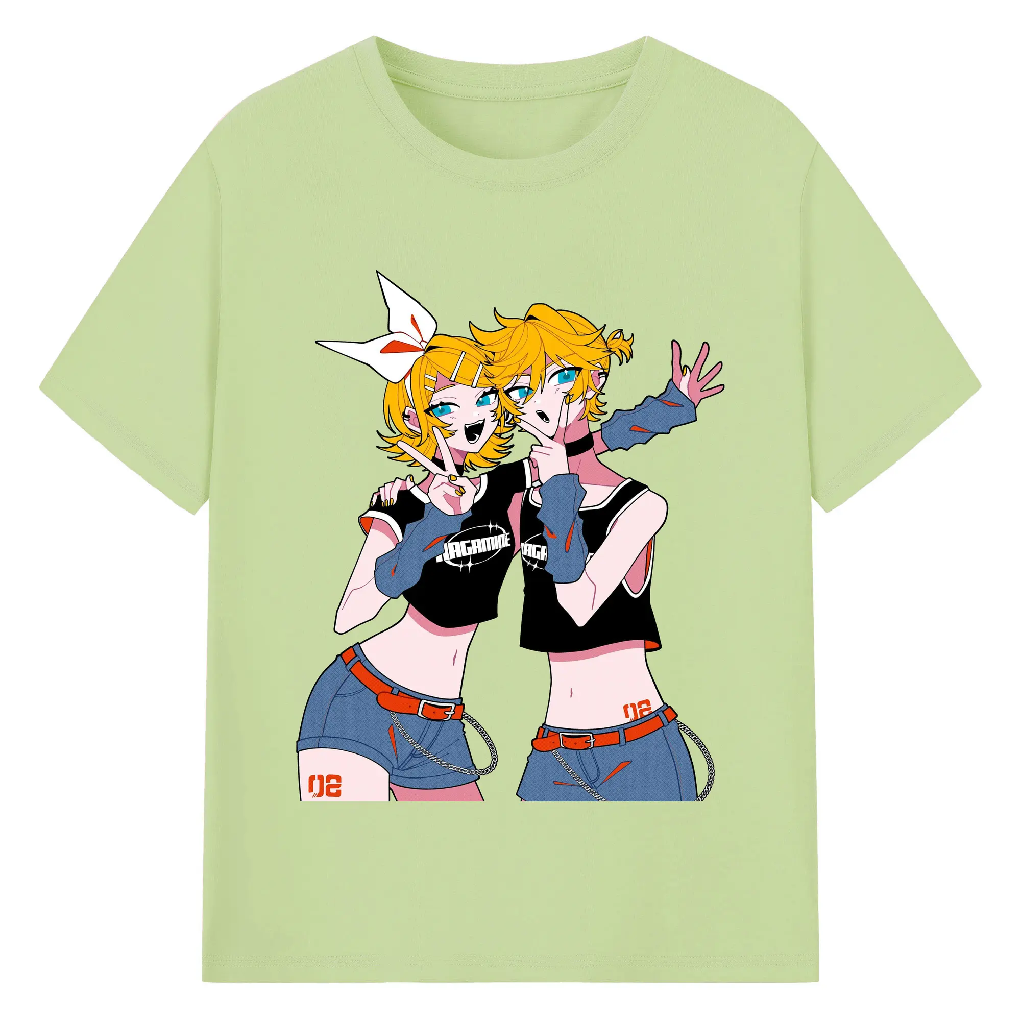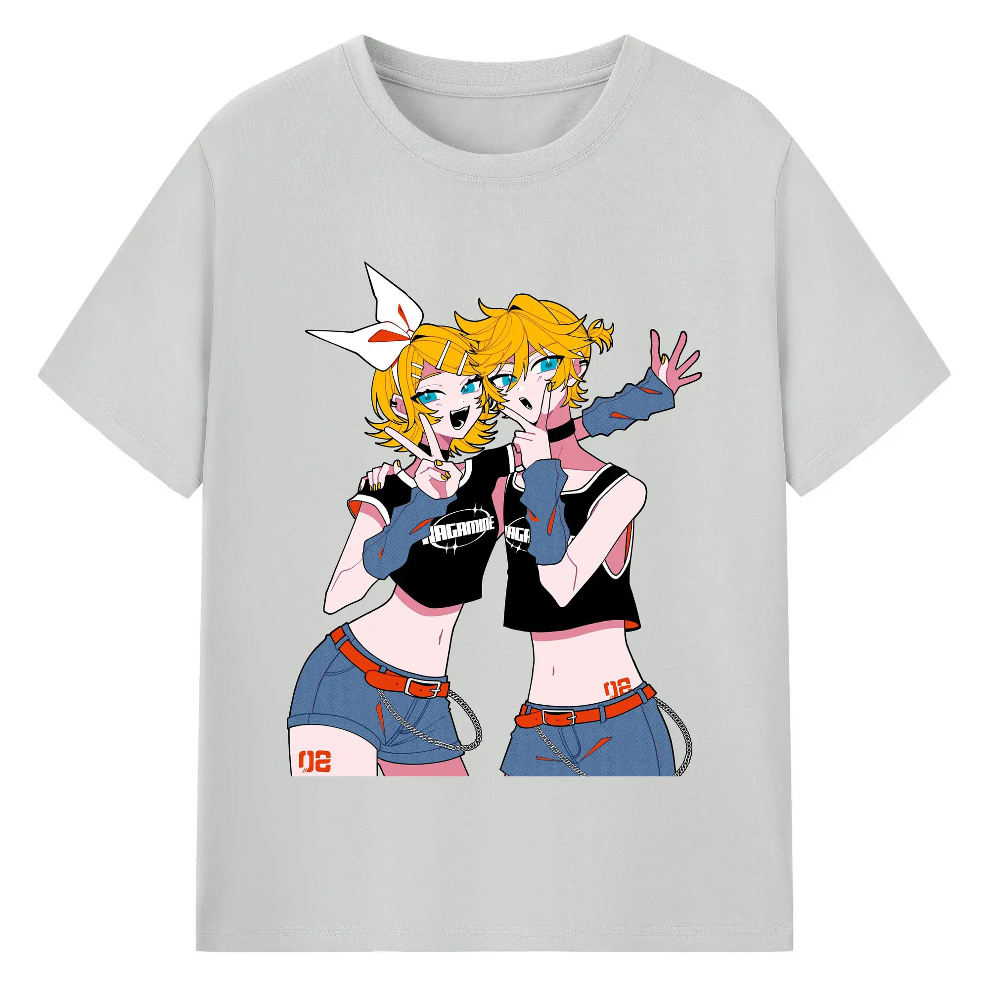 鏡音リン・レン クールスタイル - 綿100% ヴィンテージ風 半袖Tシャツ ・ フロントプリント ・ 柔らか肌触り ・ 通気性 快適 ・ スポーツ カジュアル 外出用