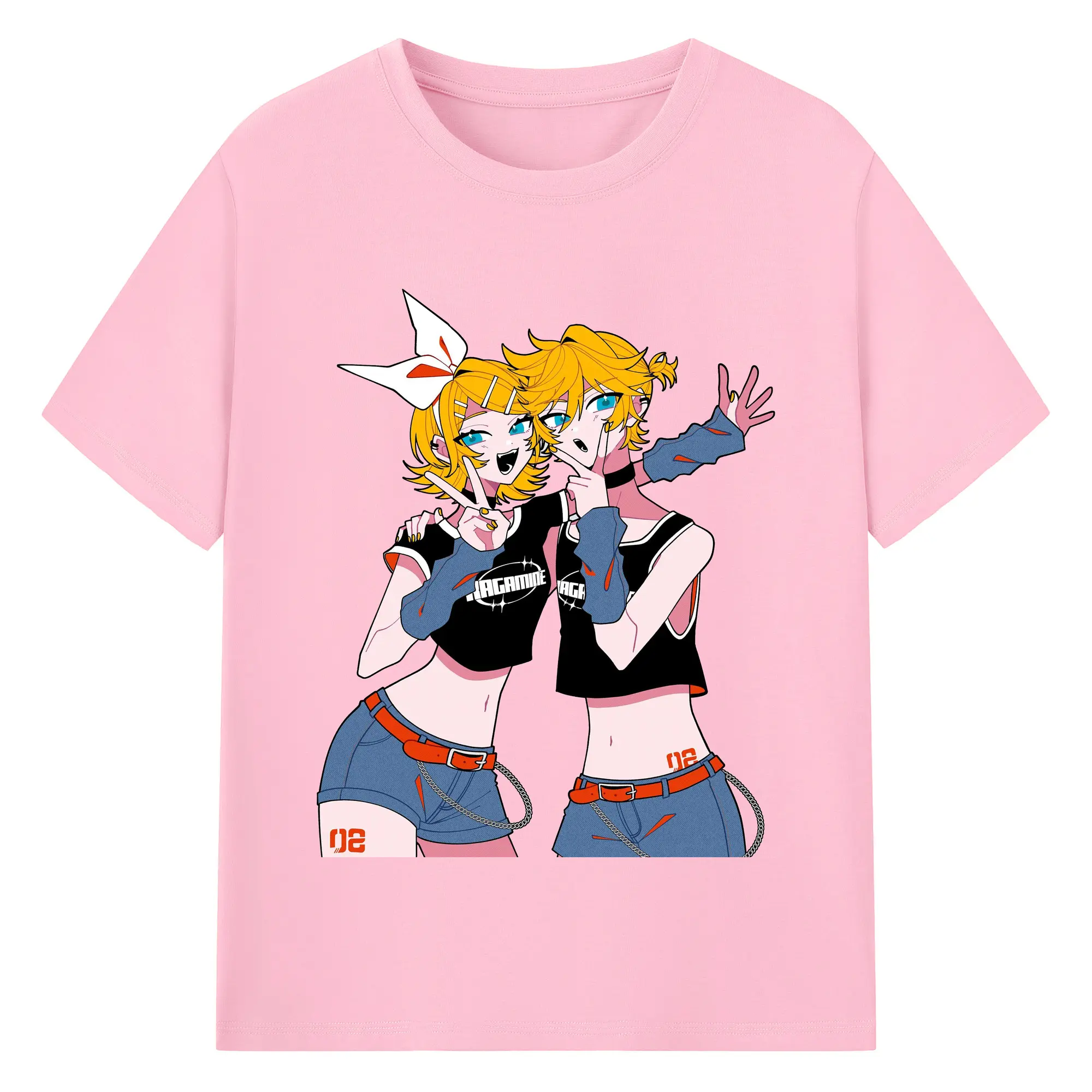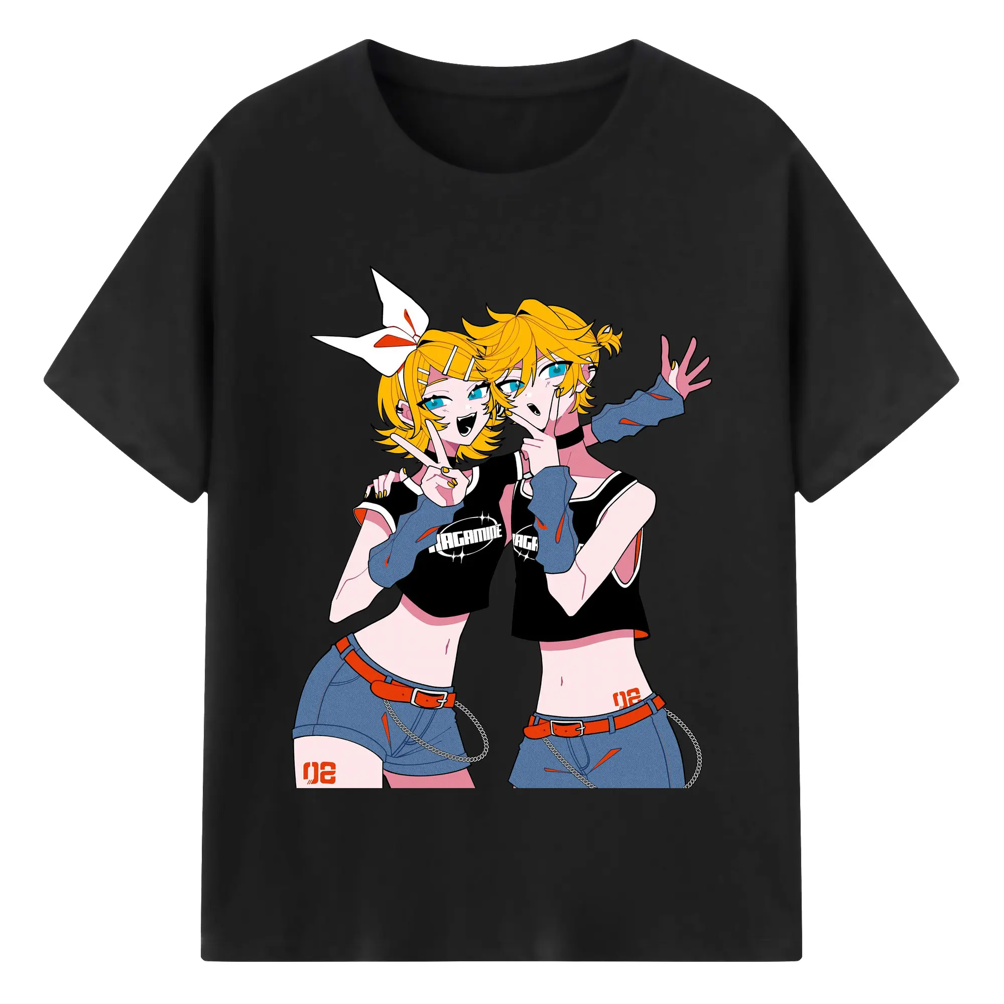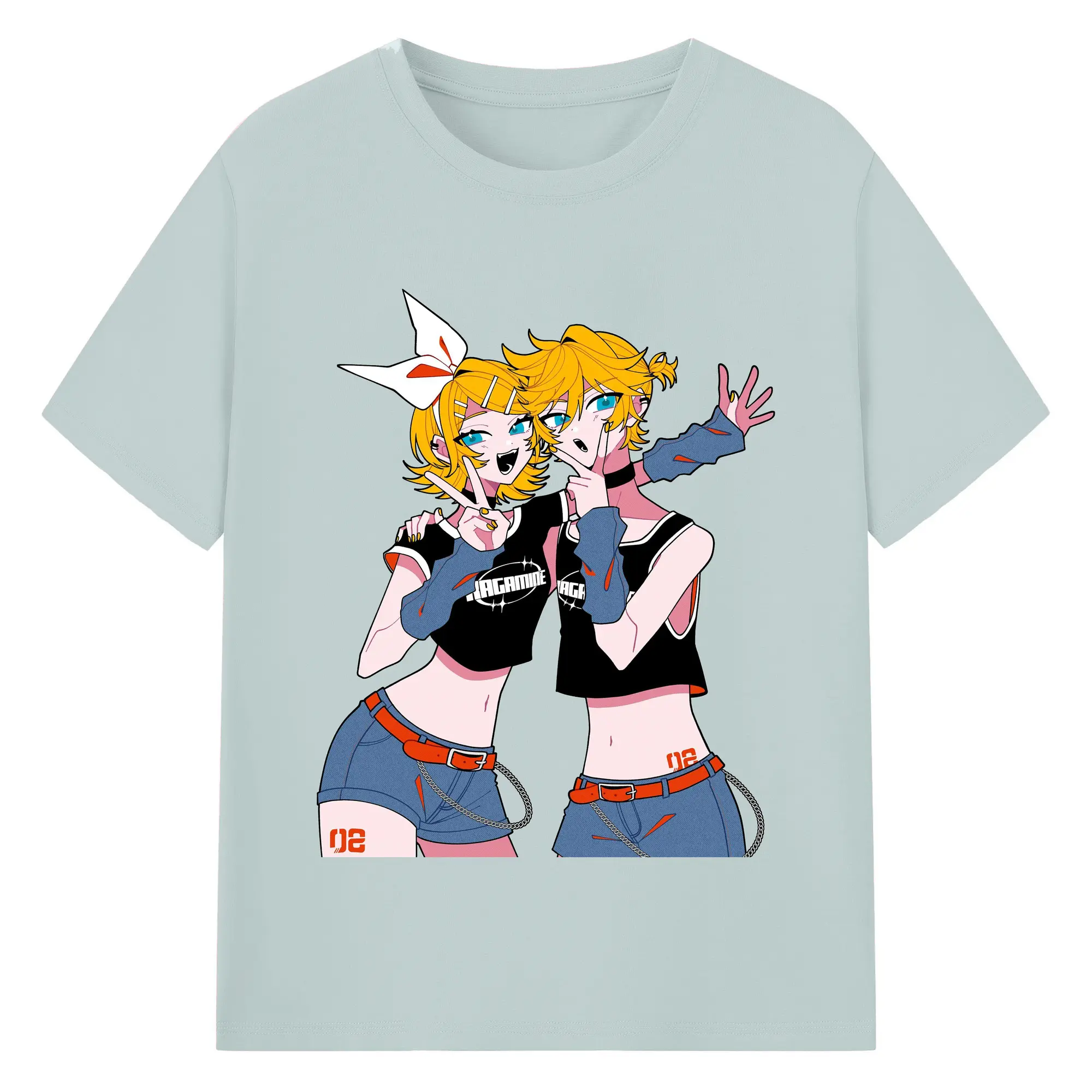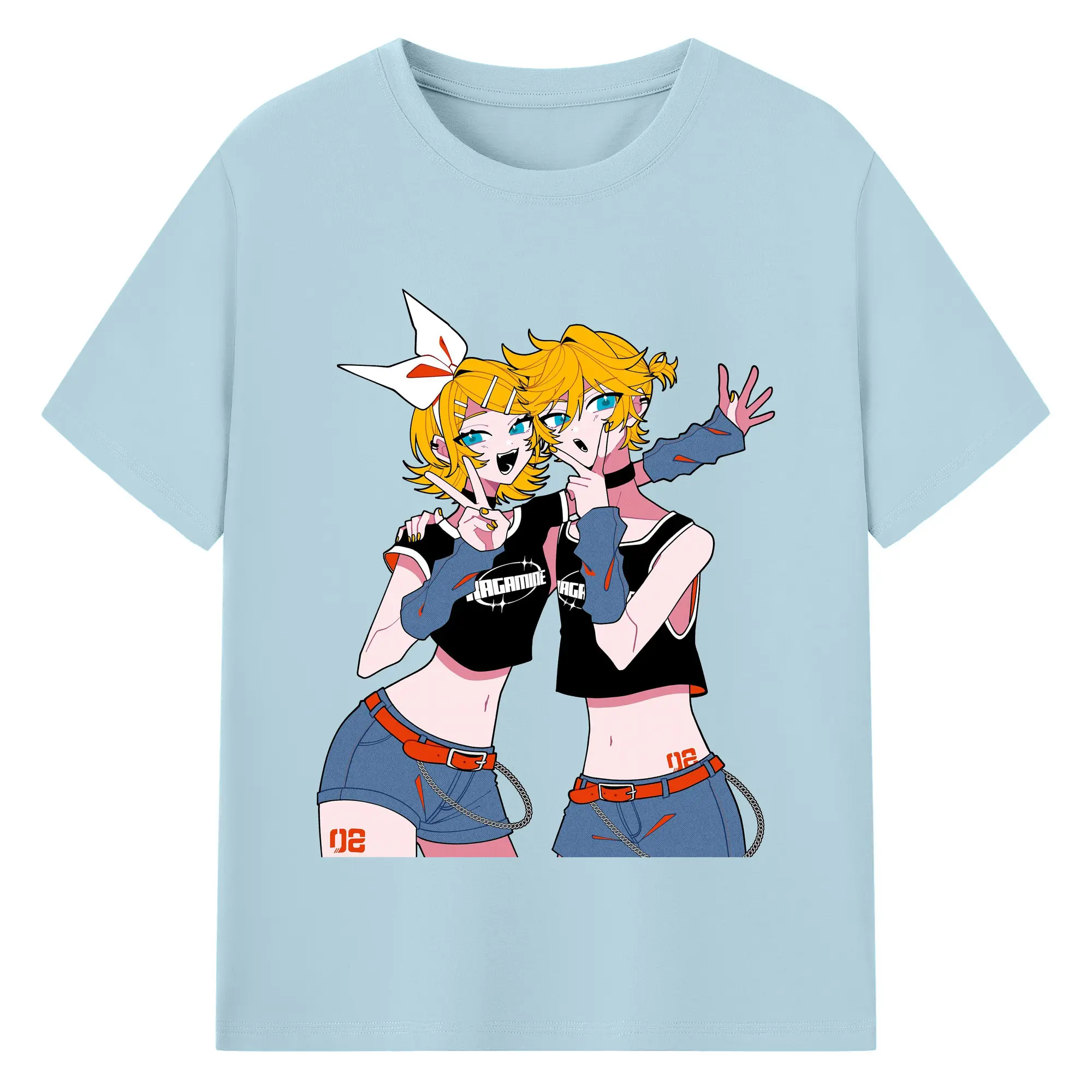 鏡音リン・レン クールスタイル - 綿100% ヴィンテージ風 半袖Tシャツ ・ フロントプリント ・ 柔らか肌触り ・ 通気性 快適 ・ スポーツ カジュアル 外出用