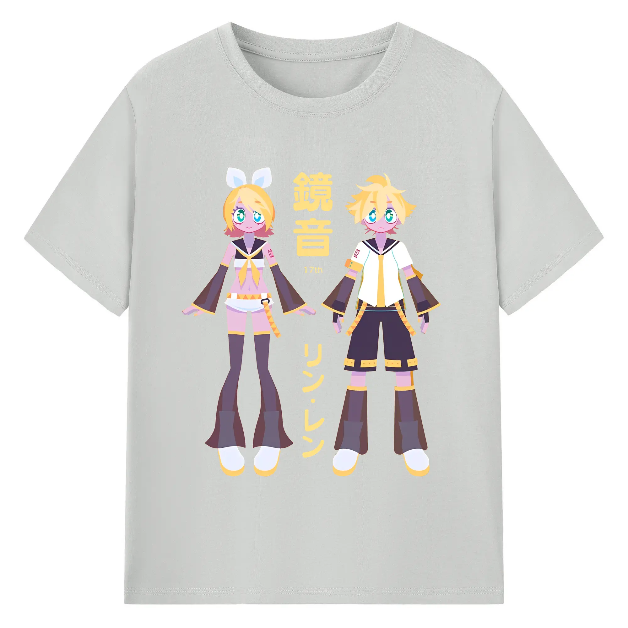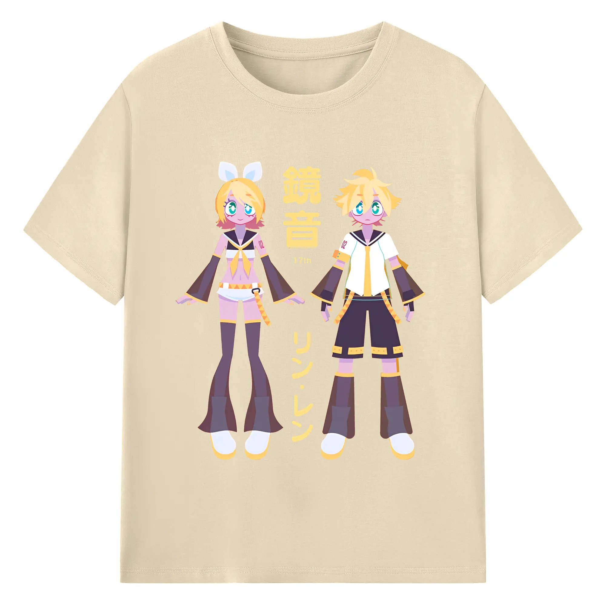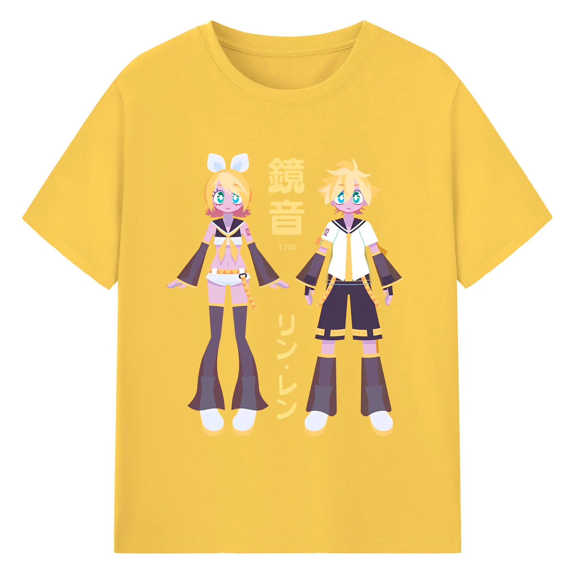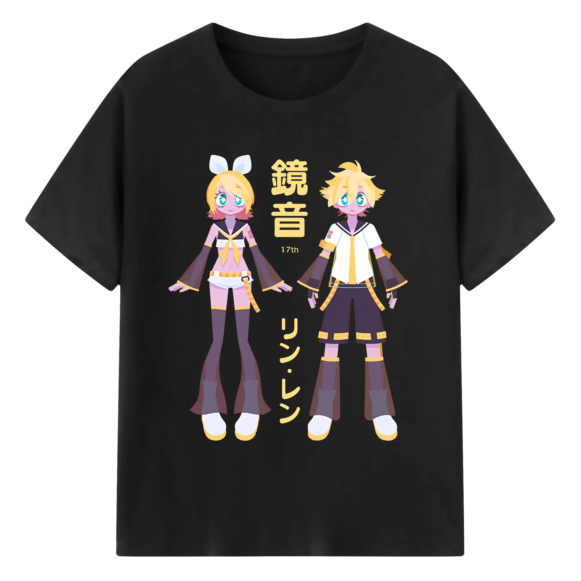 鏡音リン・レン 17th - 綿100% ヴィンテージ風 半袖Tシャツ ・ フロントプリント ・ 柔らか肌触り ・ 通気性 快適 ・ スポーツ カジュアル 外出用