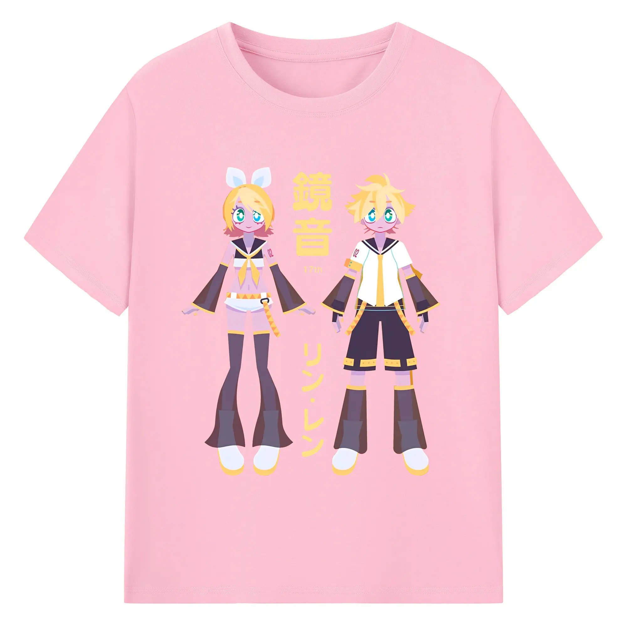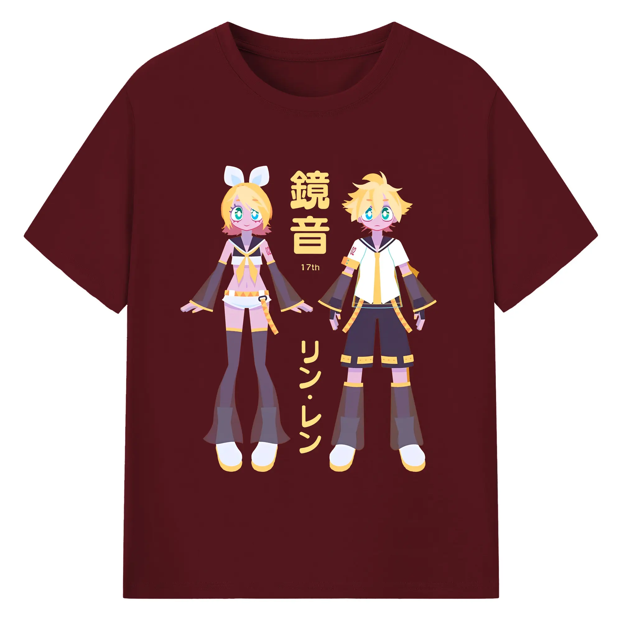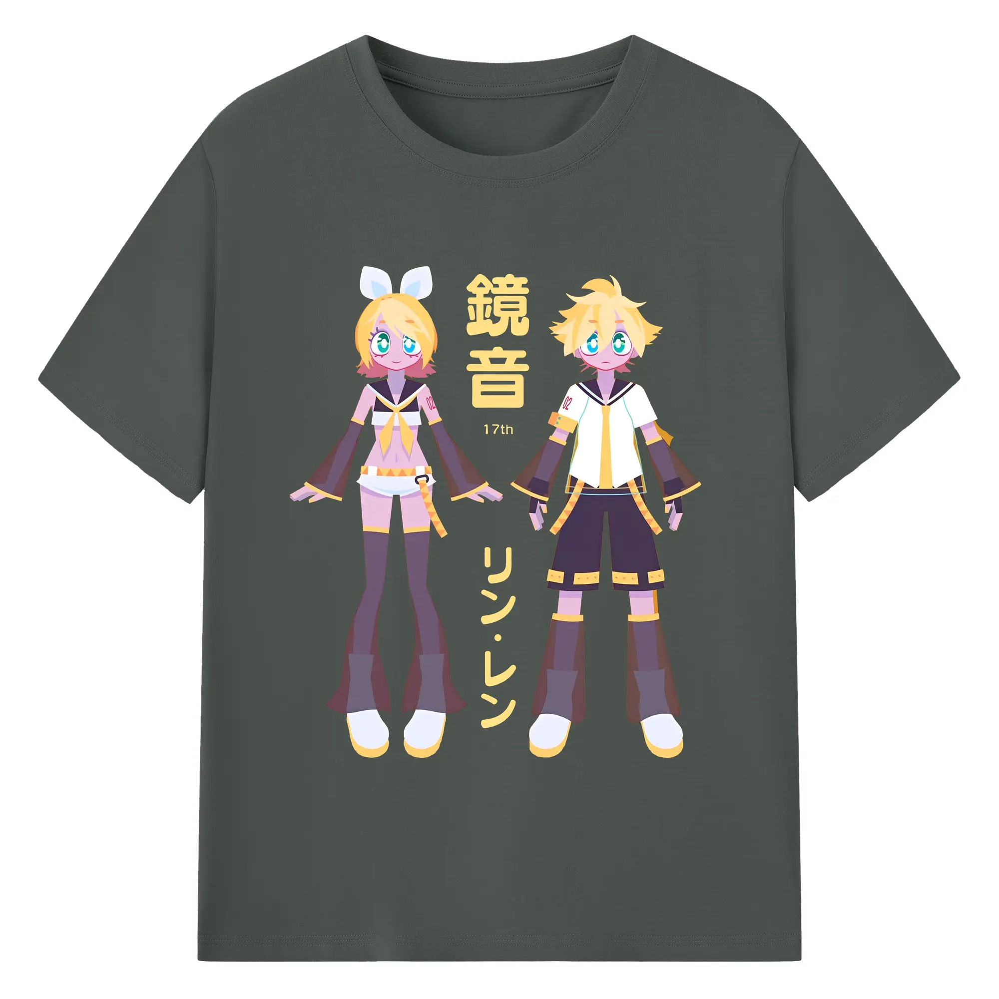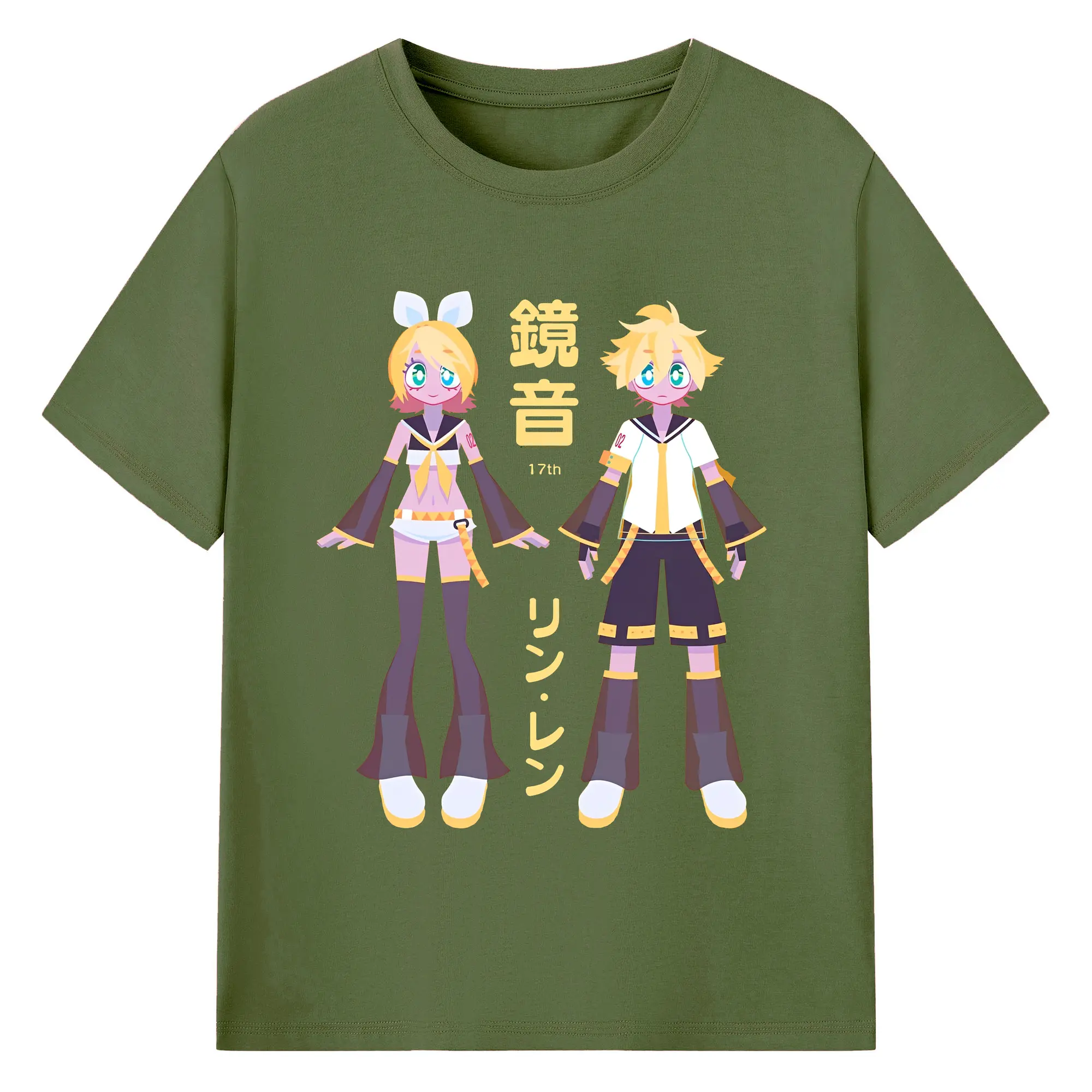鏡音リン・レン 17th - 綿100% ヴィンテージ風 半袖Tシャツ ・ フロントプリント ・ 柔らか肌触り ・ 通気性 快適 ・ スポーツ カジュアル 外出用