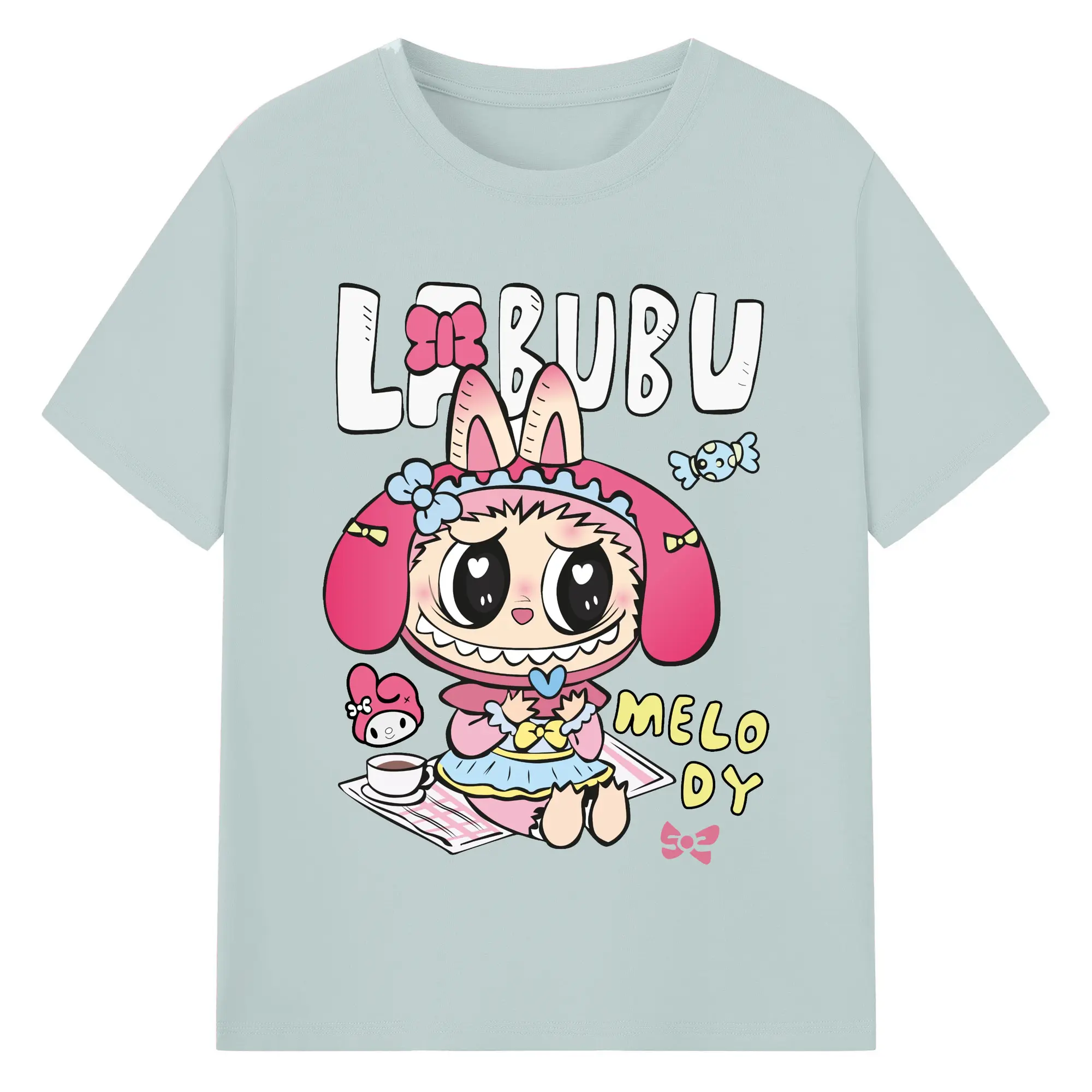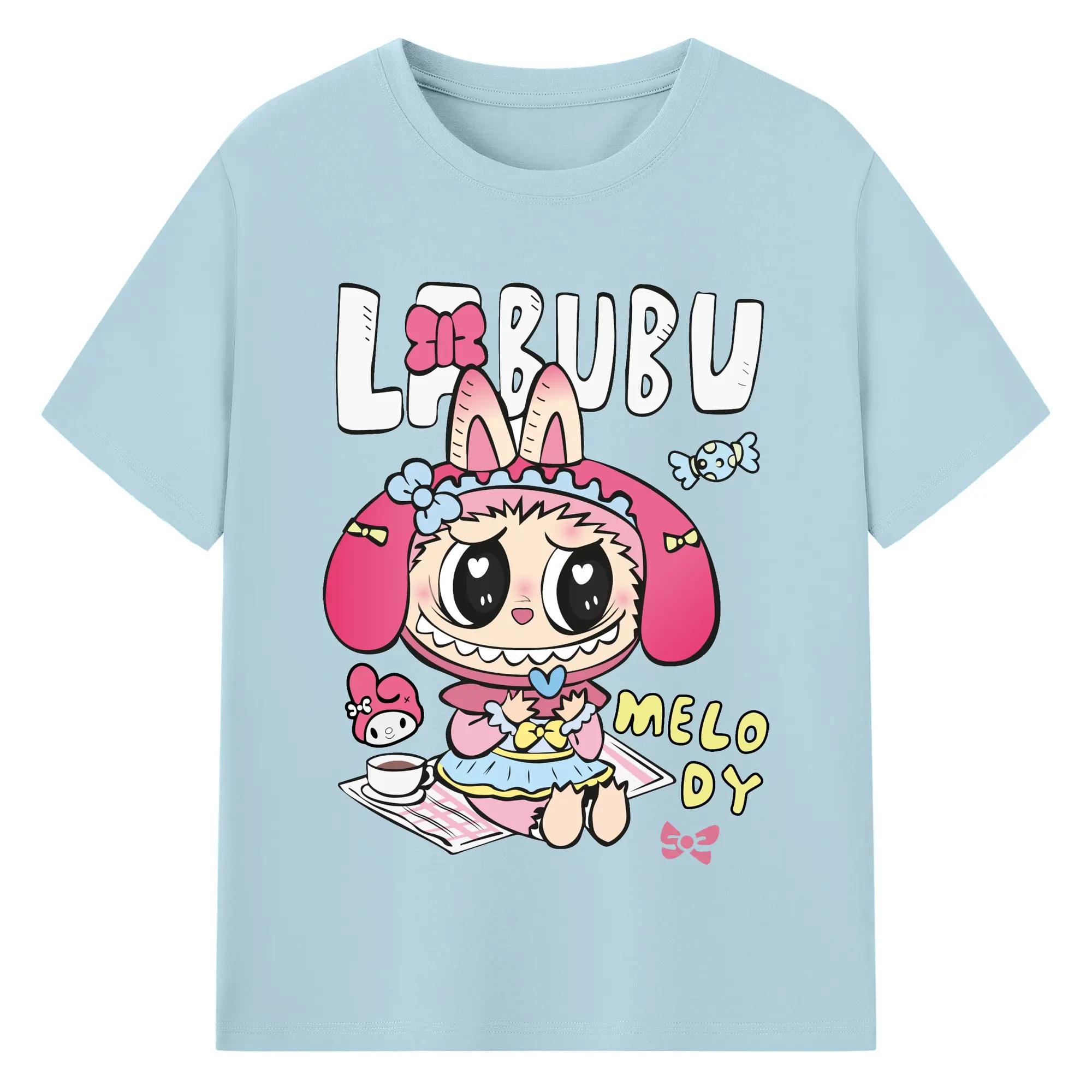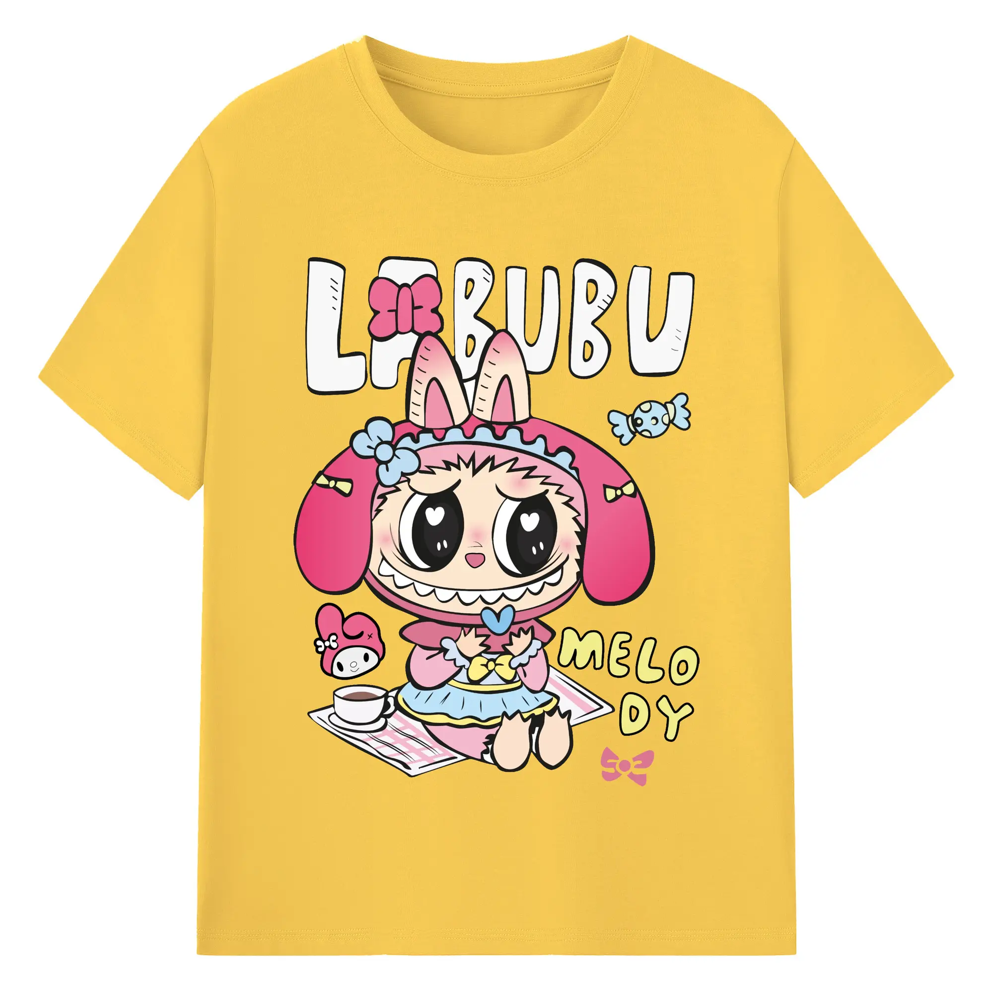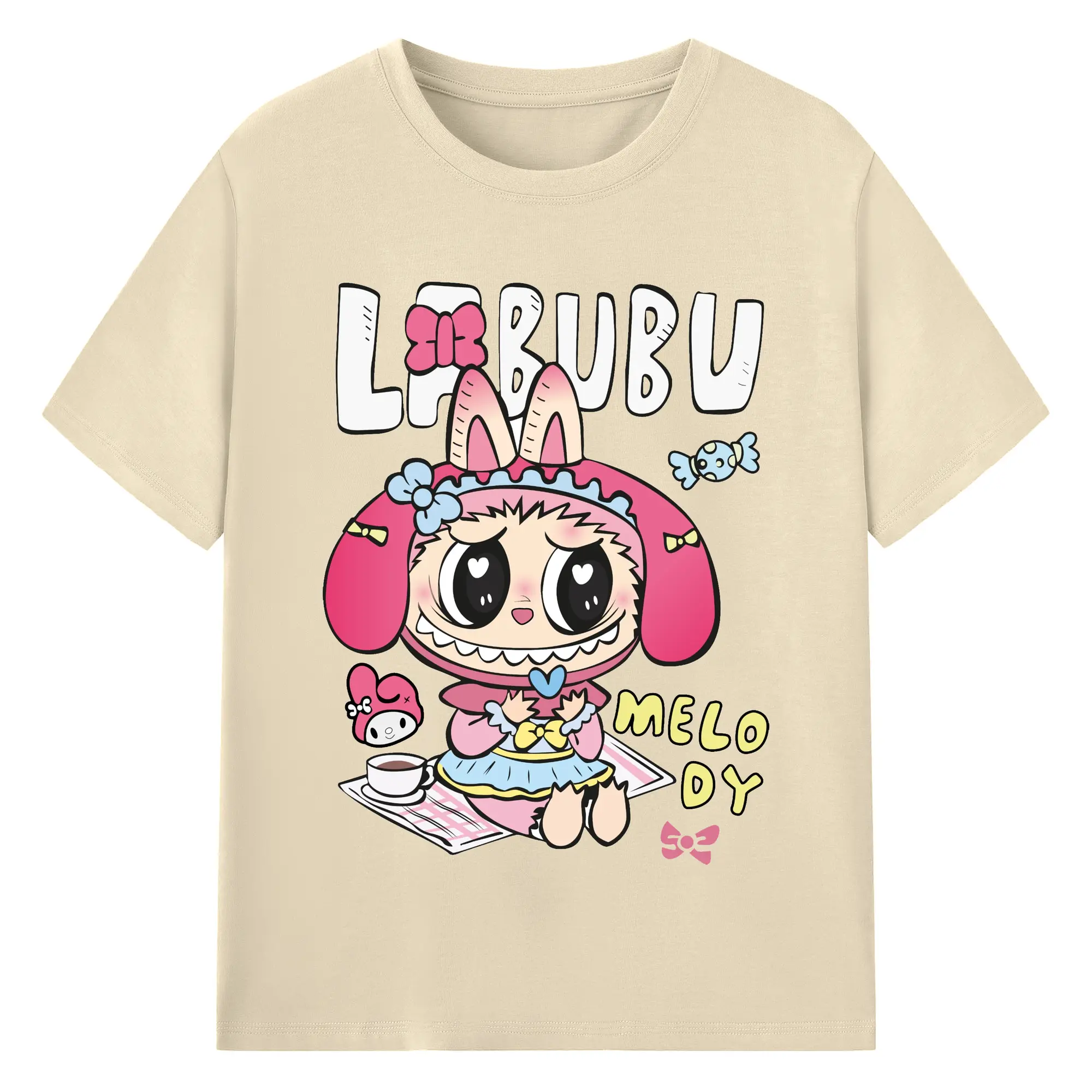 【限定】サンリオマイメロディ × ラブブ コラボ - 綿100% ヴィンテージ風 半袖Tシャツ ・ フロントプリント ・ 柔らか肌触り ・ 通気性 快適 ・ スポーツ カジュアル 外出用
